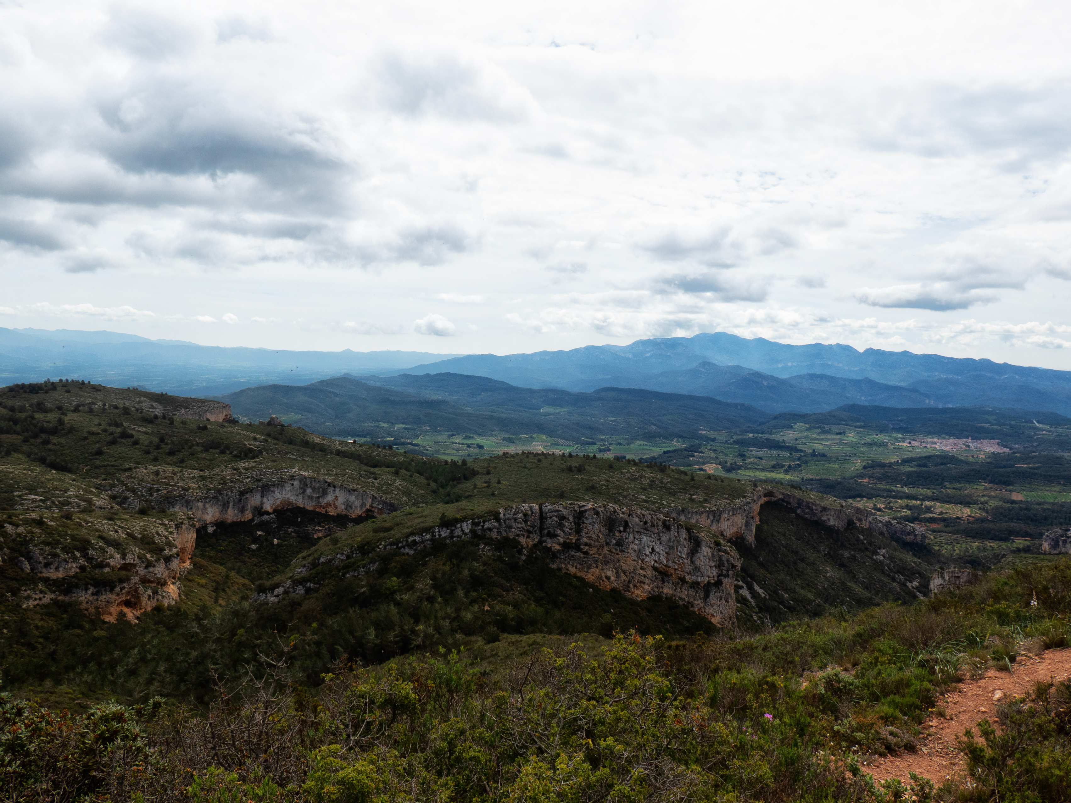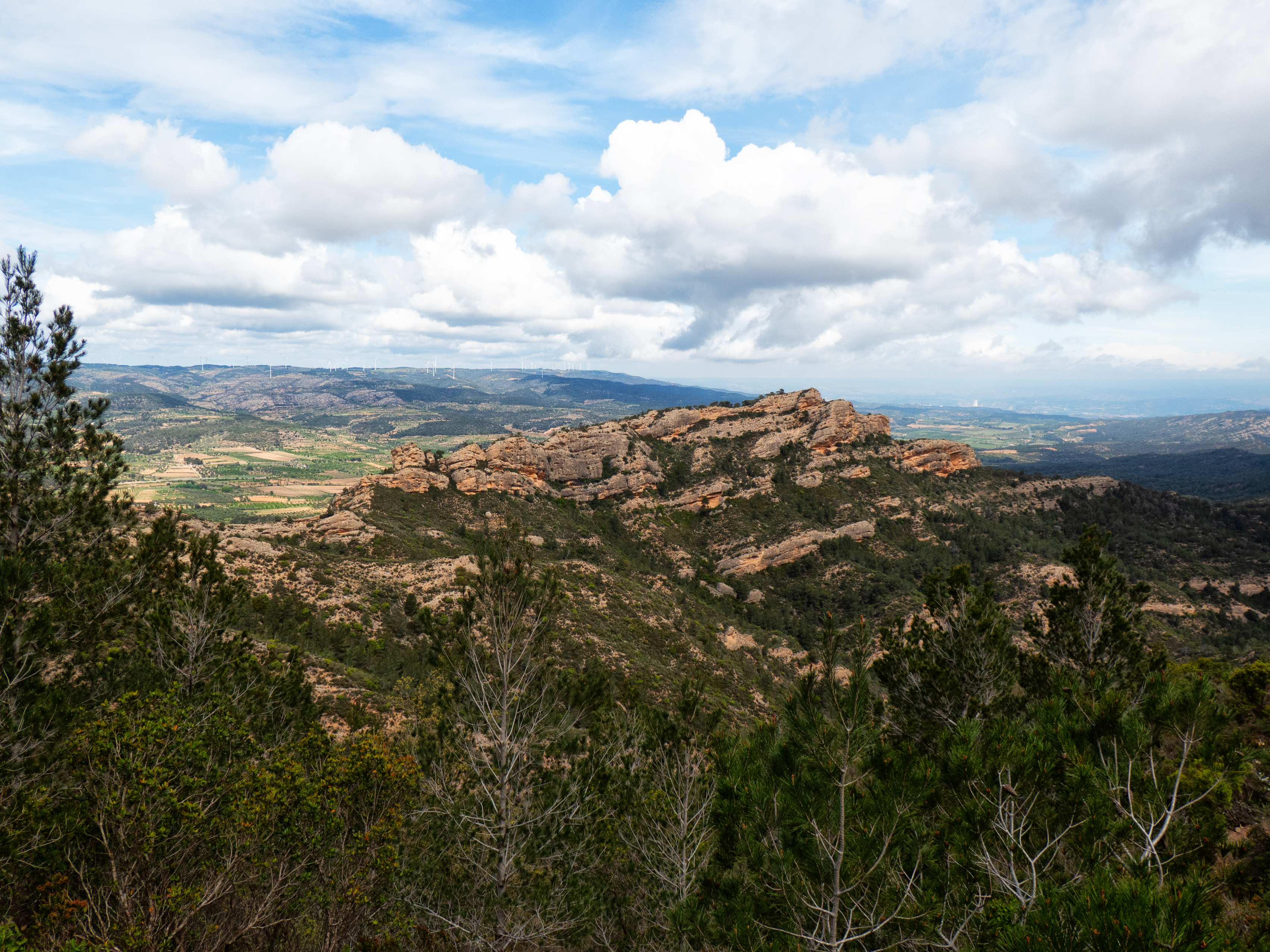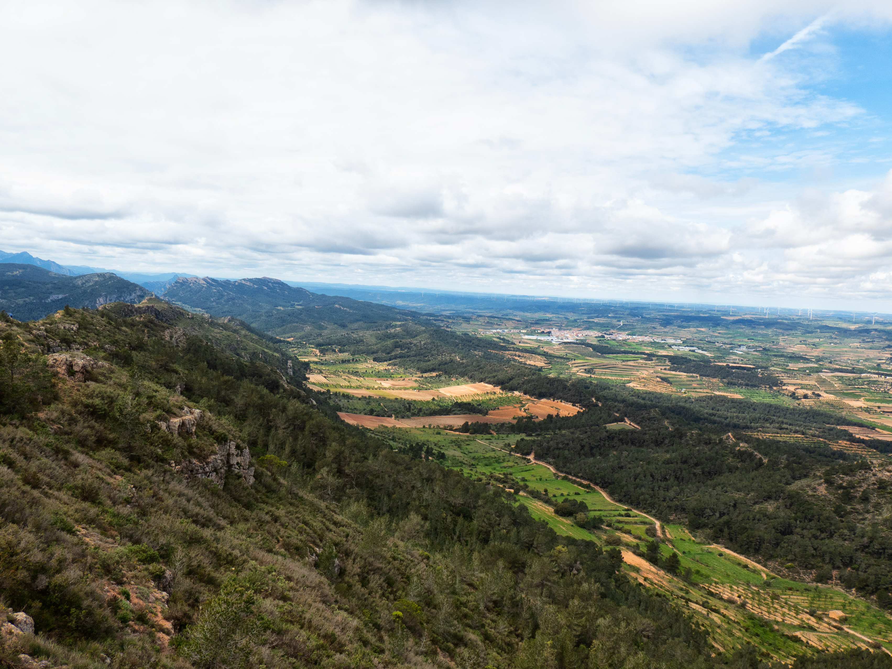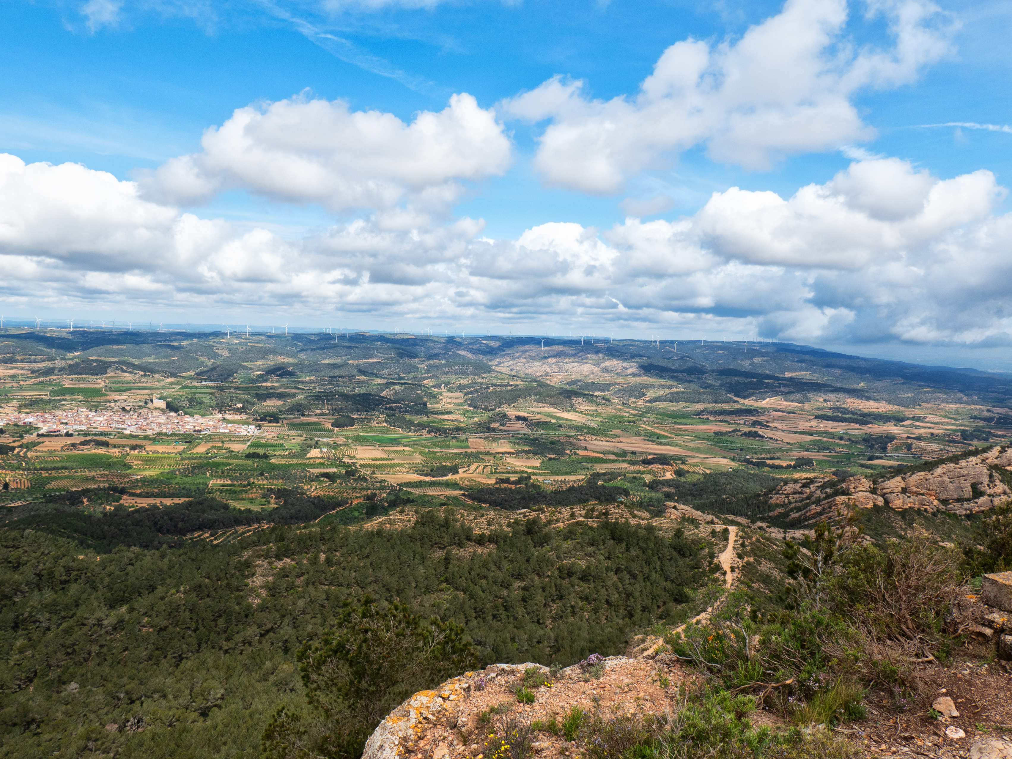 Desde la cima disfrutamos de una soberbia vista de la Vall de les Carroves, cuyos bucólicos campos quedan armónicamente delimitados por la Serra de Santa Madrona y la de Cavalls. A la derecha de la primera vemos Gandesa, capital de la Terra Alta.