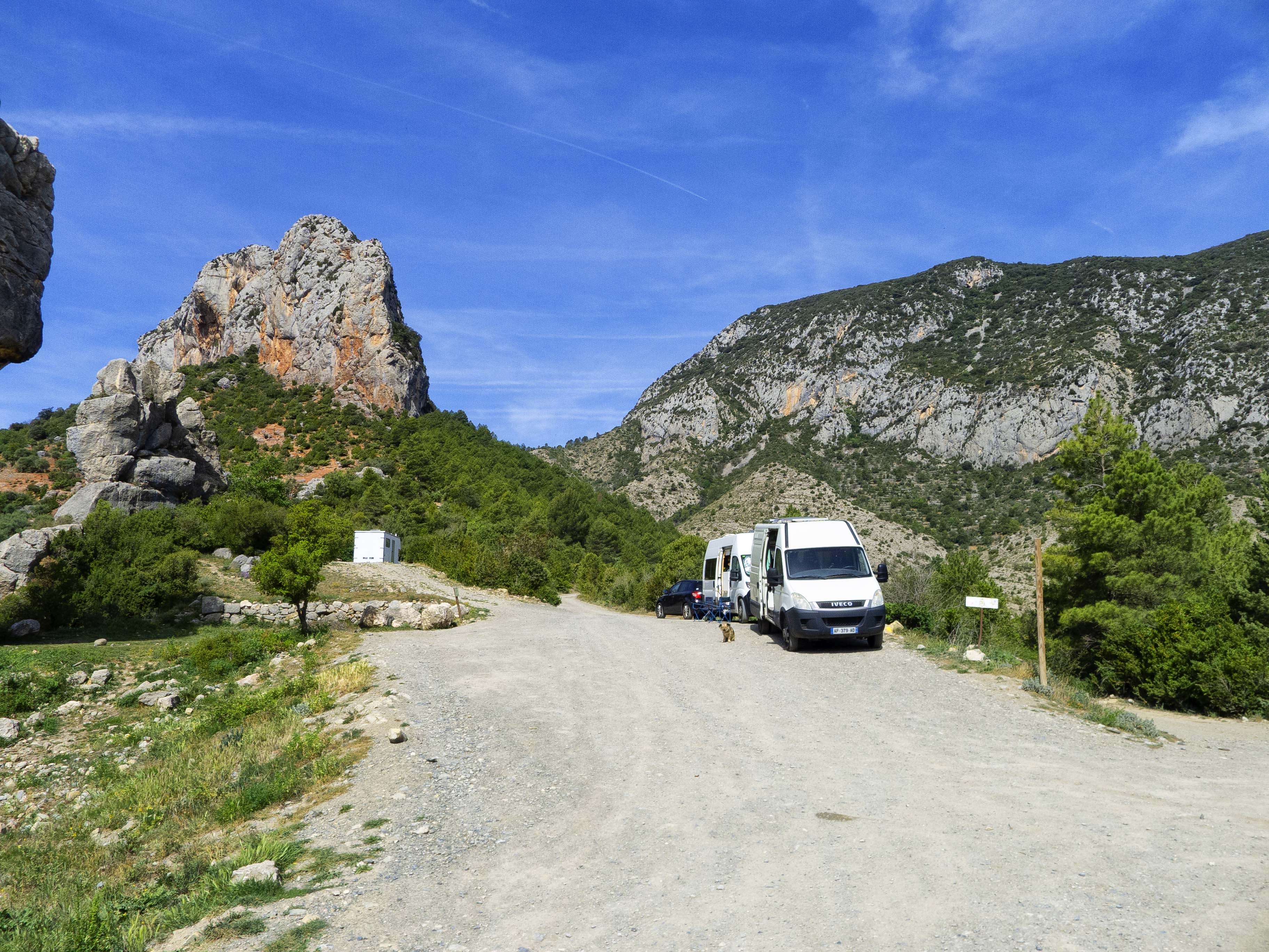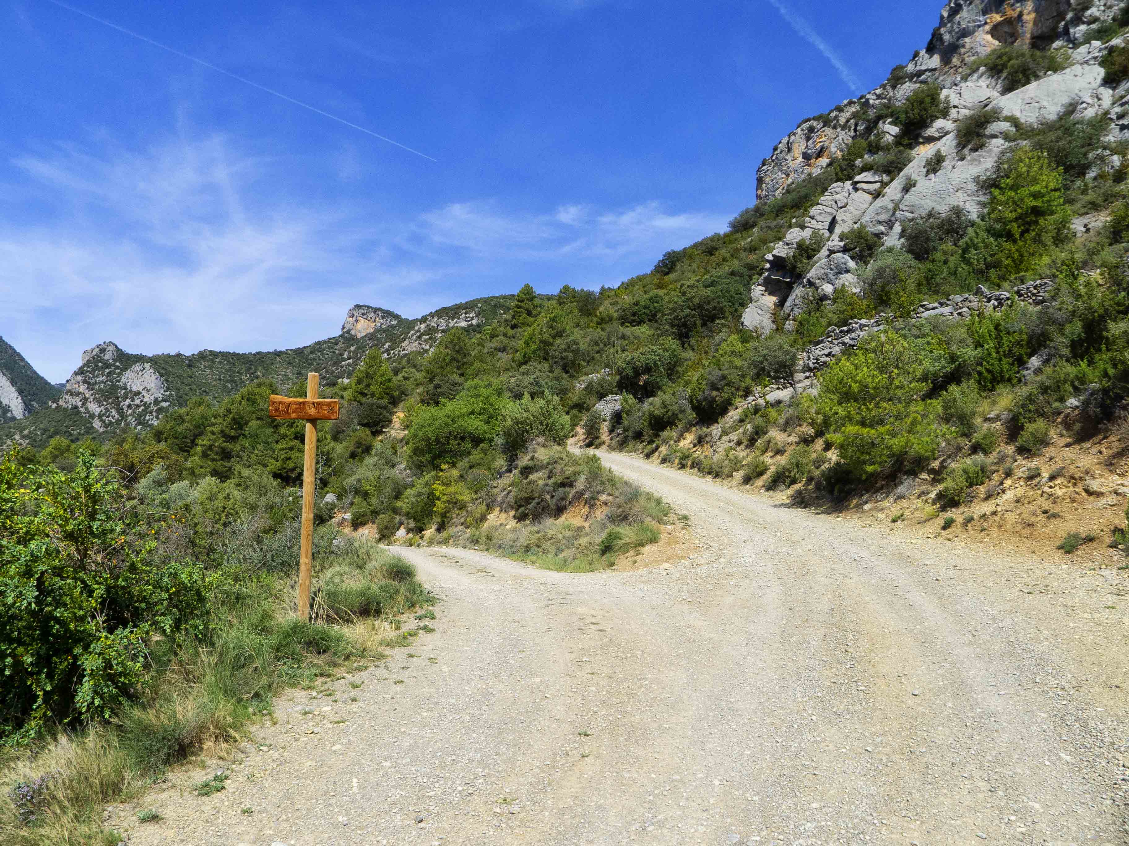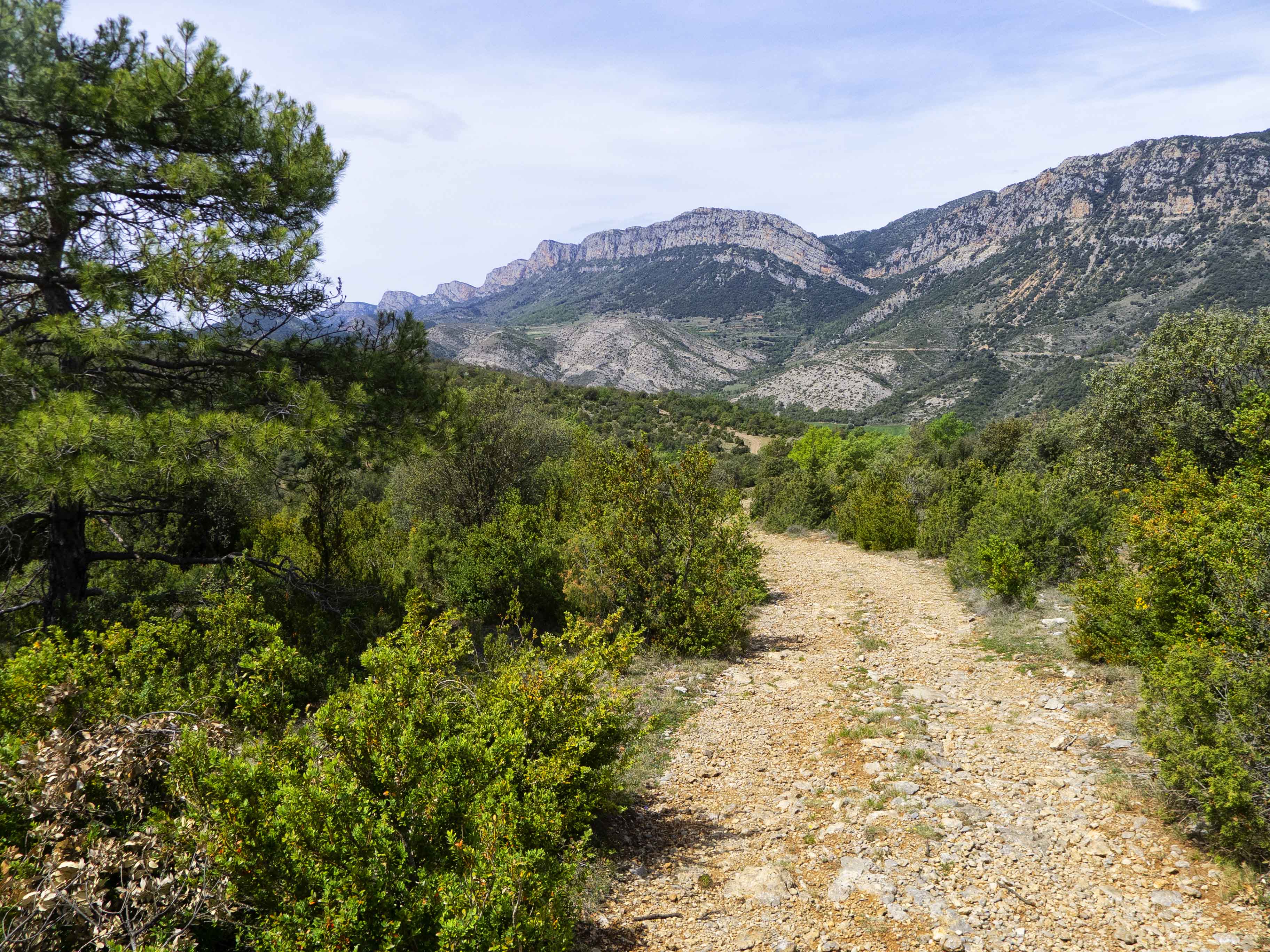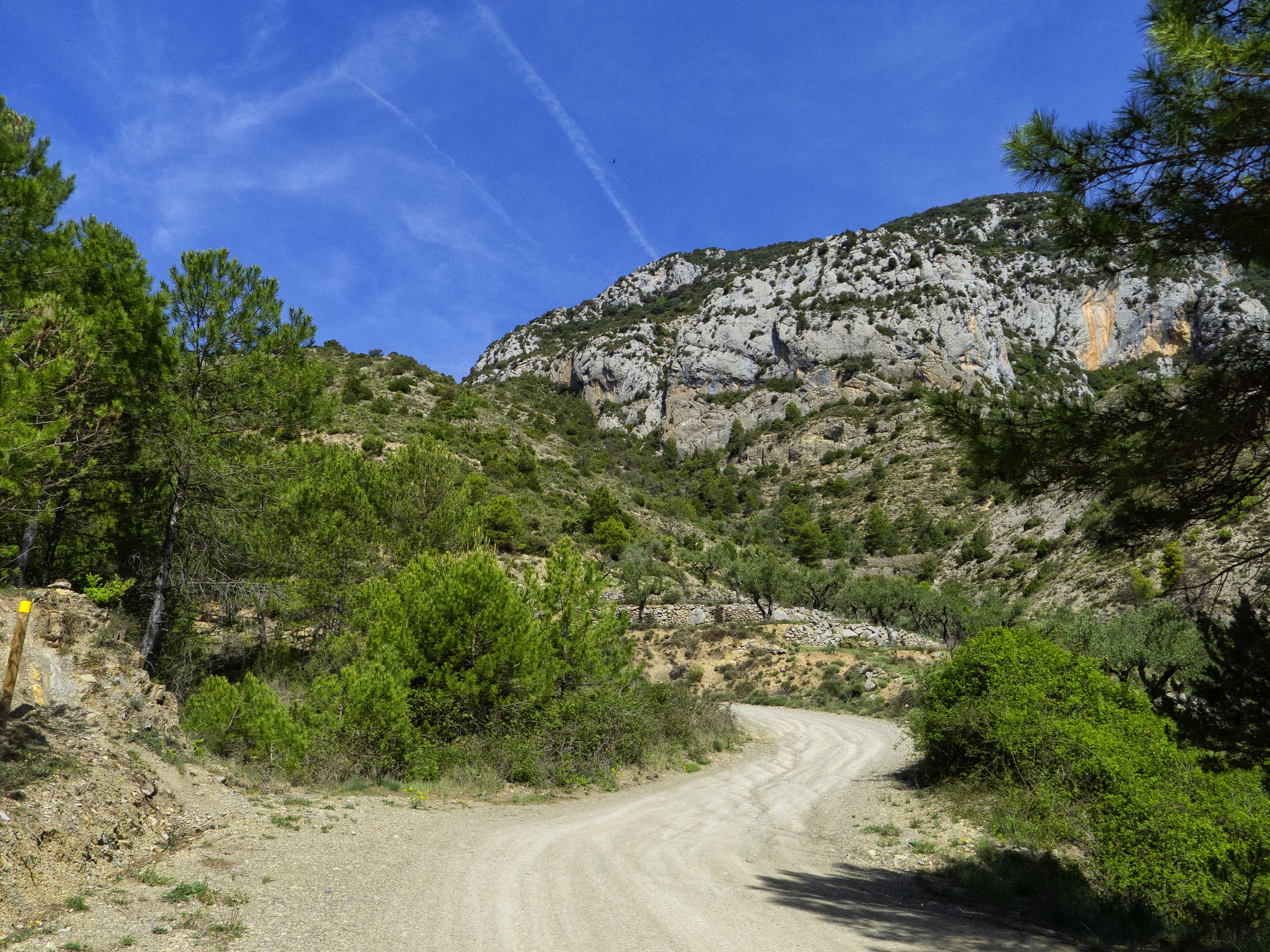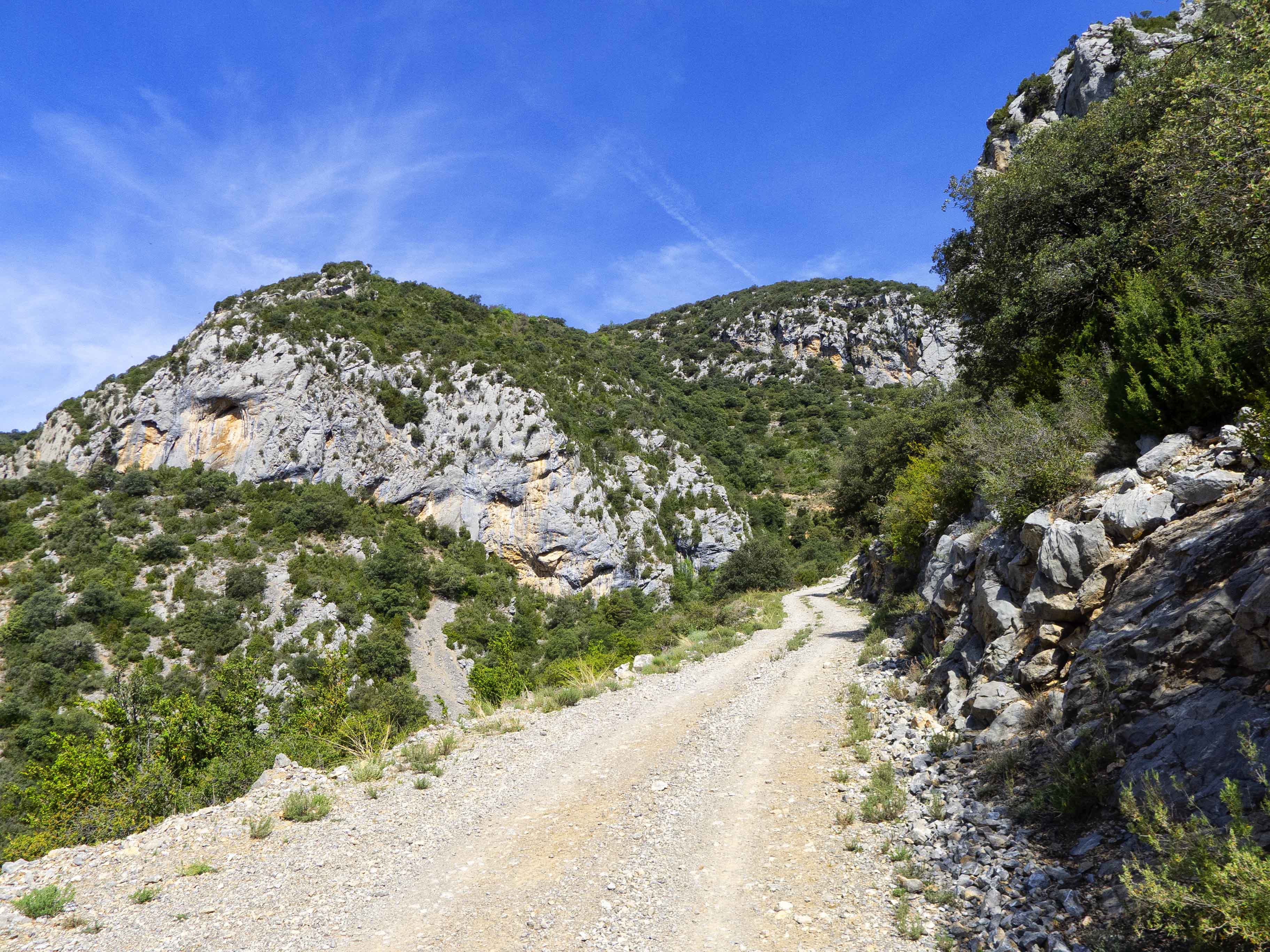 Tras rodear la cara sur de la Muntanya de Nargó, la pista se dirige hacia el único punto donde se rompe la muralla que protege la montaña: el Barranc de les Grases.