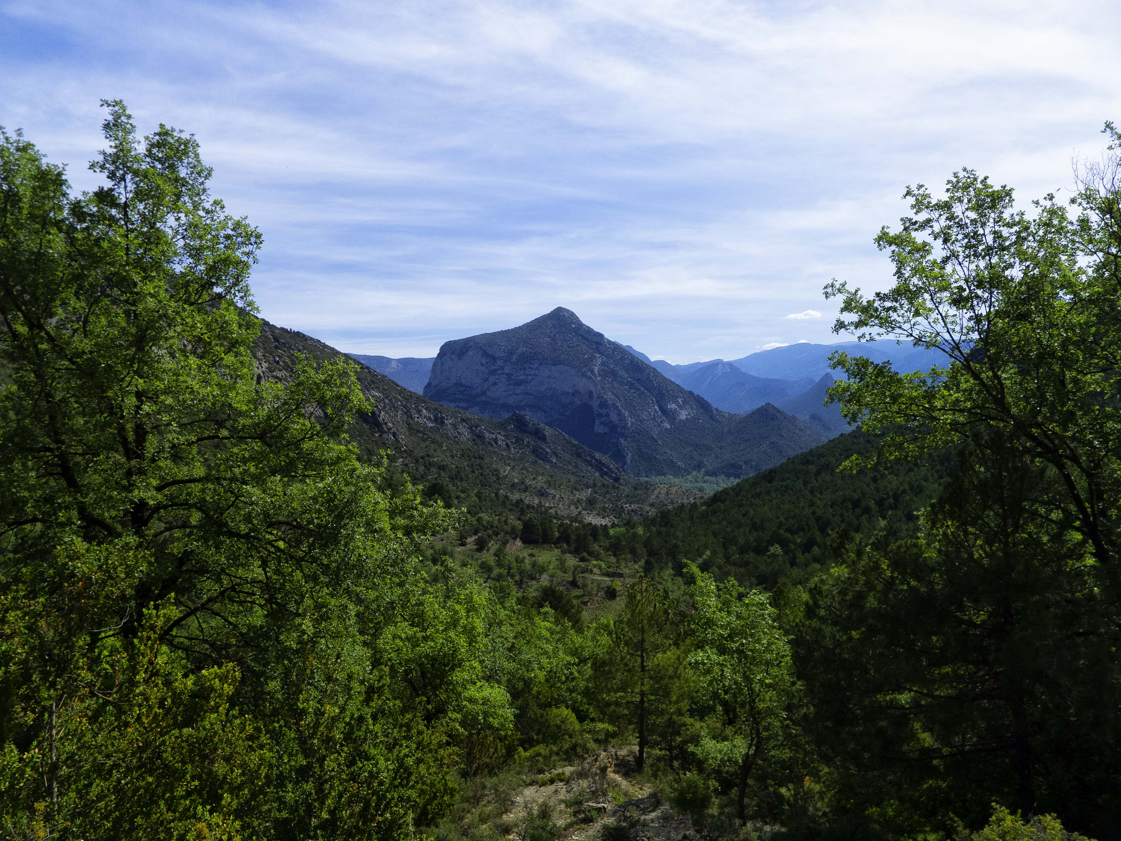 Habiendo ascendido la parte más importante de la subida, miramos atrás para ver la bonita entrada al barranco, con Aubenç de fondo.