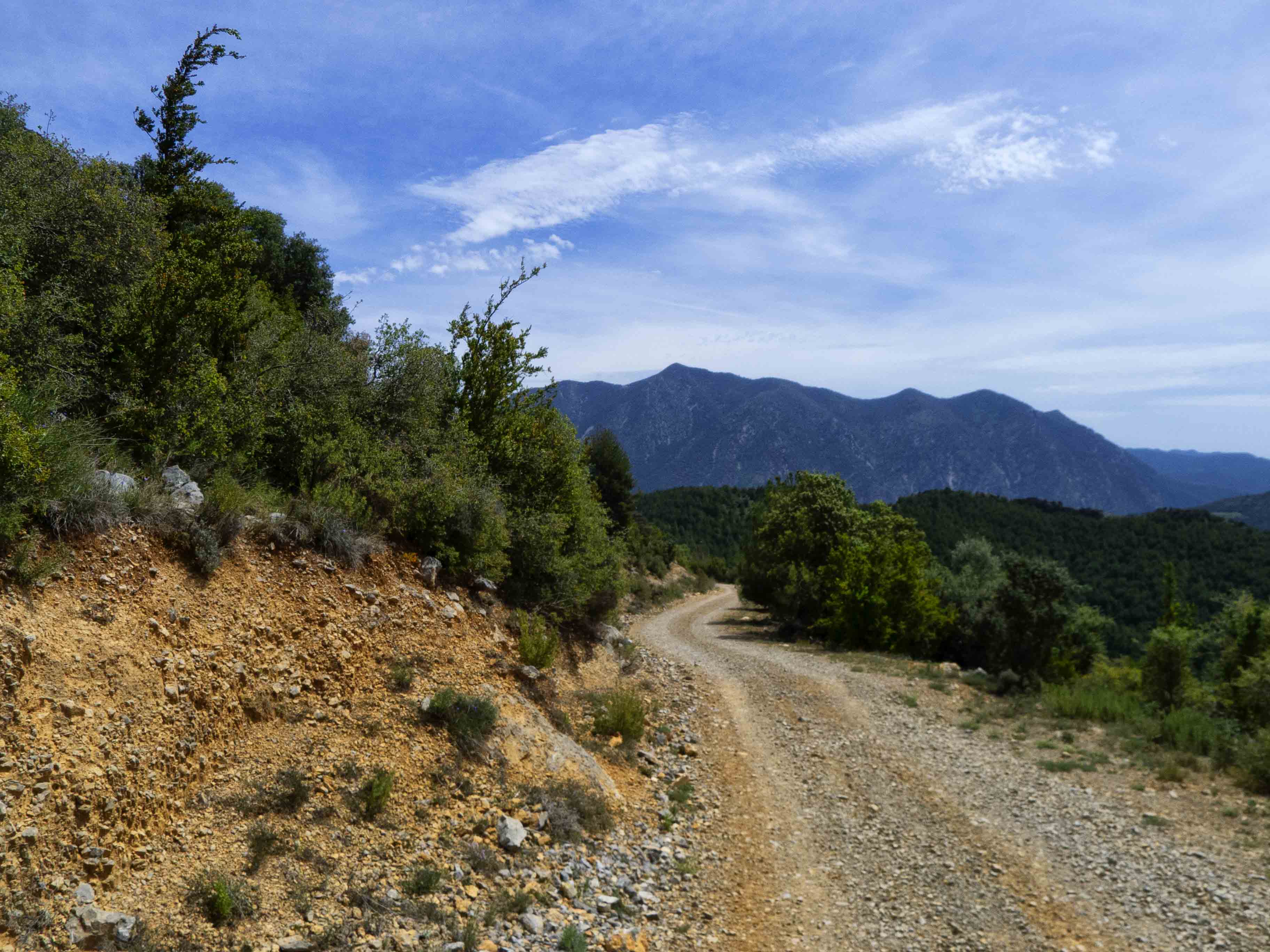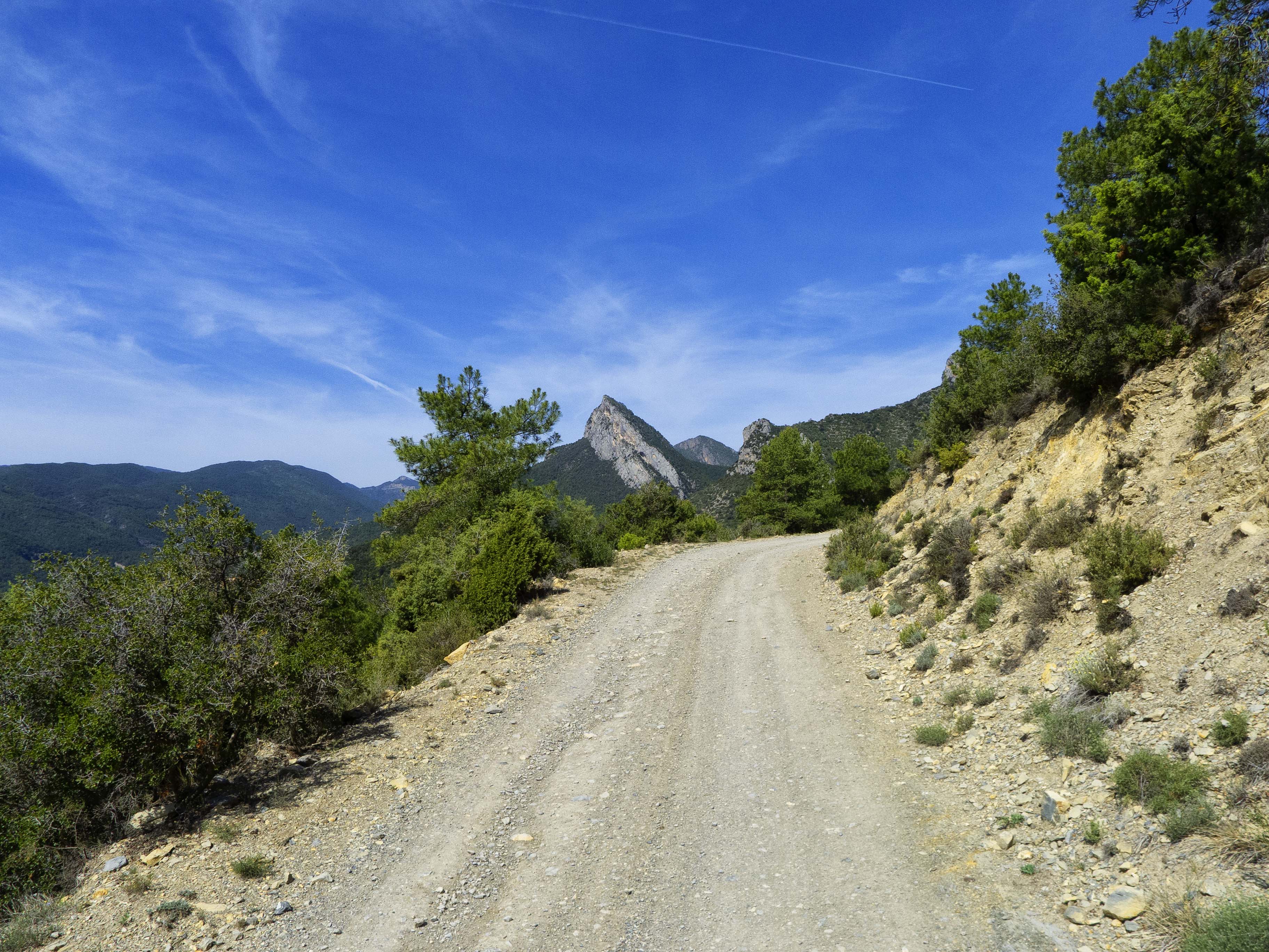 La pista va trazando curvas para ganar altura bajo la vigilancia de las paredes de la Muntanya de Nargó, principal causa de que debamos rodear toda la montaña para atacar la cumbre.