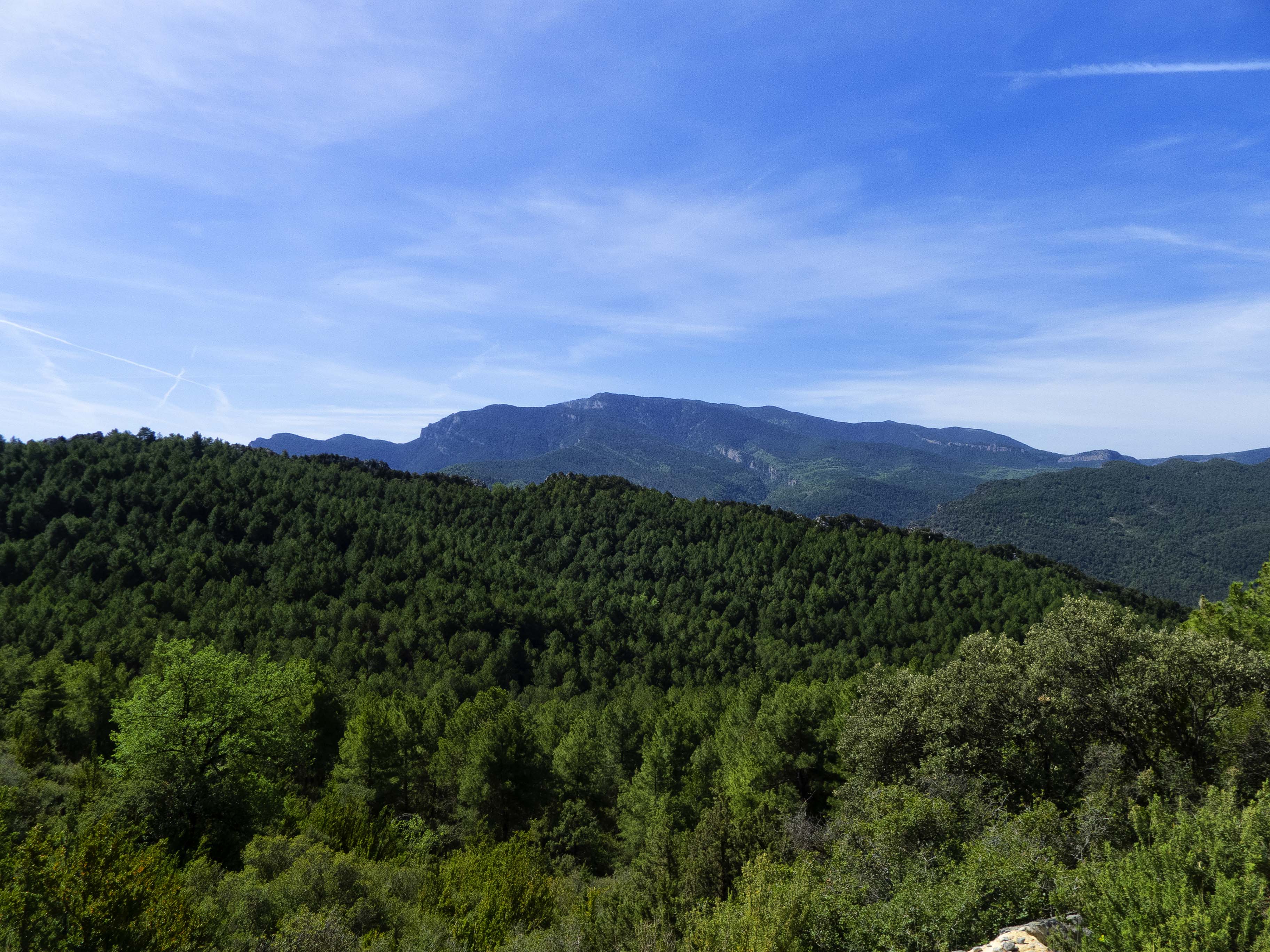 Mirando atrás, hacia el oeste, un reino de roca cubre hasta donde abarca la mirada. Tanto en la lejanía, donde se divisa hasta los inicios de la Serra de Carreu, como en primer plano, con la muralla de la Serra de Sant Joan, roquedos y peñas aparecen por doquier.