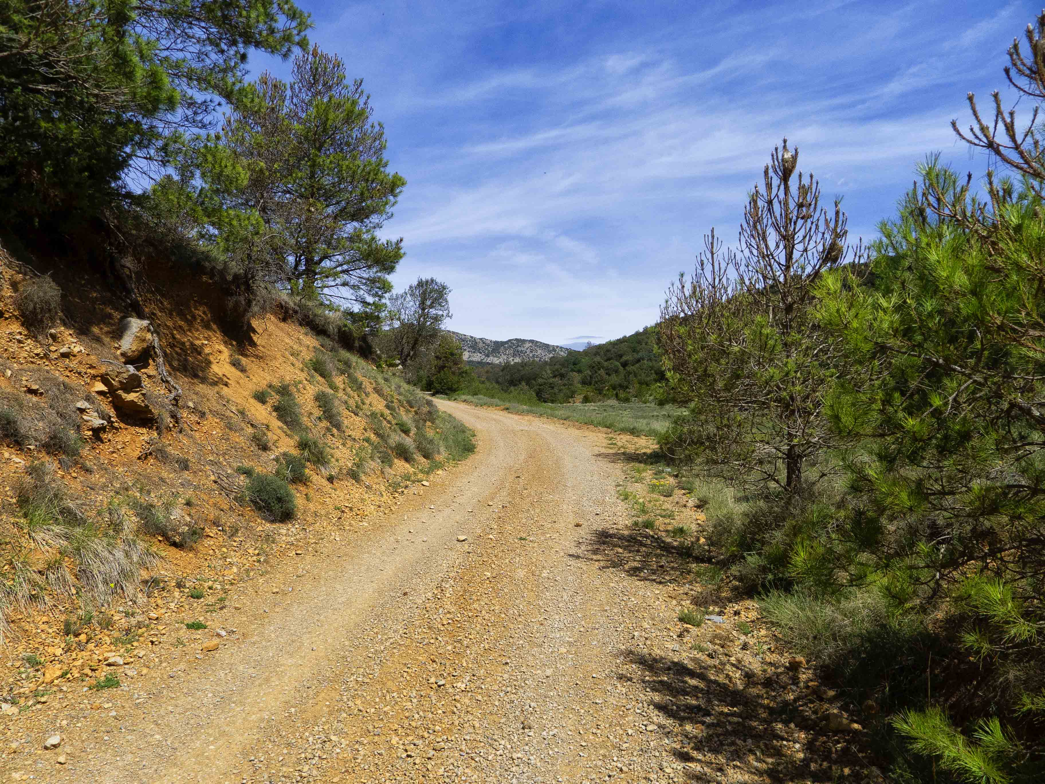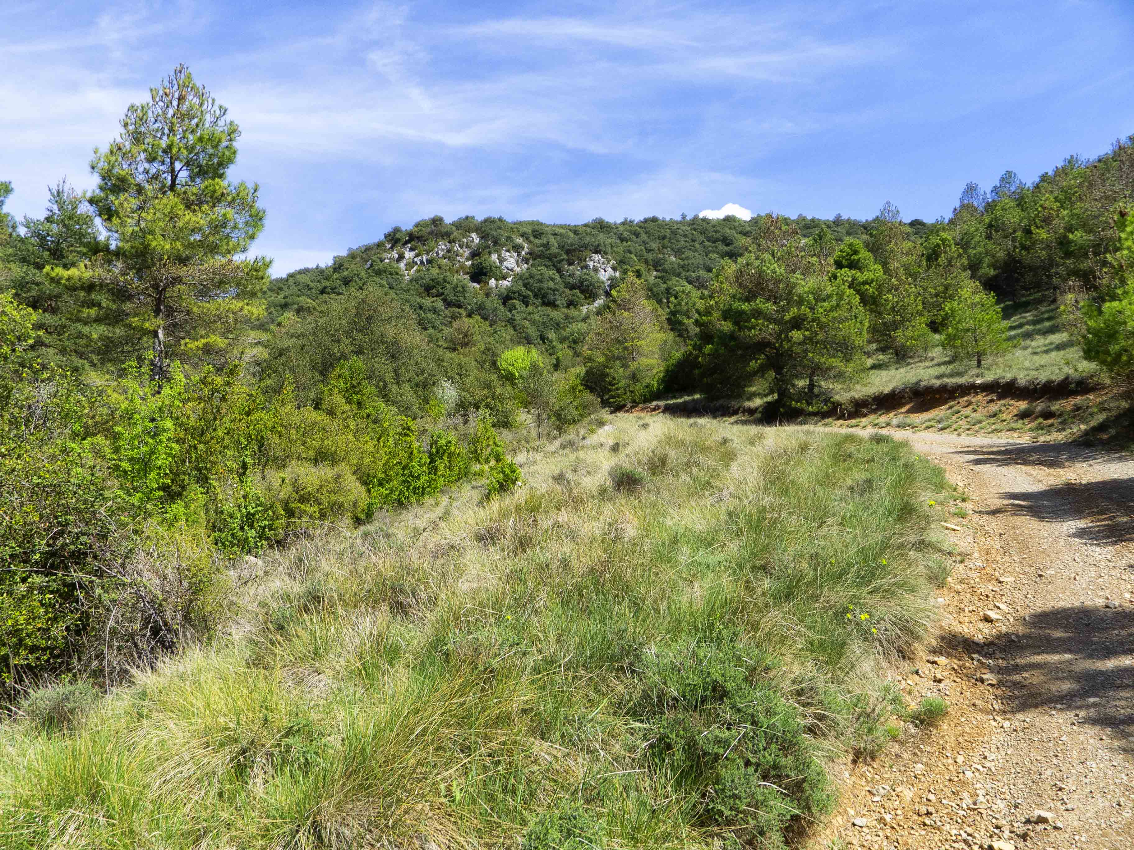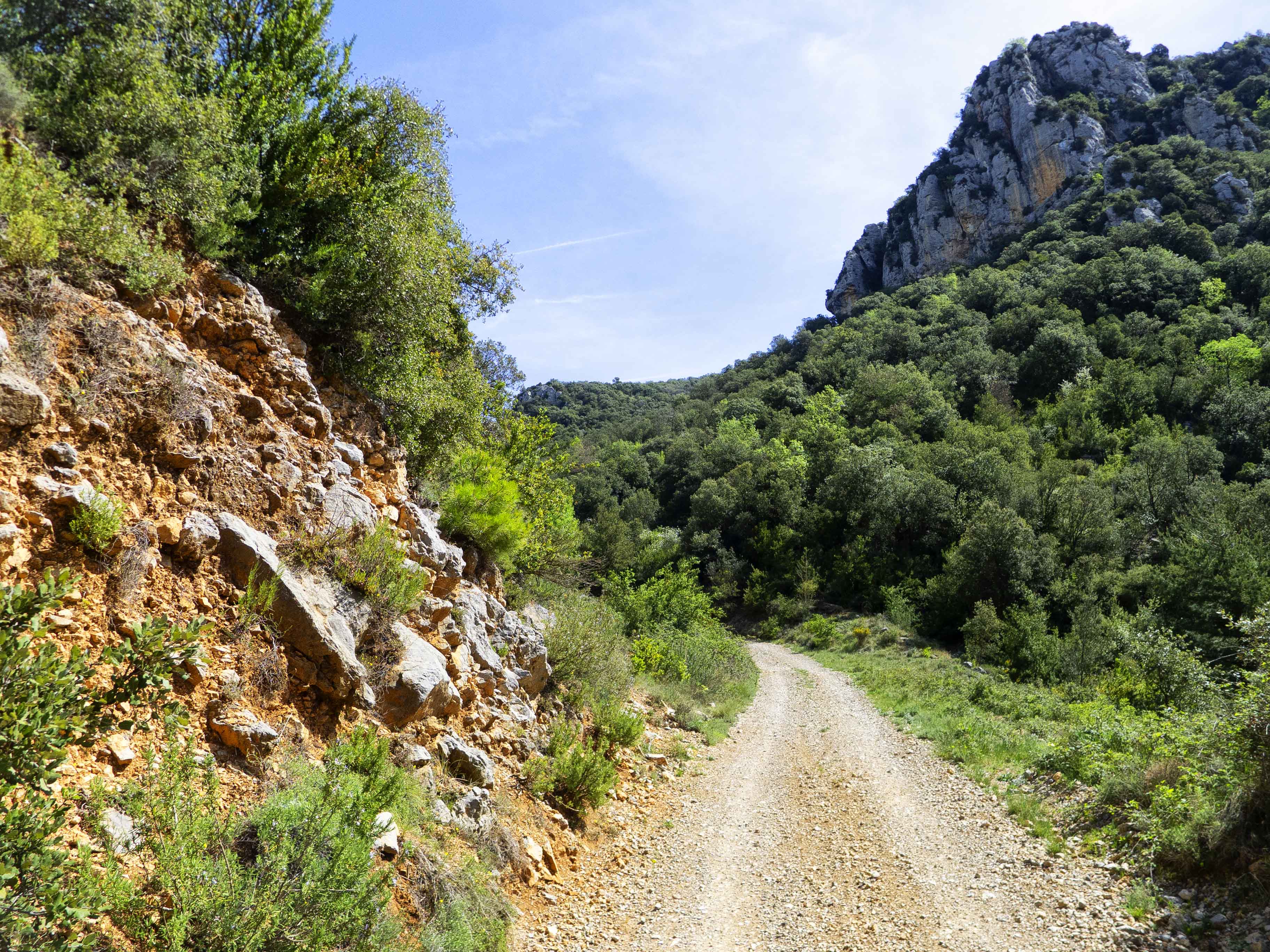Siguiendo la pista principal, que sube hacia el Grau del Miquelet, entramos en el boscoso Barranc del Vilarenc, donde andaremos bajo la única sombra de la jornada.