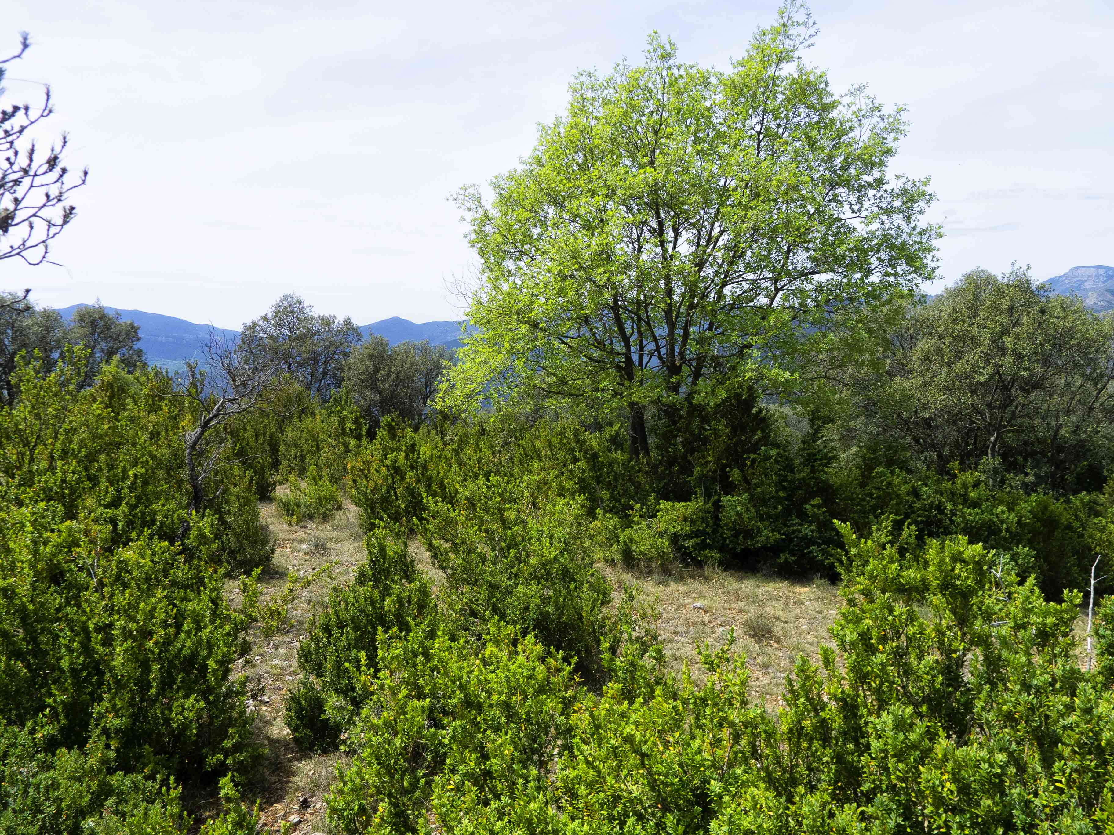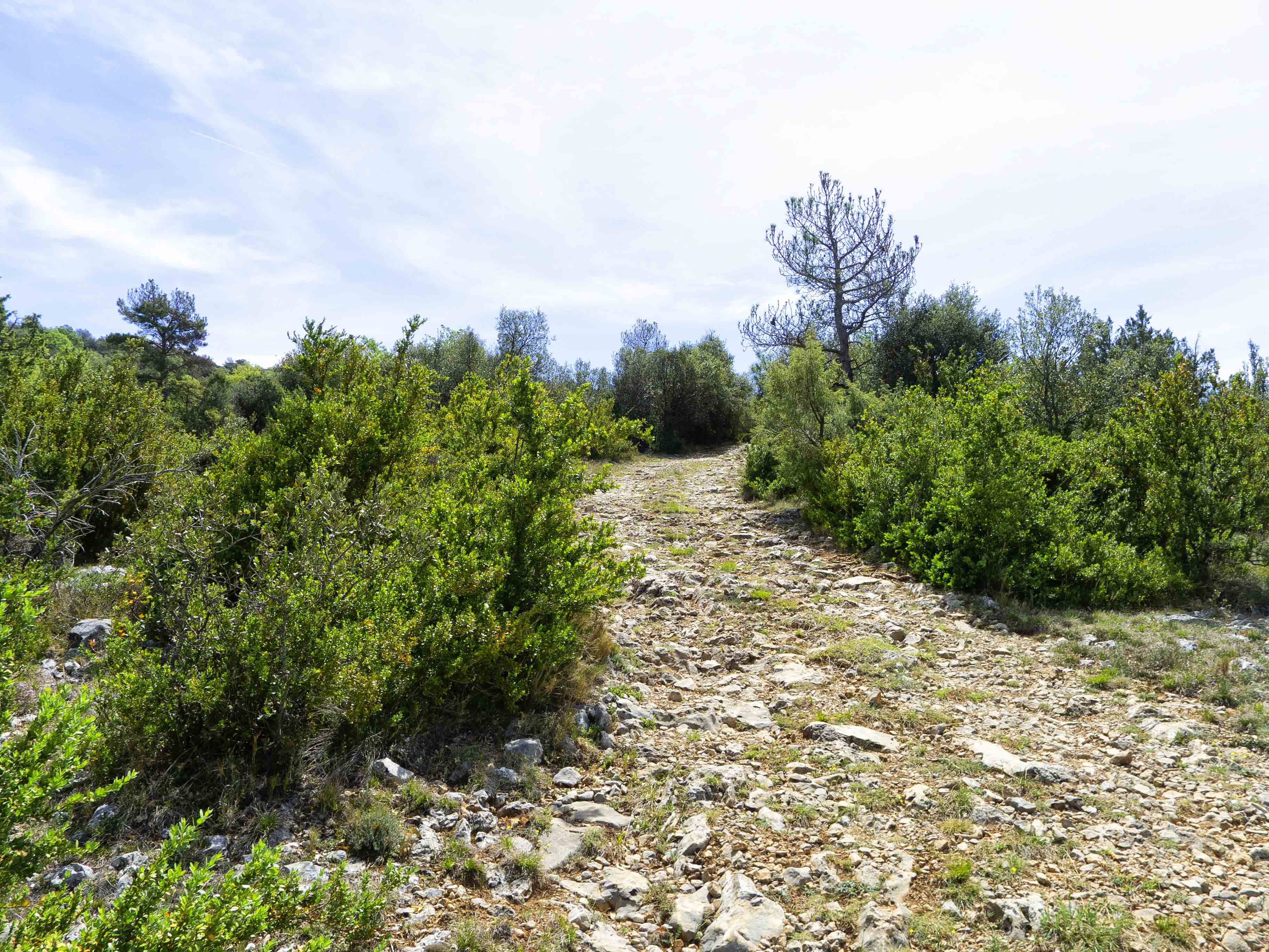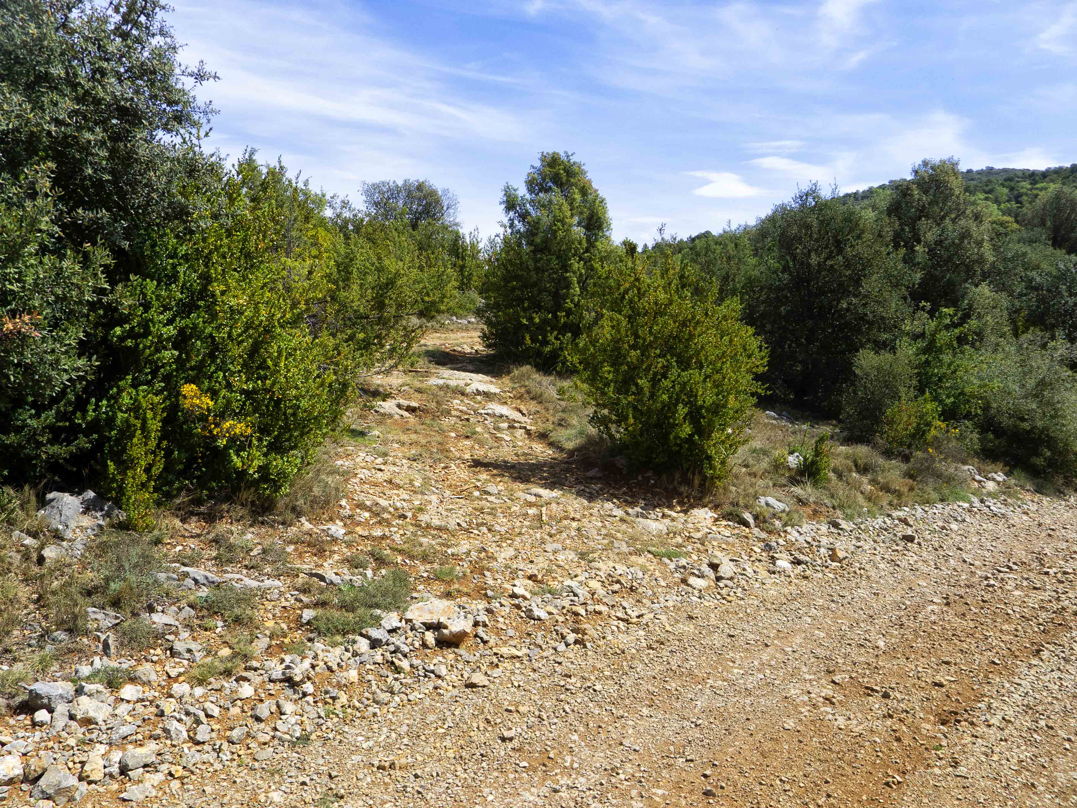 Siguiendo la pista principal, que sube hacia el Grau del Miquelet, entramos en el boscoso Barranc del Vilarenc, donde andaremos bajo la única sombra de la jornada.