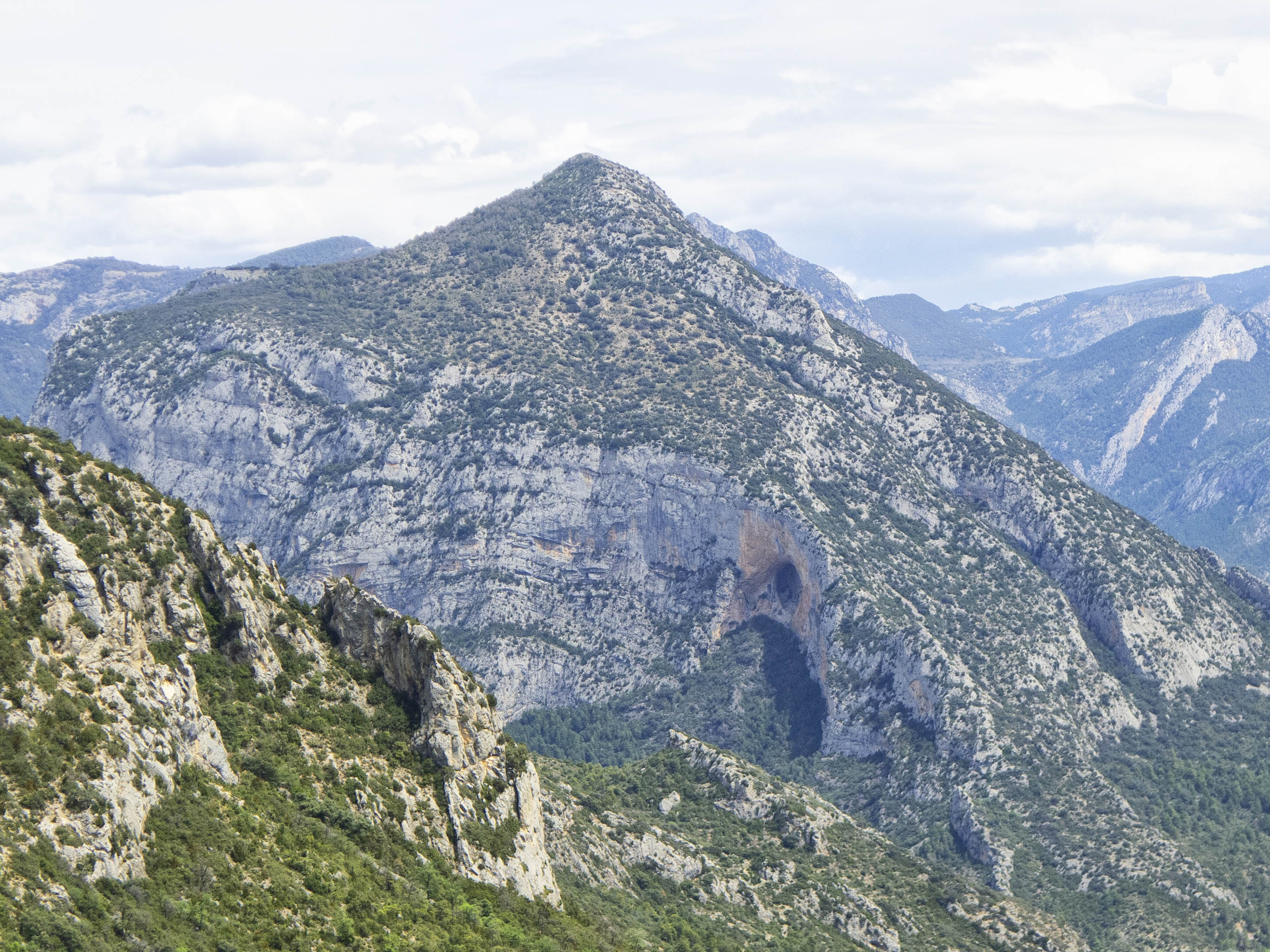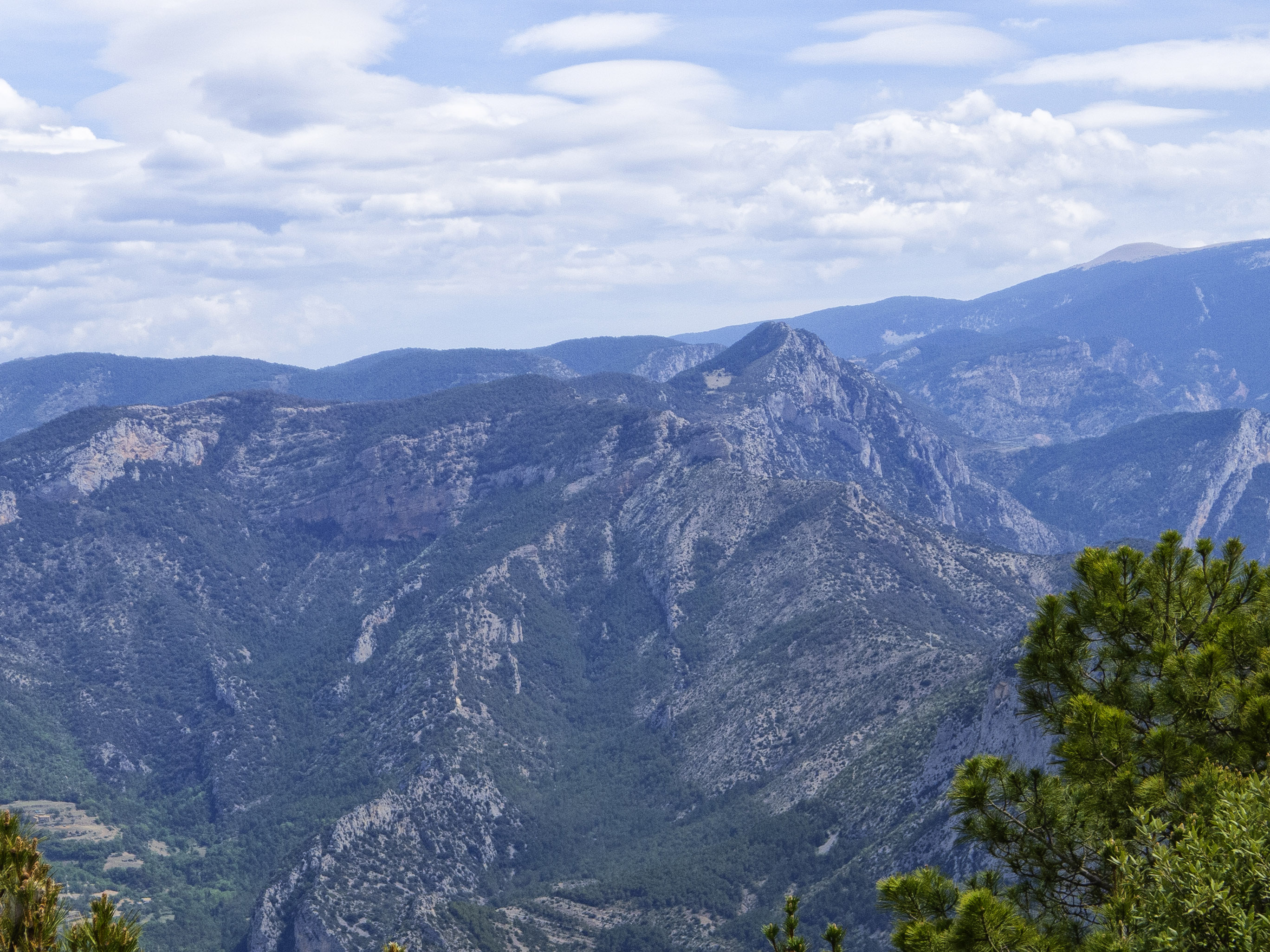 Hacia el este, el Roc de Galliner despunta por encima del agreste valle de Perles, que es coronado por la gris cabeza de la Tossa Pelada, ya en el Port del Comte.