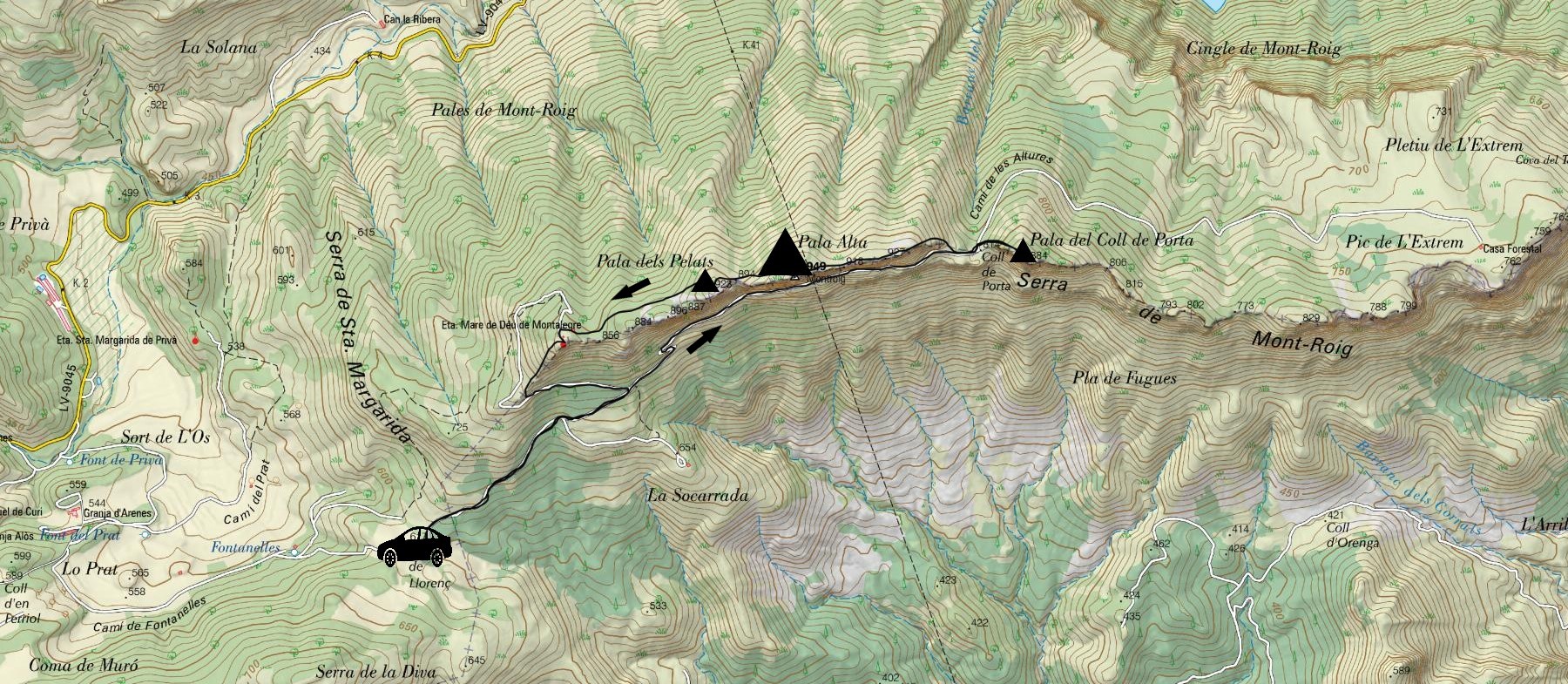 La primera parte de la excursión es por la pista del Camí de les Altures, que nos puede dejar en la ermita de Montalegre, situada en la cumbre más occidental del Mont-Roig o en el Coll de Porta. Para llegar al collado seguimos a la derecha, internándonos de lleno en la vertical cara sur del Mont-Roig.