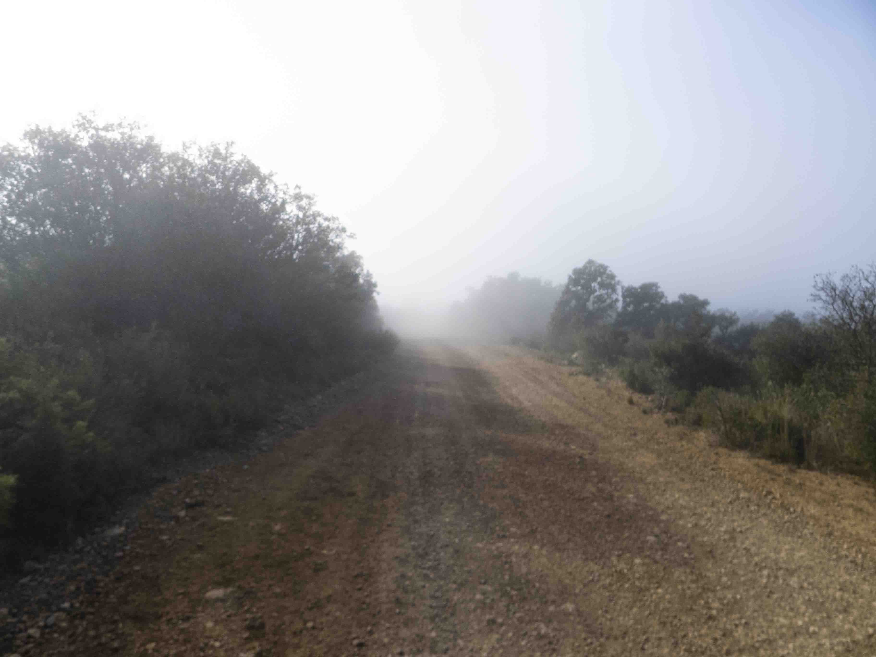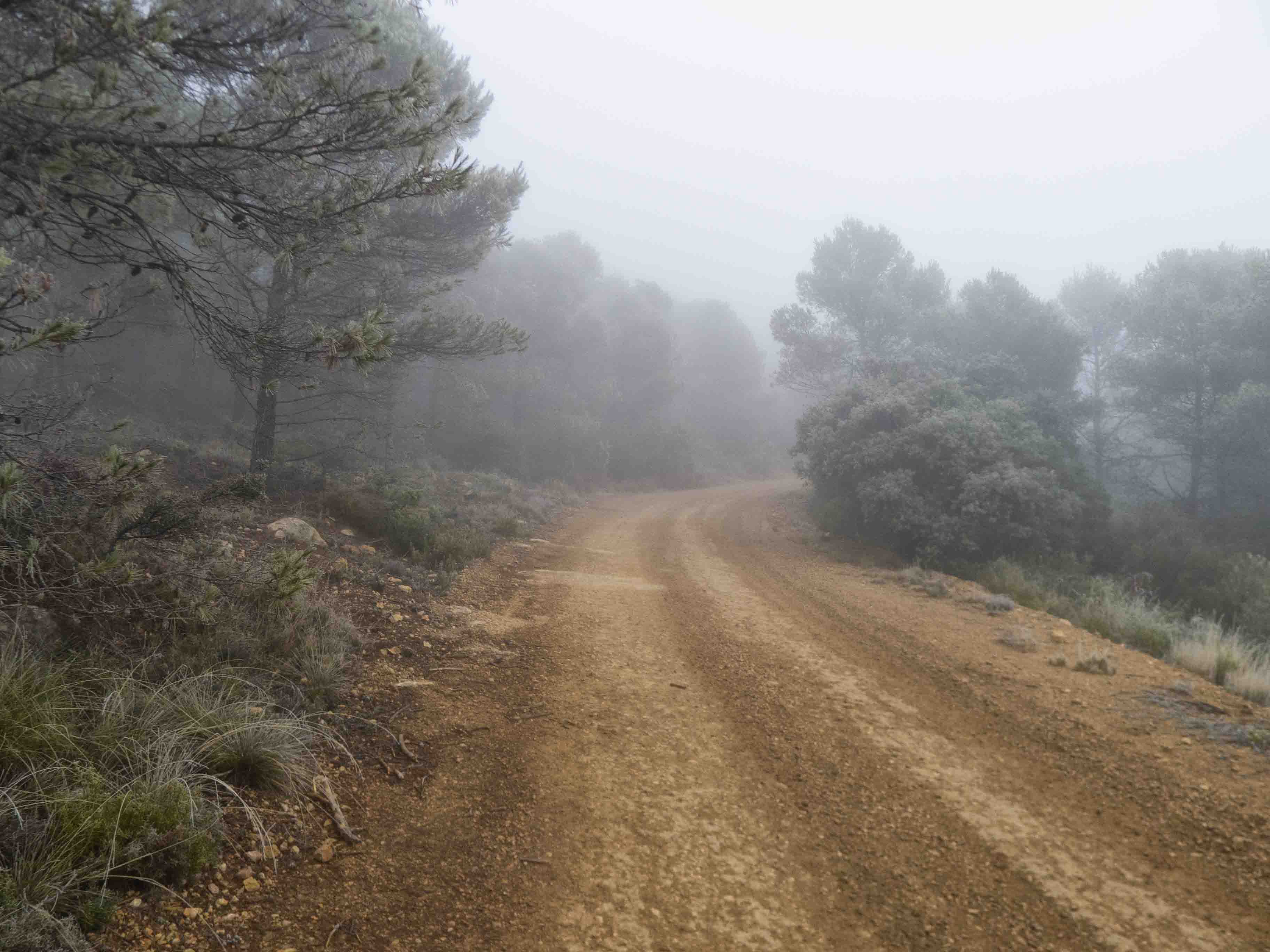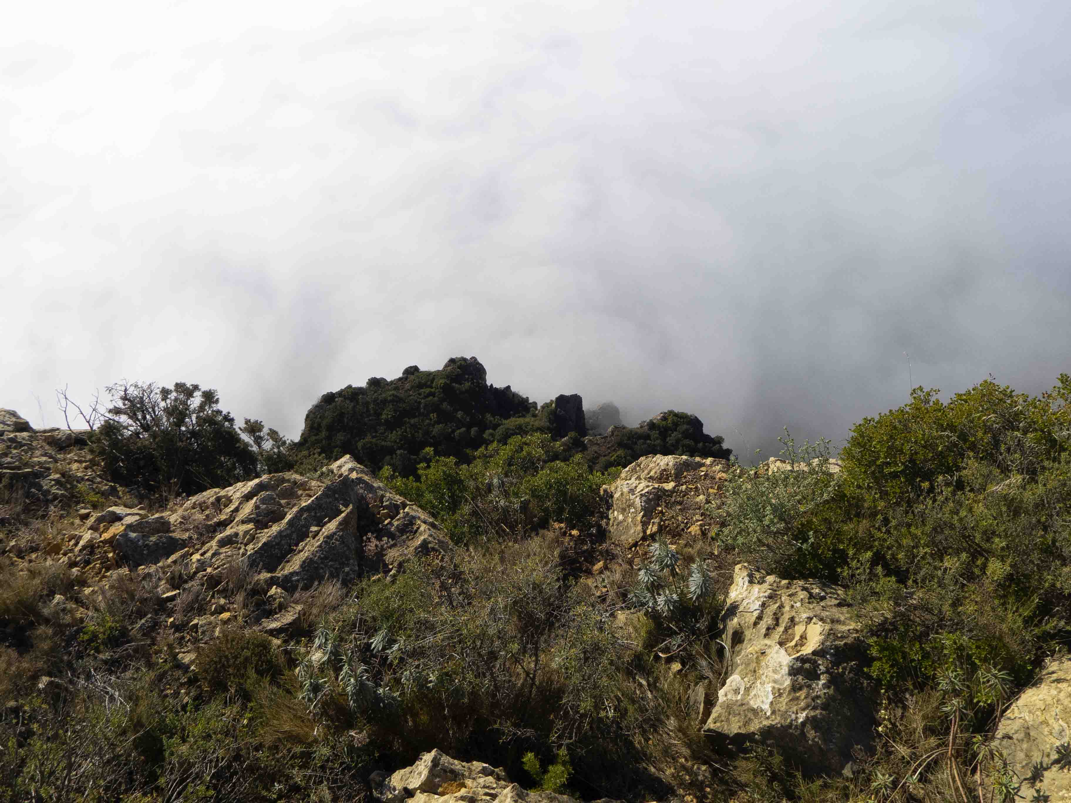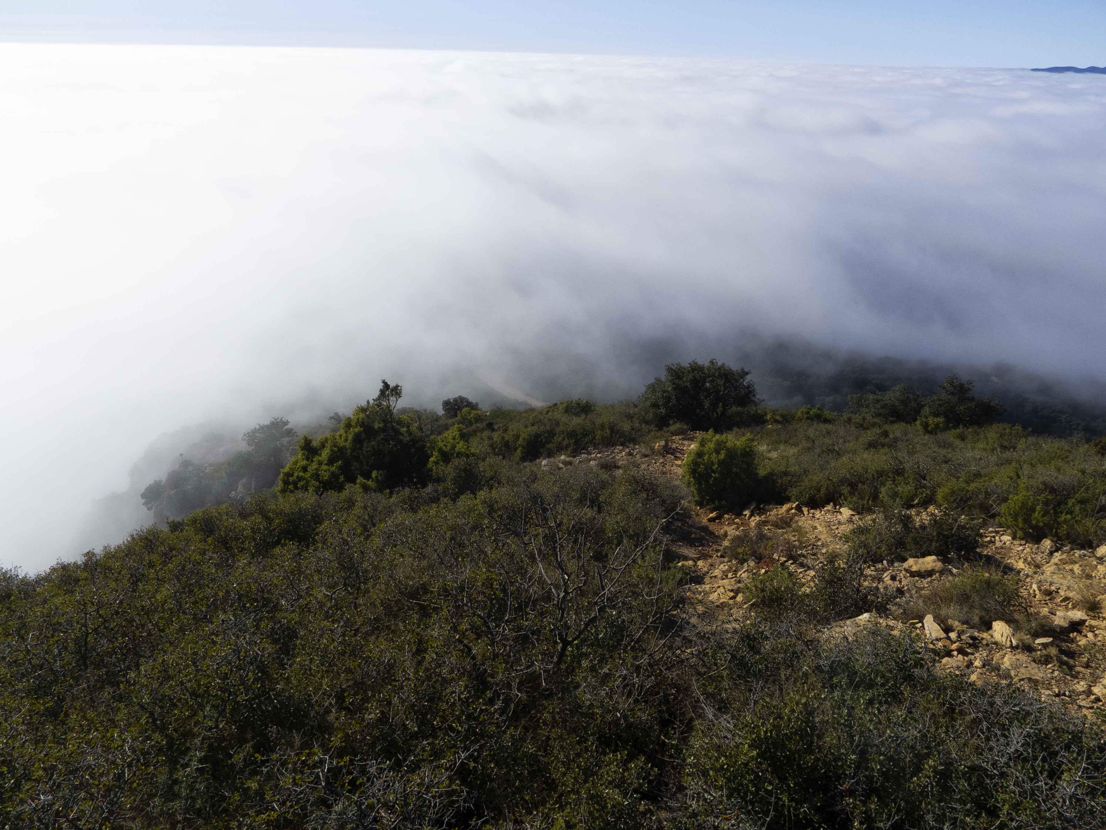 ...mientras que a la derecha la niebla cubre hasta donde abarca la vista, quedando la frontera entre el terreno despejado y la gris bruma a apenas unos metros por debajo de nosotros. La Serra de la Devesa es una isla rodeada de este fabuloso mar de niebla.