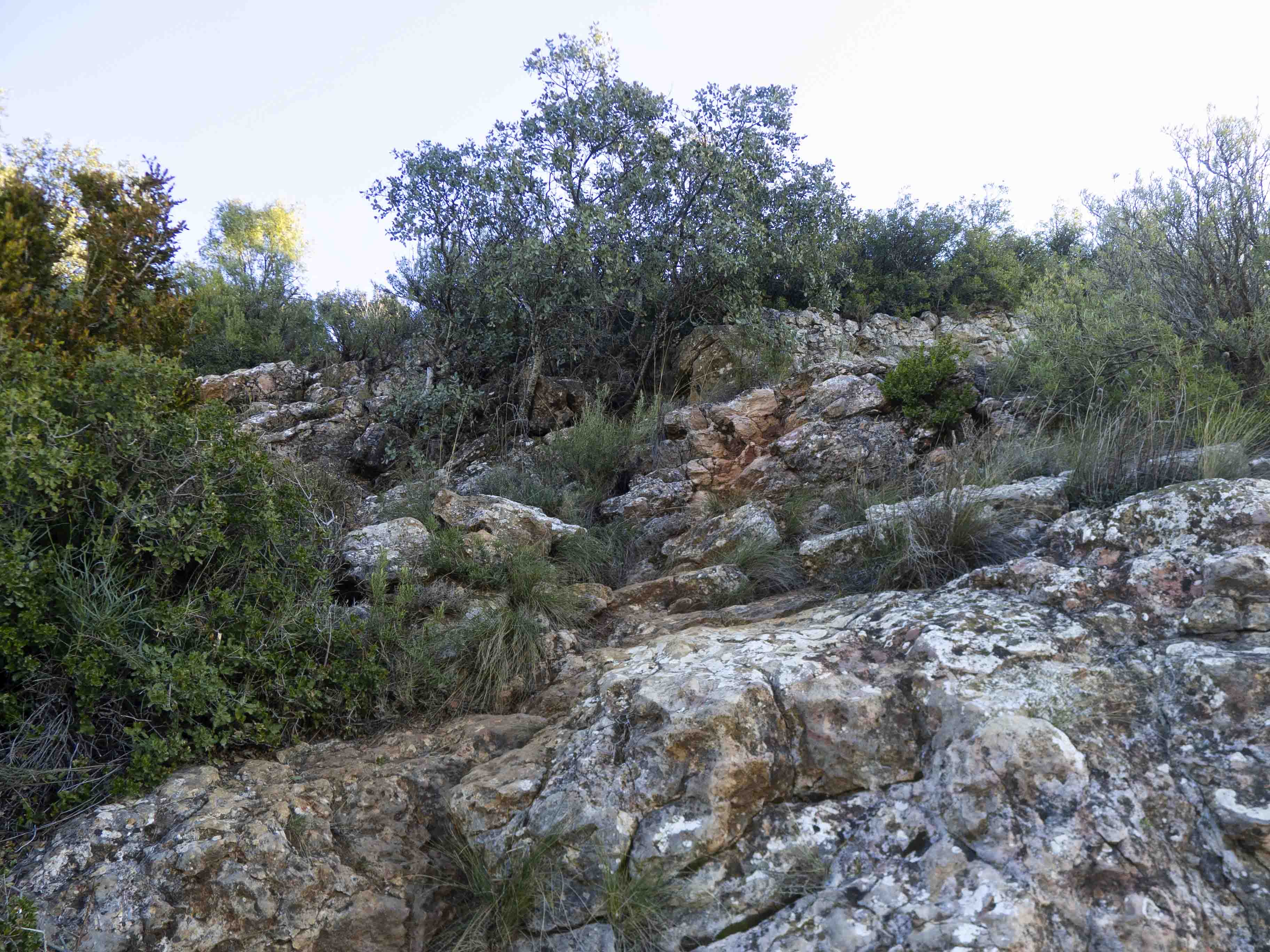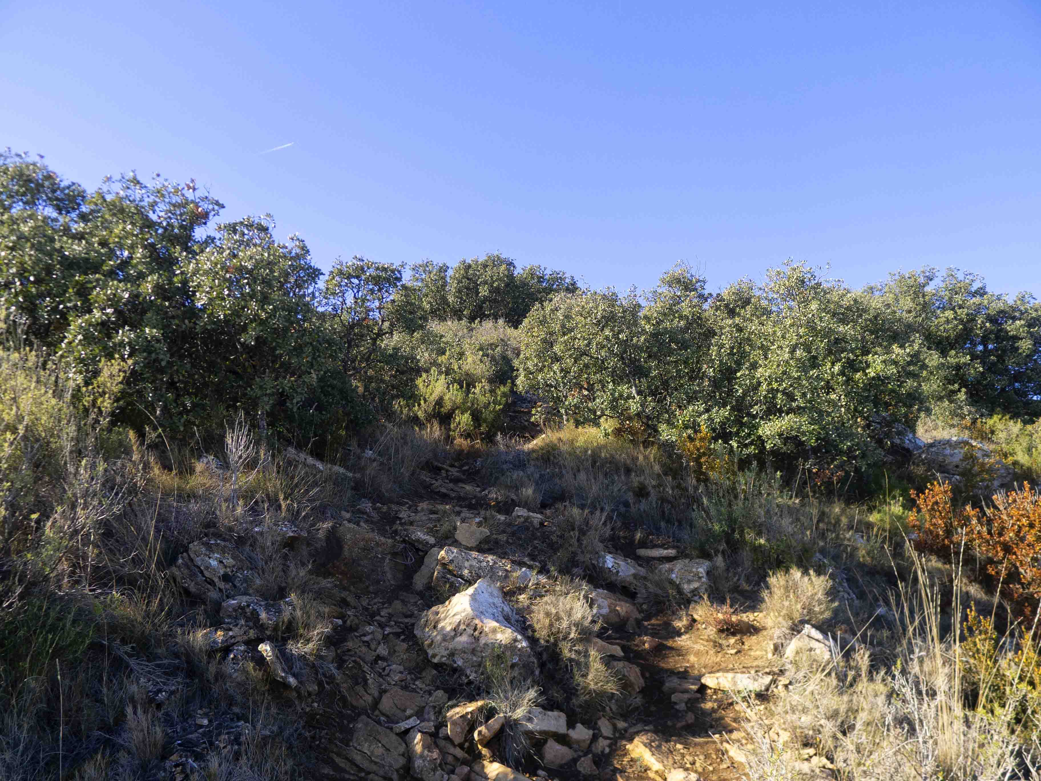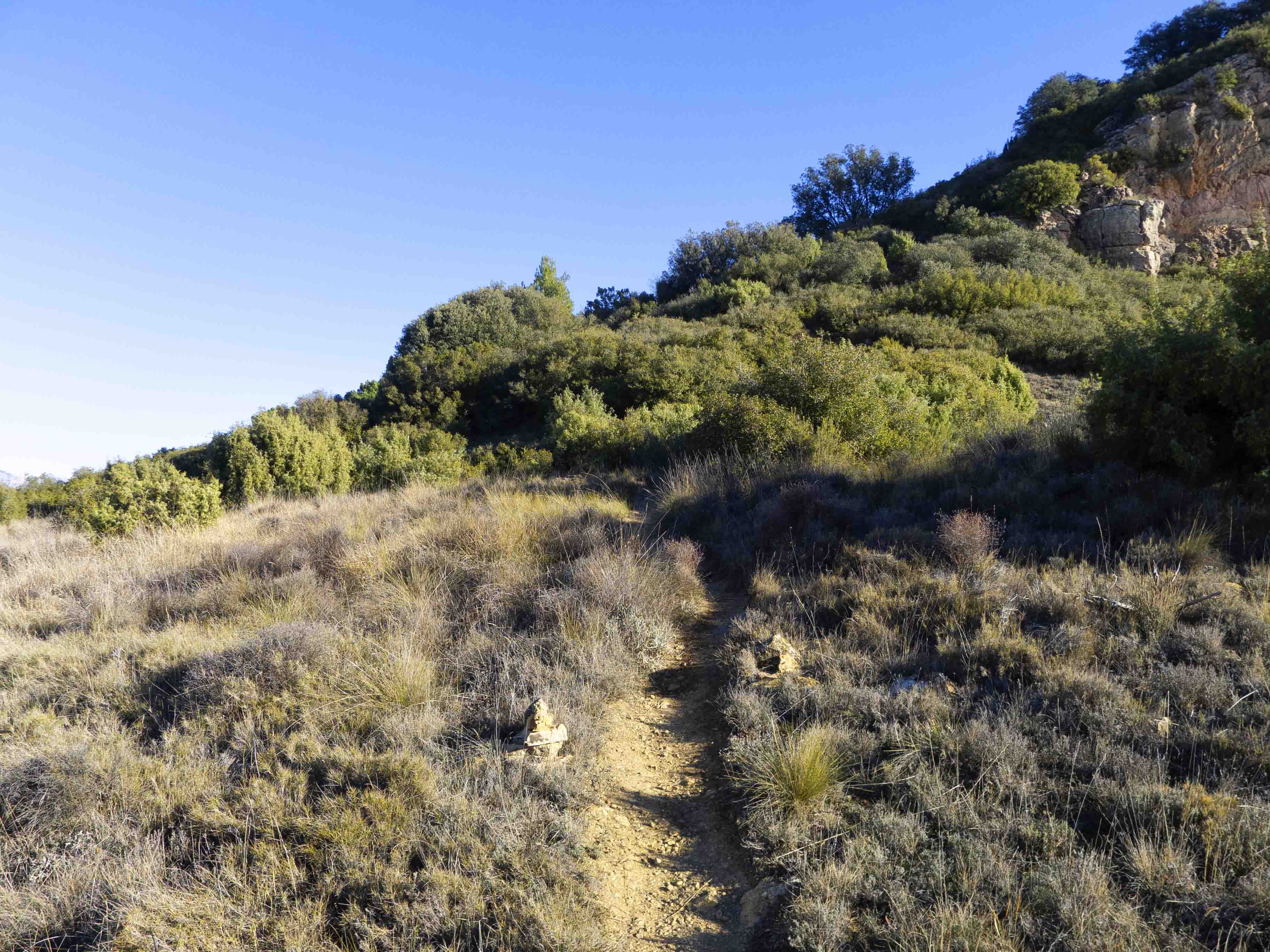 El sendero sigue la tónica de la sierra, empinado y rocoso, pero mayormente cómodo, esquivando carrascas y otros arbustos ascendiendo entre zigzags.