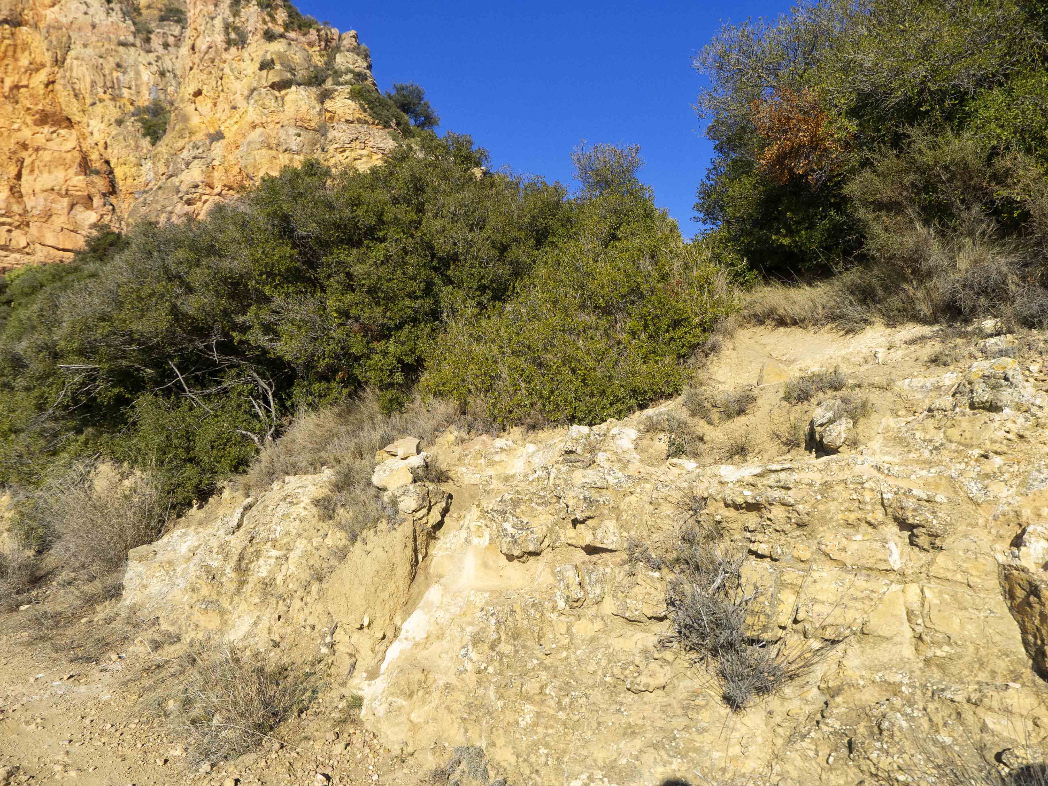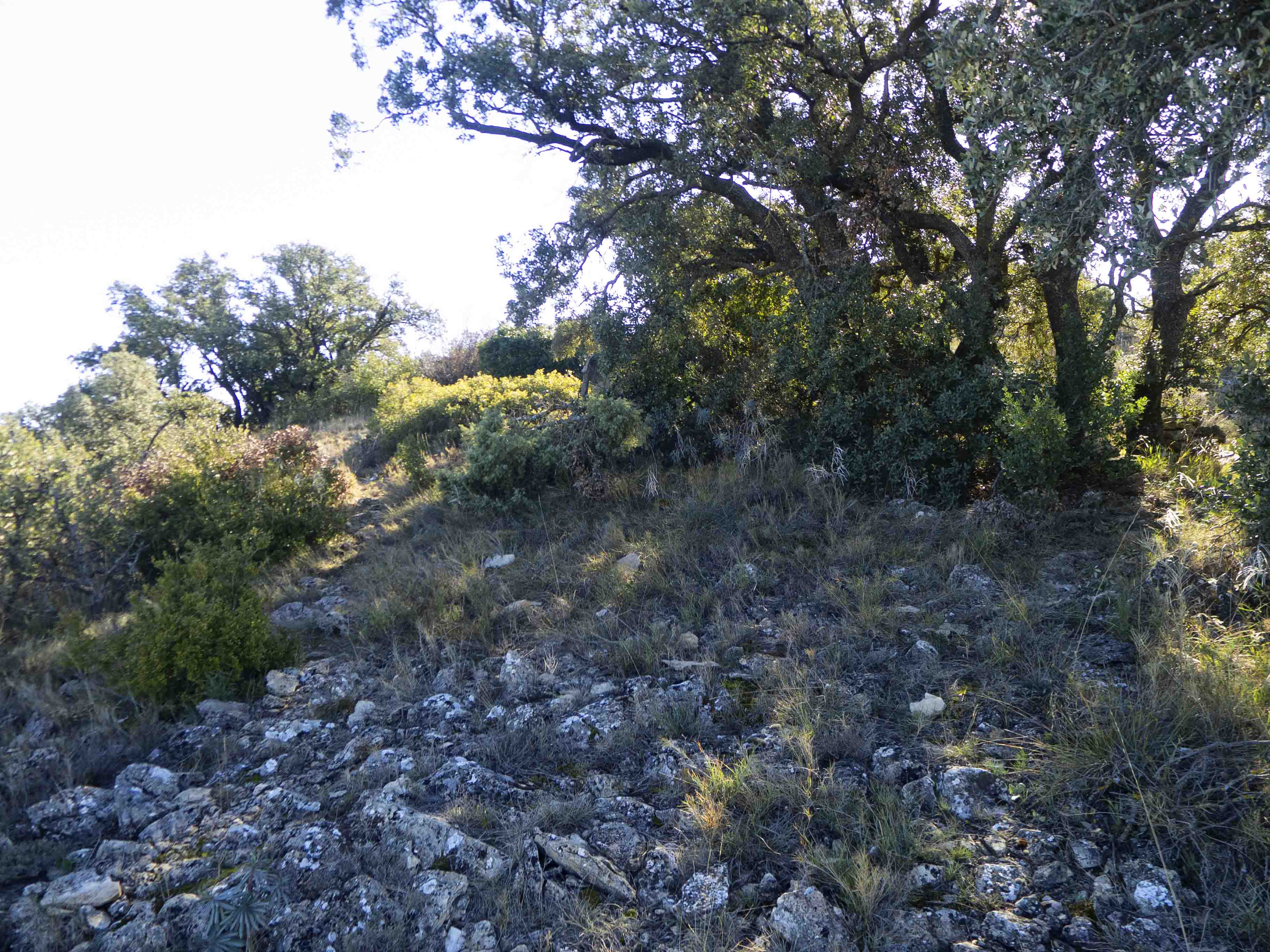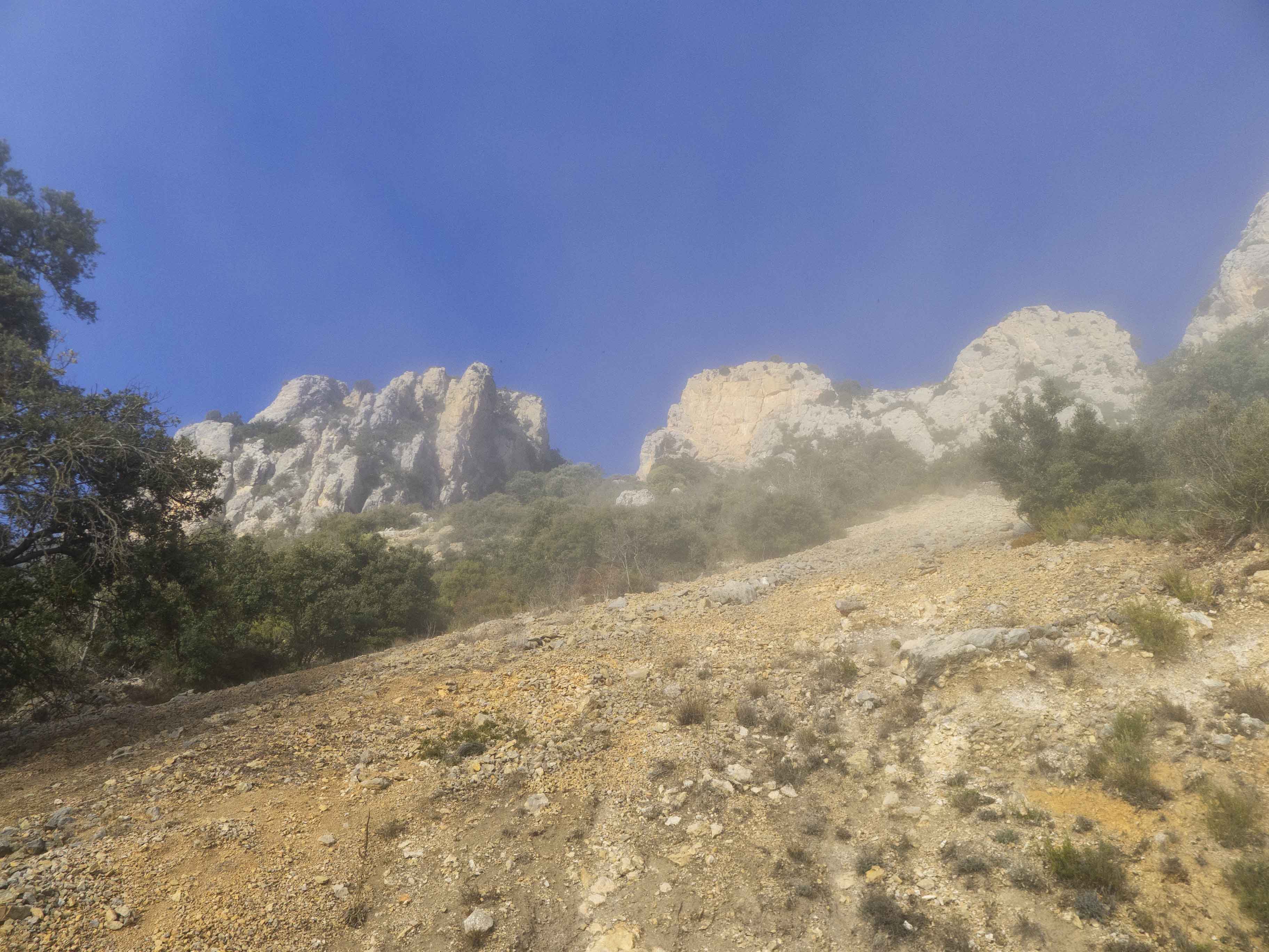 El sendero sigue la tónica de la sierra, empinado y rocoso, pero mayormente cómodo, esquivando carrascas y otros arbustos ascendiendo entre zigzags.