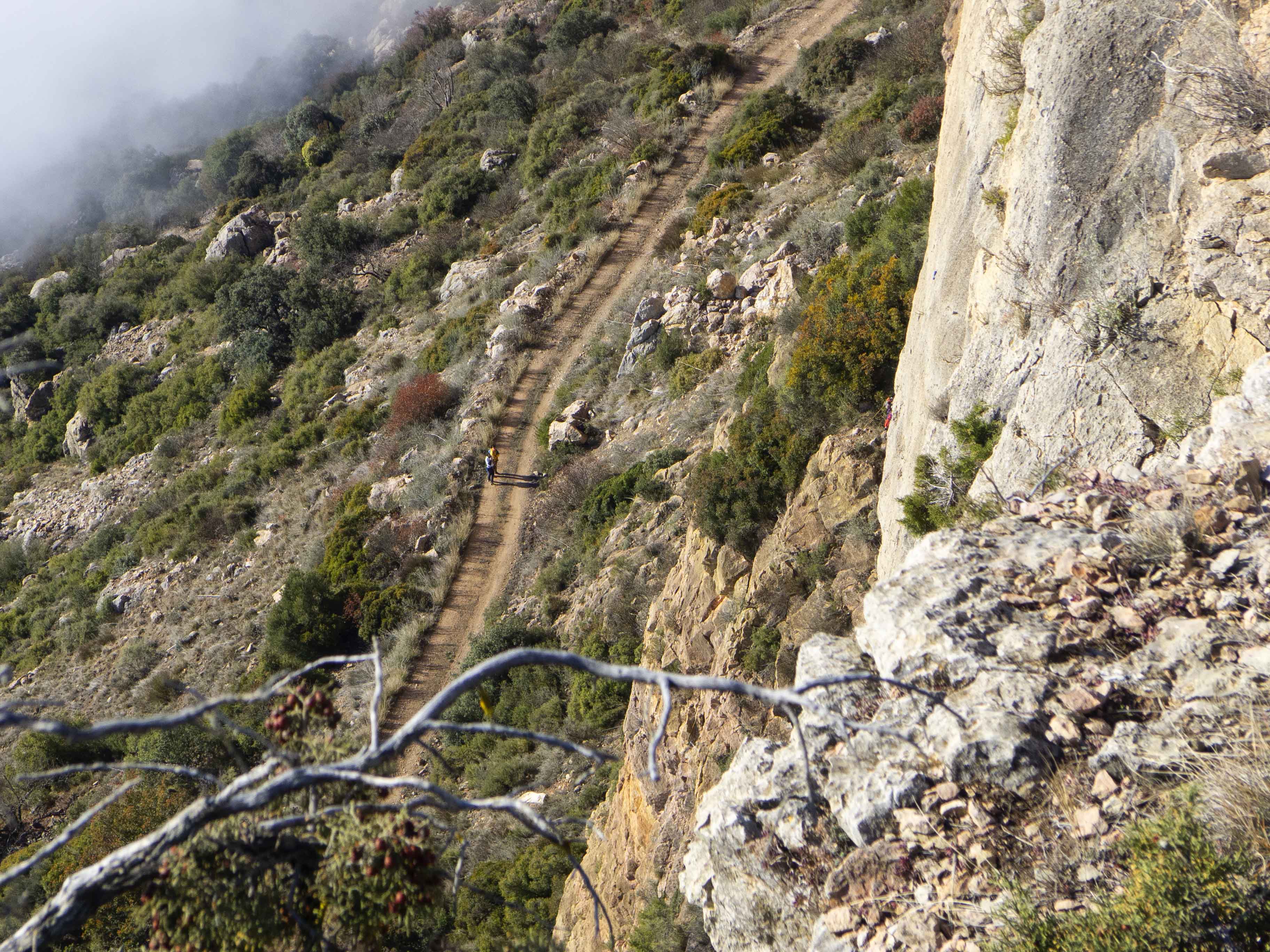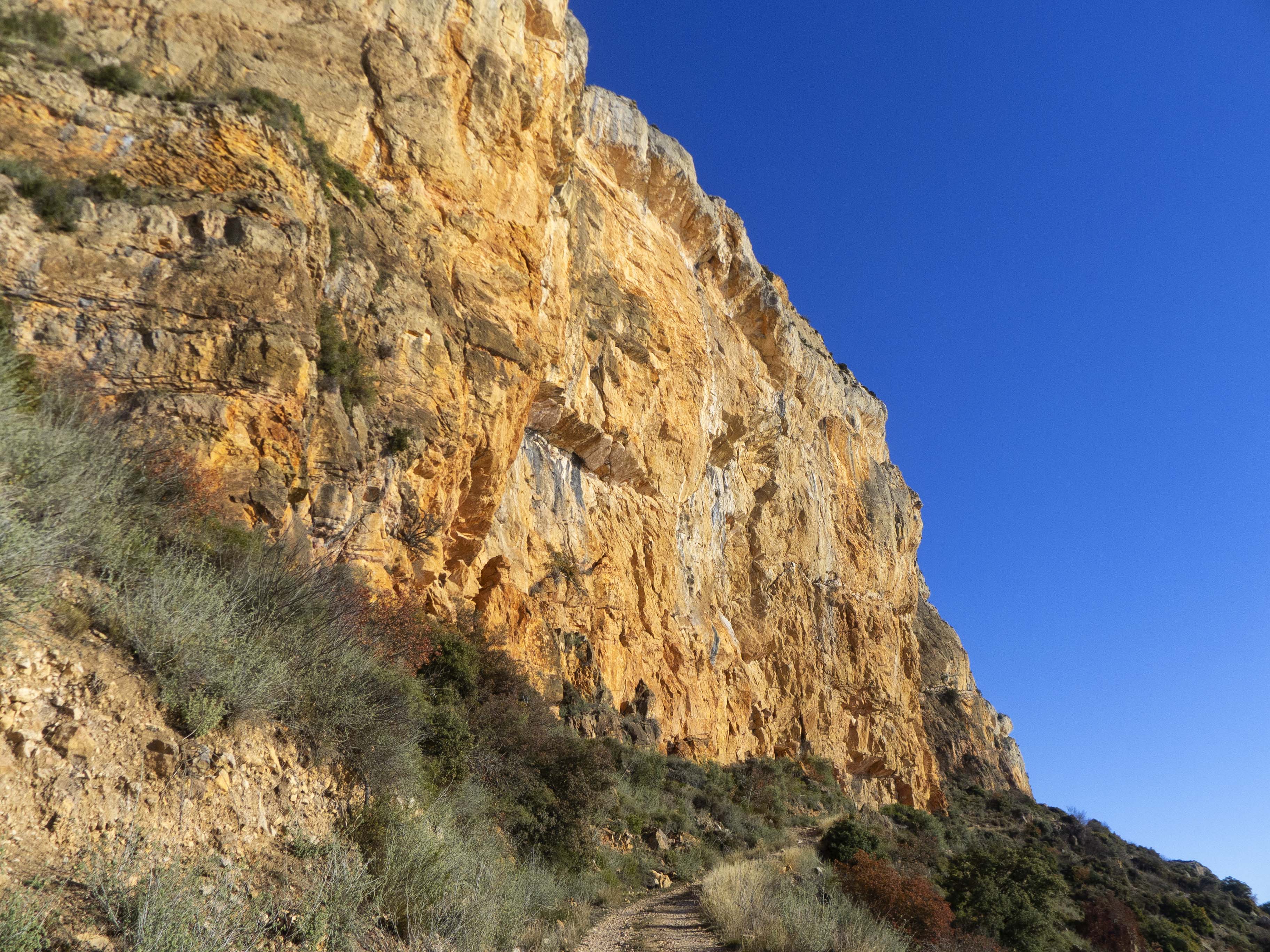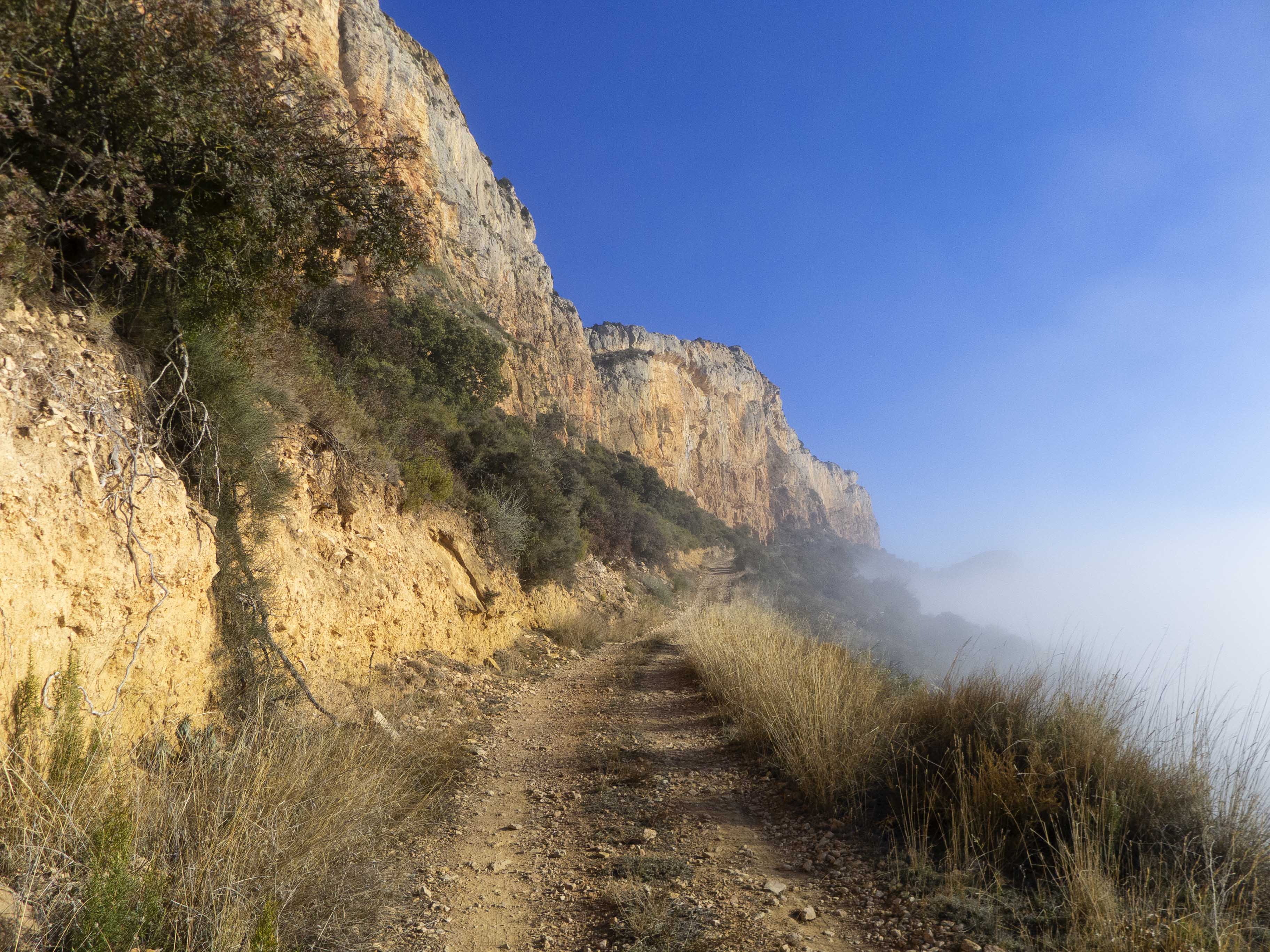El Camí de les Altures (así se llama a la pista por la que avanzamos y que culmina en el Extrem del Mont-Roig, en la otra punta de la sierra) es un itinerario espectacular, puesto que transita directamente bajo las paredes, incluso tocando las mismas en la Pala Alta, cuyo murallón vemos enfrente.