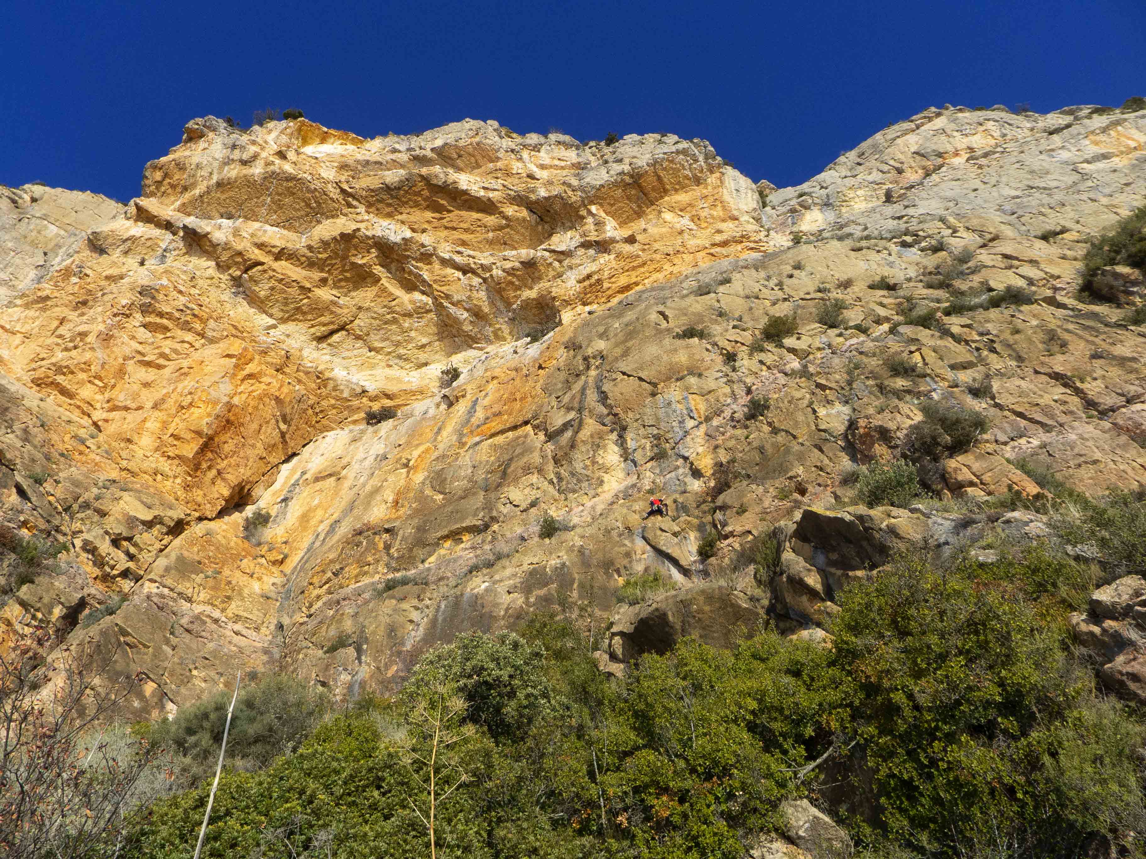 ...que cae a plomo más de 100 metros sobre el Camí de les Altures, por el que vemos transitar a algunos caminantes que observan a los escaladores que trepan por la pared.