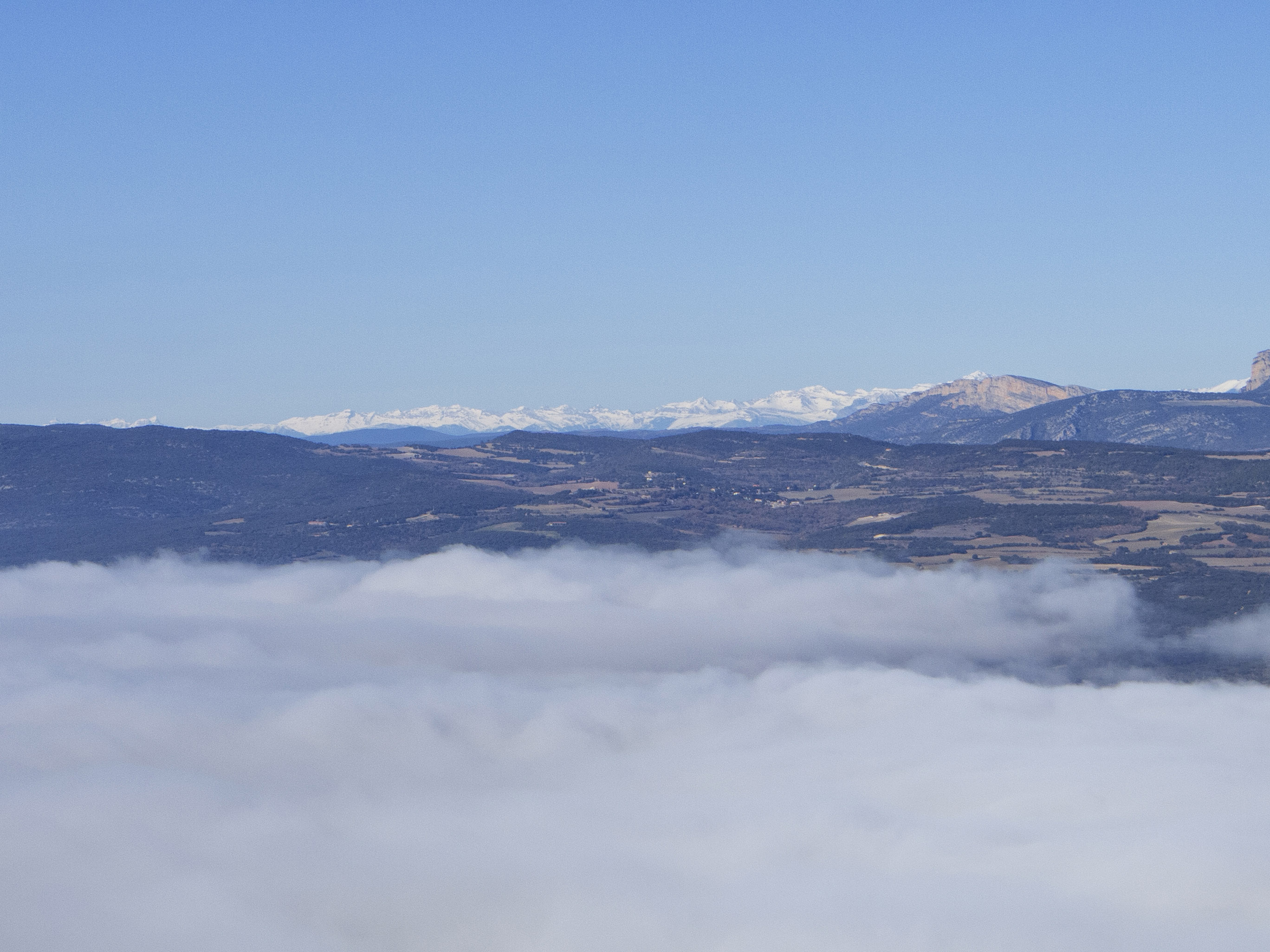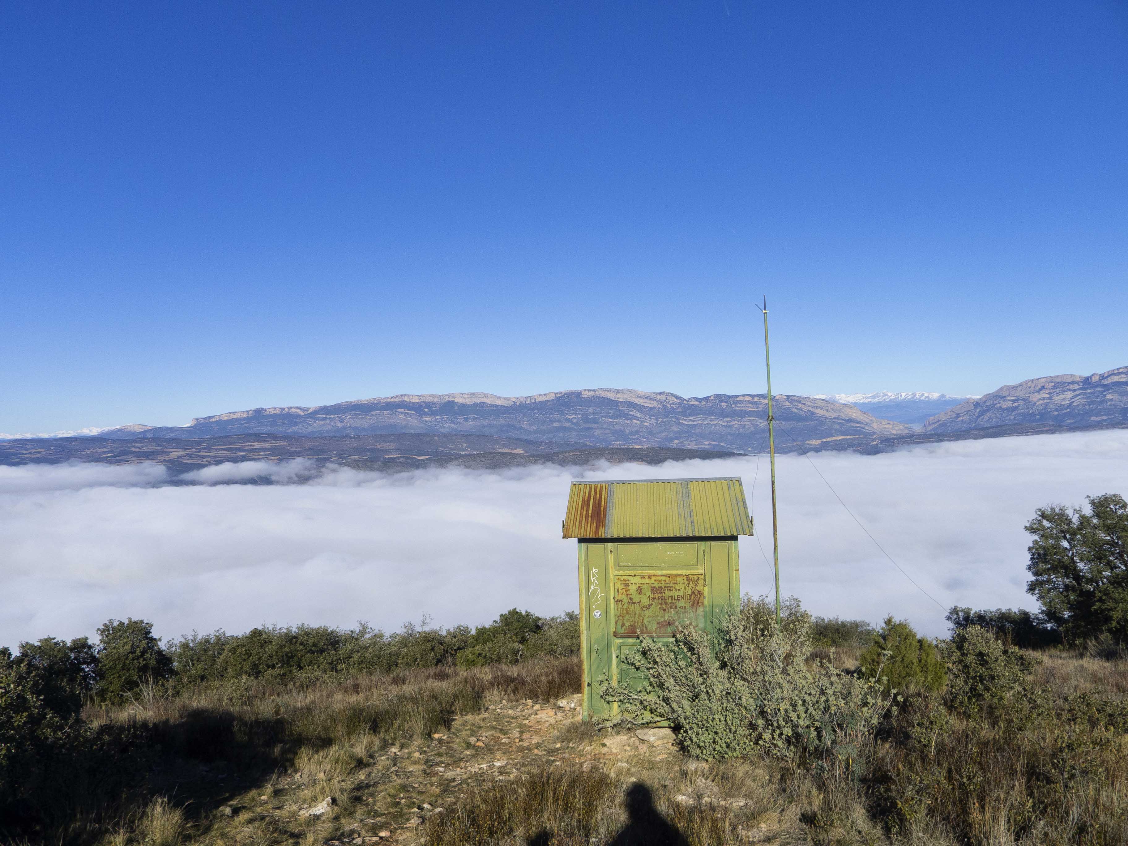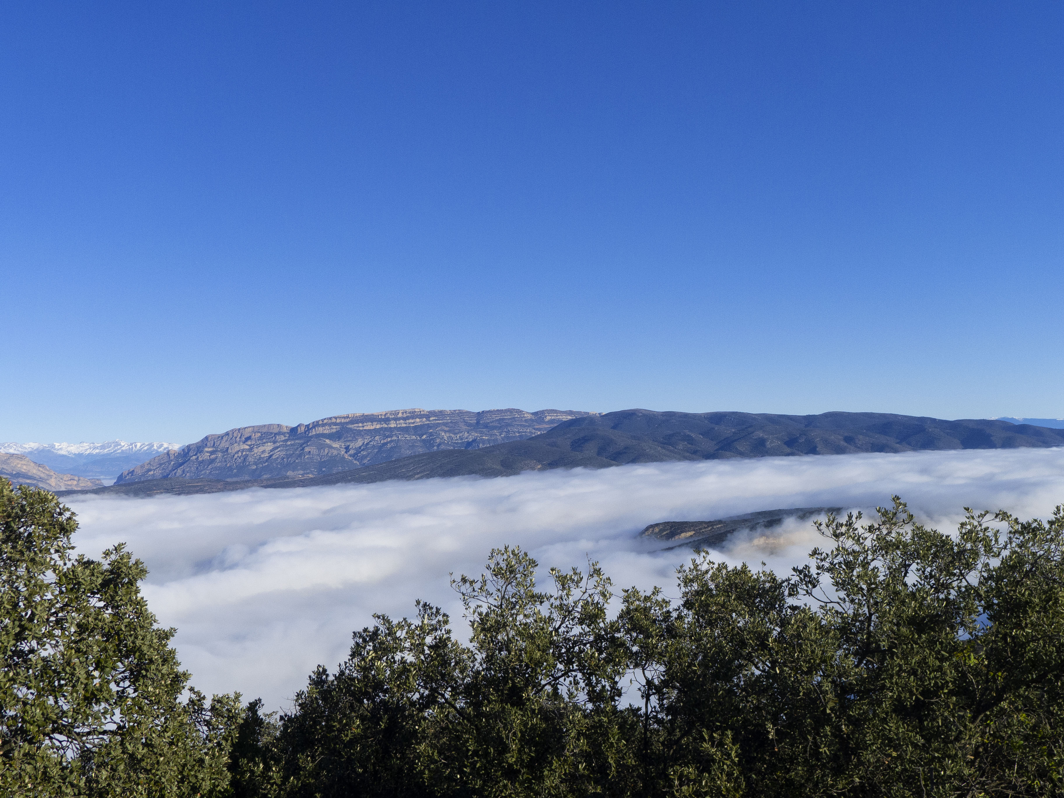 La niebla cubre todo el valle de la Noguera Pallaresa e incluso parte de la Conca de Tremp. El Montsec de Rúbies, el más alto de la sierra queda parcialmente tapado por el domo de Sant Mamet.