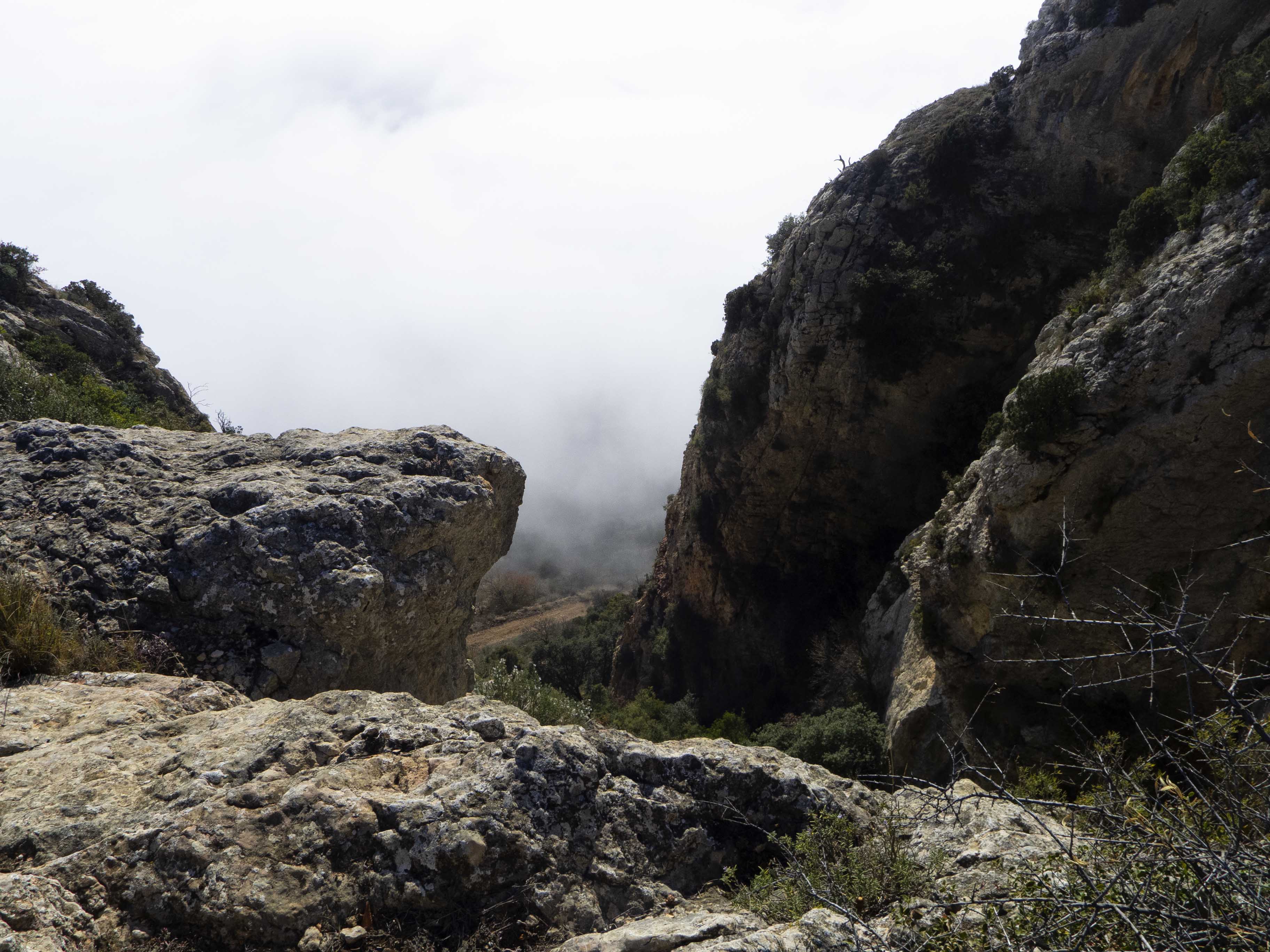 Desde la brecha, una vertical canal cae hasta el Camí de les Altures, con la niebla ganando cada vez más terreno.