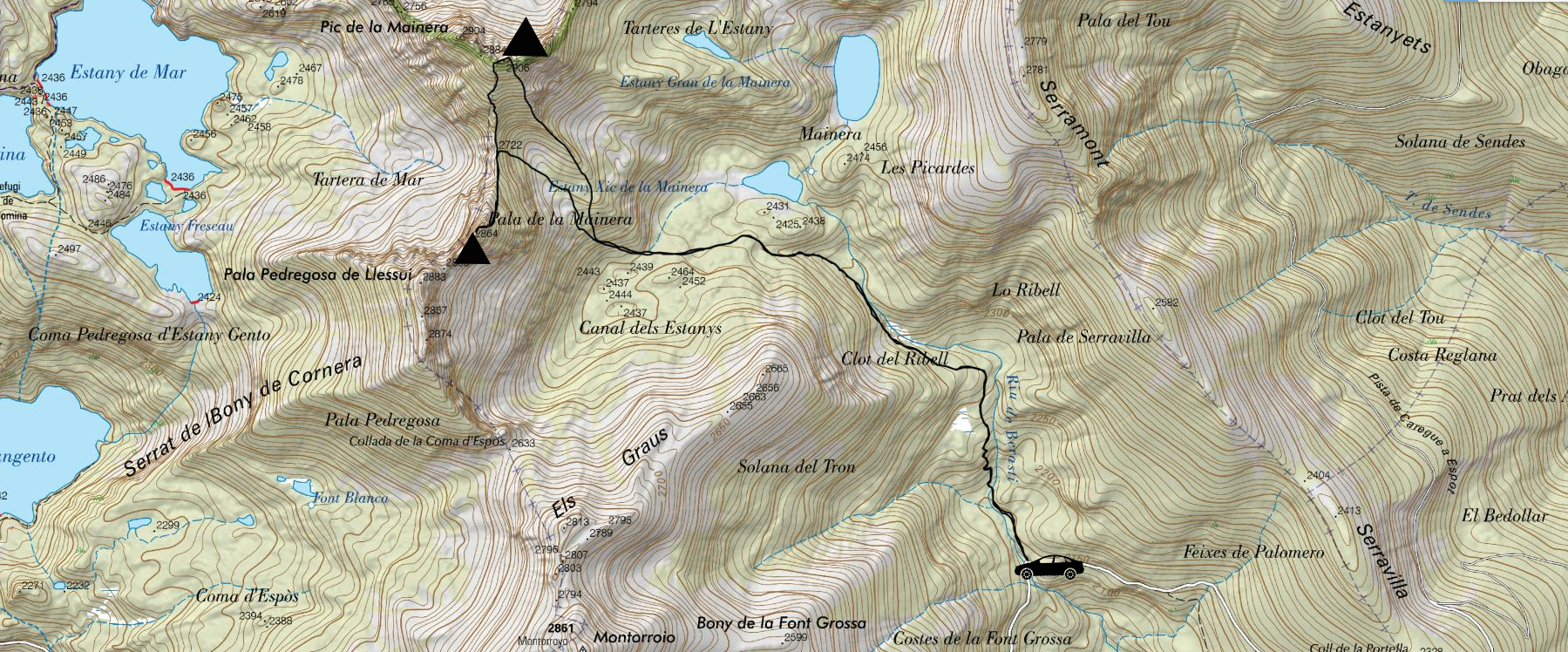 Aunque la montaña más conocida de la zona y probablemente la más ascendida (aunque tampoco en demasía) es el Montsent de Pallars (atalaya del Pallars Sobirà), esta montaña no es la más alta. Este honor le corresponde al Pic de la Mainera, uno de los pocos 2900s del parque nacional y una cumbre que se muestra realmente bonita por cualquiera de sus caras, pues se muestra altiva y afilada desde el oeste, con grandes paredes desde el norte y como una mole protegida por gendarmes en su parte alta desde el este y sur. Aunque la ruta normal de la Mainera se realice por Colomina y la Vall Fosca, nos propusimos llegar a su cumbre desde el poco conocido valle de Mainera, al este de la montaña, para conocer un poco mejor esta zona del Pallars y, ya de paso, aprovechar el poco desnivel para rematar la excursión con otro pico muy poco conocido pero imponente, el Pic del Clot de Mainera, hermano gemelo de la Pala Pedregosa de Llessui. No quedamos decepcionados en ninguno de los dos casos.