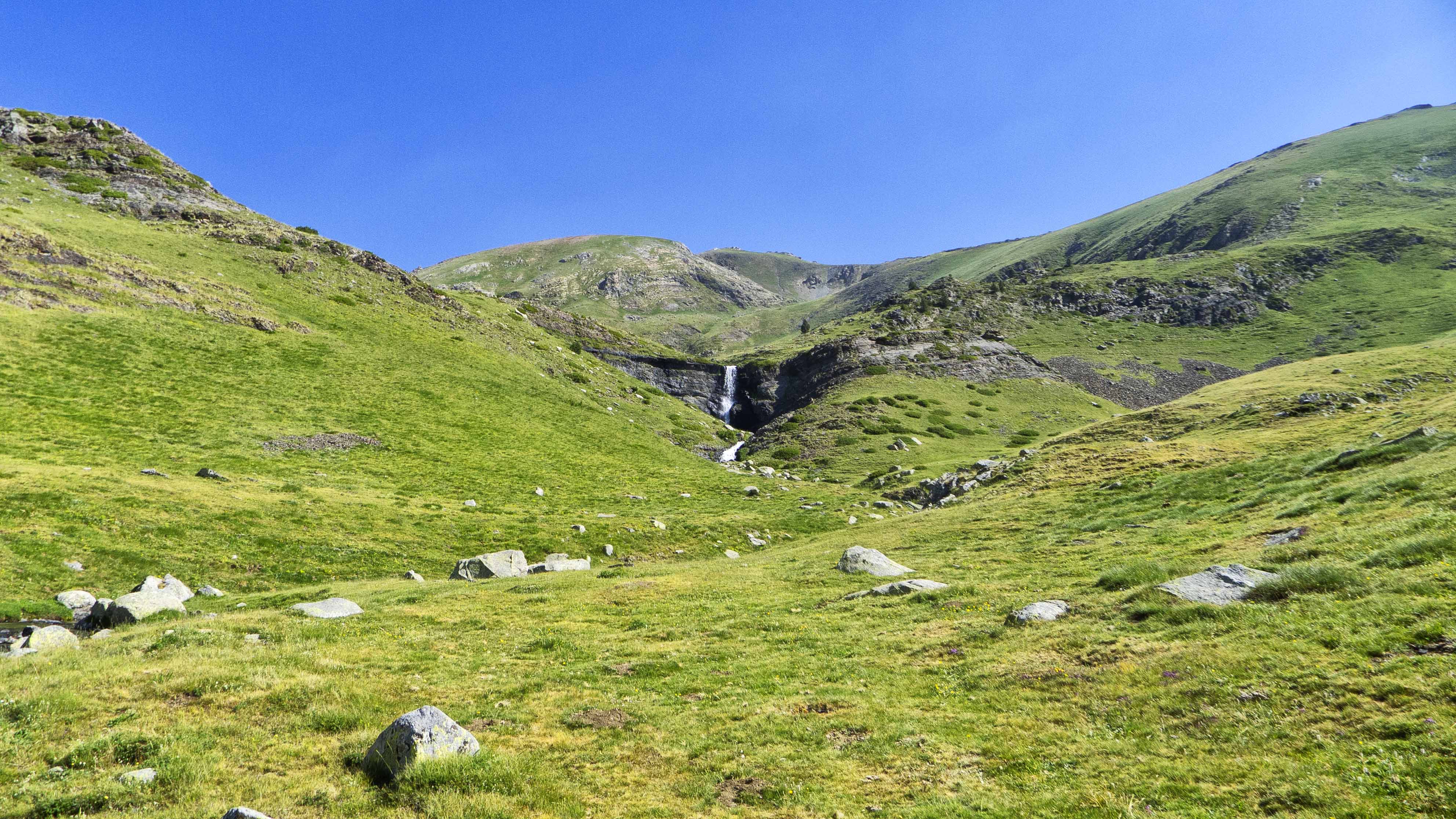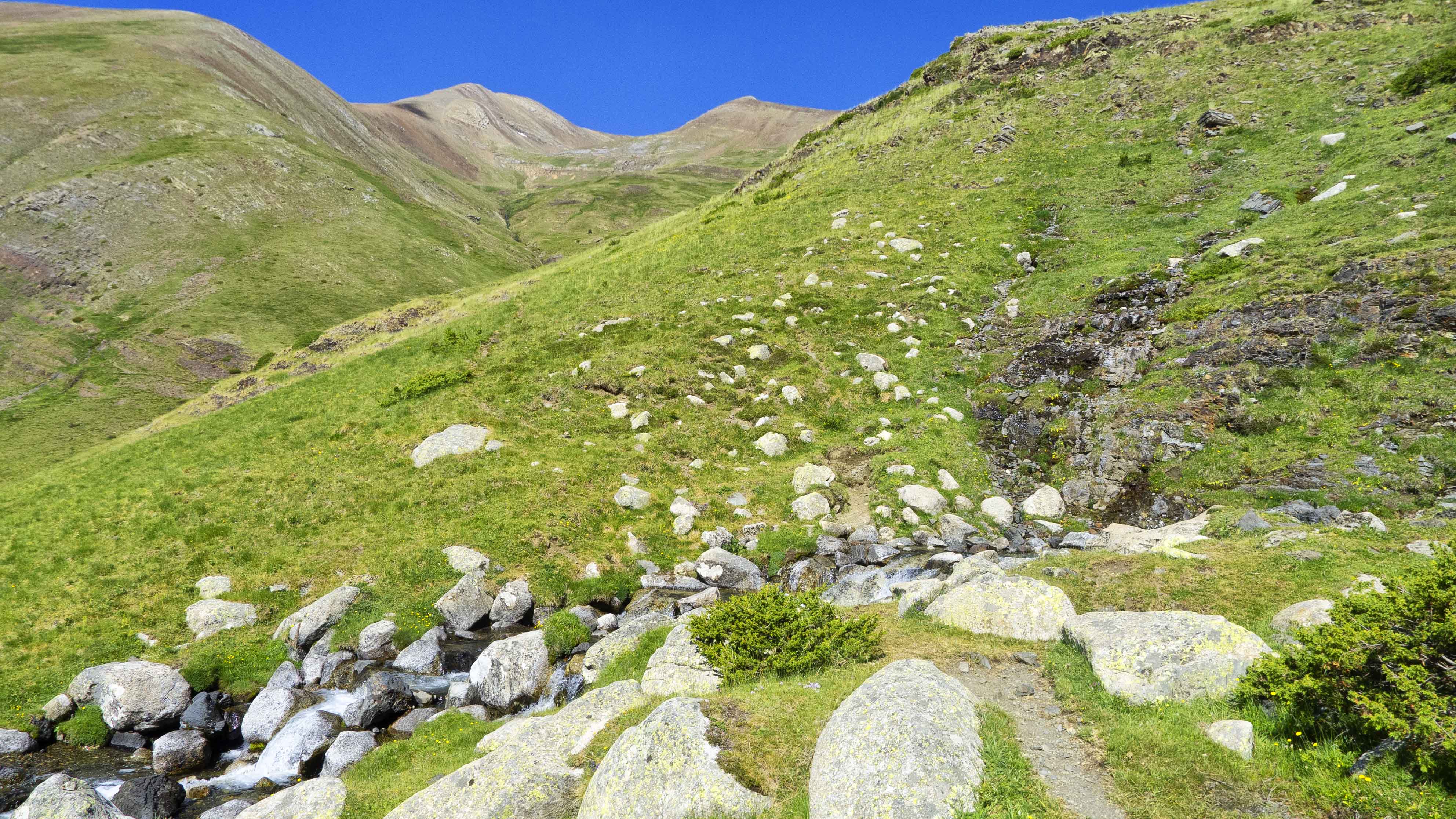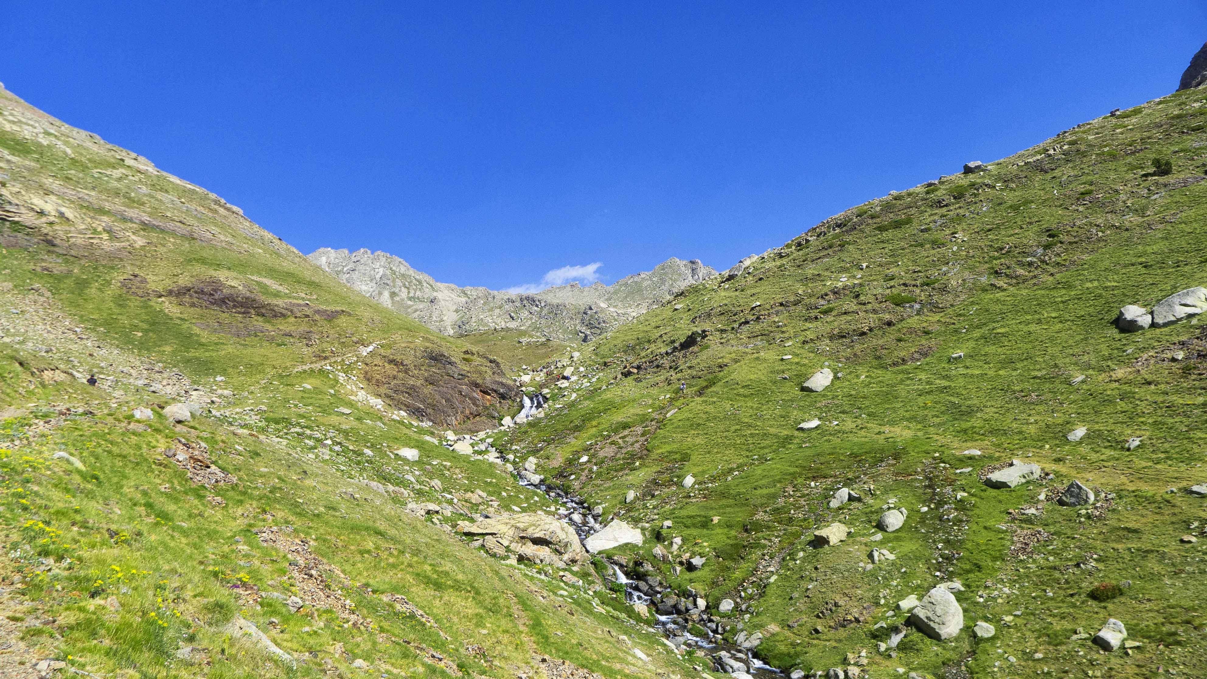 Cruzamos el río bastante cercanos a la cascada y trazamos una diagonal para situarnos en su parte alta, desde donde se abre un nuevo prado mientras el valle gira a la izquierda para entrar en els Clots de l’Orri Vell, un remanso del río donde se hallan diversas estructuras pastoriles típicas de esta zona del Pirineo conocidas como orris.