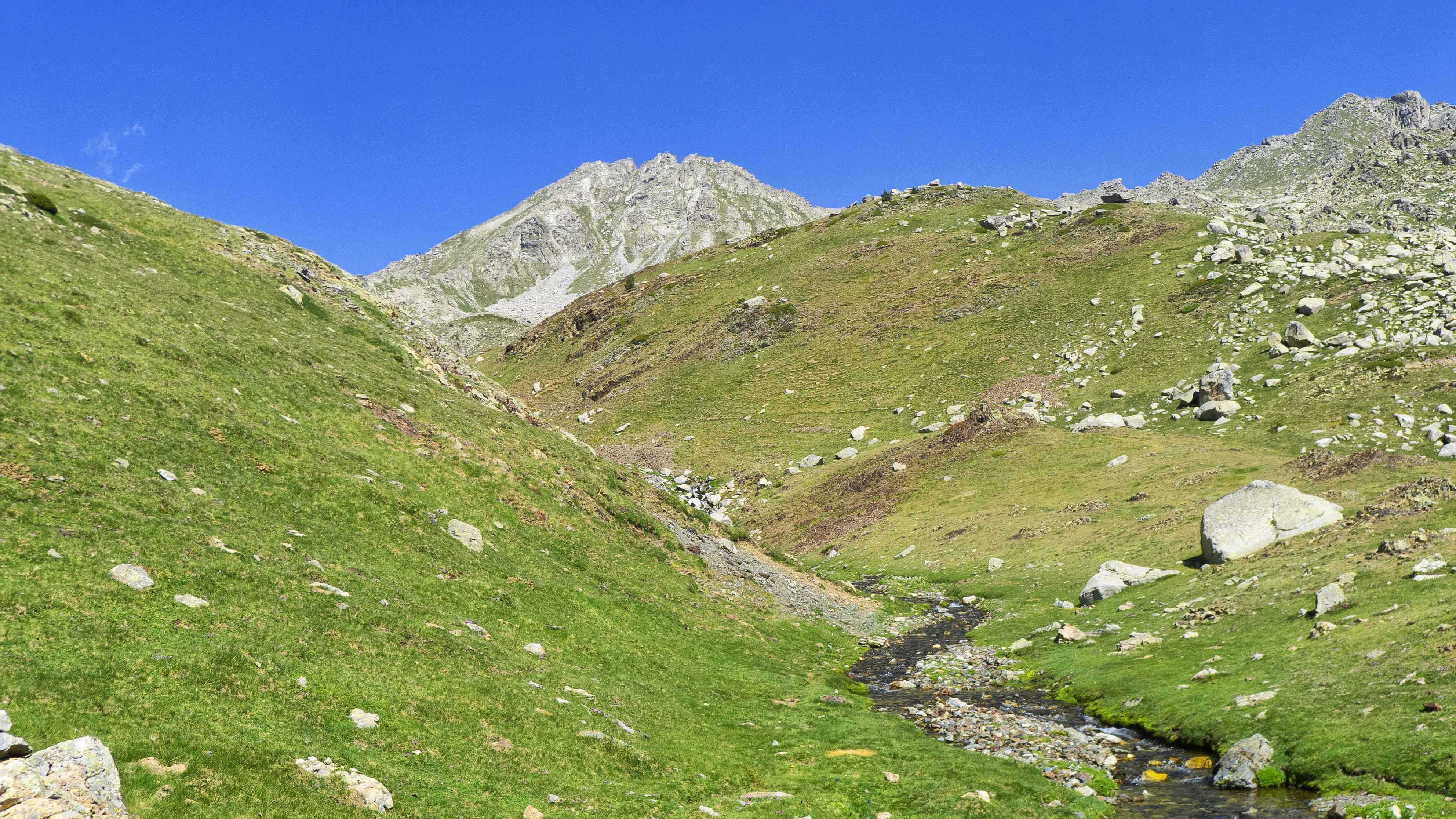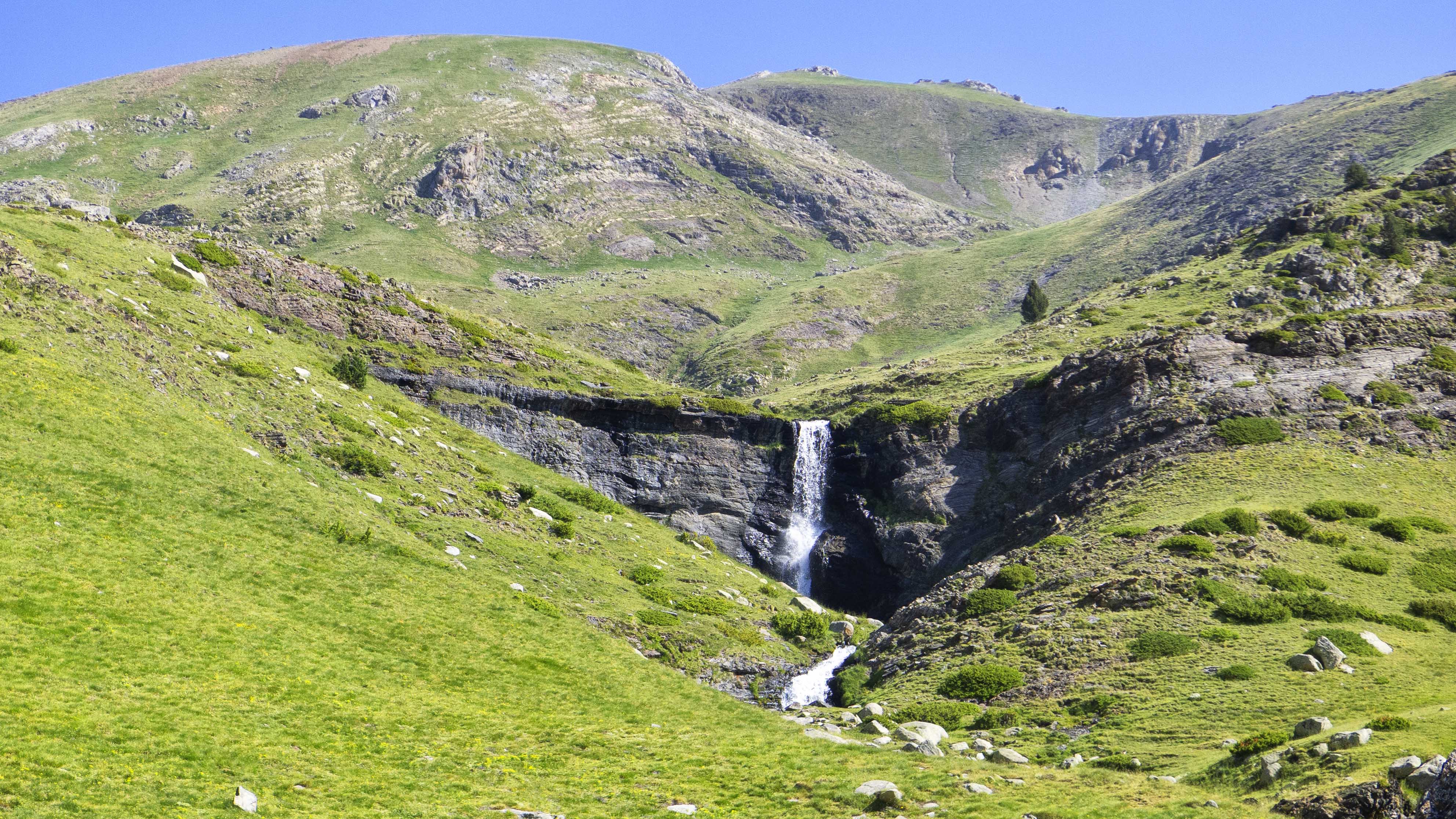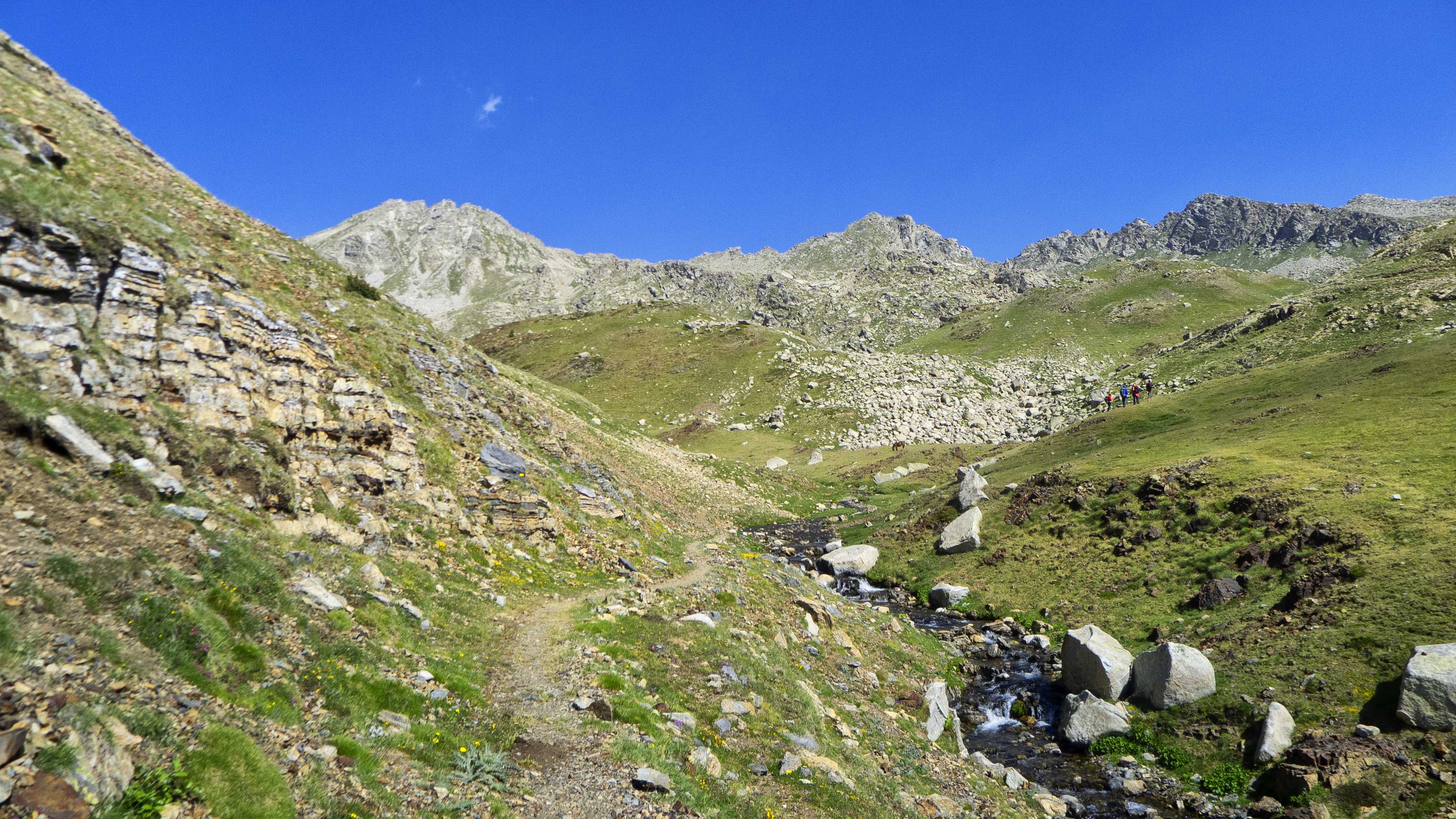 Cruzamos el río bastante cercanos a la cascada y trazamos una diagonal para situarnos en su parte alta, desde donde se abre un nuevo prado mientras el valle gira a la izquierda para entrar en els Clots de l’Orri Vell, un remanso del río donde se hallan diversas estructuras pastoriles típicas de esta zona del Pirineo conocidas como orris.