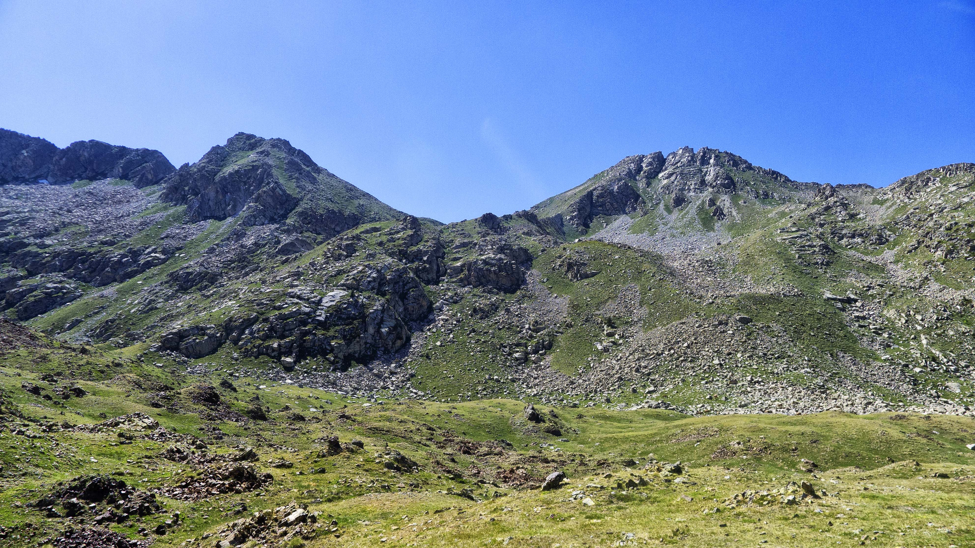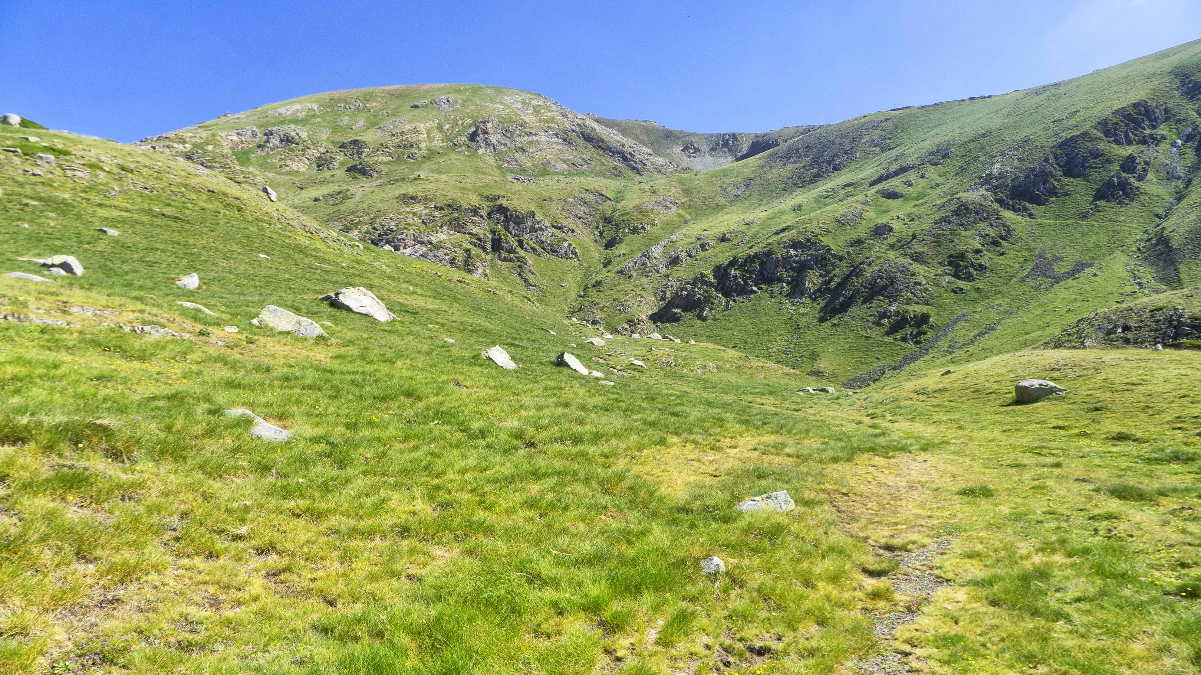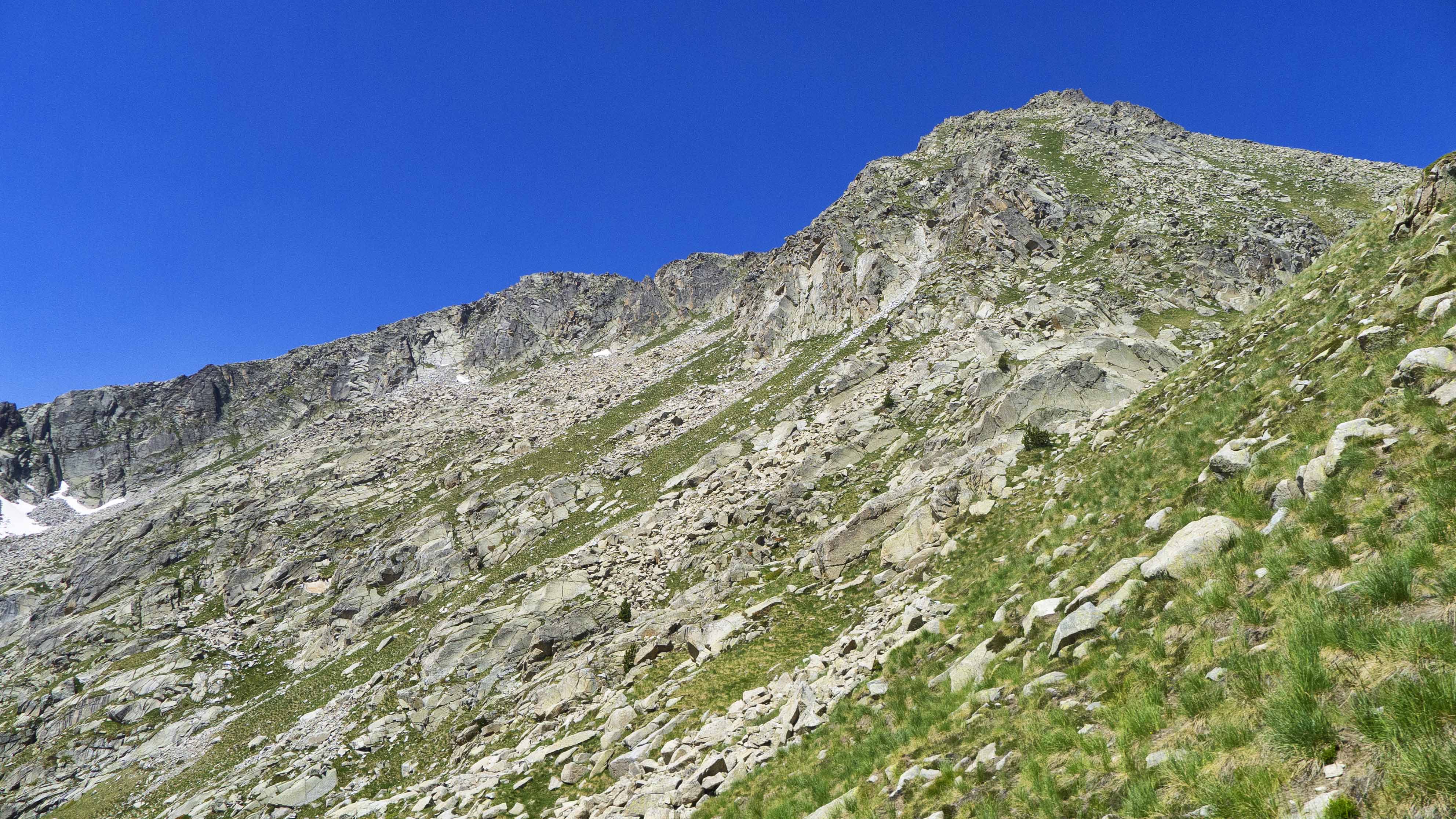 Mientras subimos por la loma observamos las paredes de la Pala Pedregosa de Llessui y, a la derecha, el altivo Pic del Clot de Mainera, nuestra segunda cumbre de hoy.