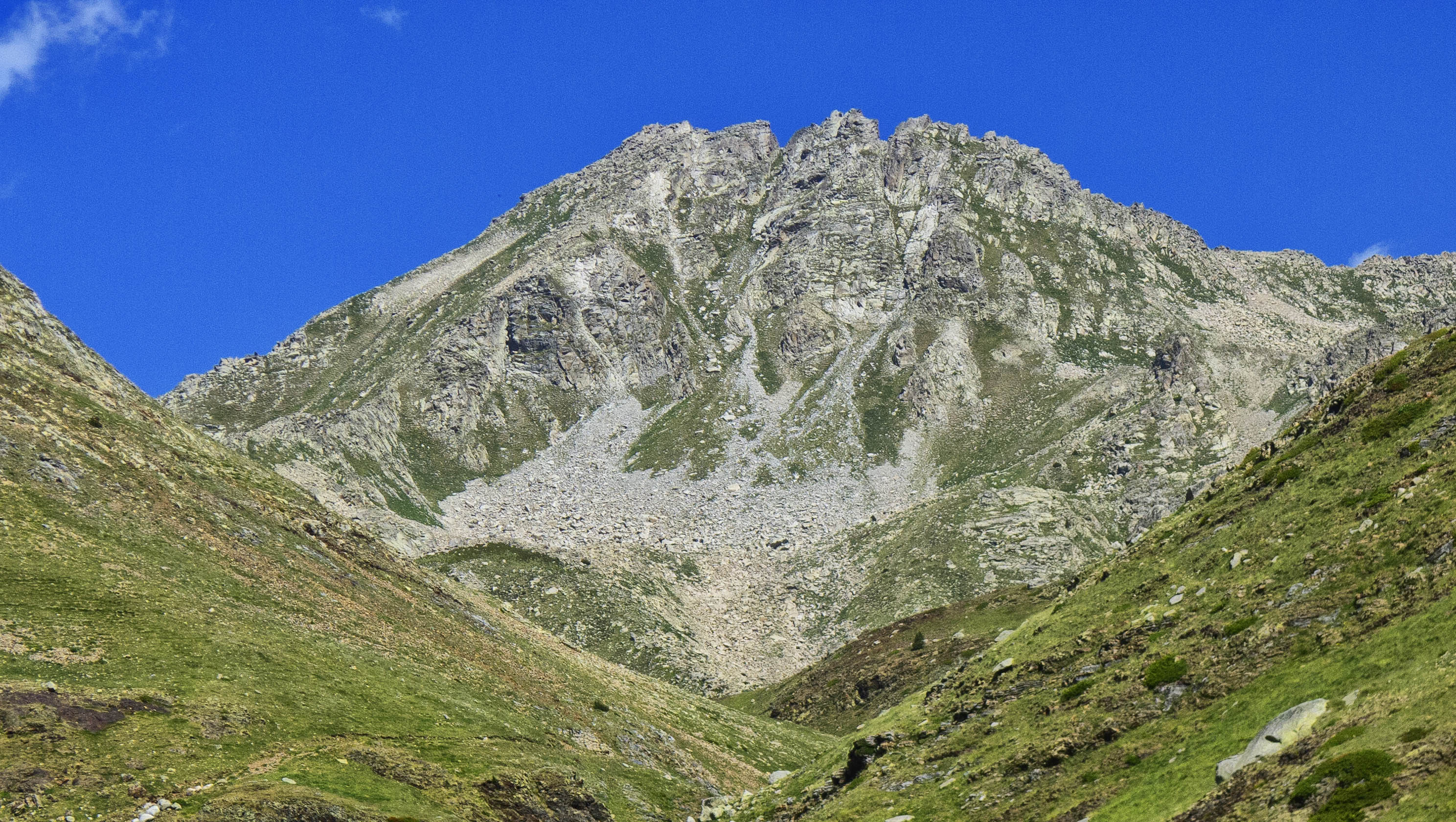 Desde aquí se nos muestra por primera vez una montaña descarnada y pedregosa coronada por una afilada y turbulenta cresta: el Pic de la Mainera.