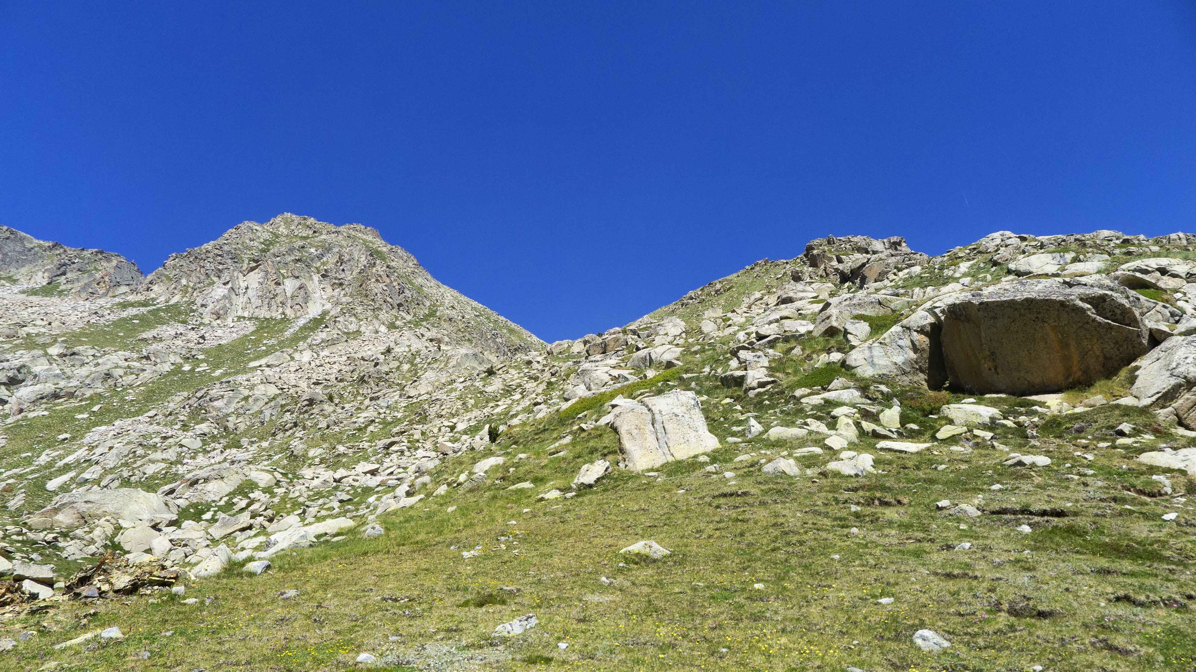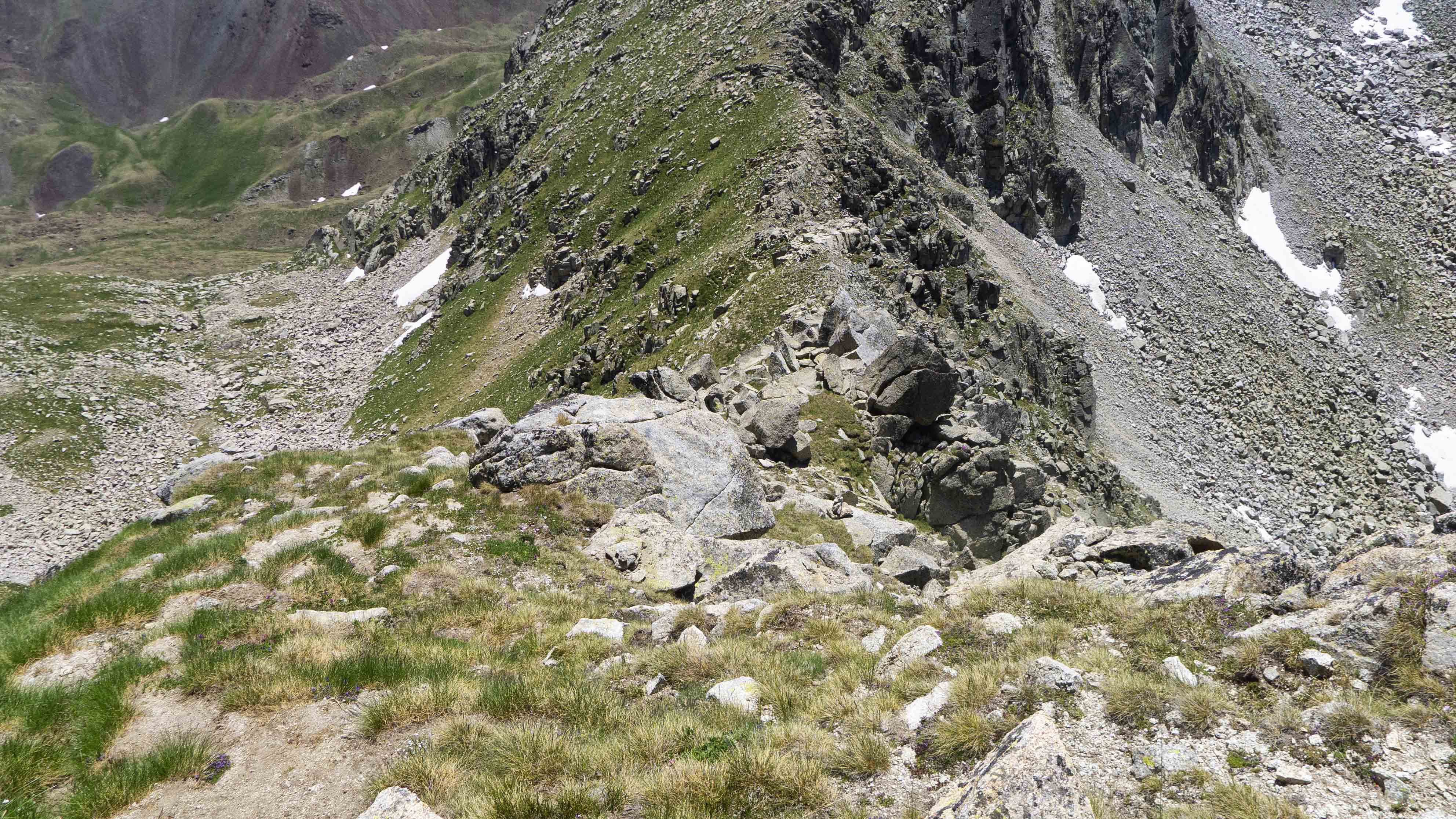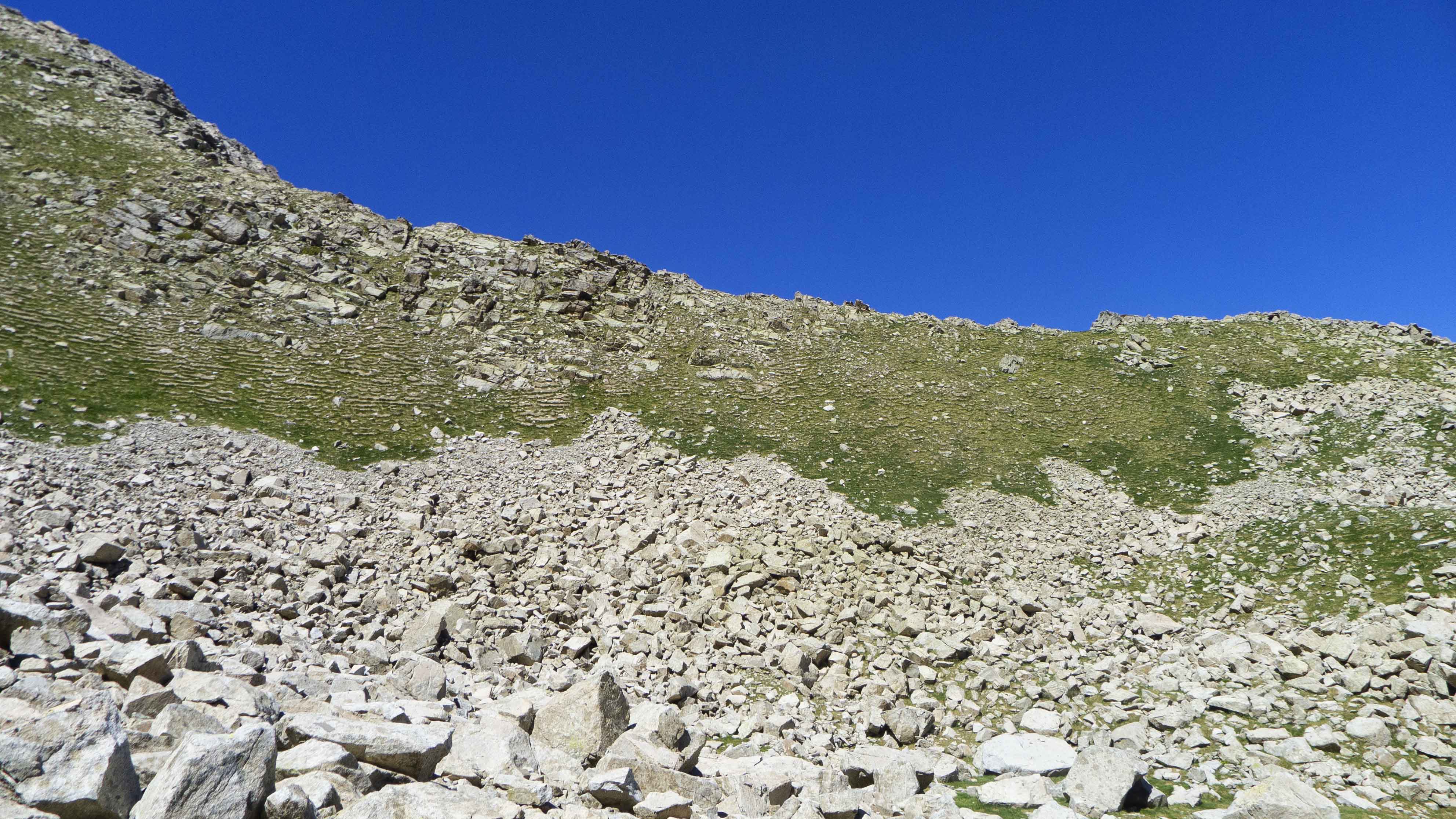 Vemos lo que parece que son dos collados herbosos al otro lado de la pala, uno a superior altura y muy próximo a la antecima y otro unos metros por debajo. Subimos por la empinada ladera en dirección de la depresión herbosa de la izquierda, que se aprecia en la foto.