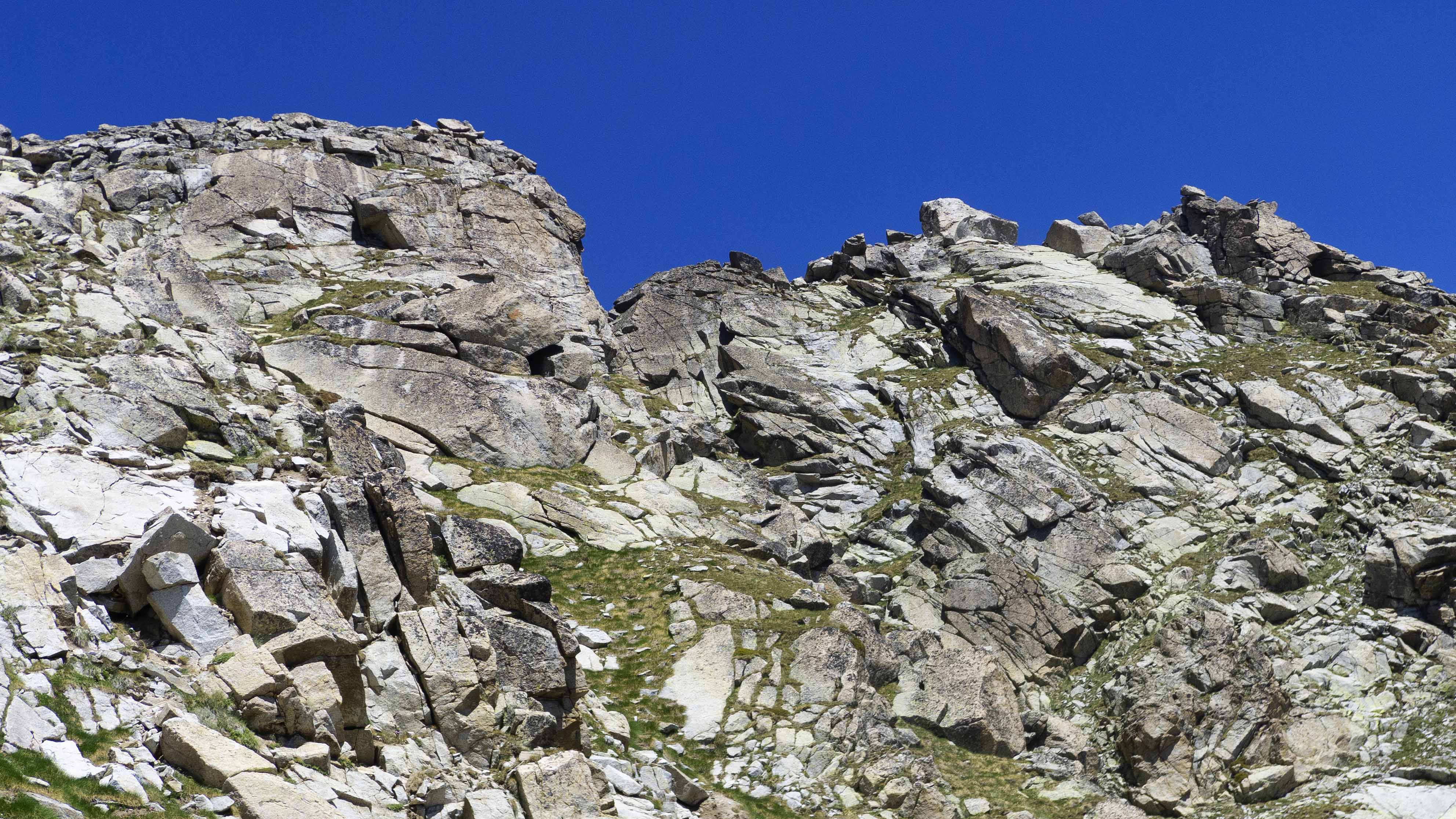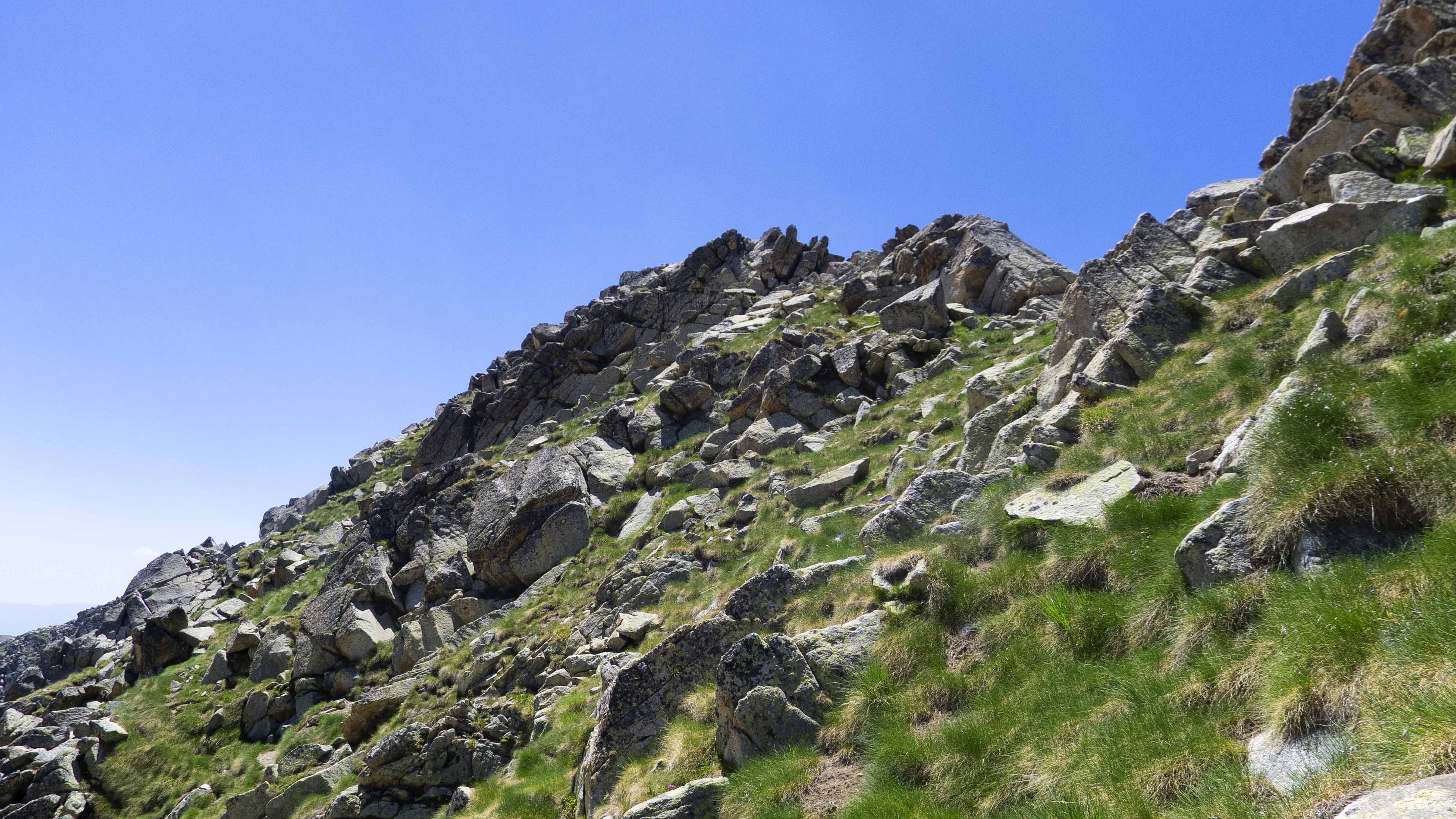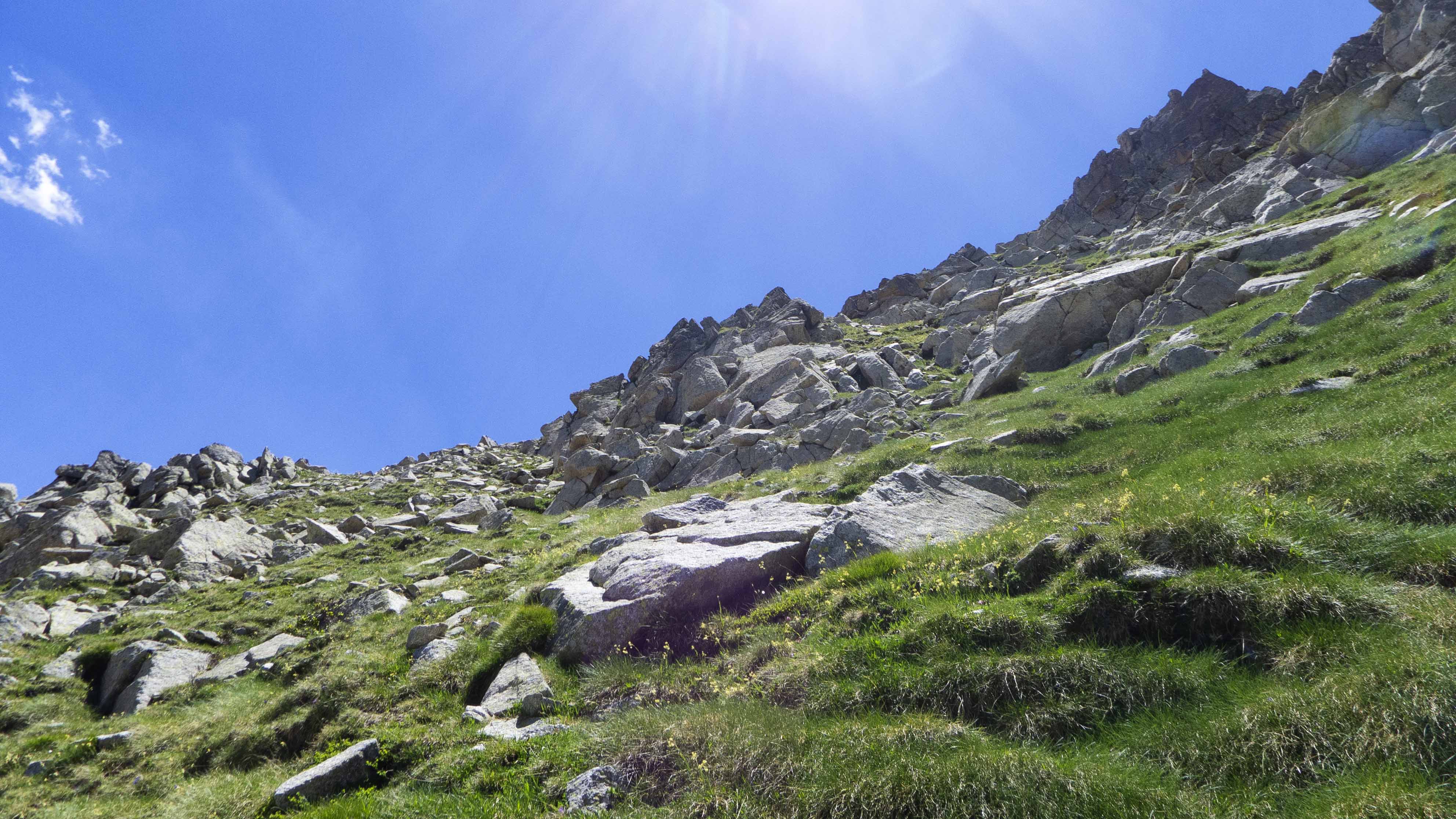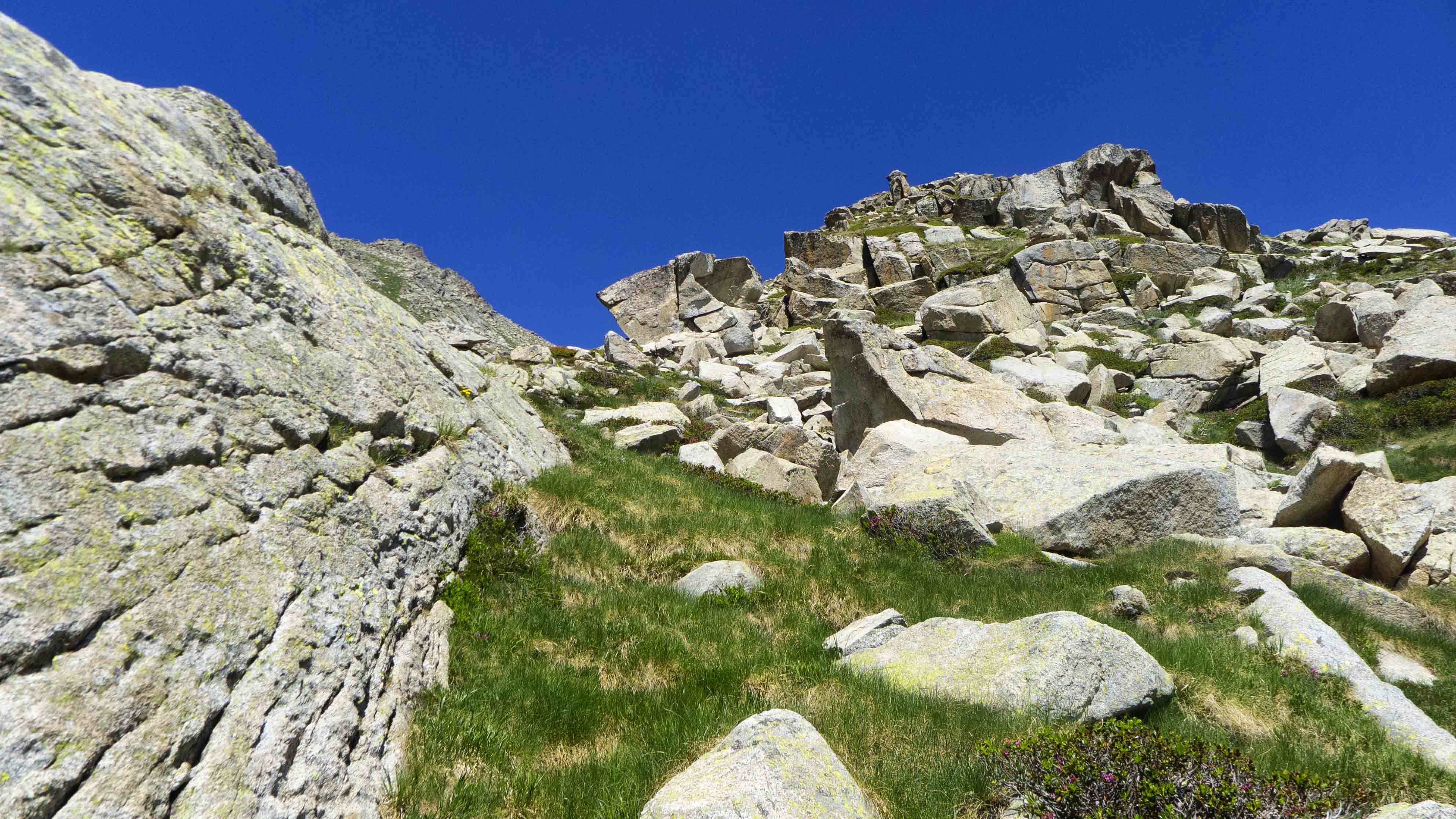 Una vez llegados ahí, ya podemos ver la cumbre real del Clot de la Mainera, protegida por unos afilados roquedos. Sin embargo, desde una brecha que tiene a su derecha parece que se puede progresar más fácilmente y hacia allí nos dirigimos subiendo por una fácil canal herbosa.