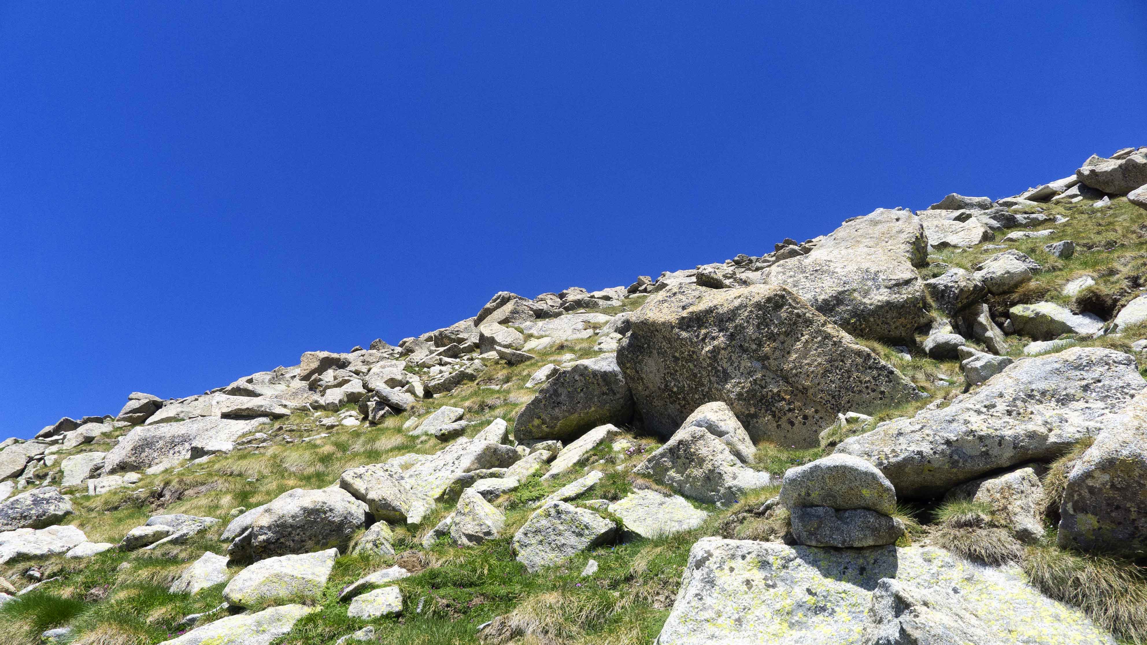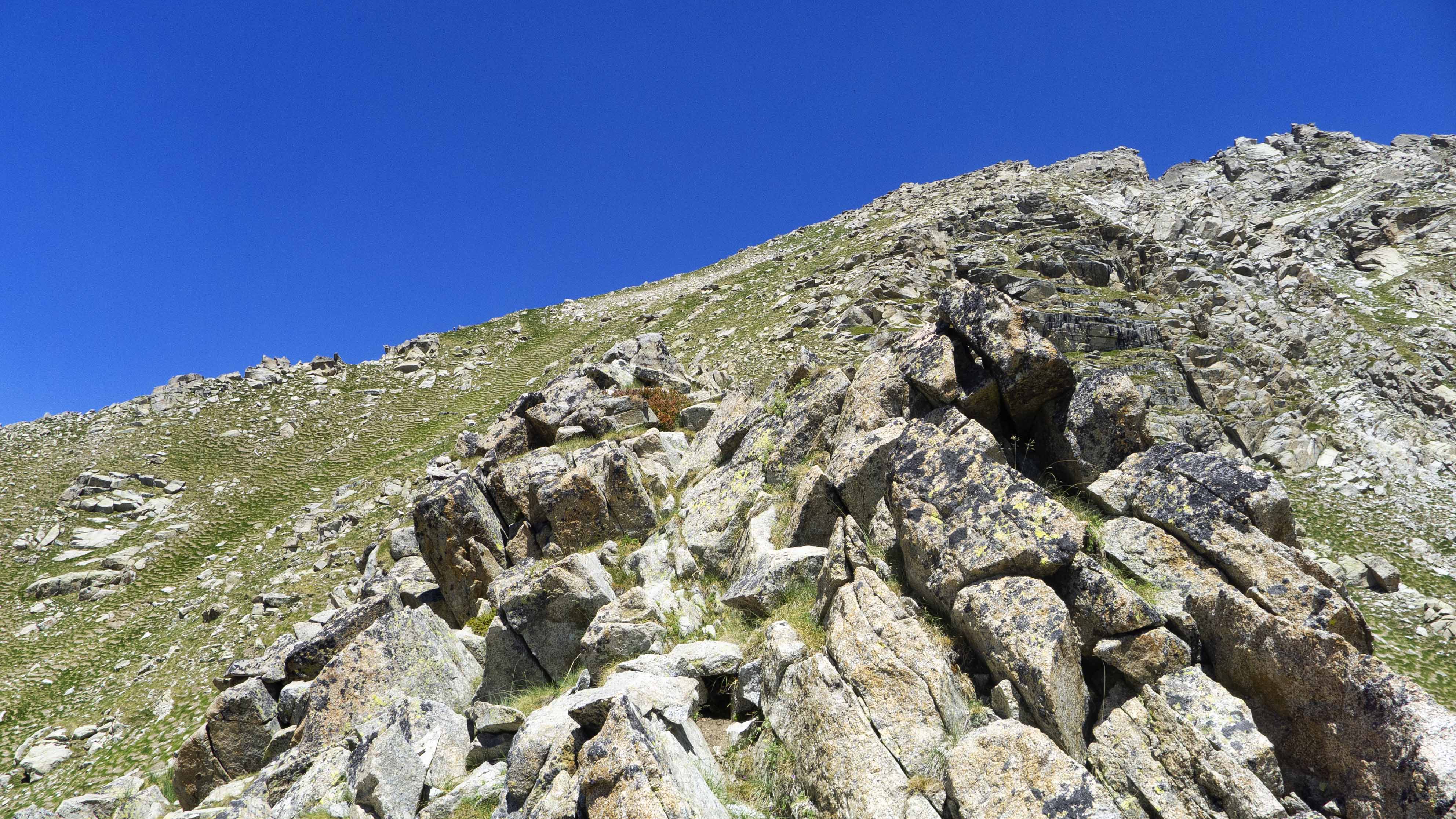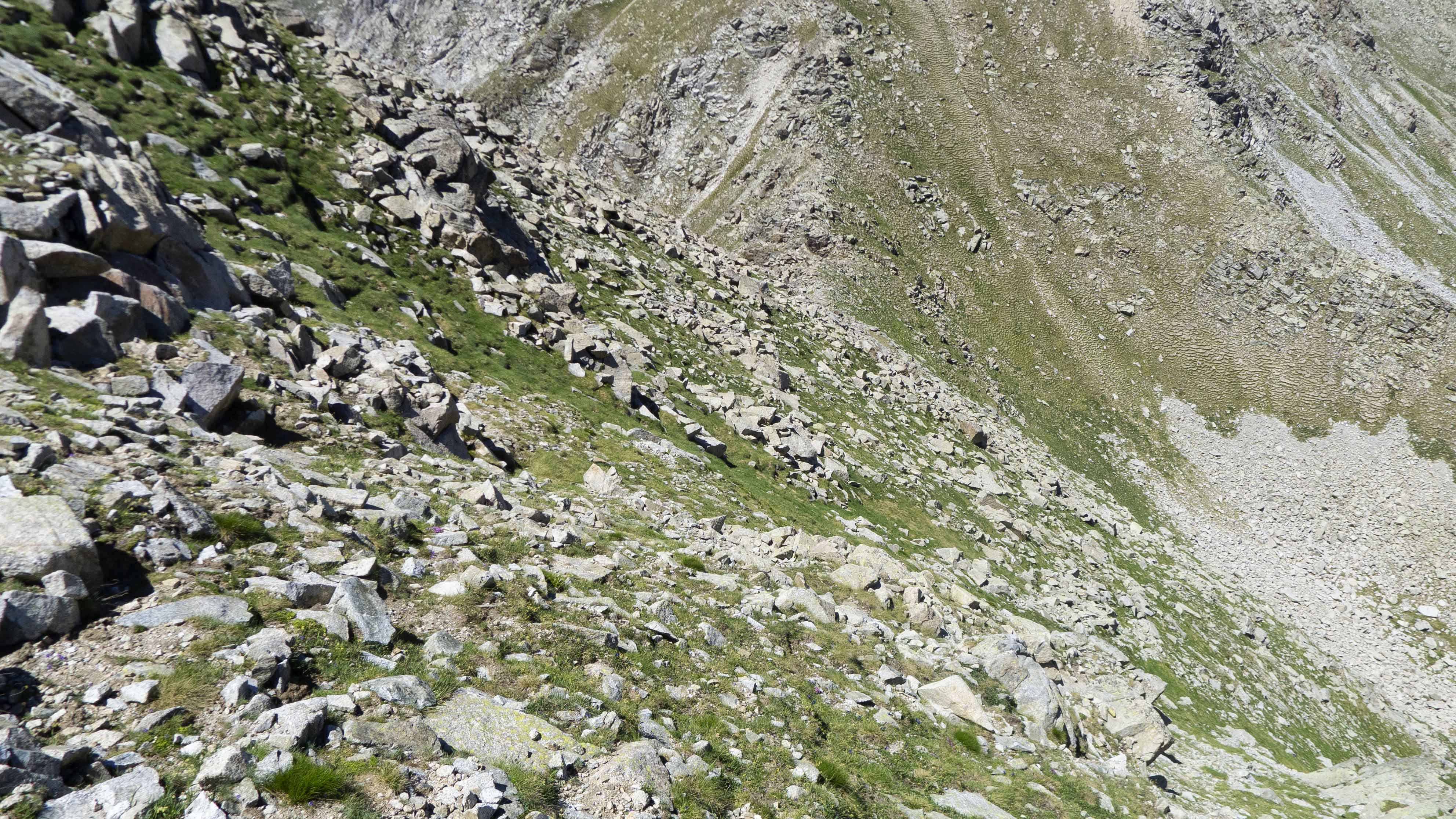 Después de descansar un rato, descendemos directamente hacia el Coll de Mainera bajando rectos por la pala y siguiendo hitos que nos conducen por el mejor camino que, aunque sigue siendo muy vertical, al menos no es tan inestable. Después de esquivar una serie de grandes rocas tanto por la vertiente de Mainera como por la vertiente de Mar, llegamos al Collado de Mainera.