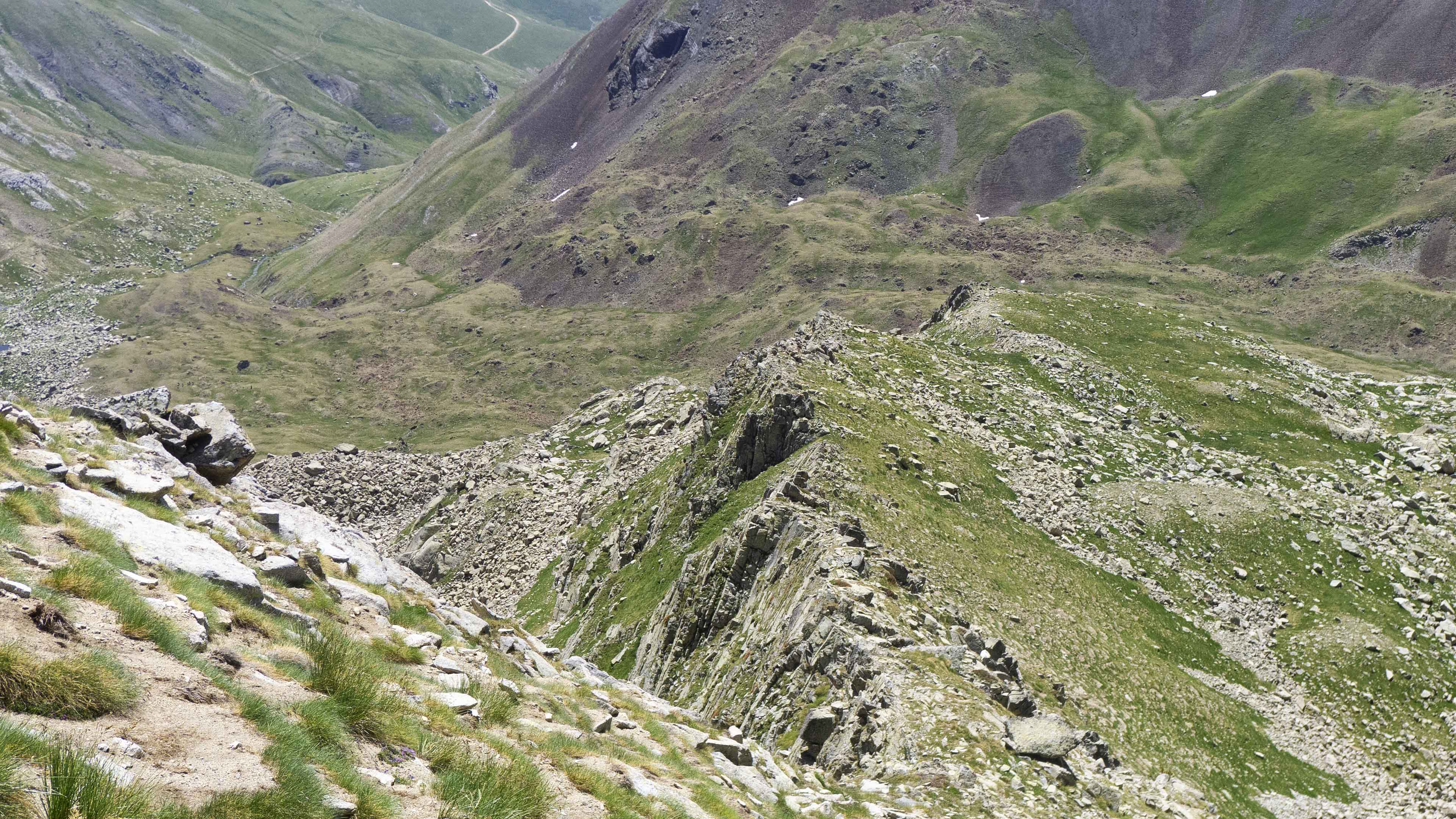 Mientras surcamos la pedrera que ocupa el fondo del vallecito colgado, observamos recortada contra el cielo la fácil arista que hemos utilizado para ascender al Pic de la Mainera. Al llegar al final de la vaguada, empezamos a bajar por el centro del barranco.