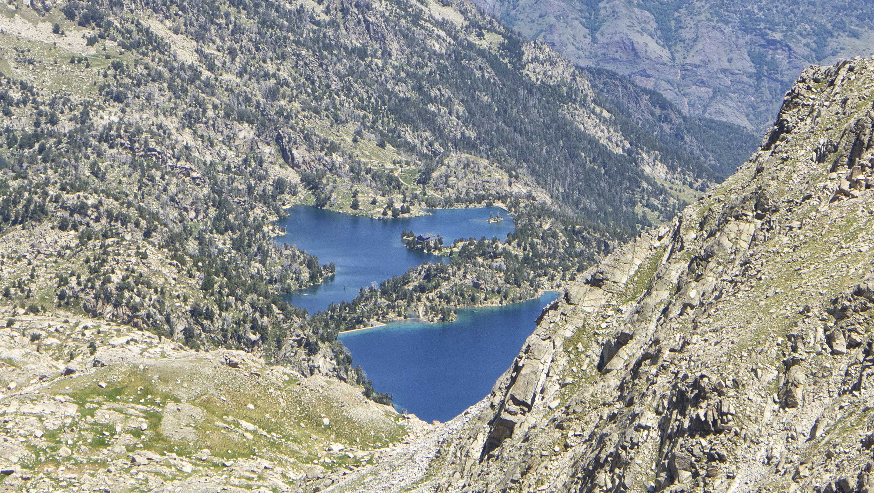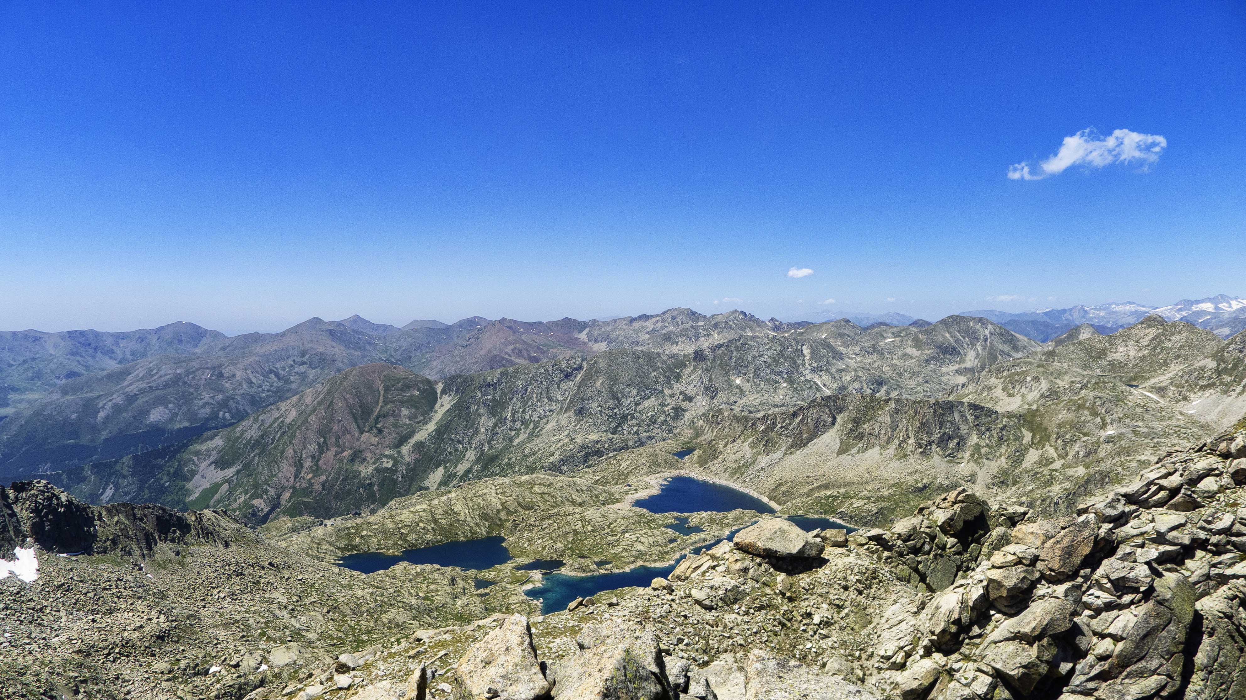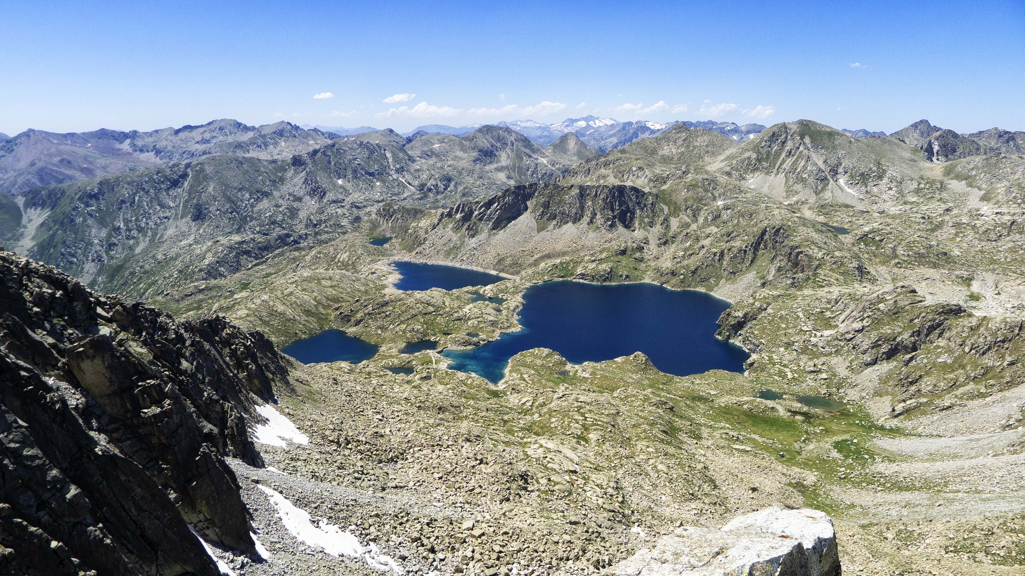Hacia el sur, apenas una parte de la infinidad de lagos de la Vall Fosca: el Estany Frescau, el Estany de Colomina y el Estany de Mar.