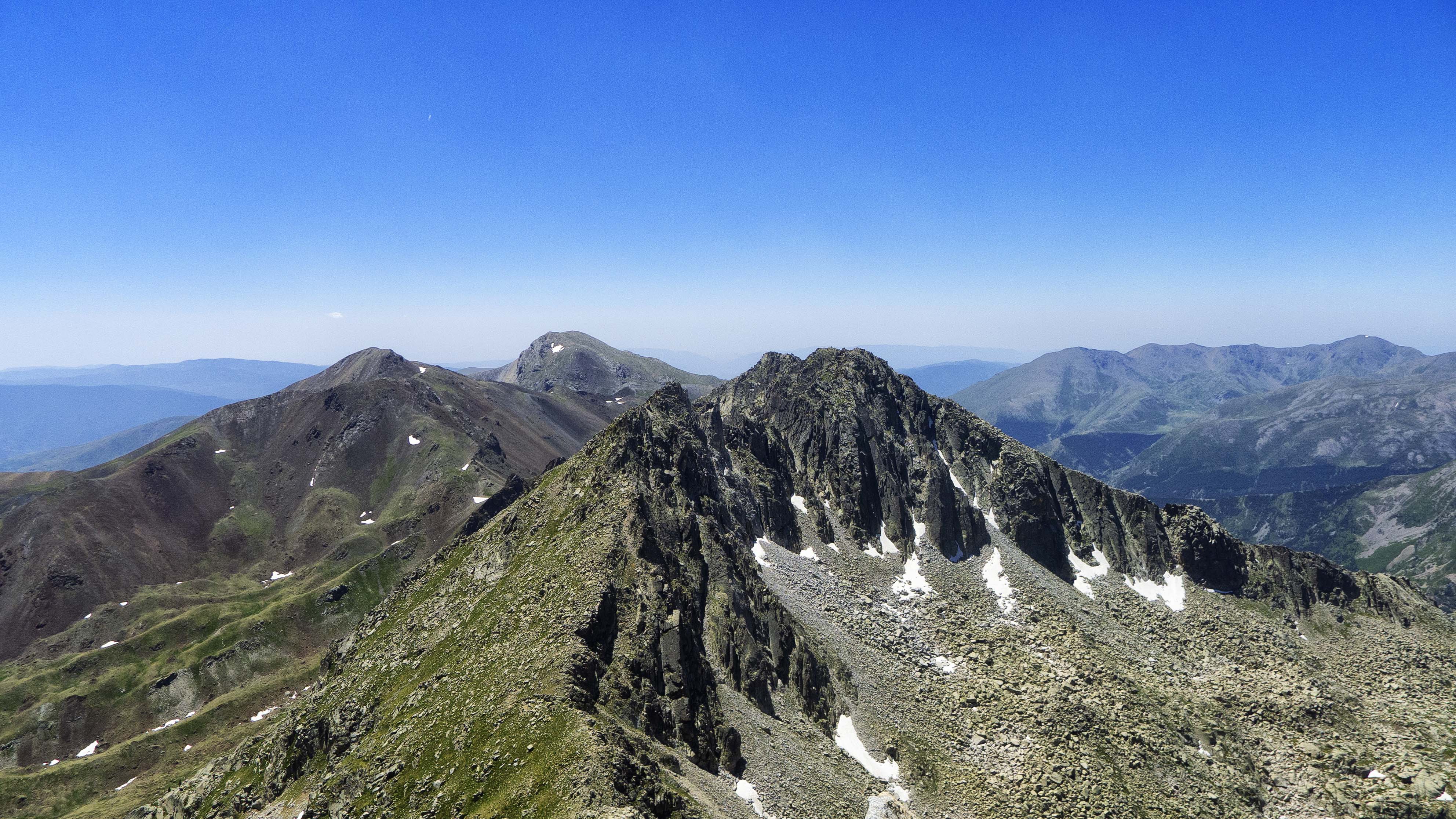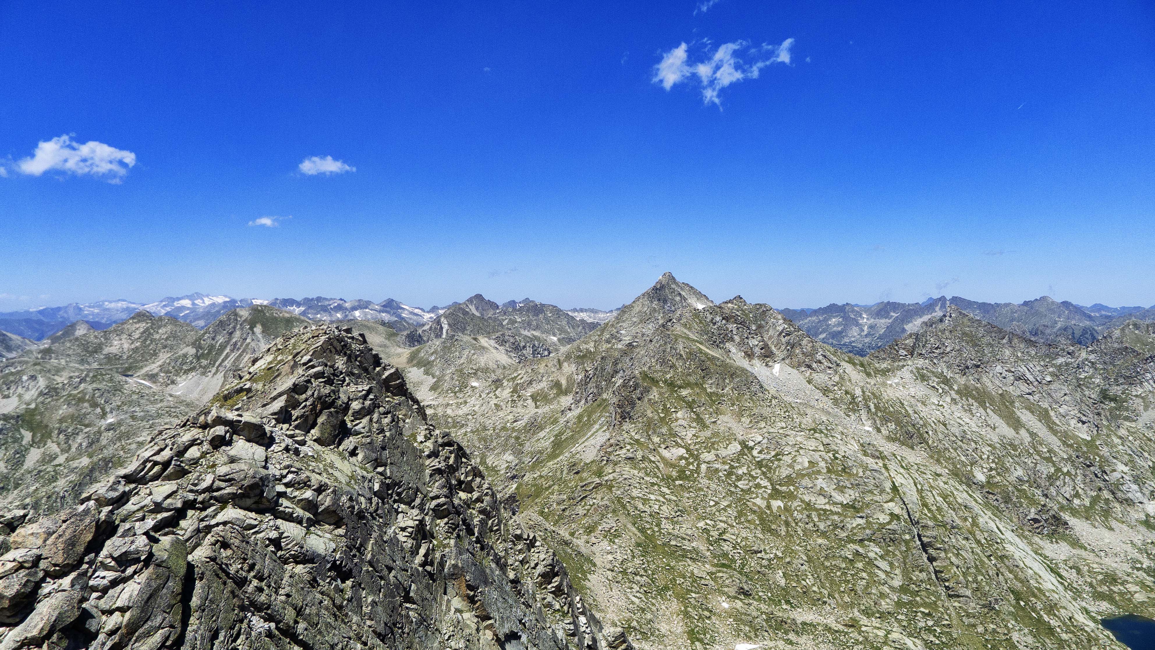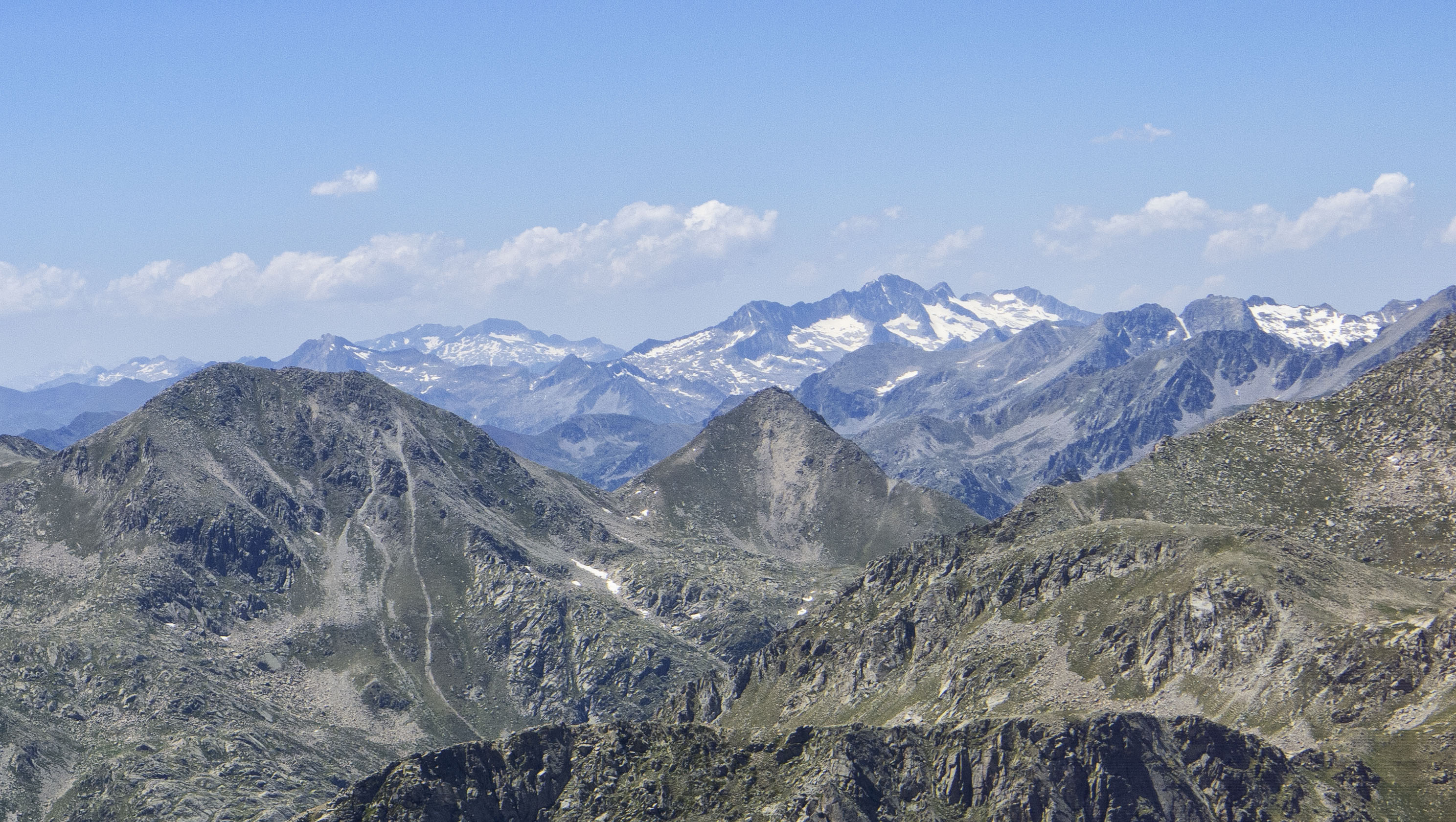 La afilada cumbre de la Mainera (2.904 m), con gran parte de las montañas del parque nacional en el horizonte, destacando especialmente la tremenda pirámide del Peguera, el rey de la zona.