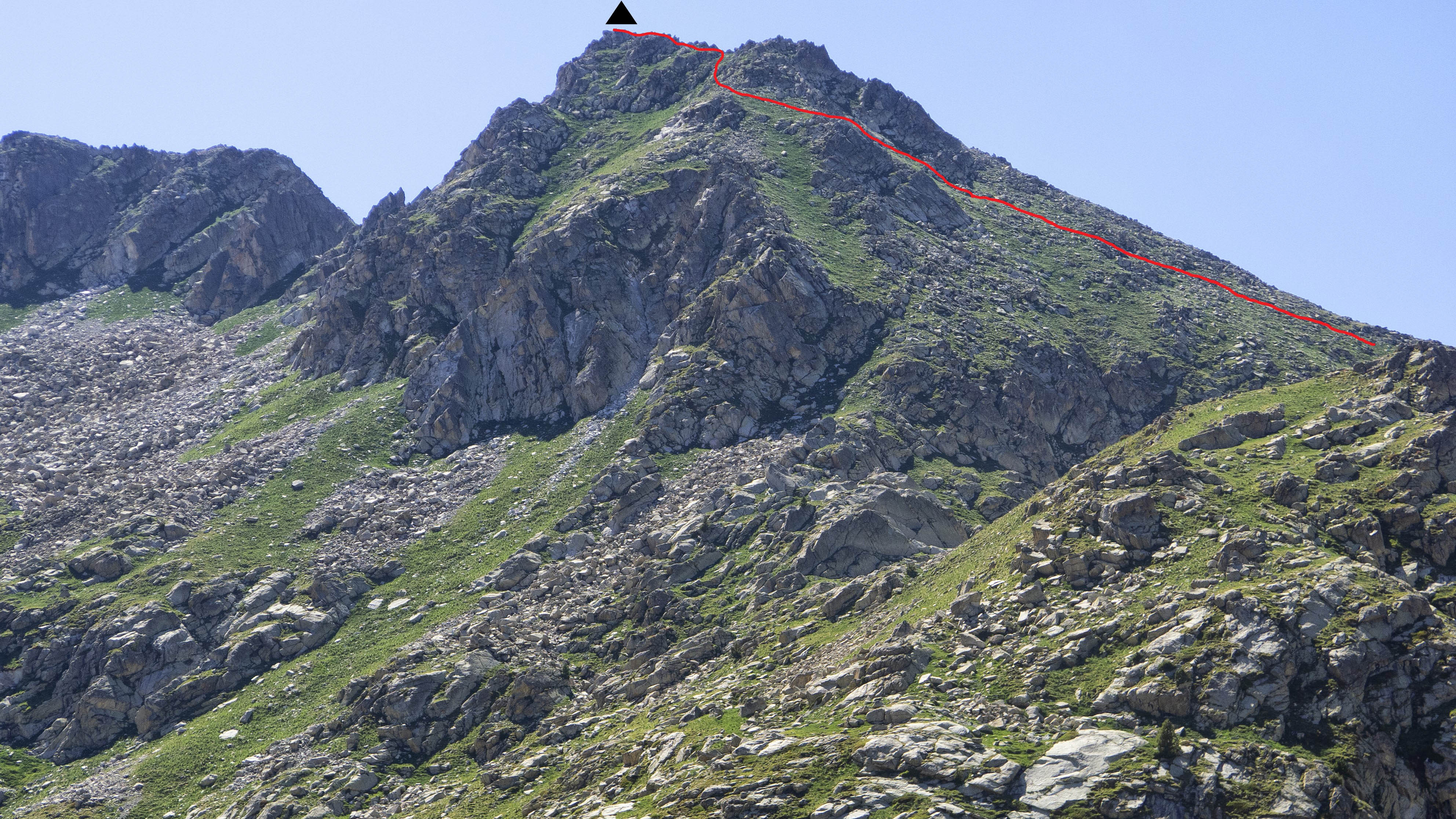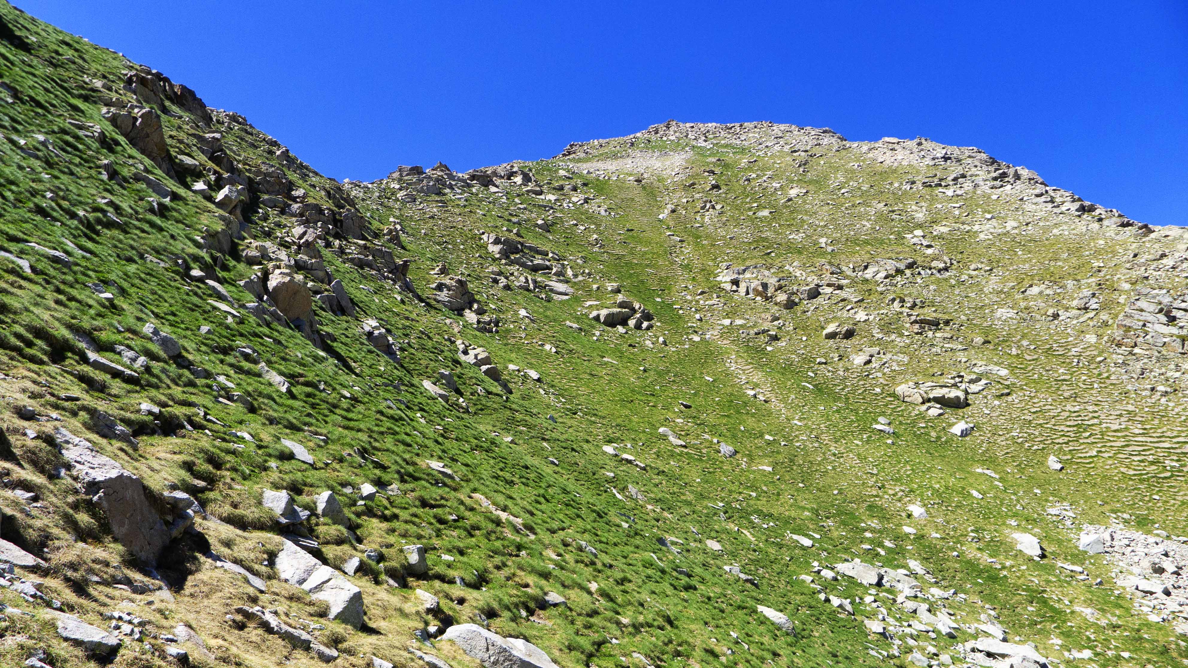 Se presumen dos alternativas para llegar a la agreste cumbre del Clot de Mainera. La primera sigue a toda cresta; una opción que parece algo complicada, puesto que la arista parece muy vertical y con pasos escabrosos, con gendarmes por doquier. La segunda vía, que es la que seguiremos, va por las pendientes herbosas de la cara este, empinadas en extremo, ganando altura pasando por terrazas y roquedo.