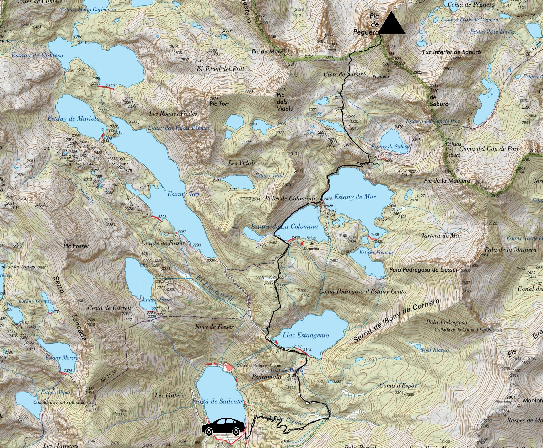 Empezamos, como en tantas otras ocasiones, en Sallente, principal punto de inicio de toda la Vall Fosca. Y si se empieza en Sallente, lo que suele seguir es la siempre dura Canal del Pigolo, que nos permite superar el circo que cierra el fondo del valle. Saliendo desde el mismo parking al otro lado de la presa, el sendero, siempre bien trazado, asciende por la canal ganando casi 400 metros de desnivel, hasta que llega al Carrilet.