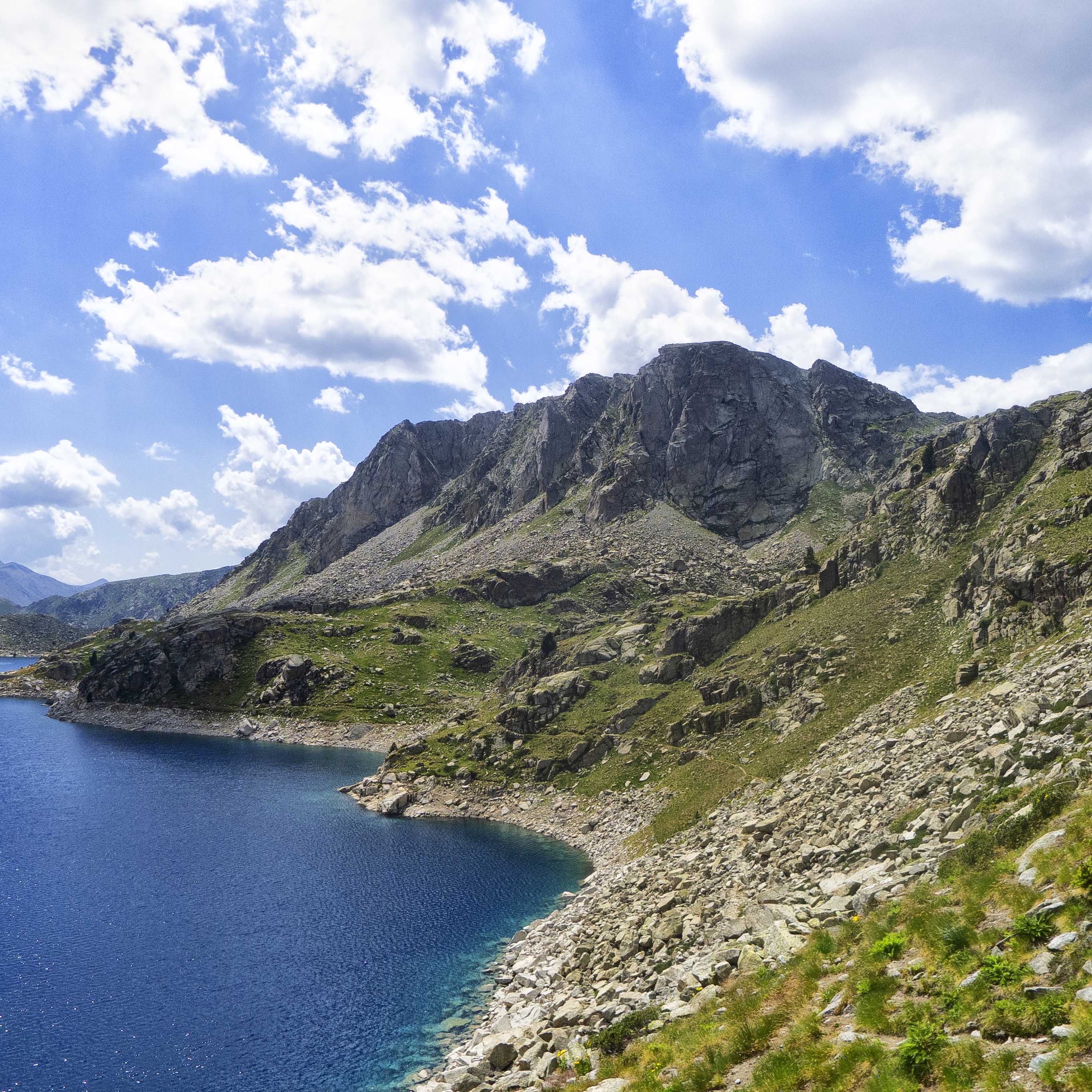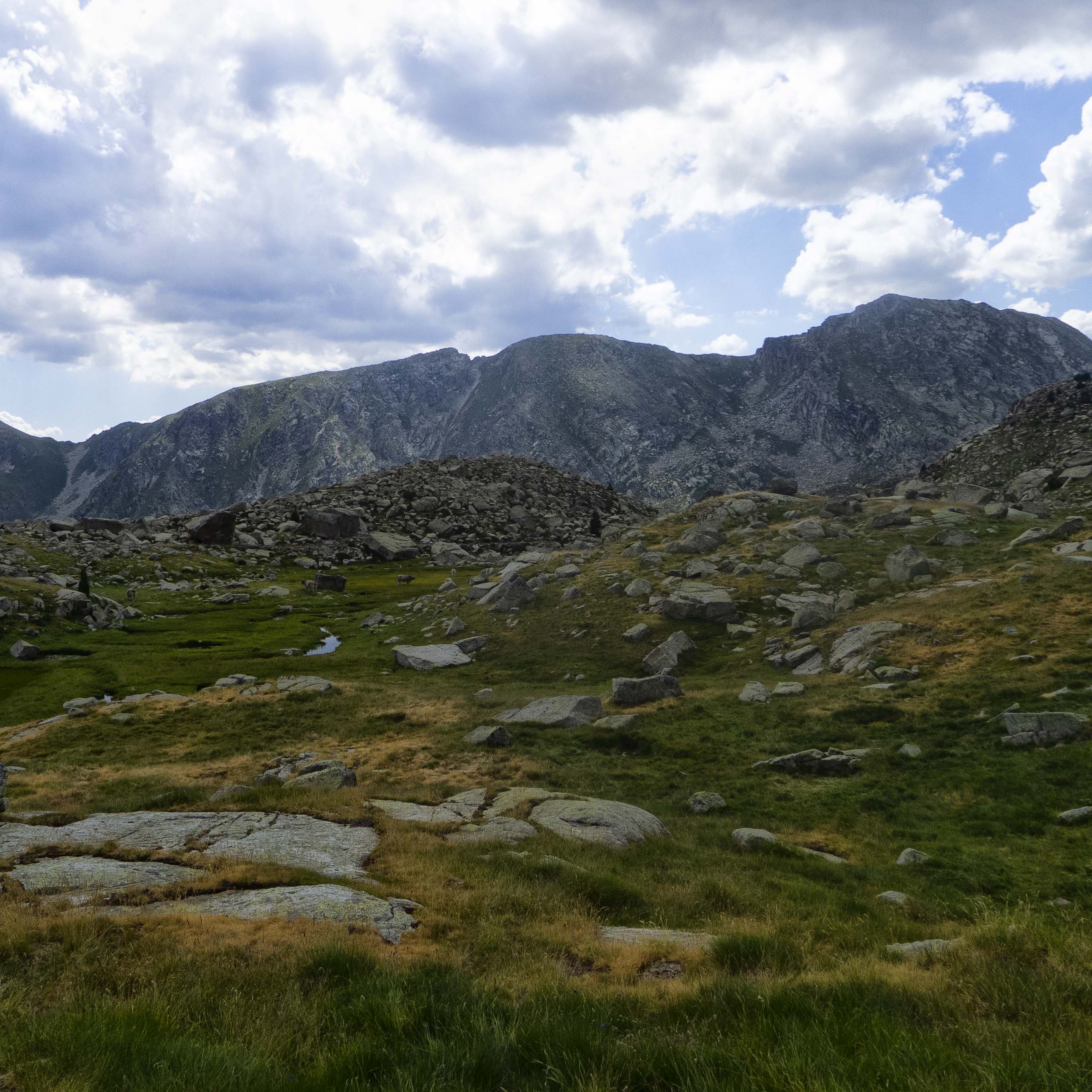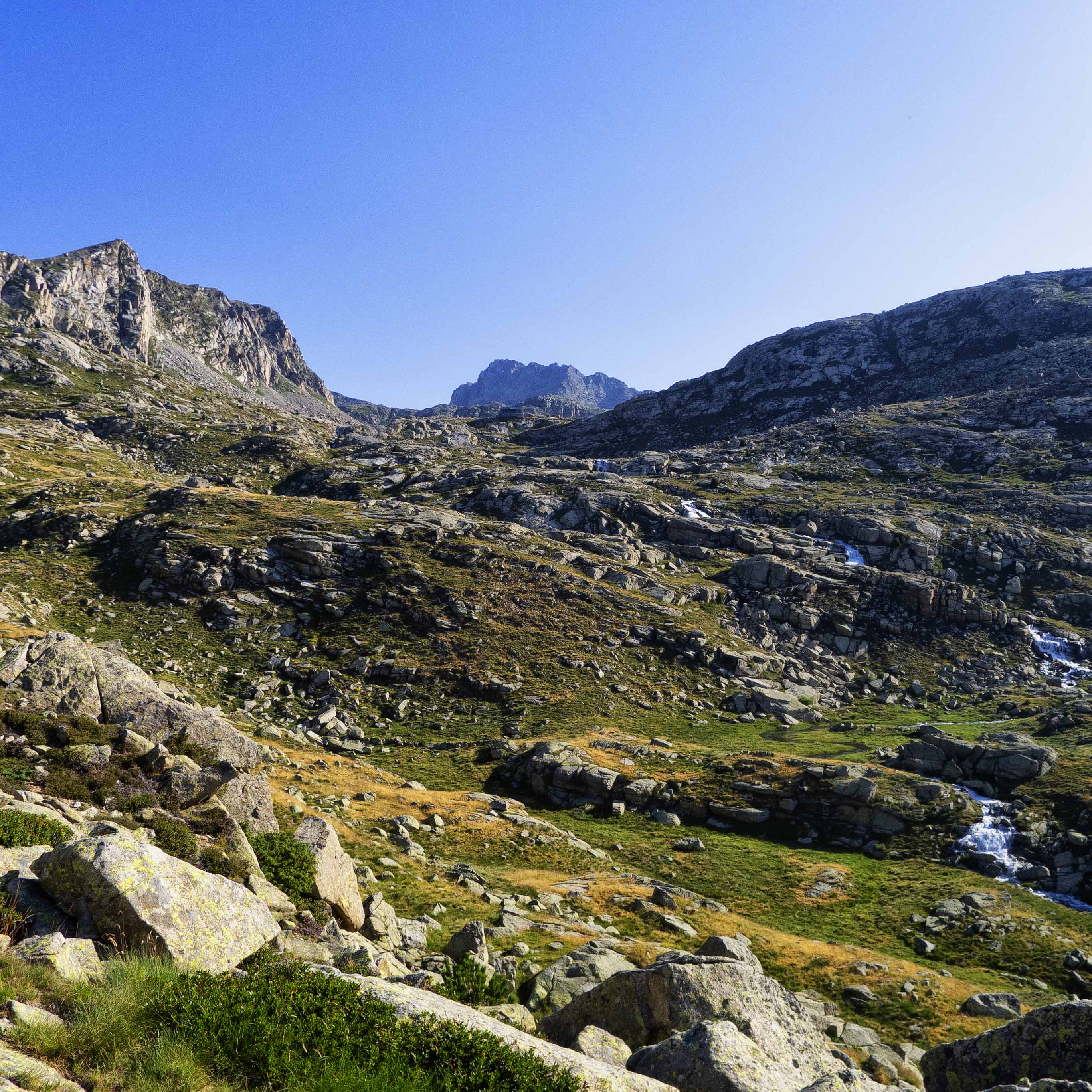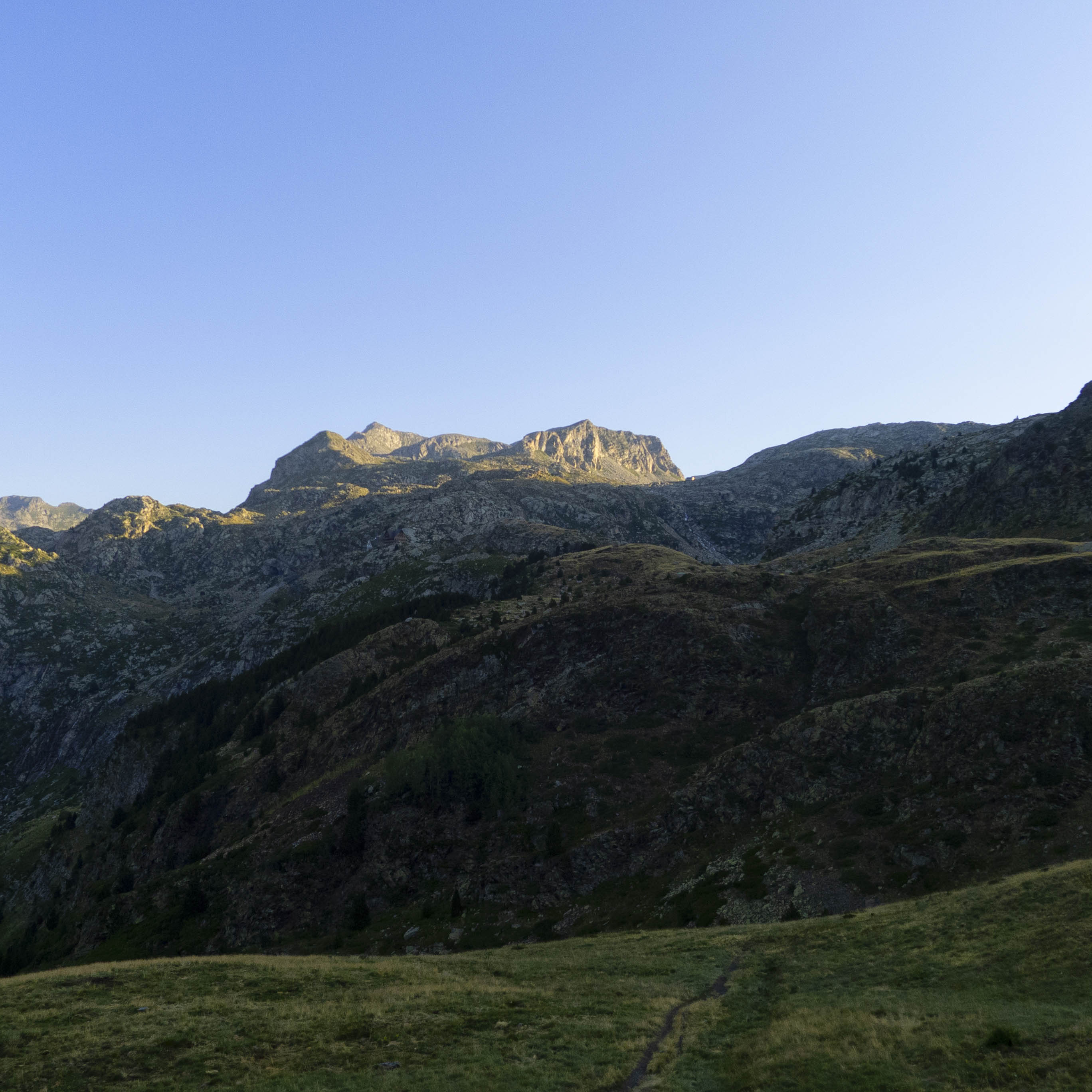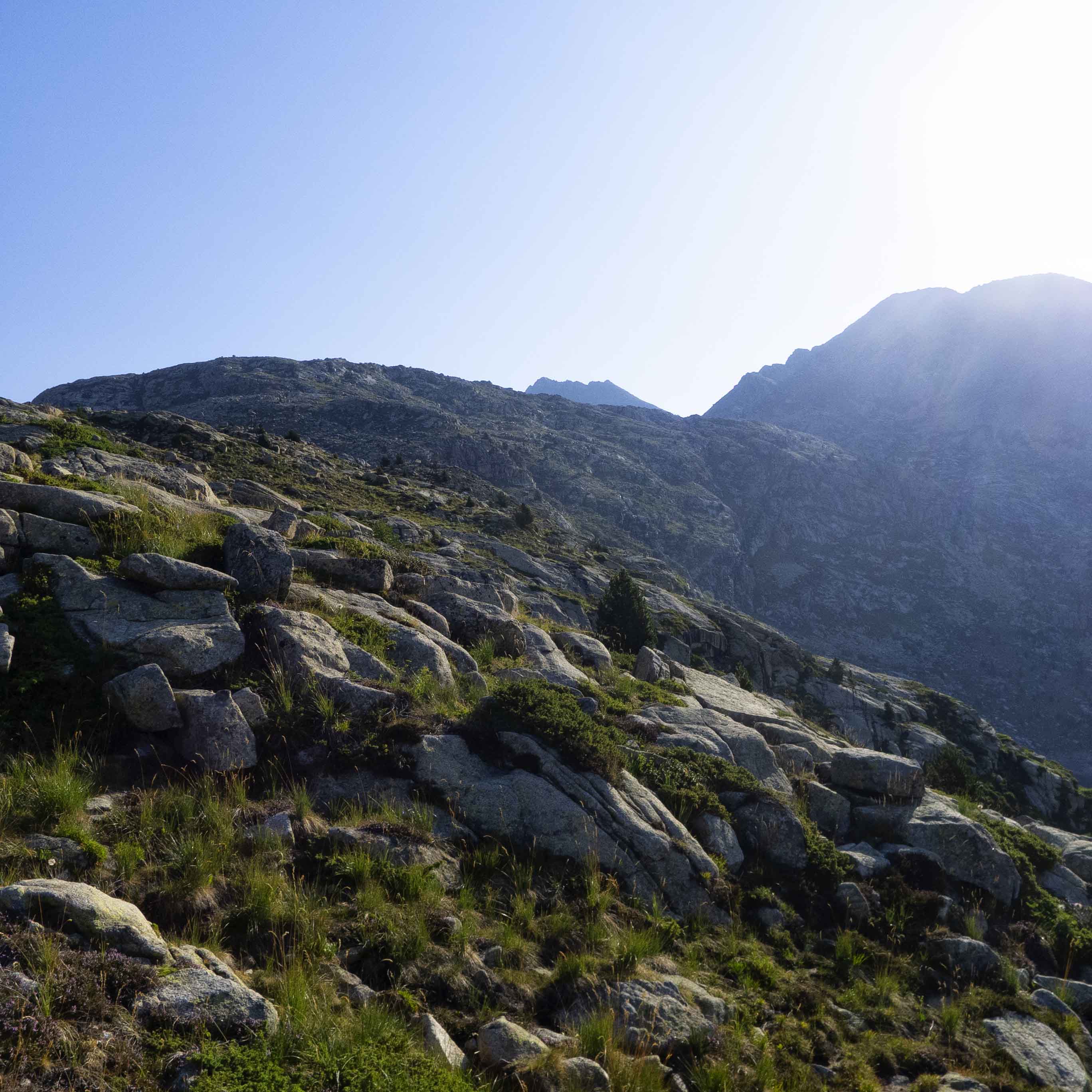 Siguiendo trazos de sendero, vamos ascendiendo por los prados en dirección norte. Al frente, el gran promontorio tras el cual se alojan el Estany Frescau y el de Colomina. En la parte izquierda del mismo se encuentra el refugio, donde tenemos que llegar.