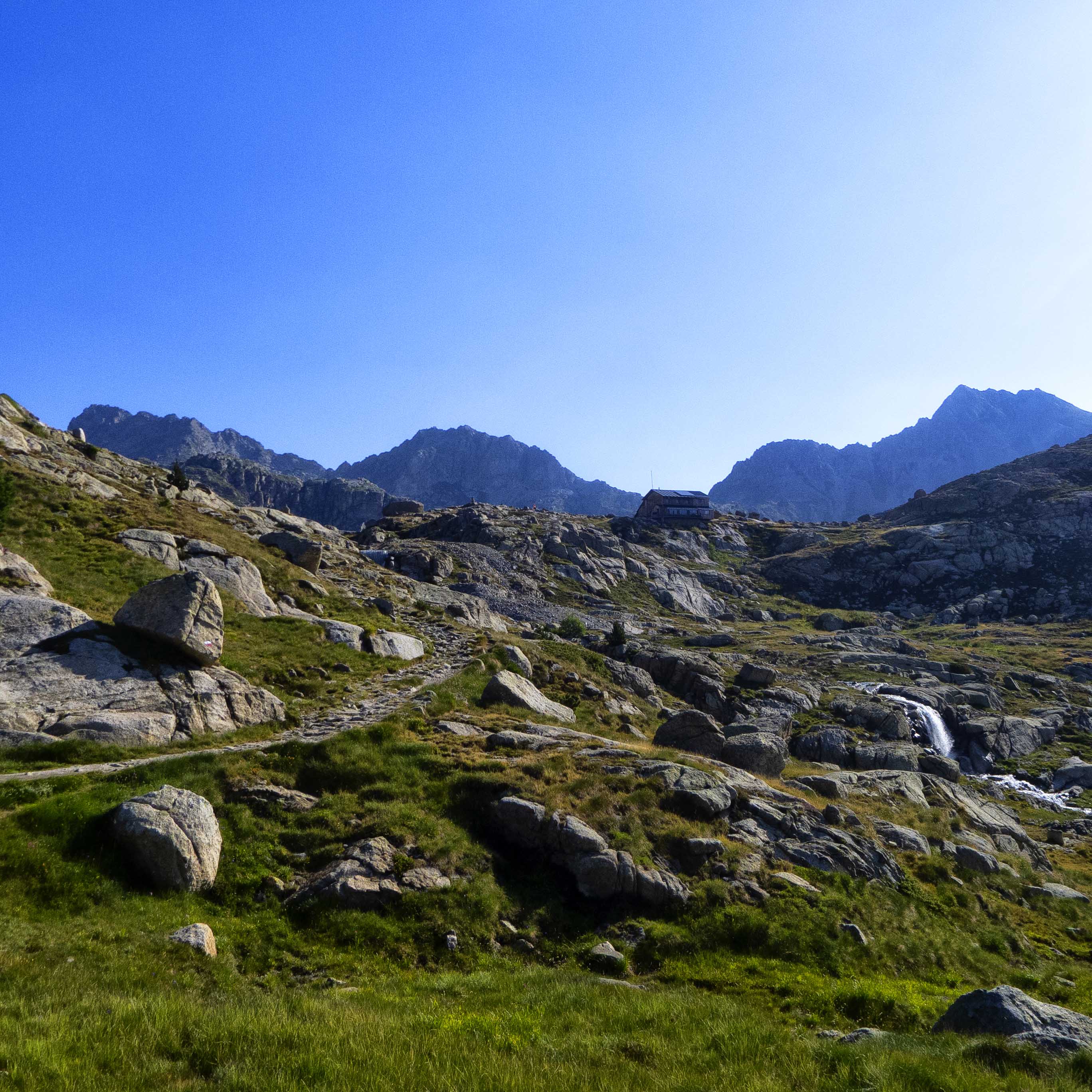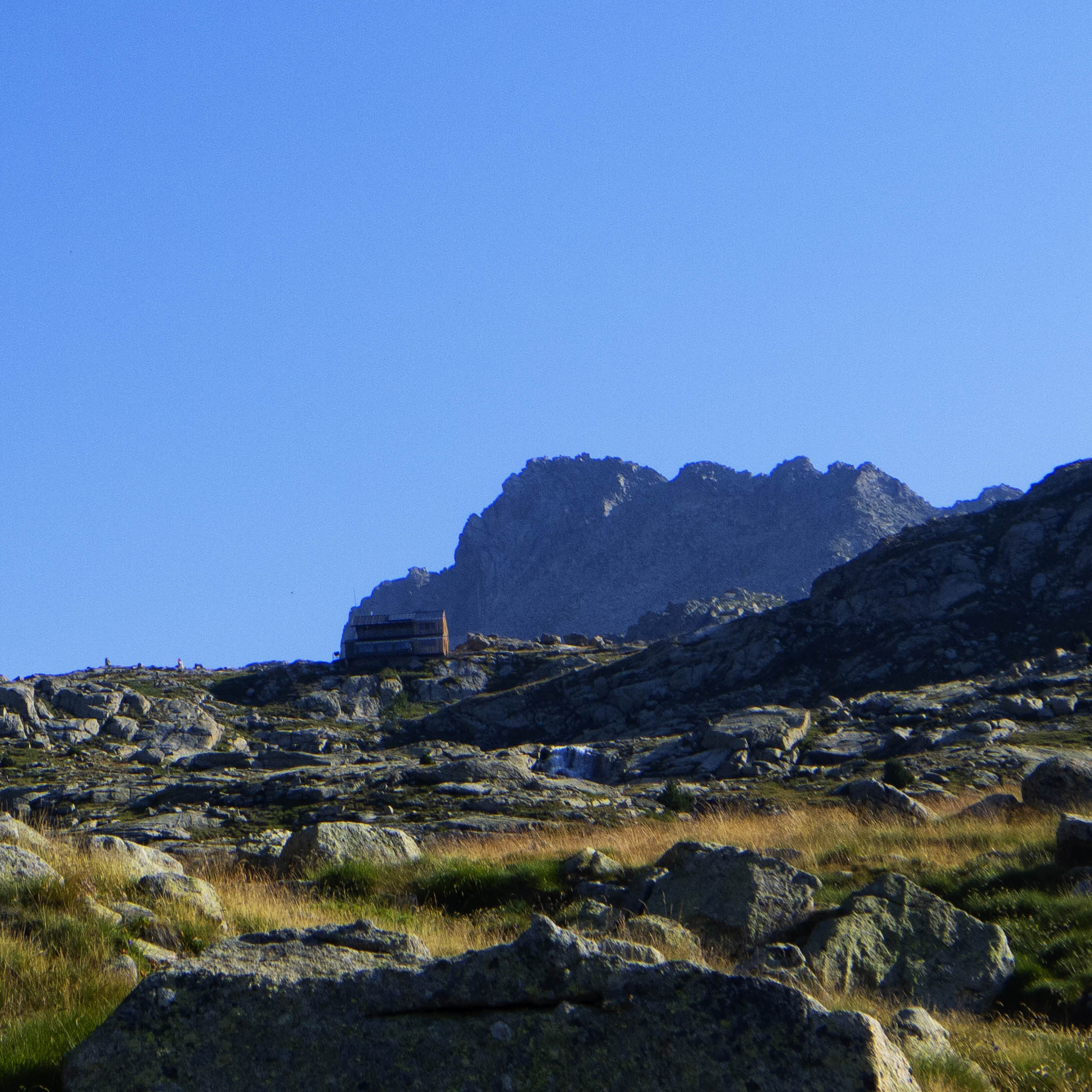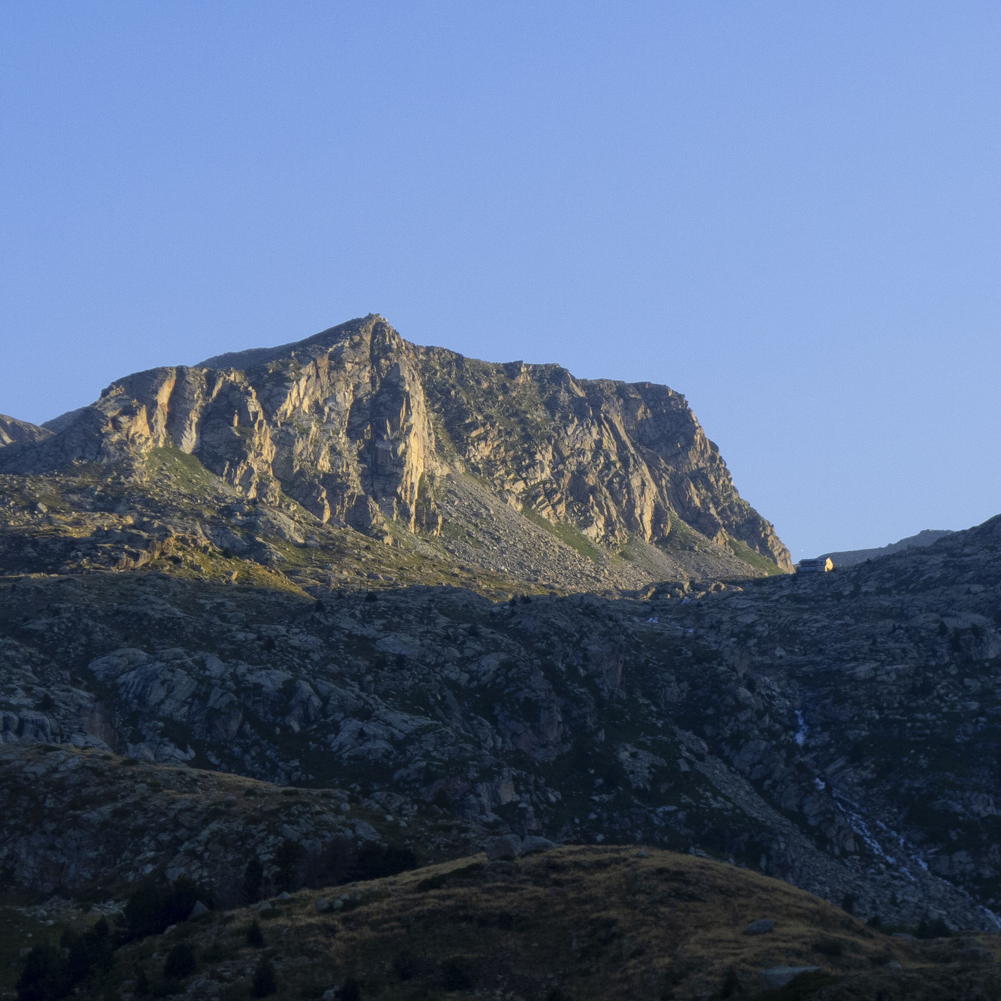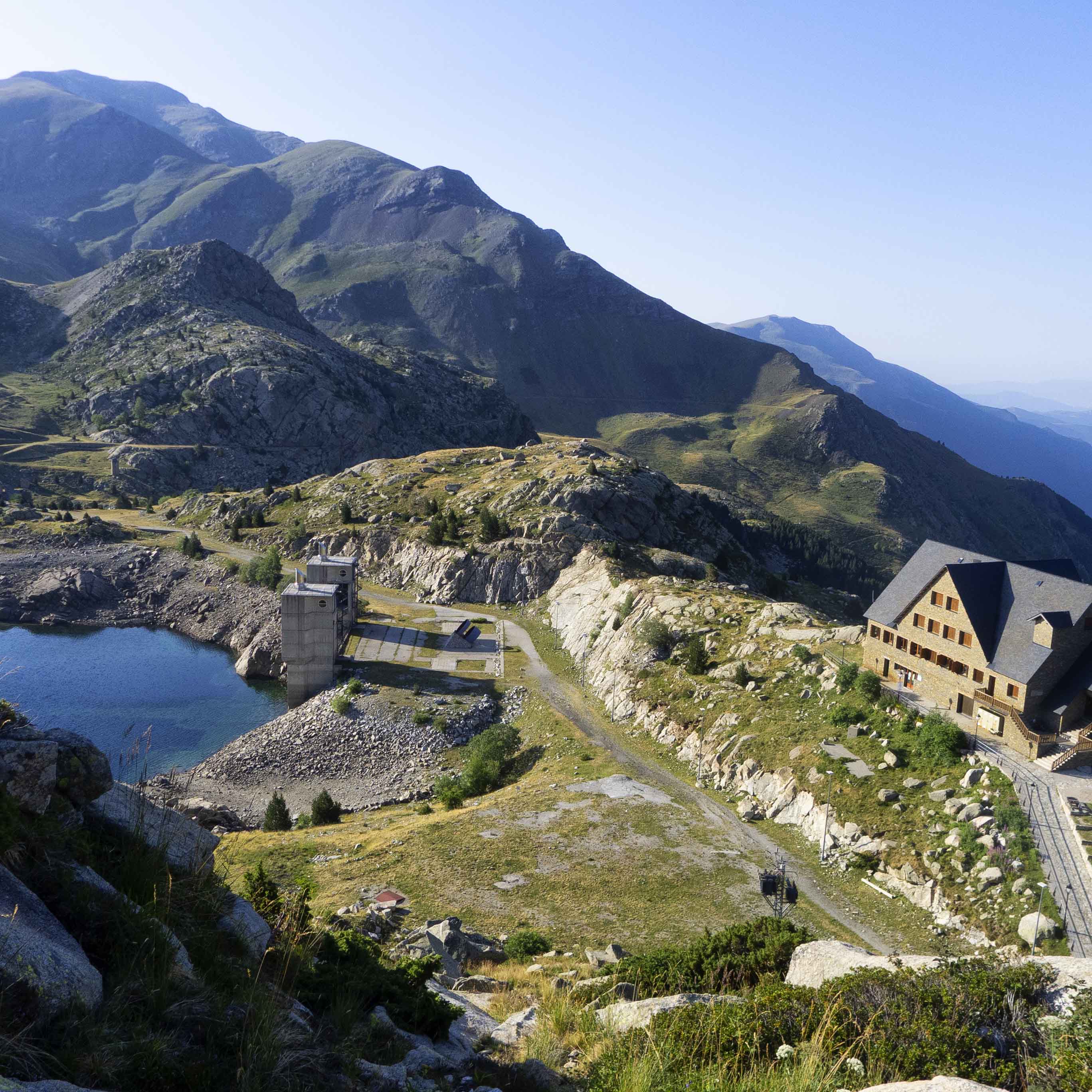 Bajo los espolones de les Pales de Colomina, el refugio de Colomina se ve bien pequeño. Para llegar a él, tenemos que ir primero al Estany Gento, al cual se llega rápidamente siguiendo el Carrilet por la izquierda.