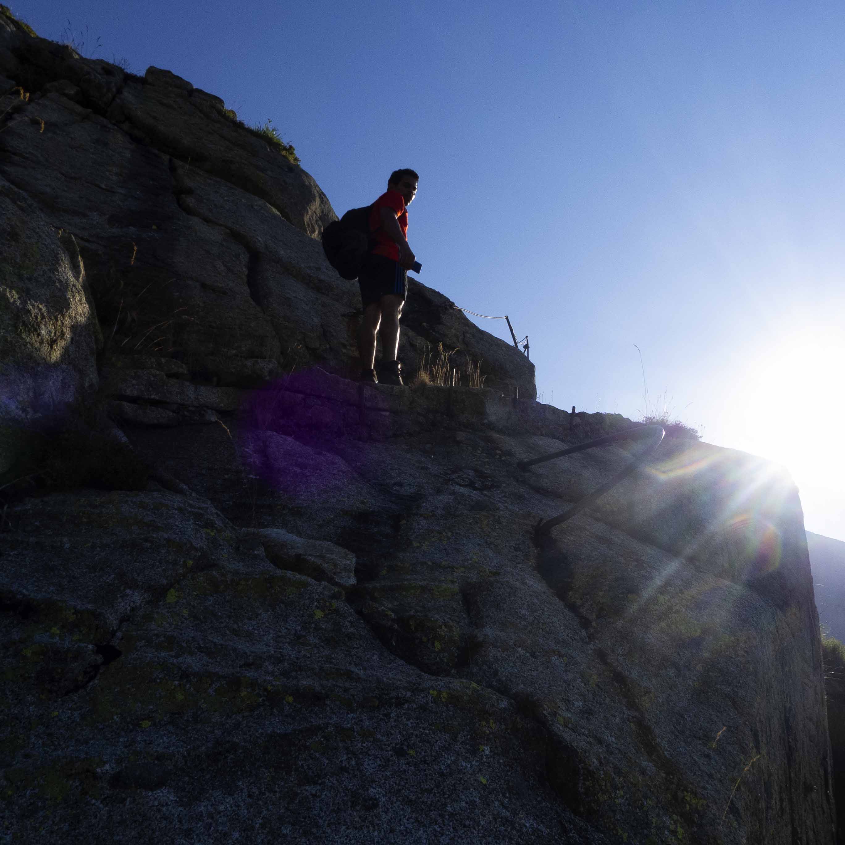 Desde la caseta, trazamos una diagonal hacia la derecha, trepando constantemente por el liso granito con la inestimable ayuda de unas cadenas y hierros incrustados en las piedras, probablemente utilizados por los antiguos trabajadores del Carrilet.