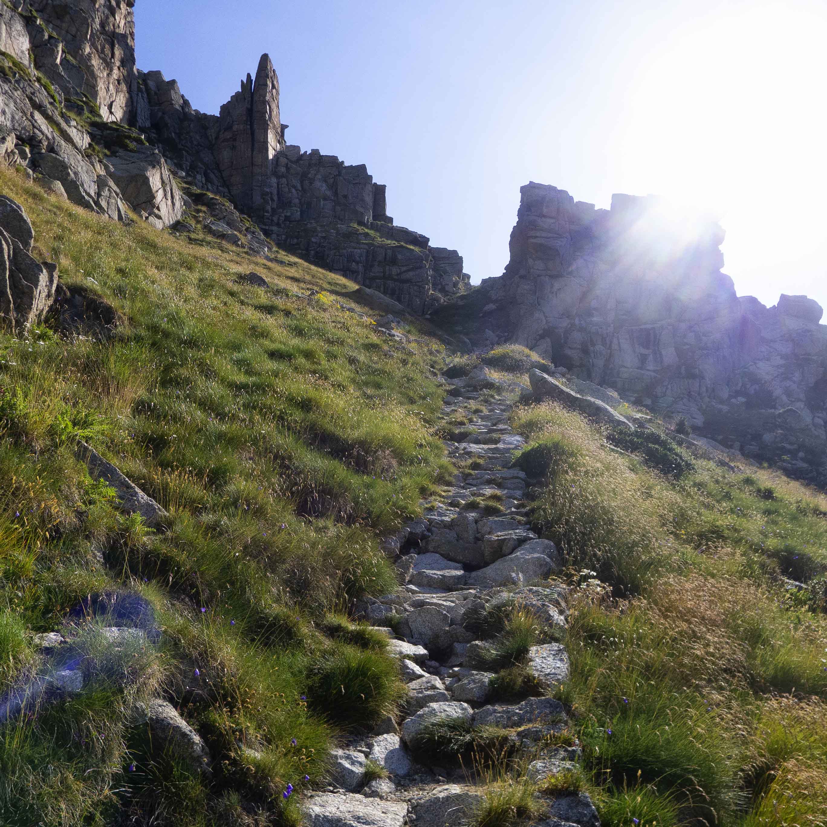 Llegamos al Pas de l'Ós, brecha entre dos afiladas torres graníticas. El camino va haciendo zigzags hasta emprender una última e intensa subida hacia lo alto de la brecha.