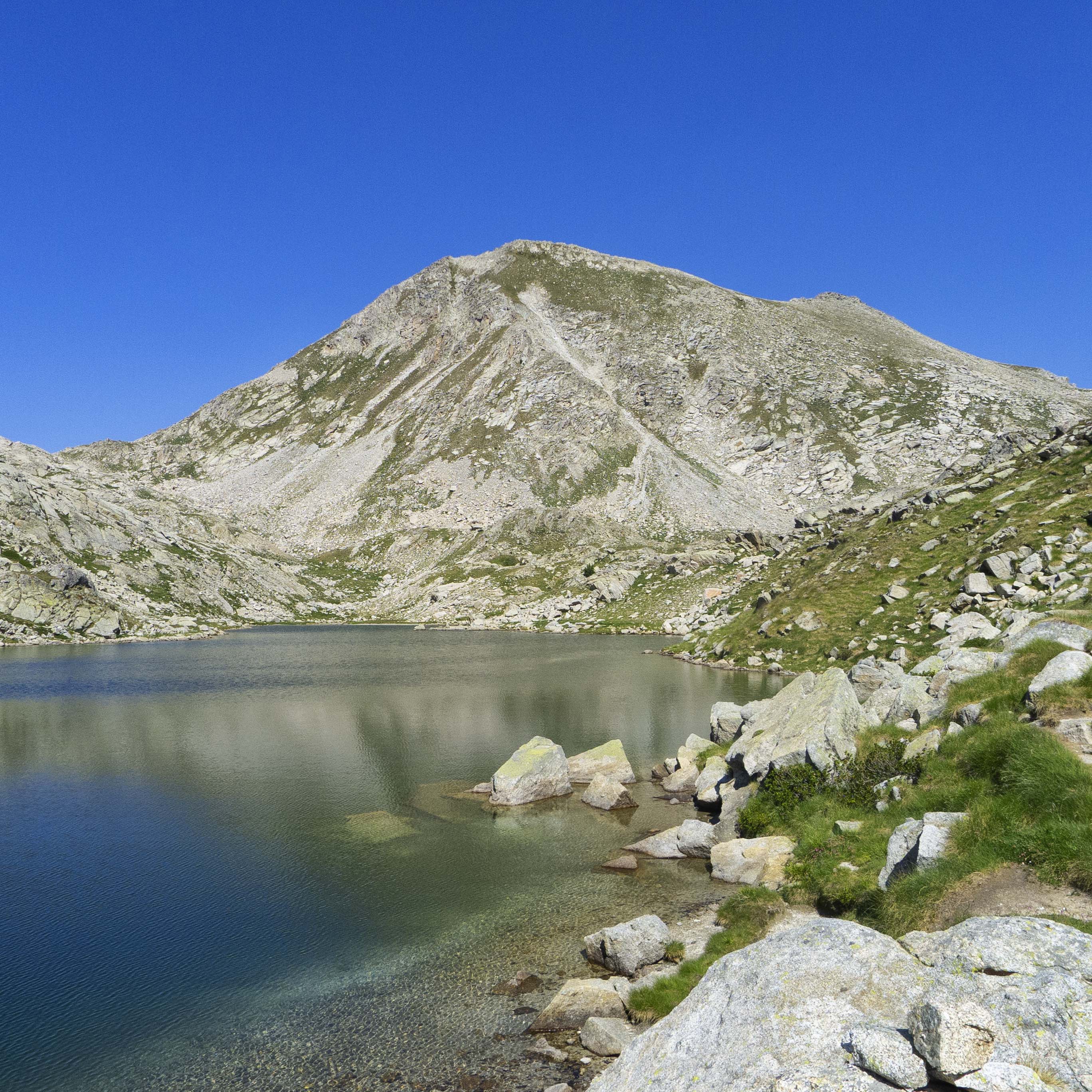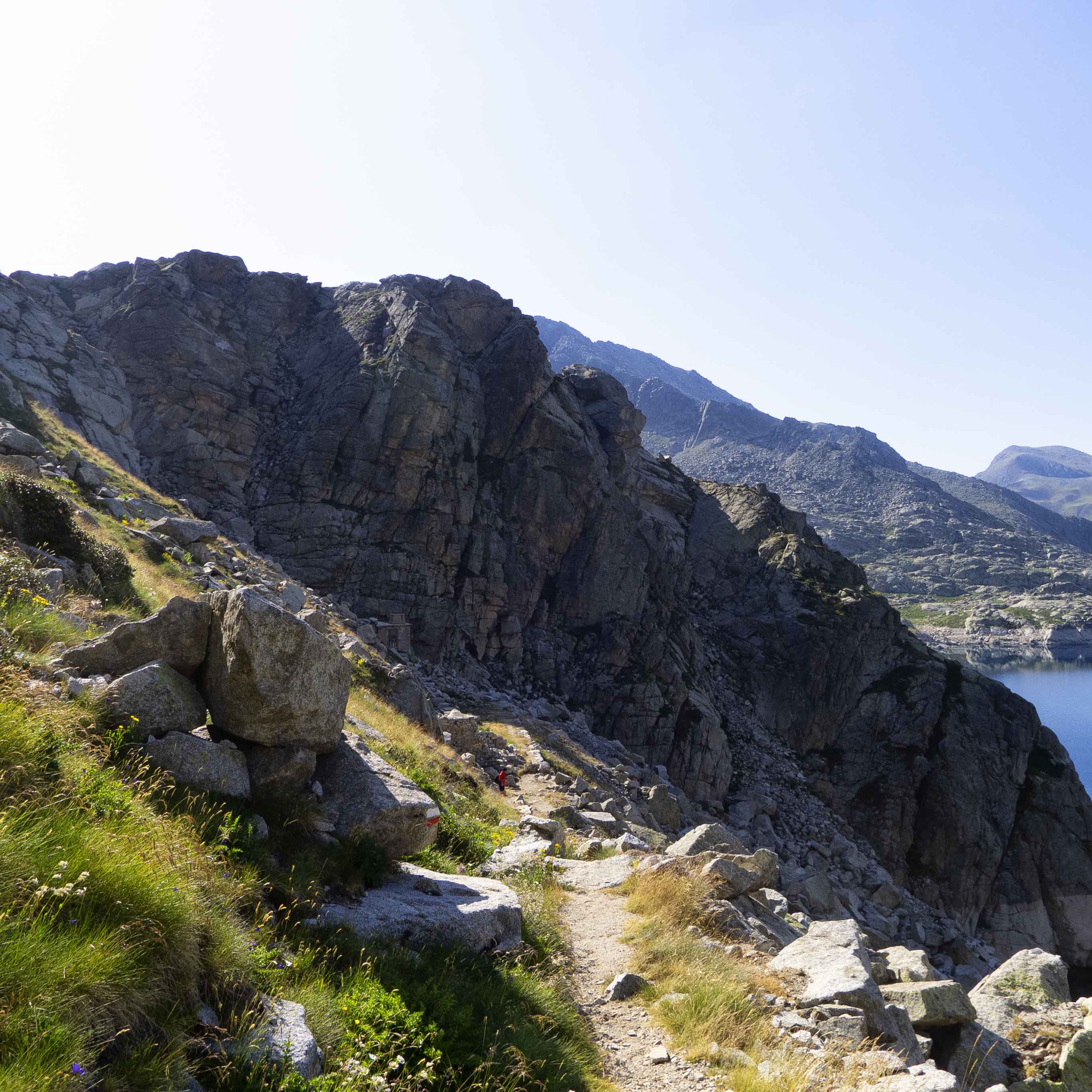 Llegamos al Estany de Colomina, que debemos bordear por la izquierda, siguiendo ahora el buen camino de la Carros de Foc, que atraviesa toda la parte alta de la Vall Fosca.