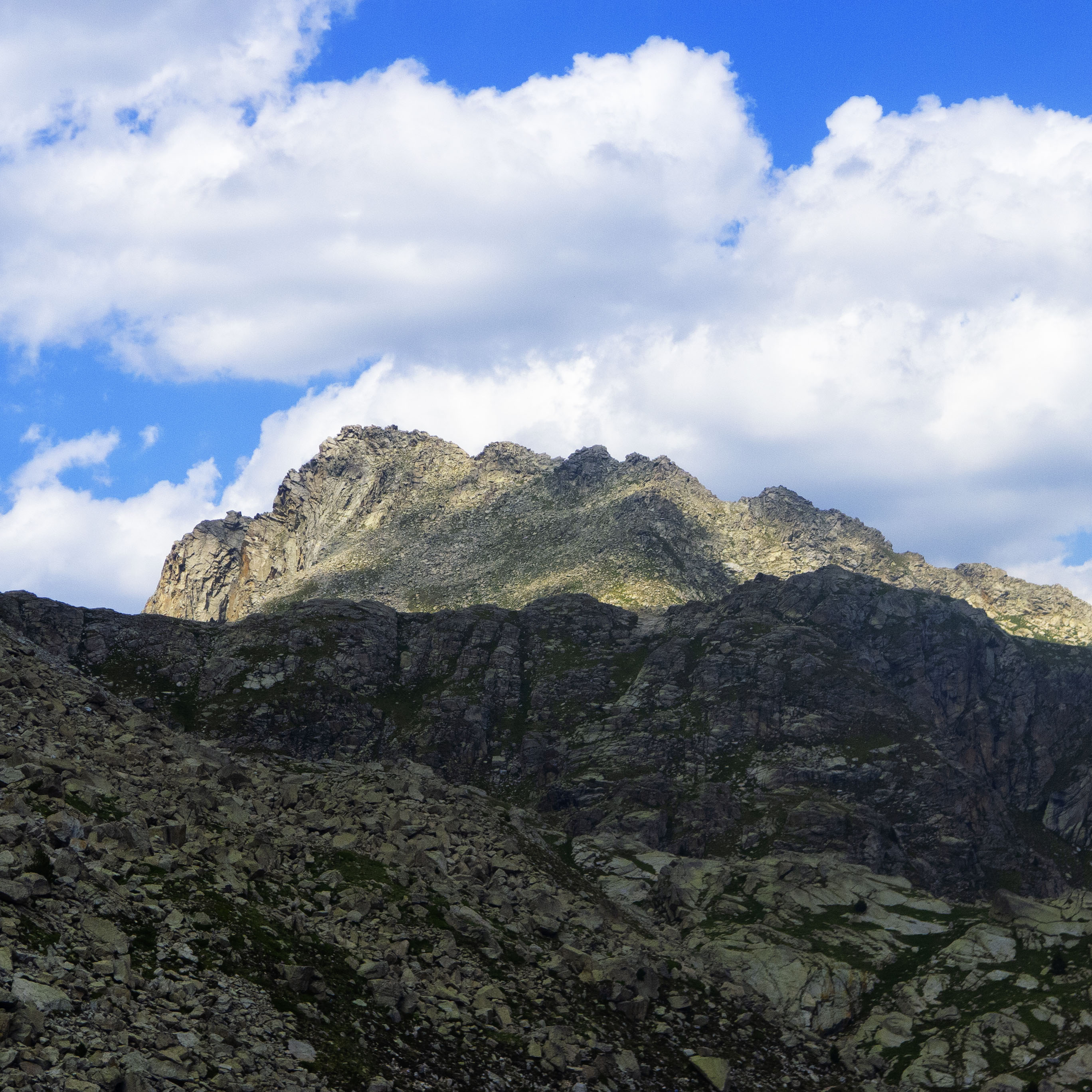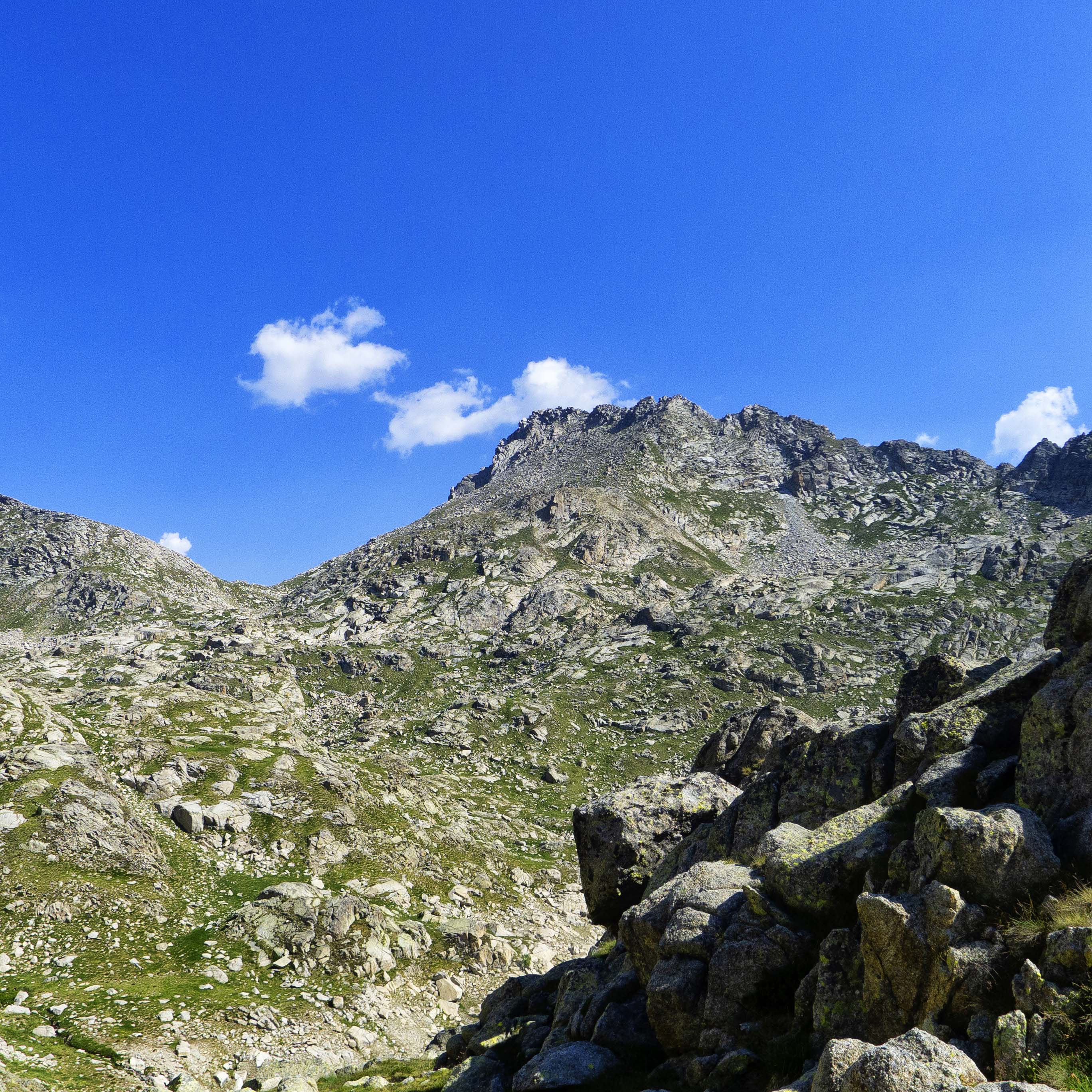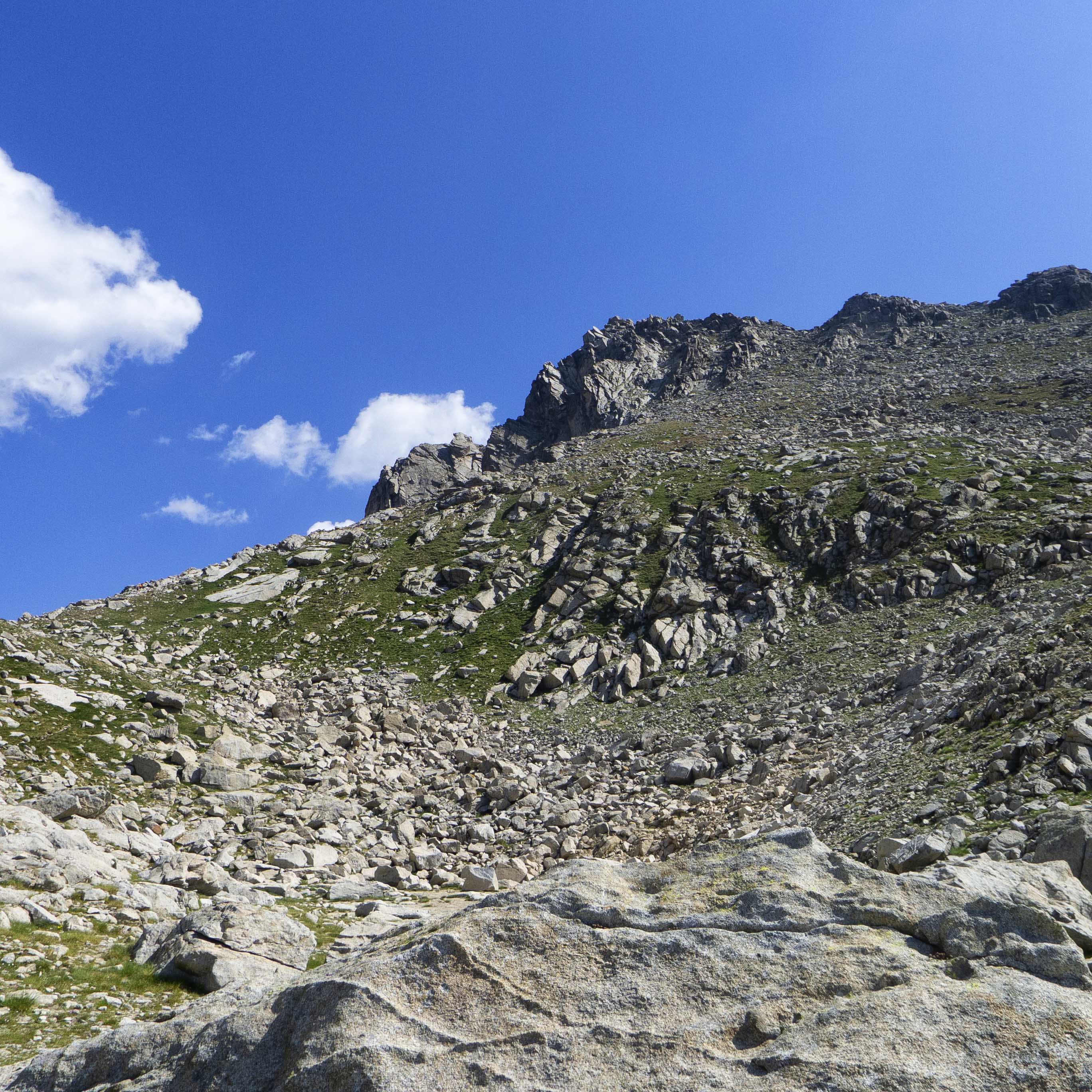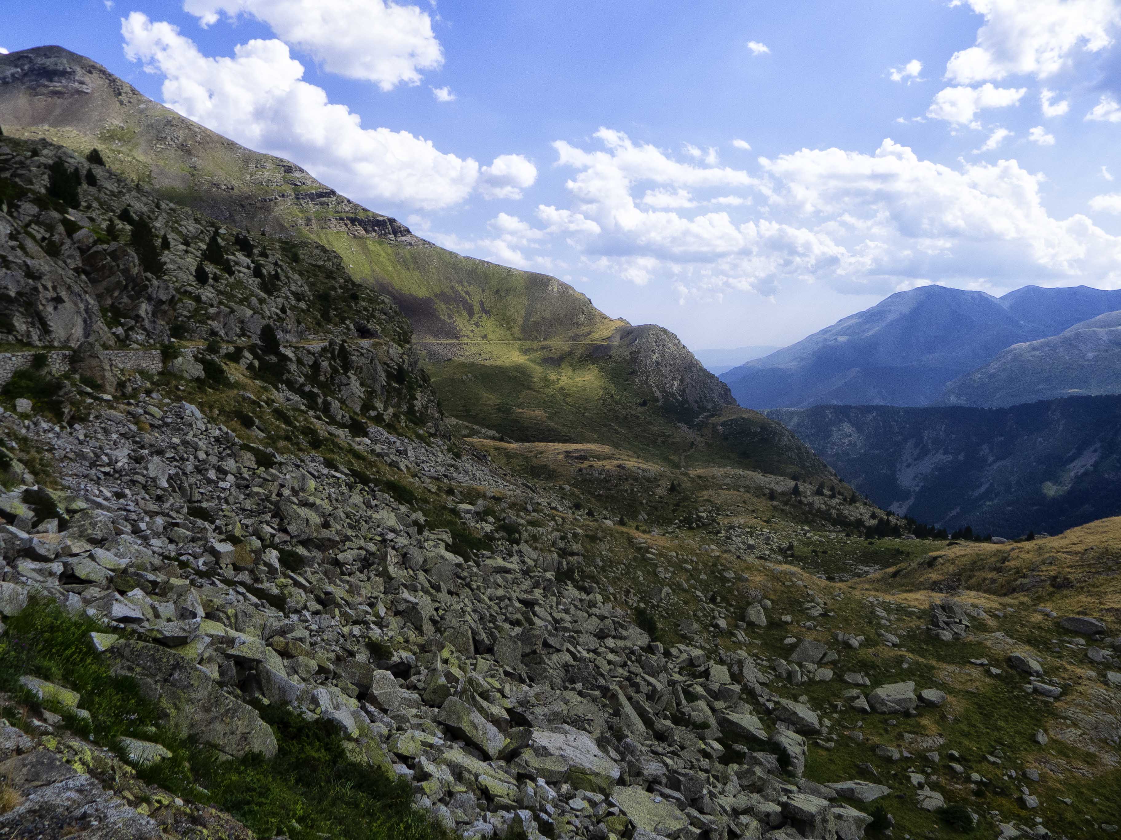 Tras un último ascenso por una descompuesta ladera, llegamos al Coll de Peguera, tras el cual el terreno se desploma hacia la Vall de Monestero. Al otro lado del valle, la bicéfala cumbre del Bassiero domina la otra vertiente de Sant Maurici.