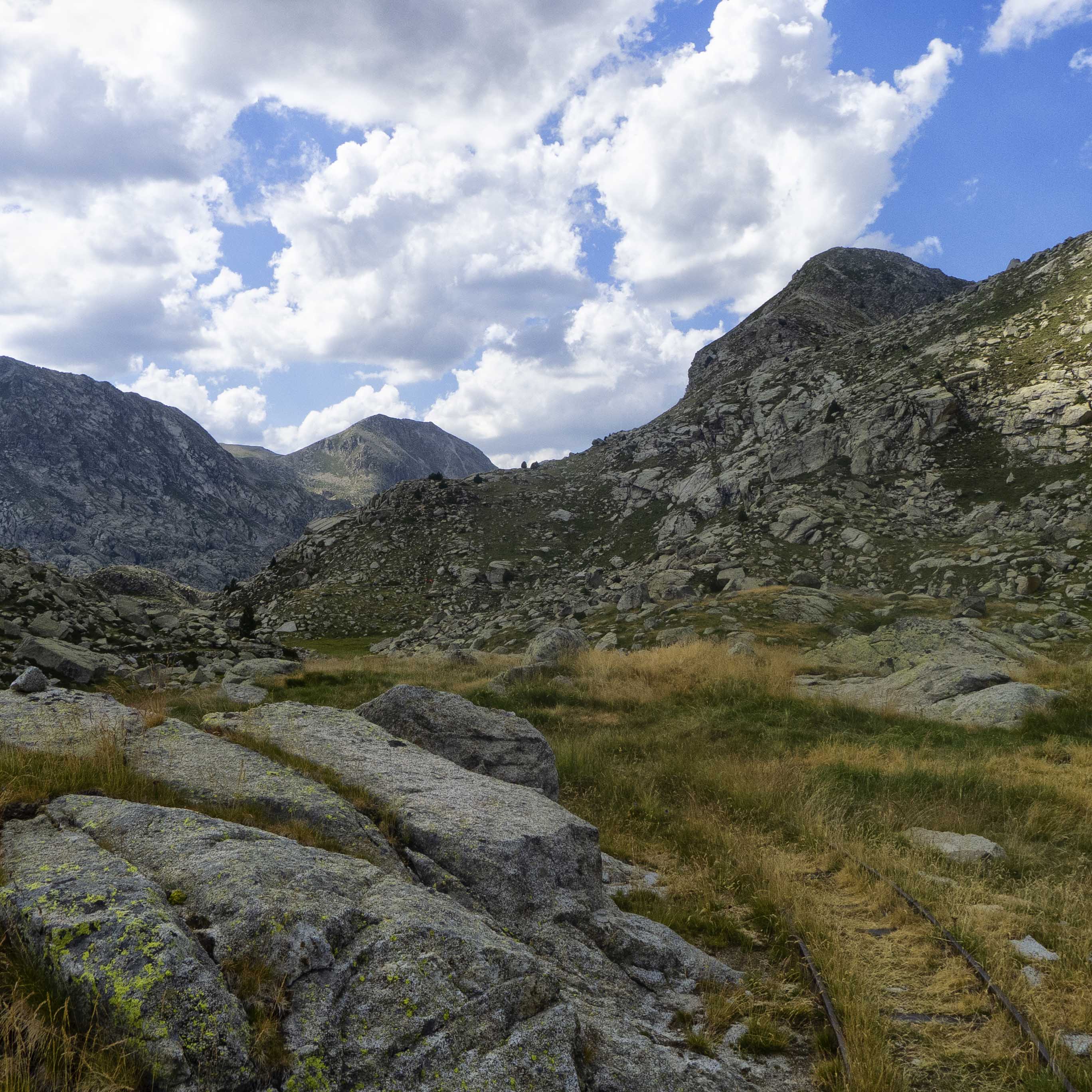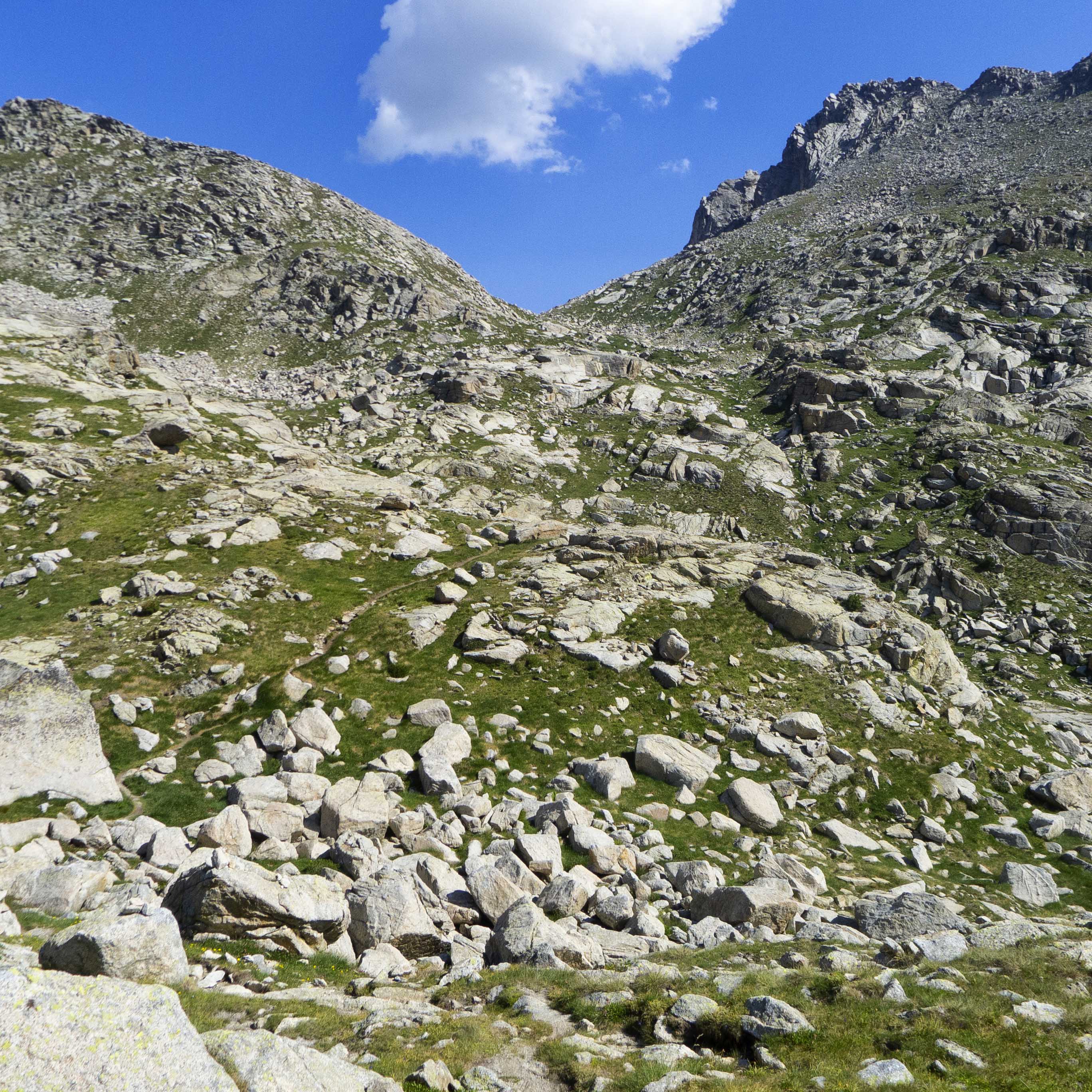 Abandonamos el camino de la Carros de Foc, que bordea la cuenca vacía del Estany de Saburó para dirigirse al collado homónimo y tomamos un camino que se abre a mano izquierda para subir por una ladera herbosa.