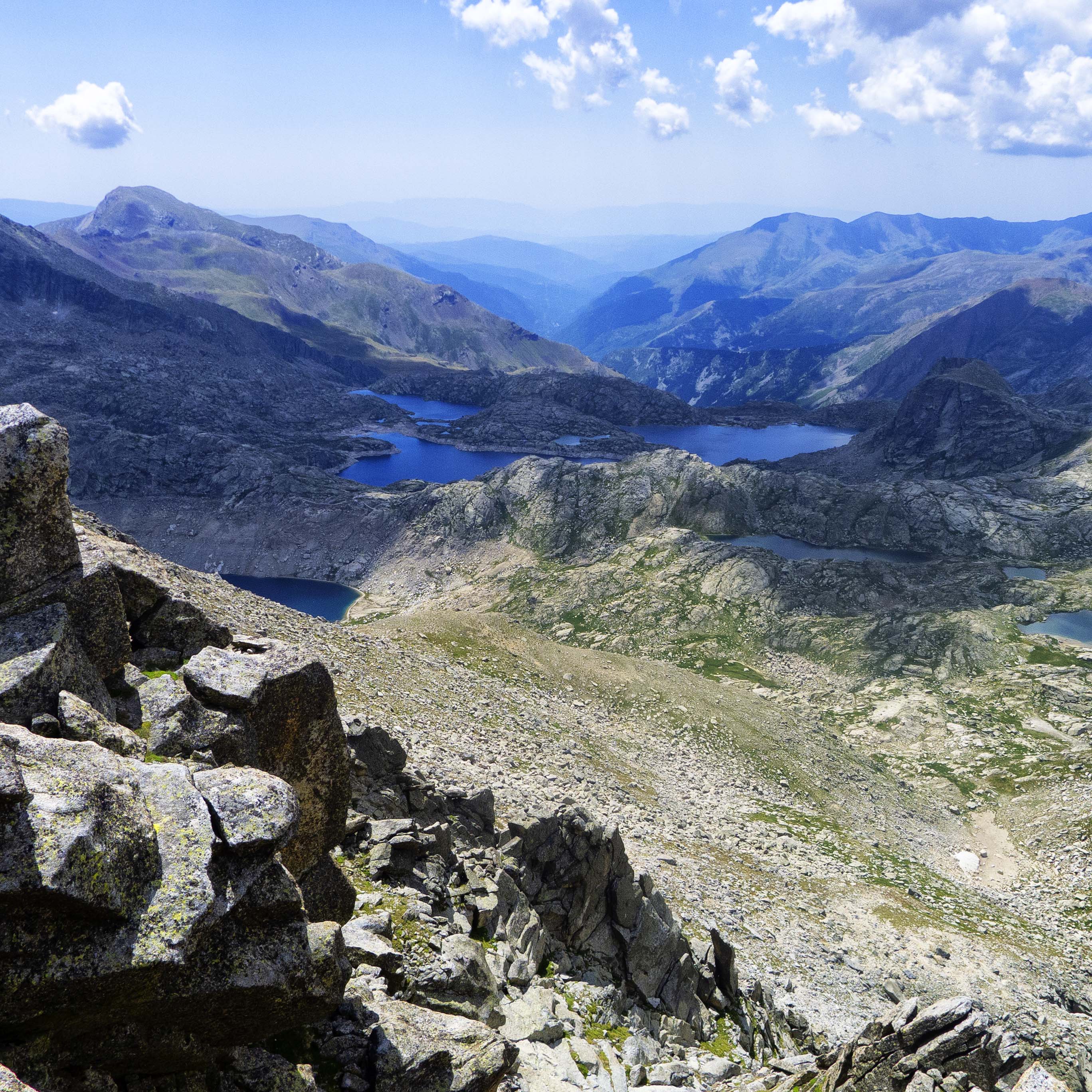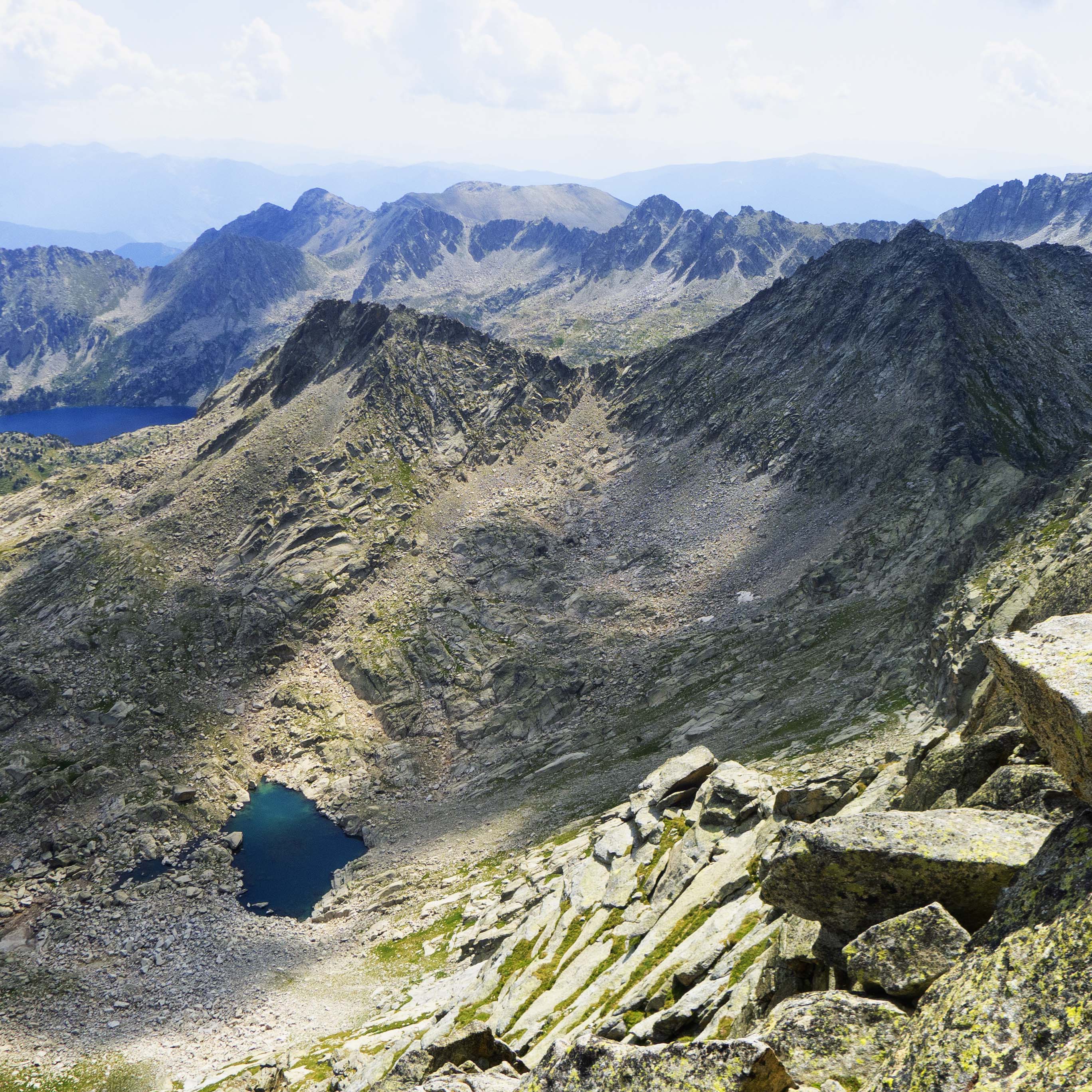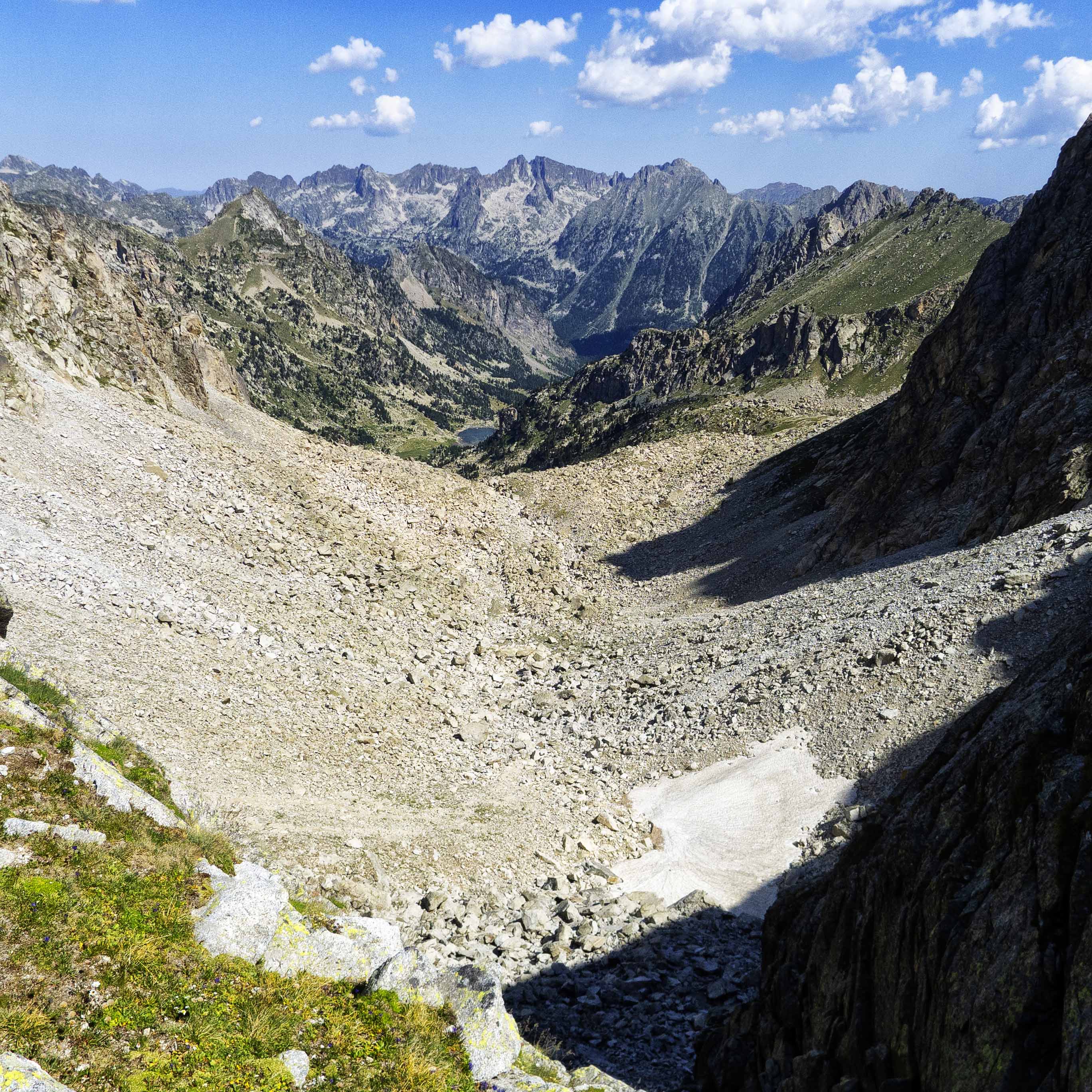 Desde la brecha, vemos los 200 metros largos de desnivel que hemos superado desde el collado, con el Pic dels Vidals dominando los estanys más pequeños de Saburó.