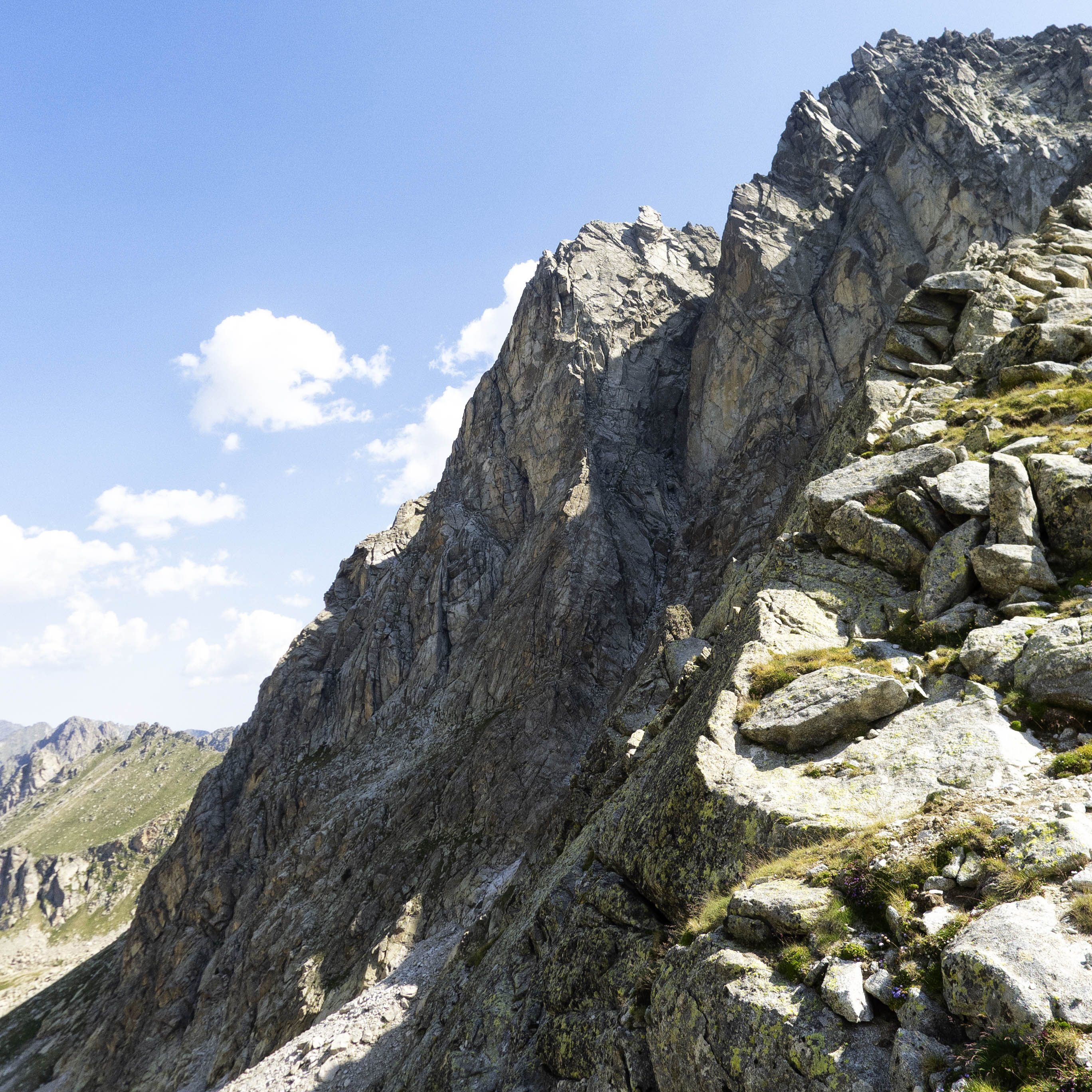 Llegados a la brecha empezamos a recorrer los 100 metros de cresta que nos separan de la cumbre. El primer paso es un muro tumbado de roca lisa con algo de exposición. Tras superarlo seguimos ascendiendo por el filo, con excepción de algunos tramos donde bordeamos las agujas, siempre por la vertiente de la Vall Fosca.