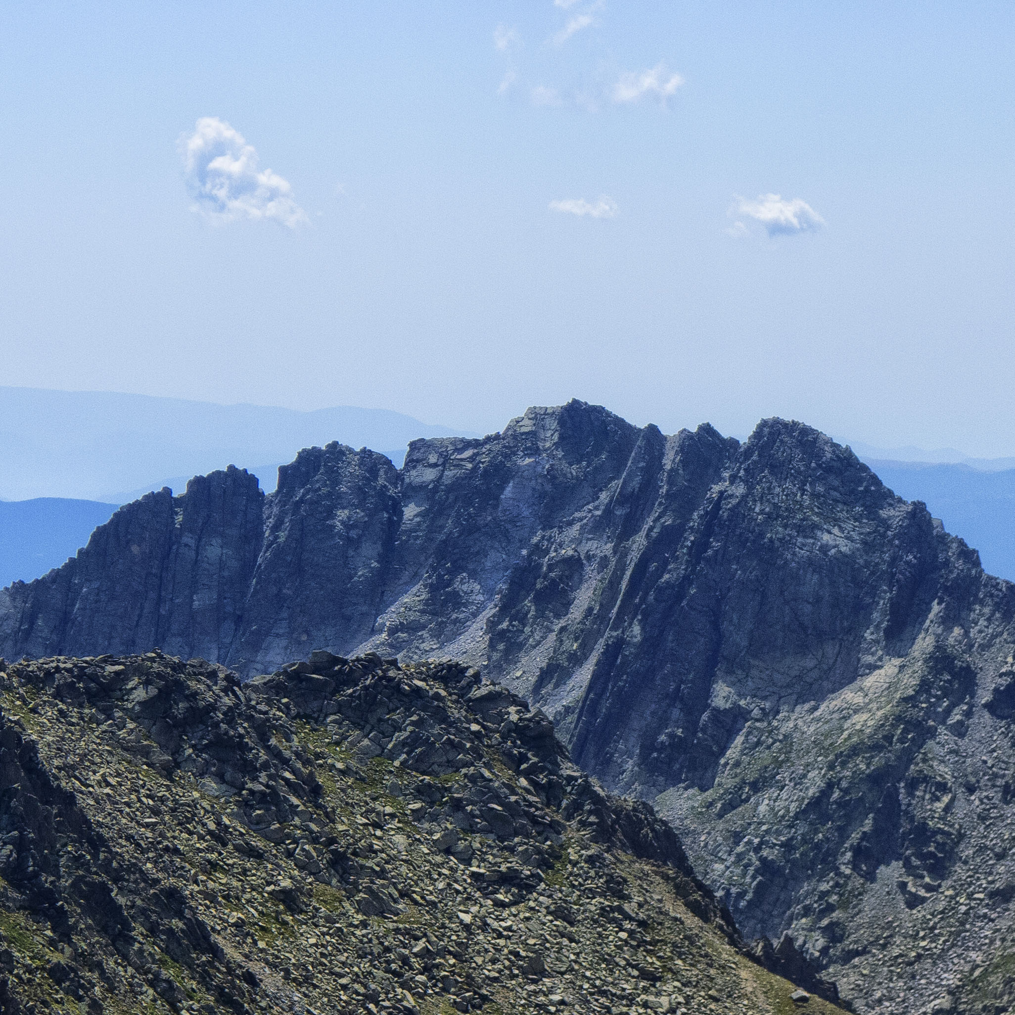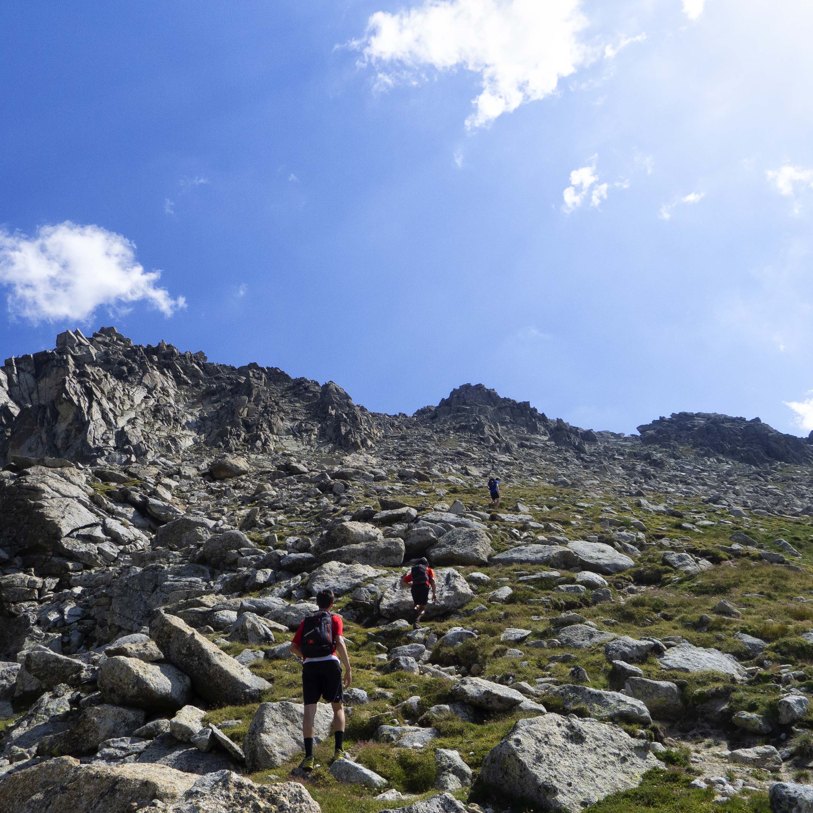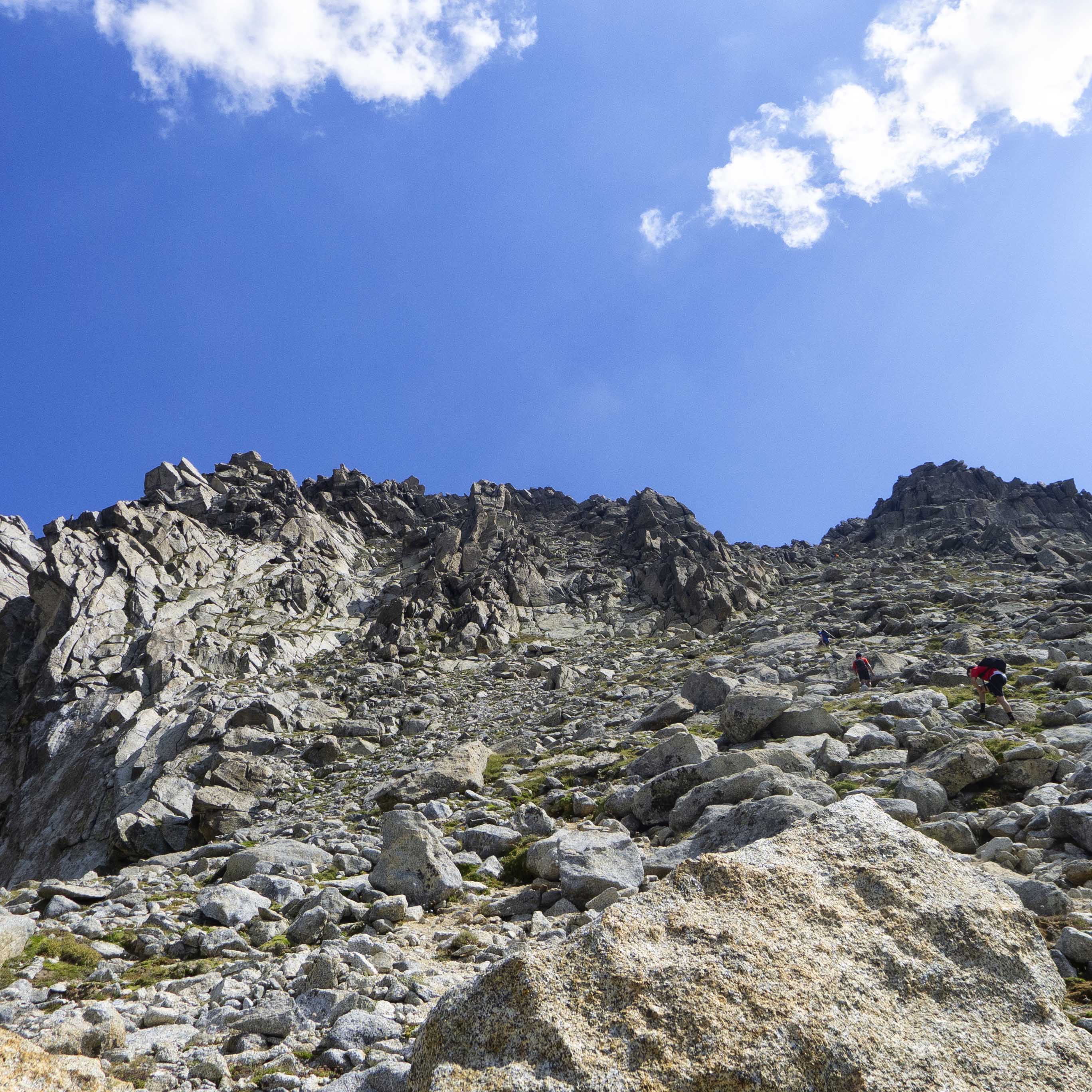 Cuando llegamos a la canal que conduce a la brecha, nos vamos fijando en las puntiagudas rocas que jalonan la cresta del Peguera y que tendremos que superar en un rato.