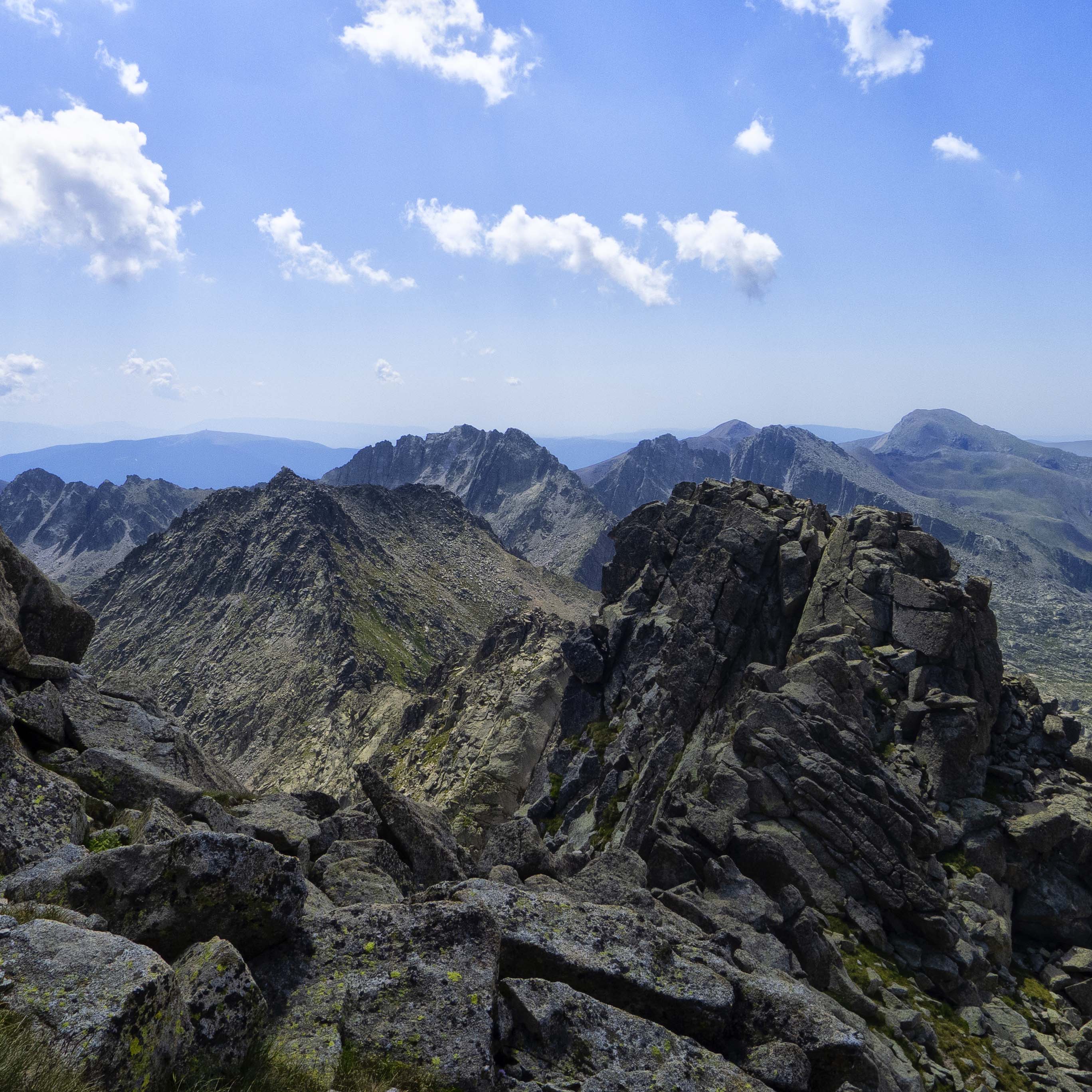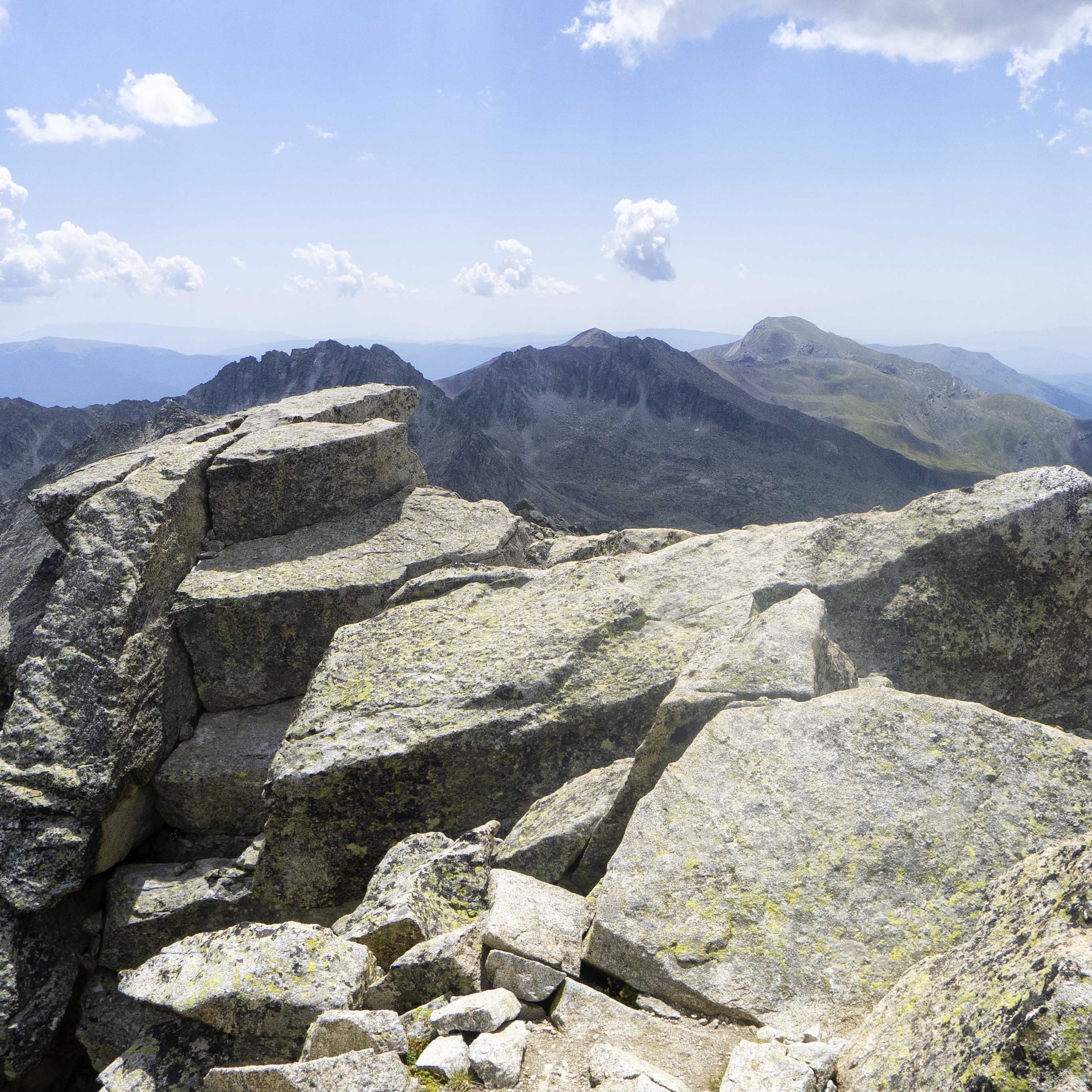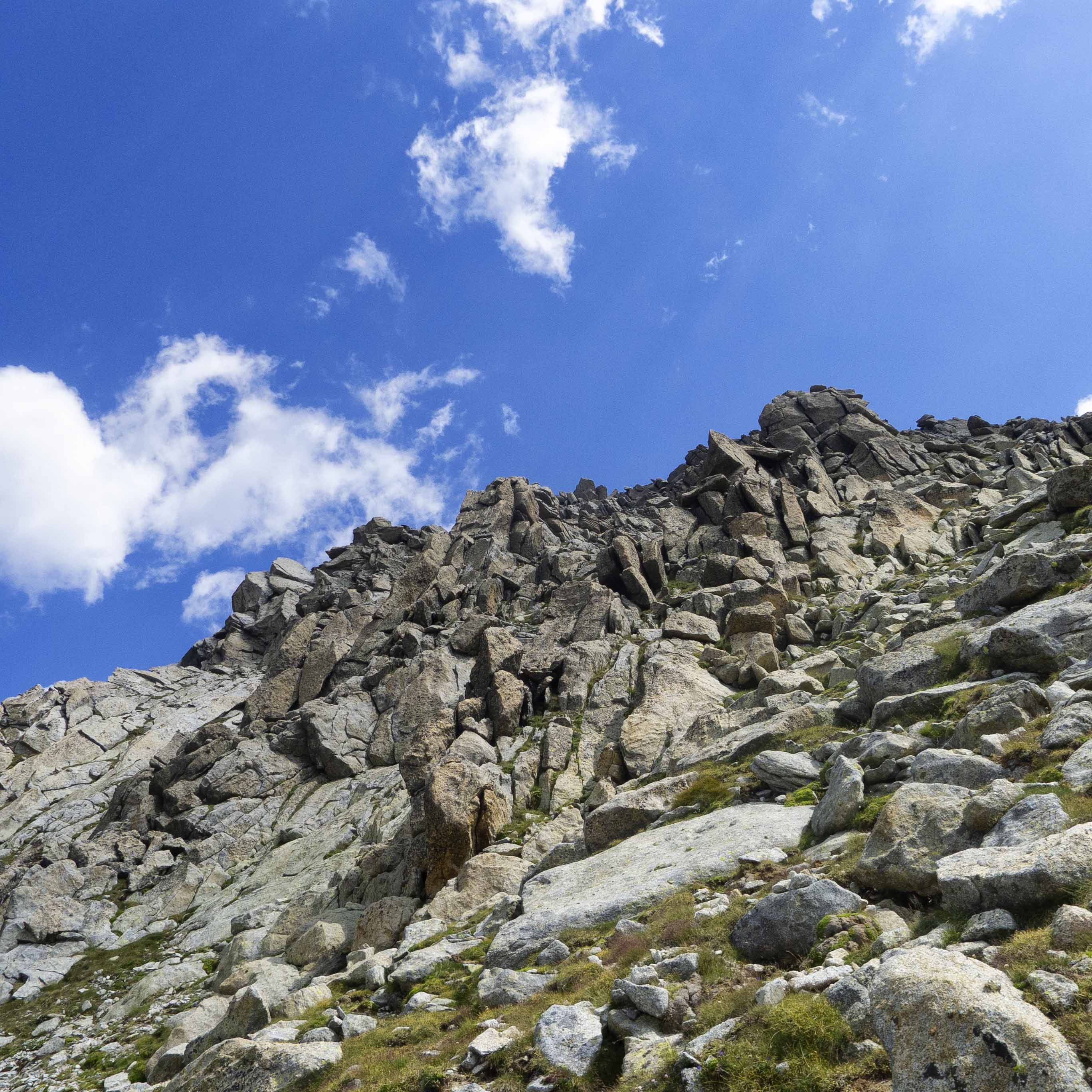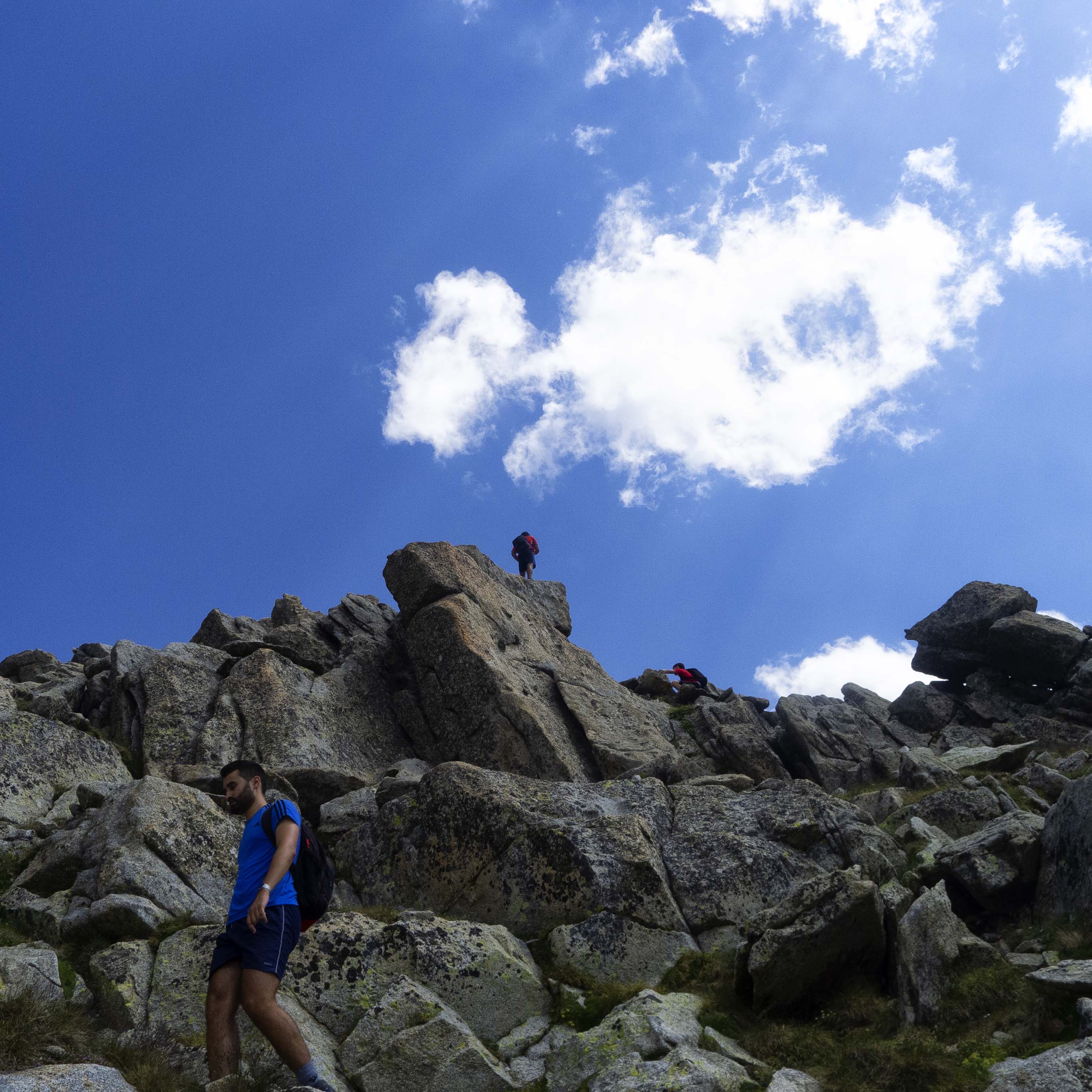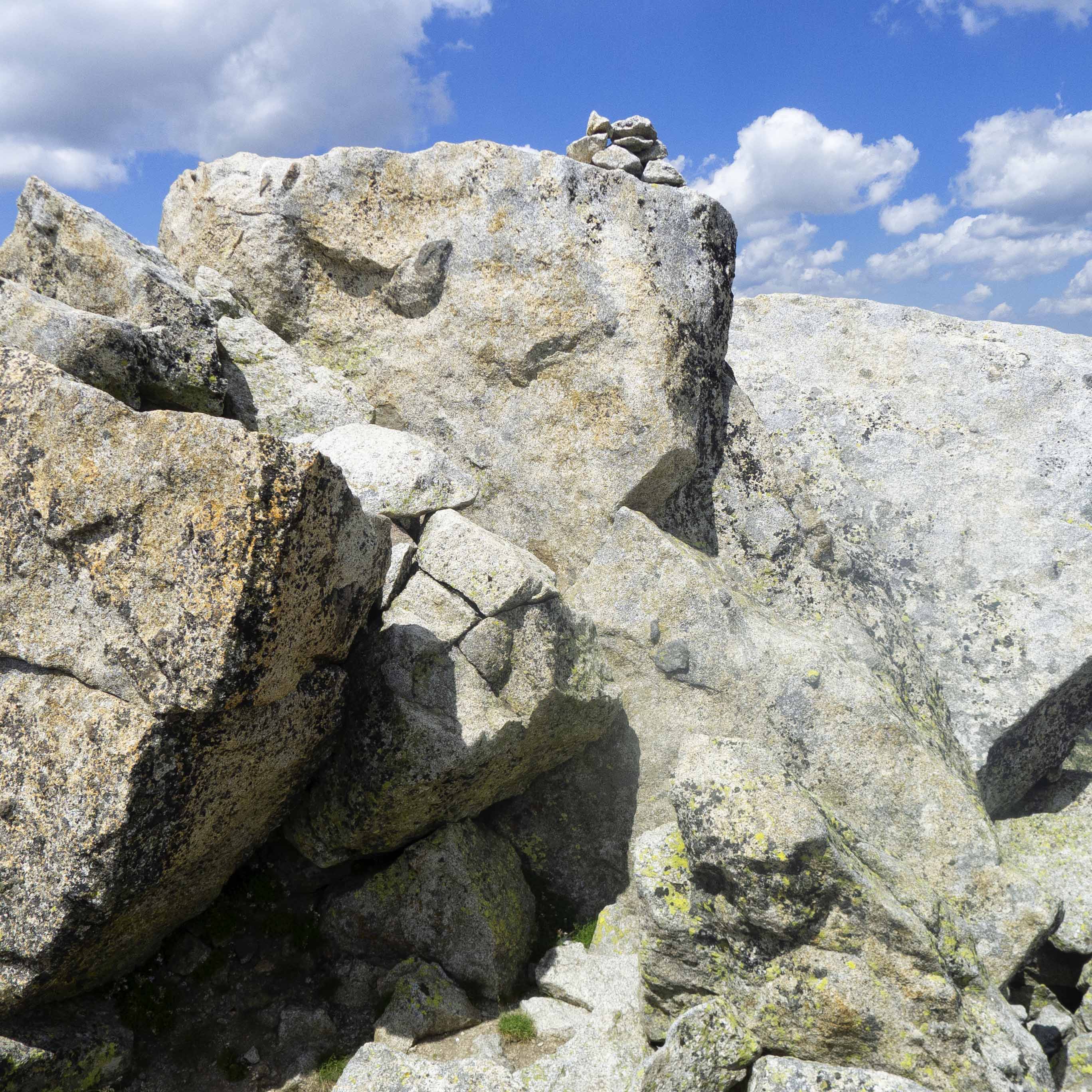 Tras la primera parte de la cresta, llegamos a una sección formada por inmensos bloques graníticos, la mayoría llanos y pulidos, por los que andamos fácilmente hasta que llegamos a la última parte, en la que volvemos a subir algunos metros. Tras rodear una roca parecida a un gran yunque, vemos la cima al fondo, protegida por un muro tras el cual hay una brecha.