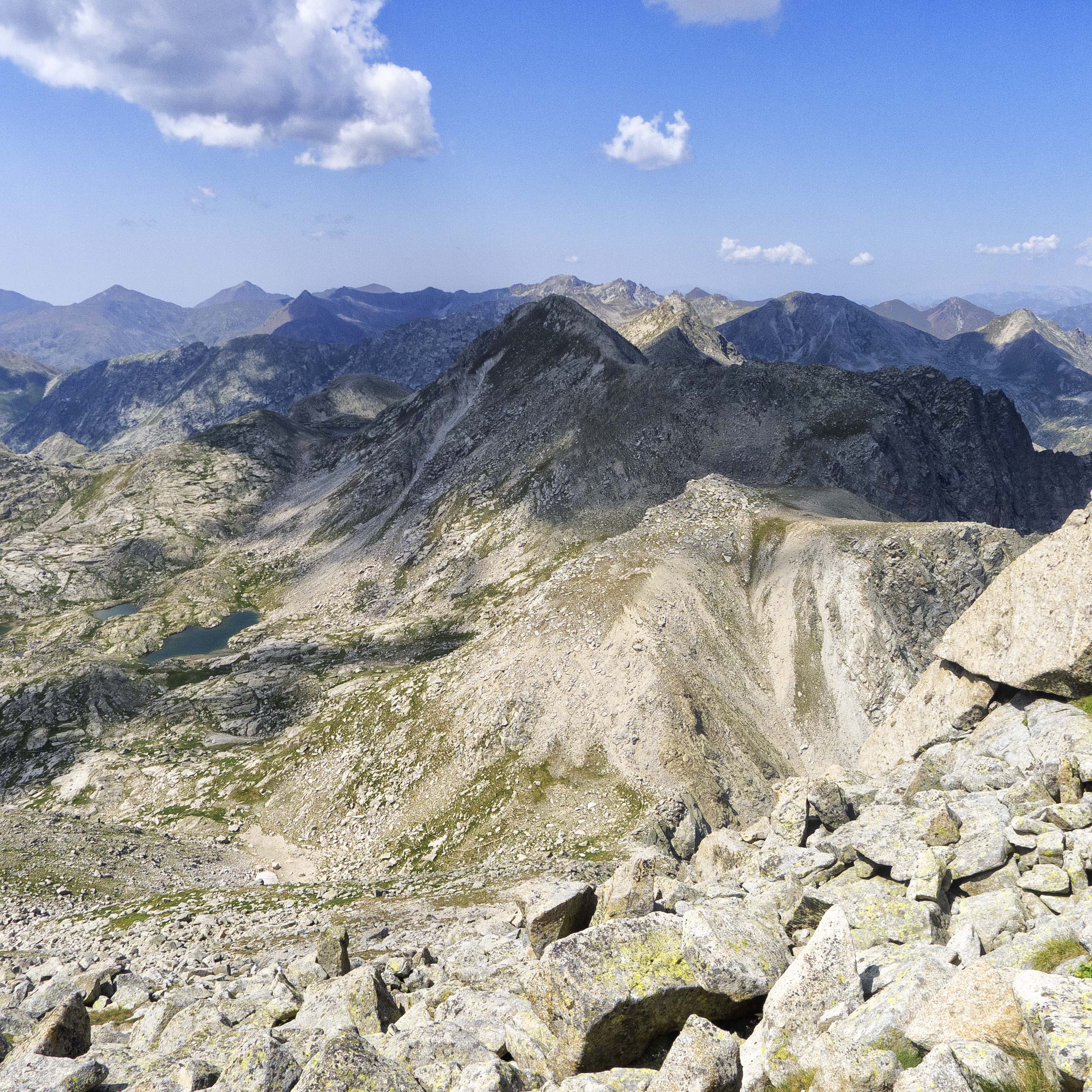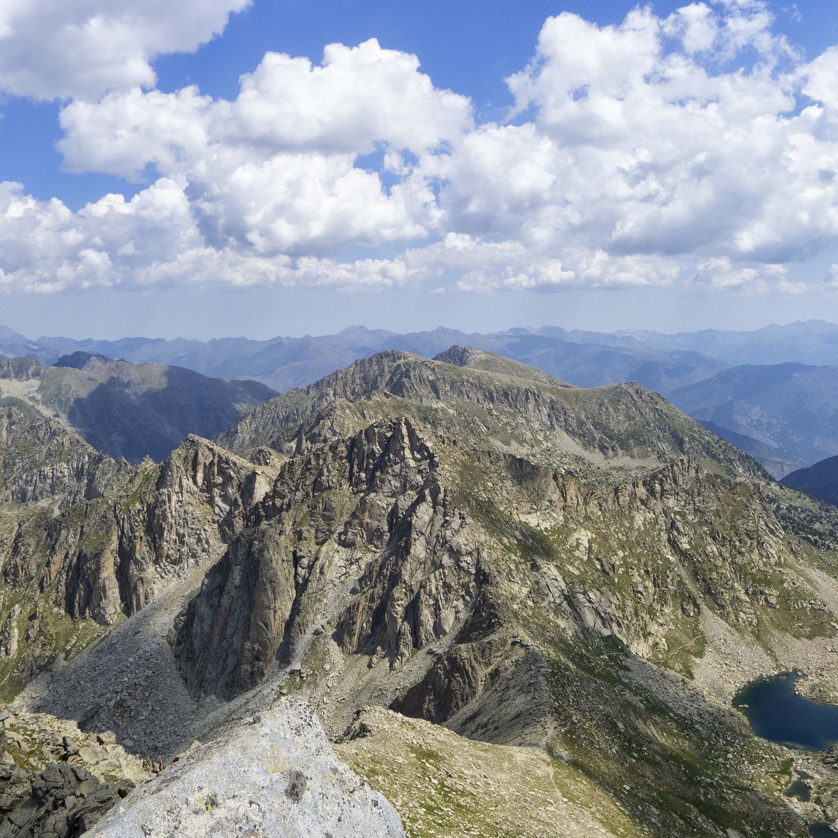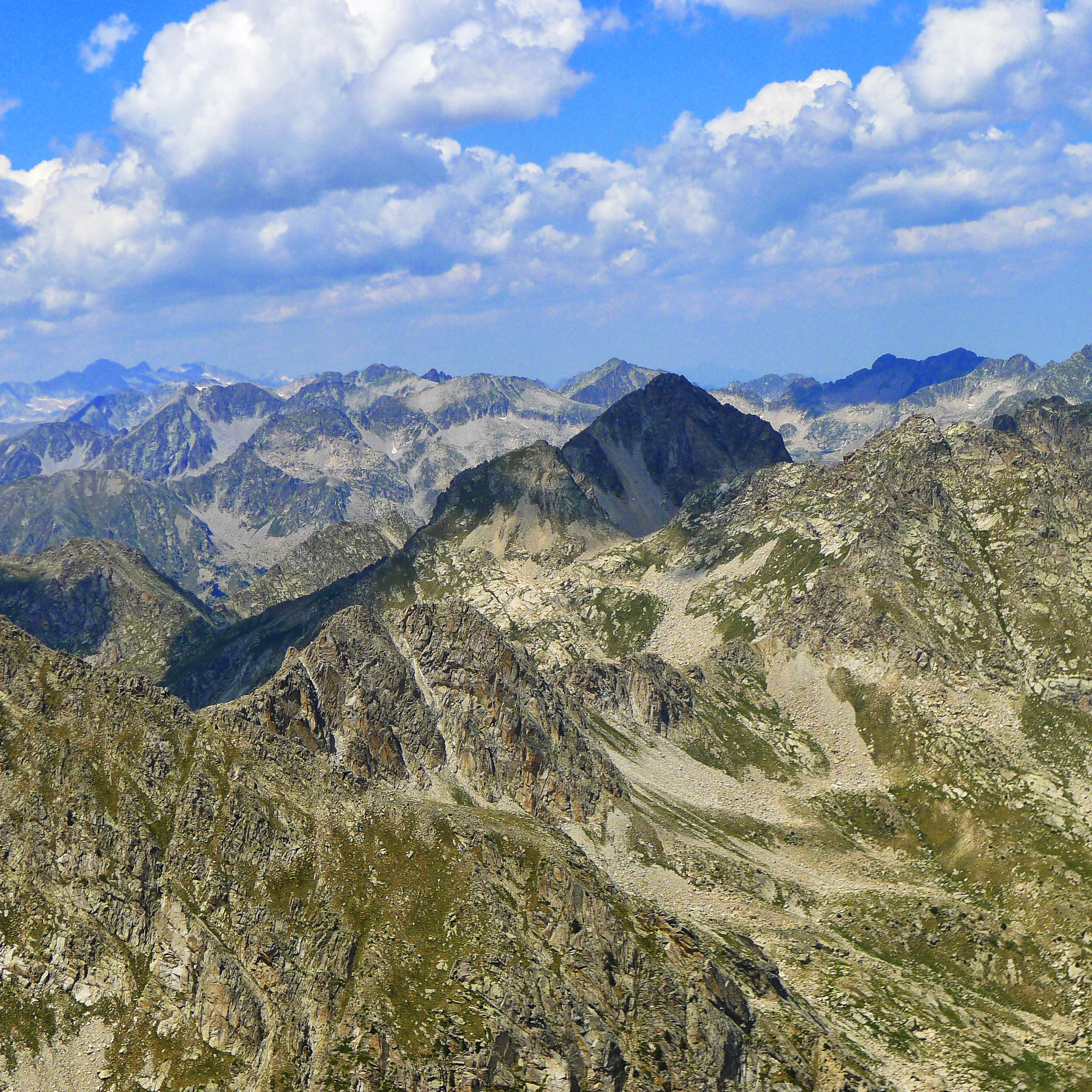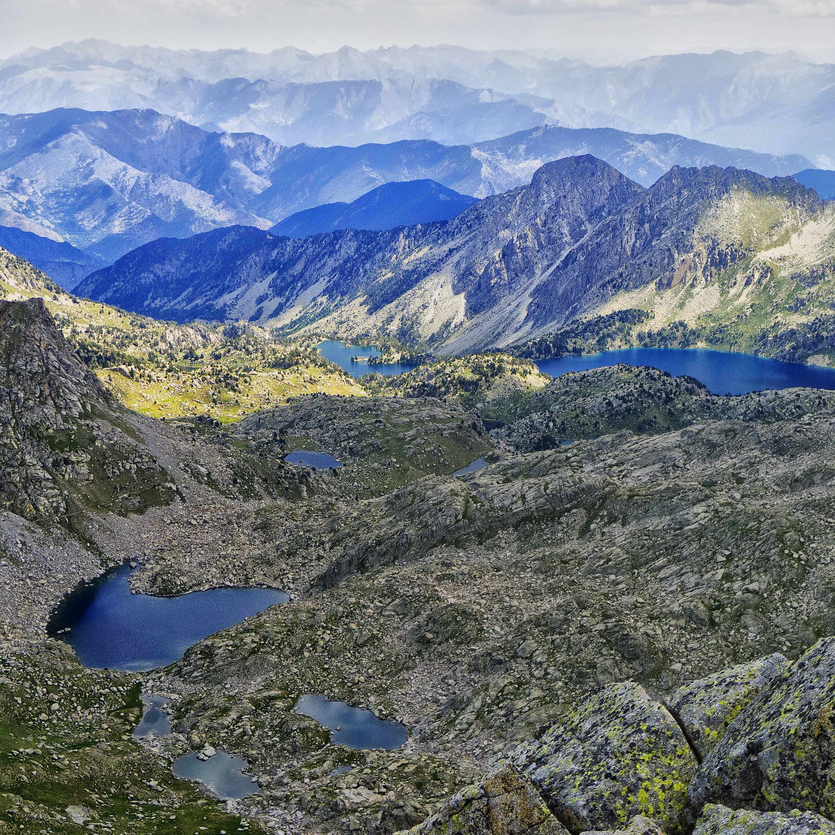 Hacia el oeste, las infinitas montañas de Aigüestortes, con el sombrío Subenuix, otra de las grandes, en una posición central, escoltado por la derecha por la Creu de Colomers, también en sombra, y por la izquierda por la Punta Alta y los Besiberris, con las Maladetas en el horizonte.