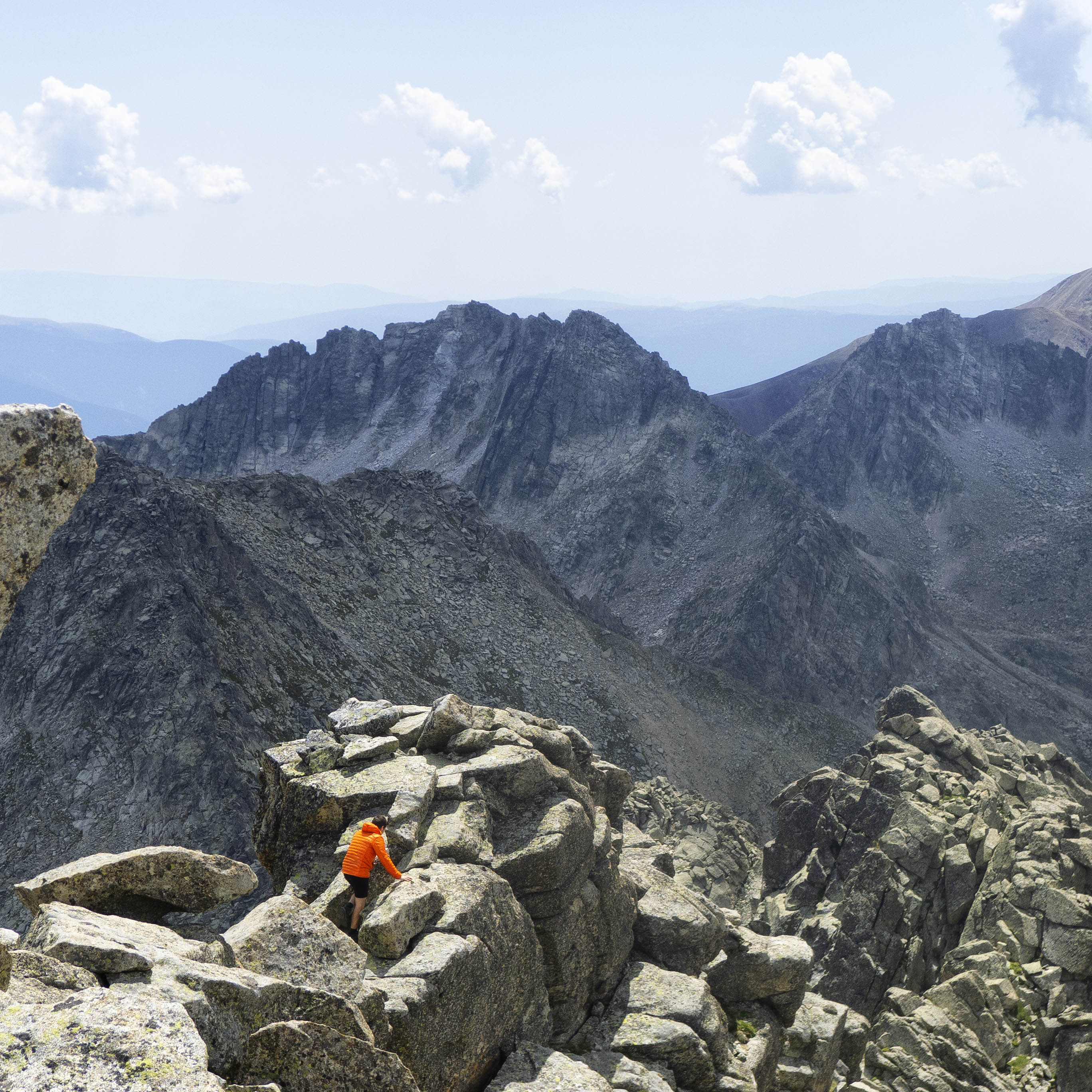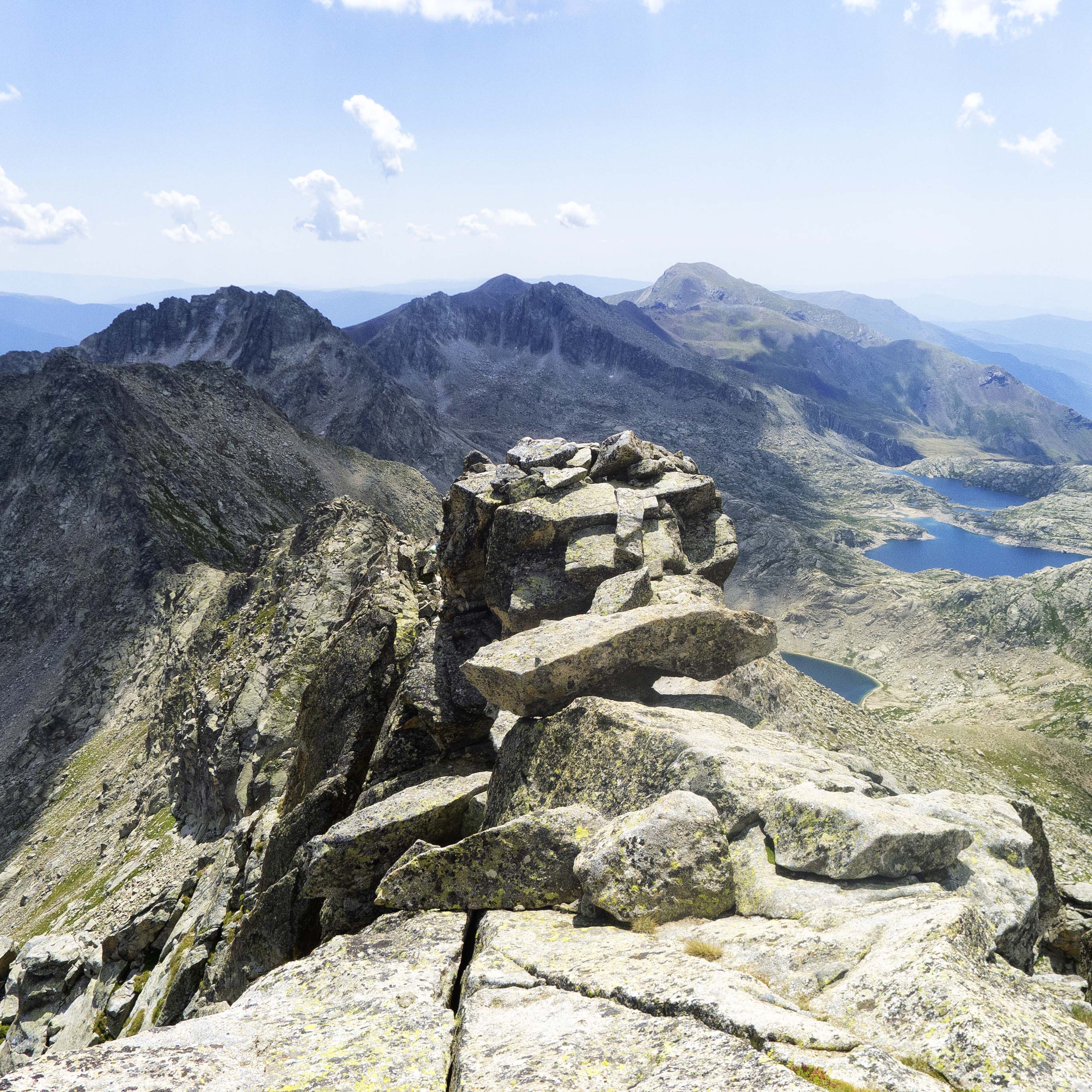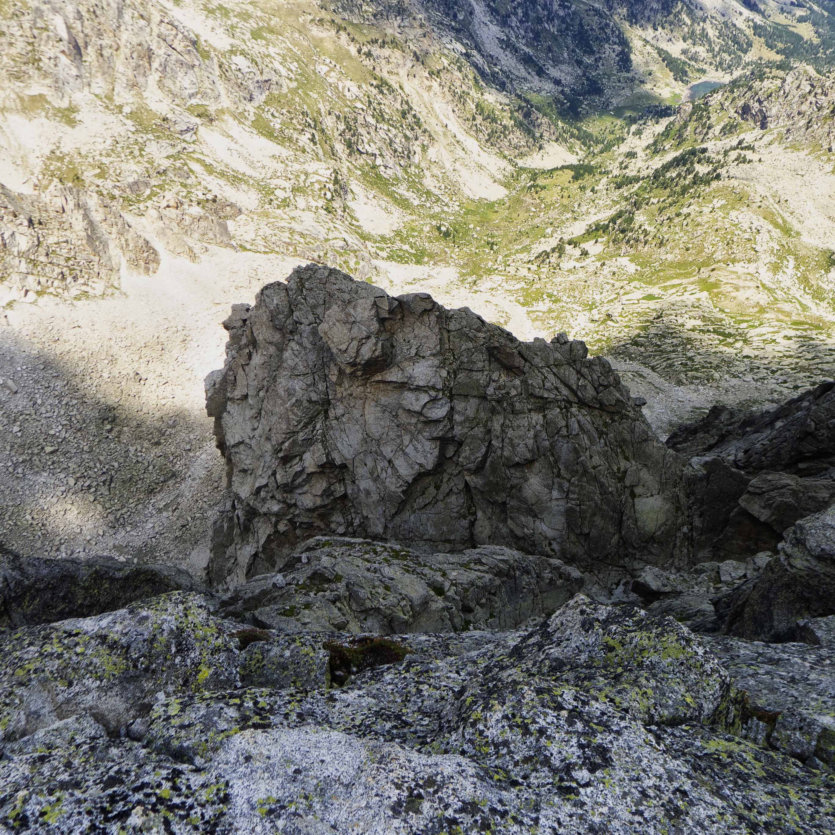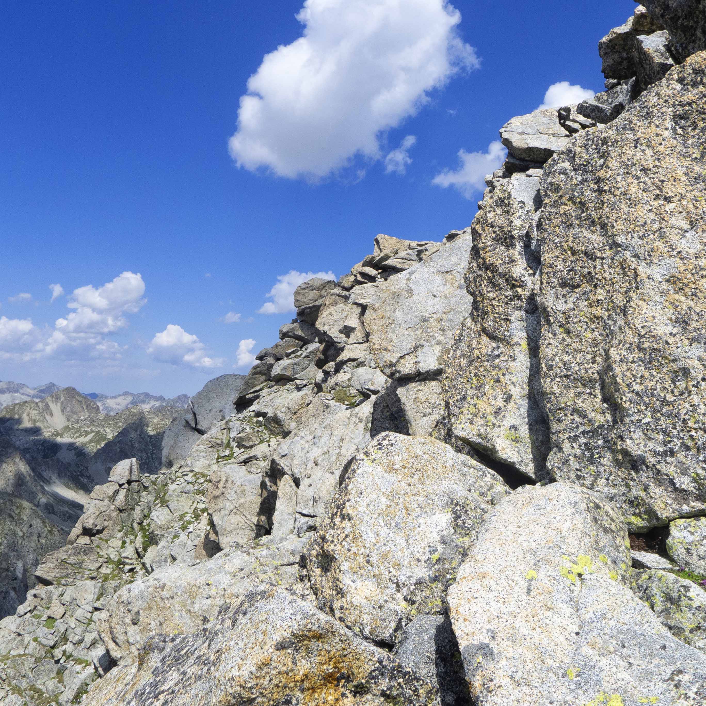 La tónica de la mayoría de la cresta son grandes bloques, la mayoría lisos, algunos llanos y otros inclinados, que se inclinan sobre el vacío que nos rodea, por lo que tenemos que tener cuidado.