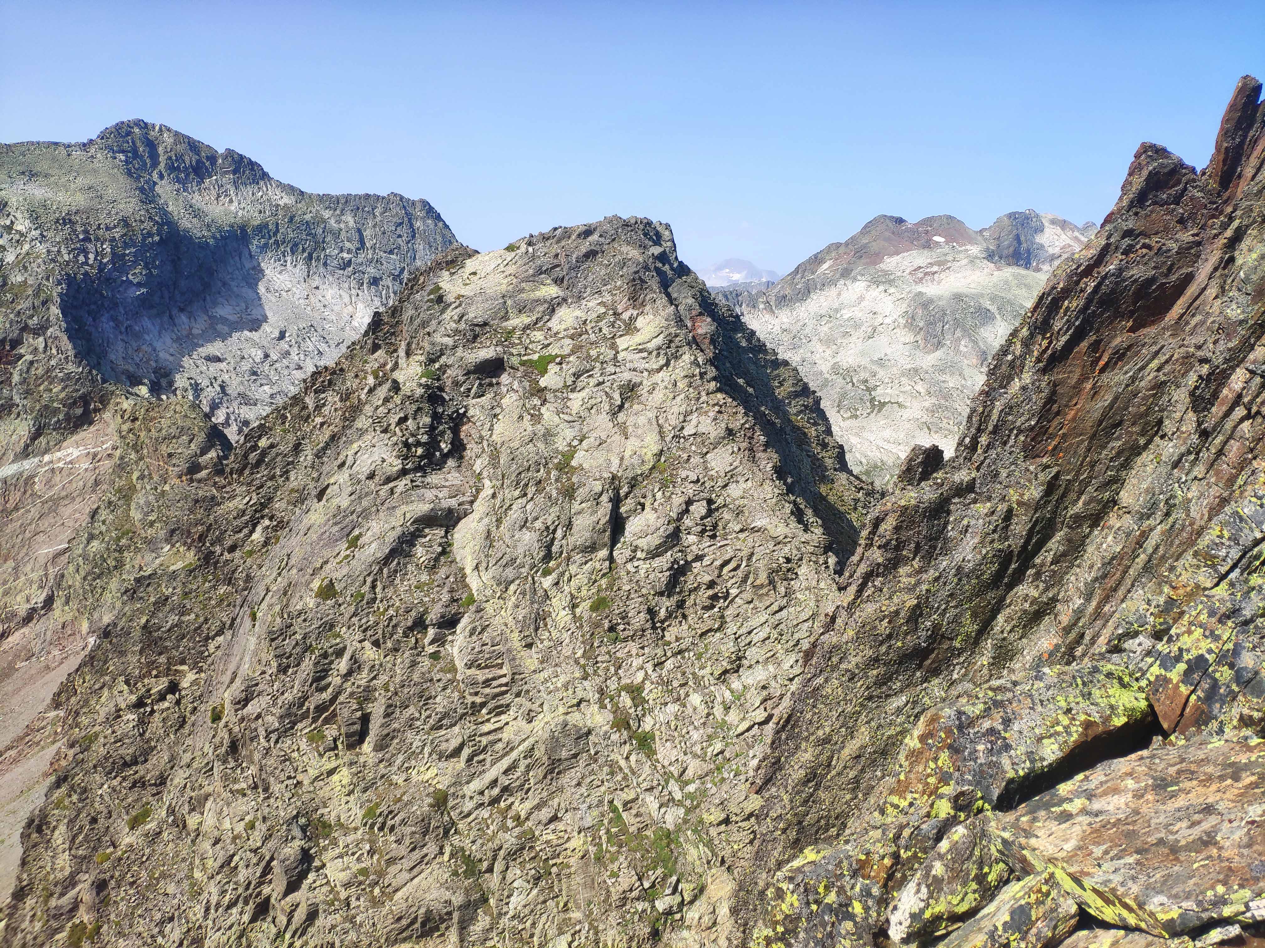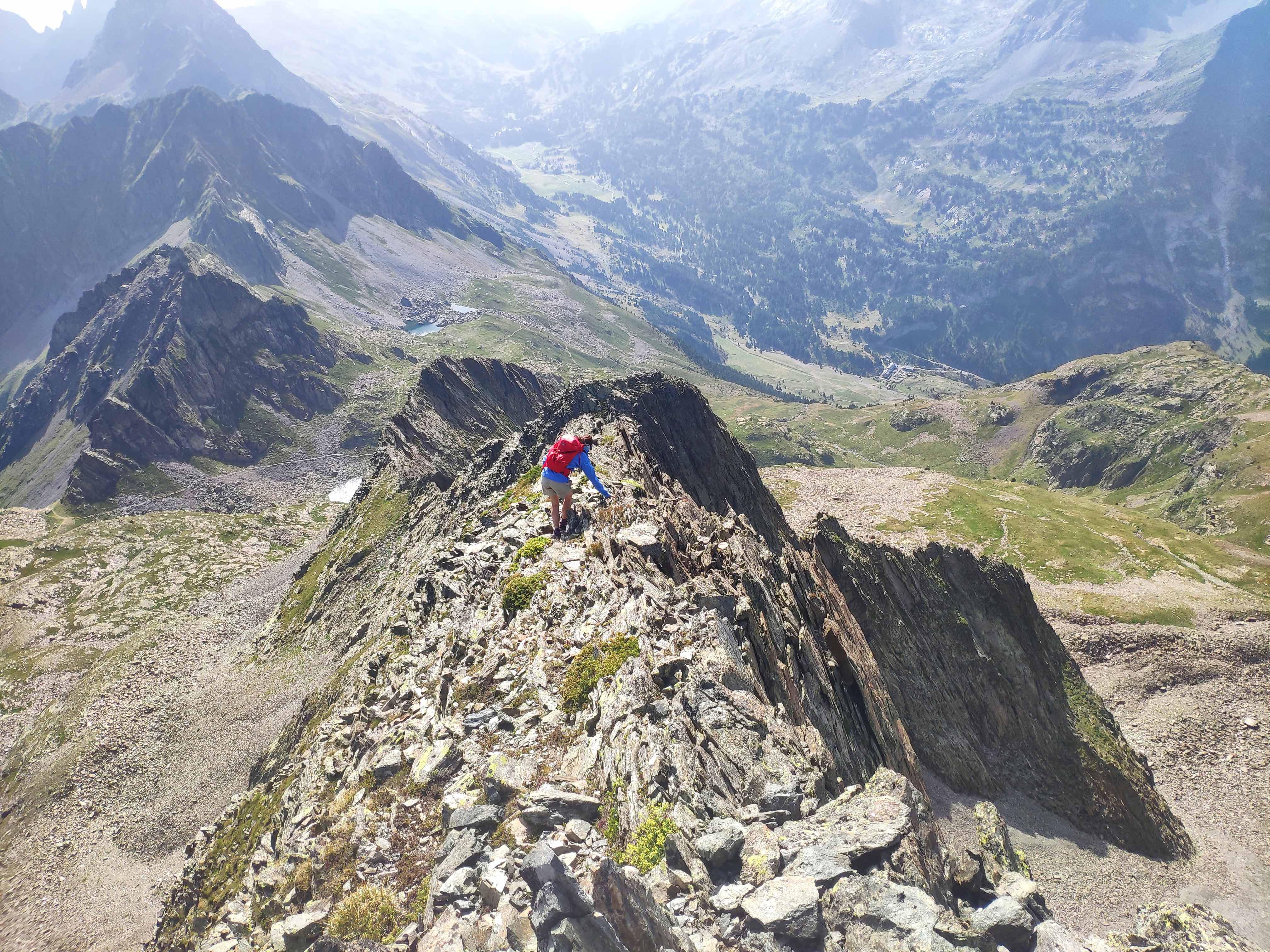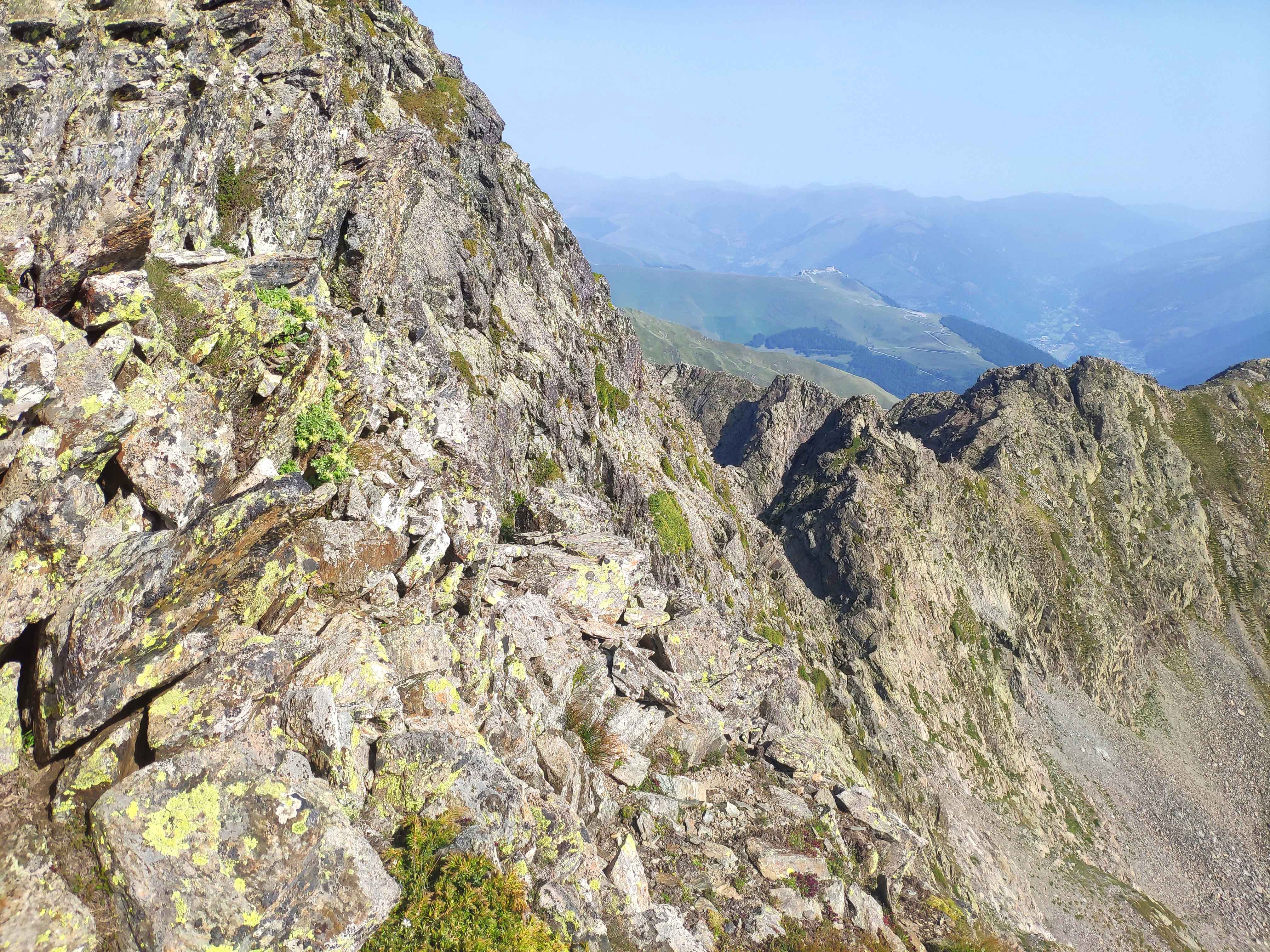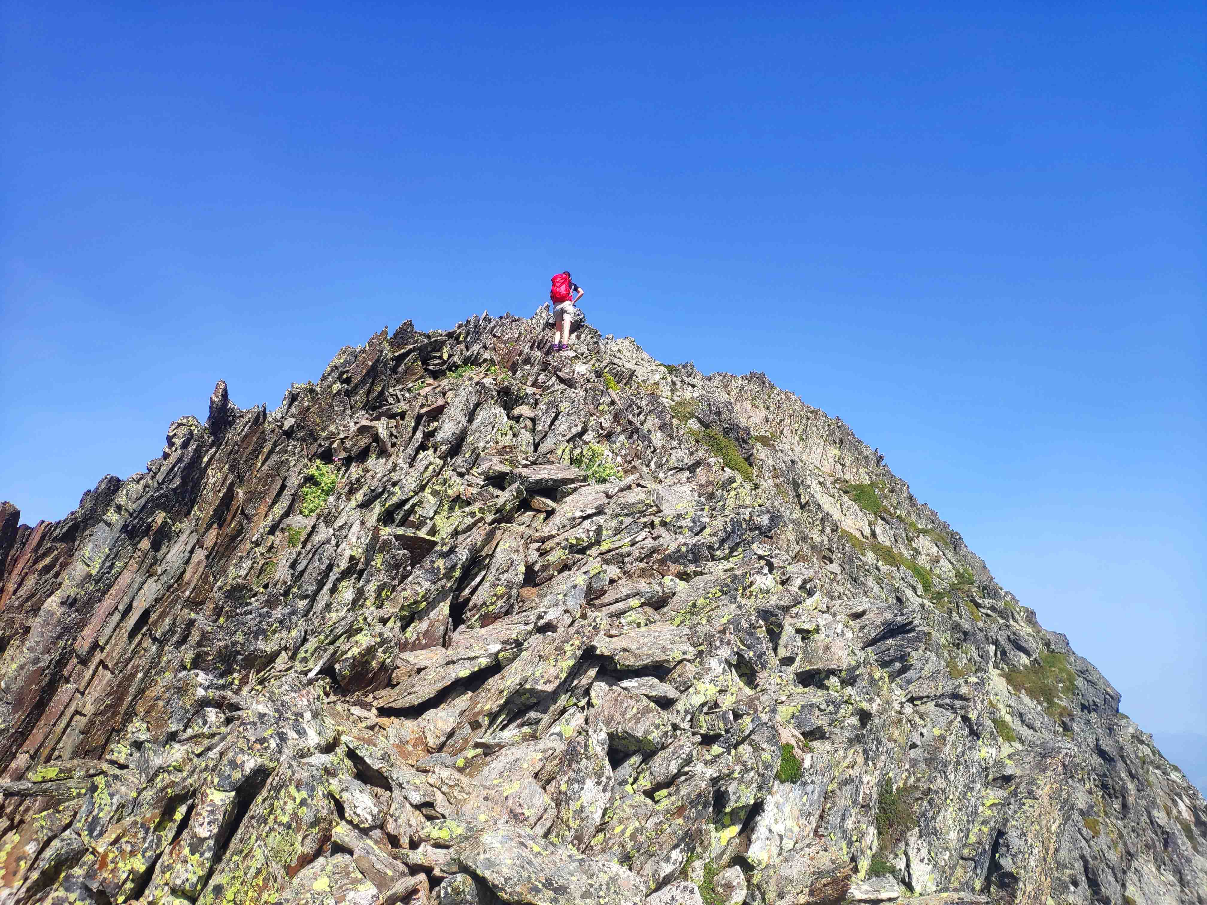 Llegamos por fin a la cresta, repleta de afilada roca metamórfica pero que no tiene dificultad alguna, más allá del notable patio que hay en ambos lados.