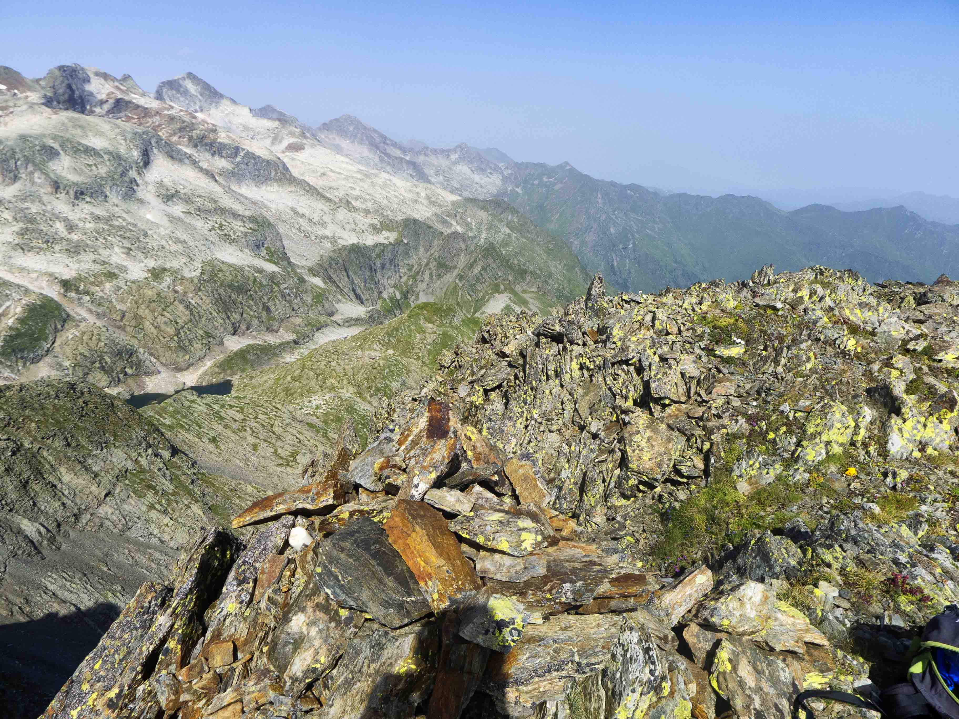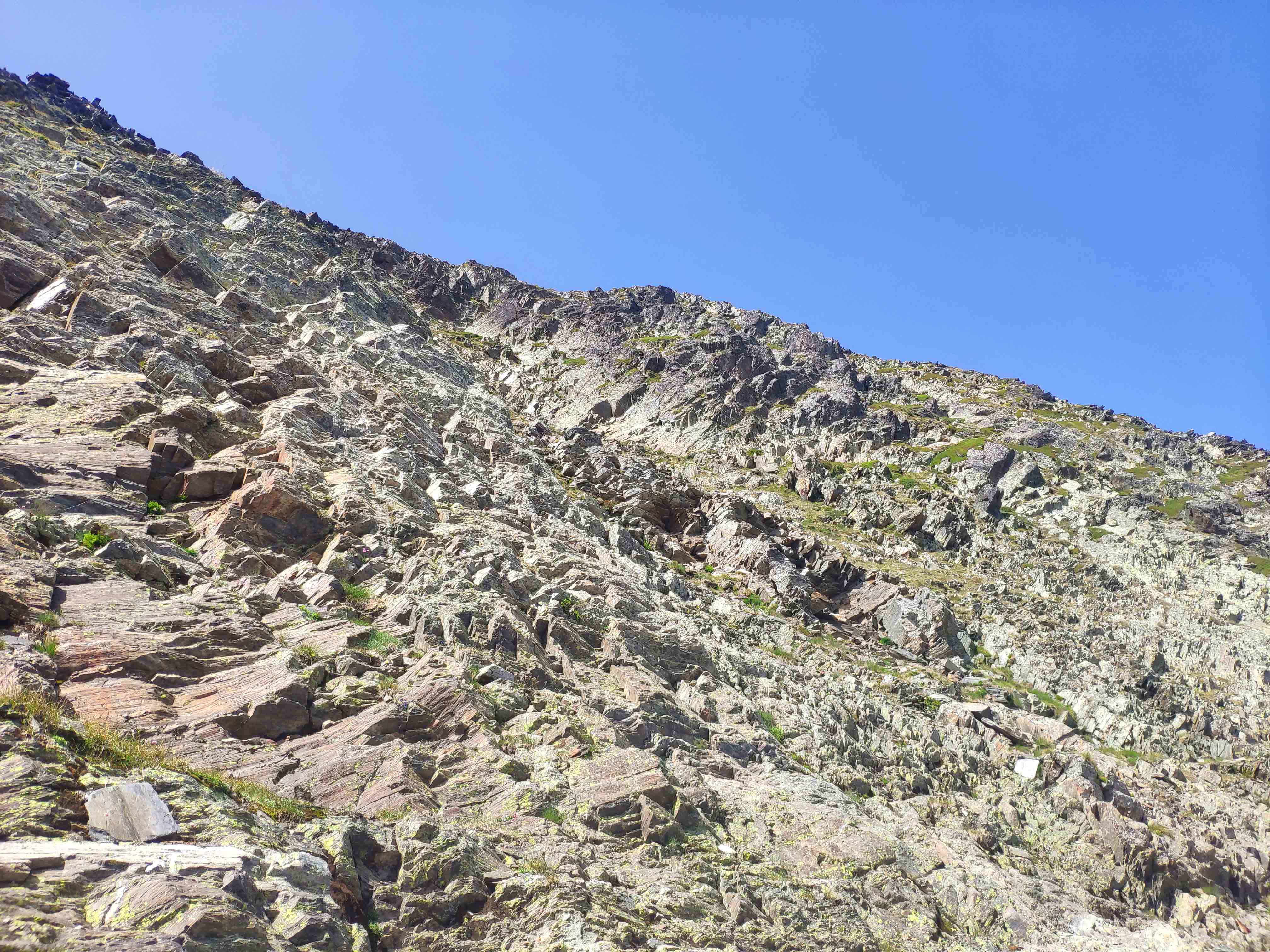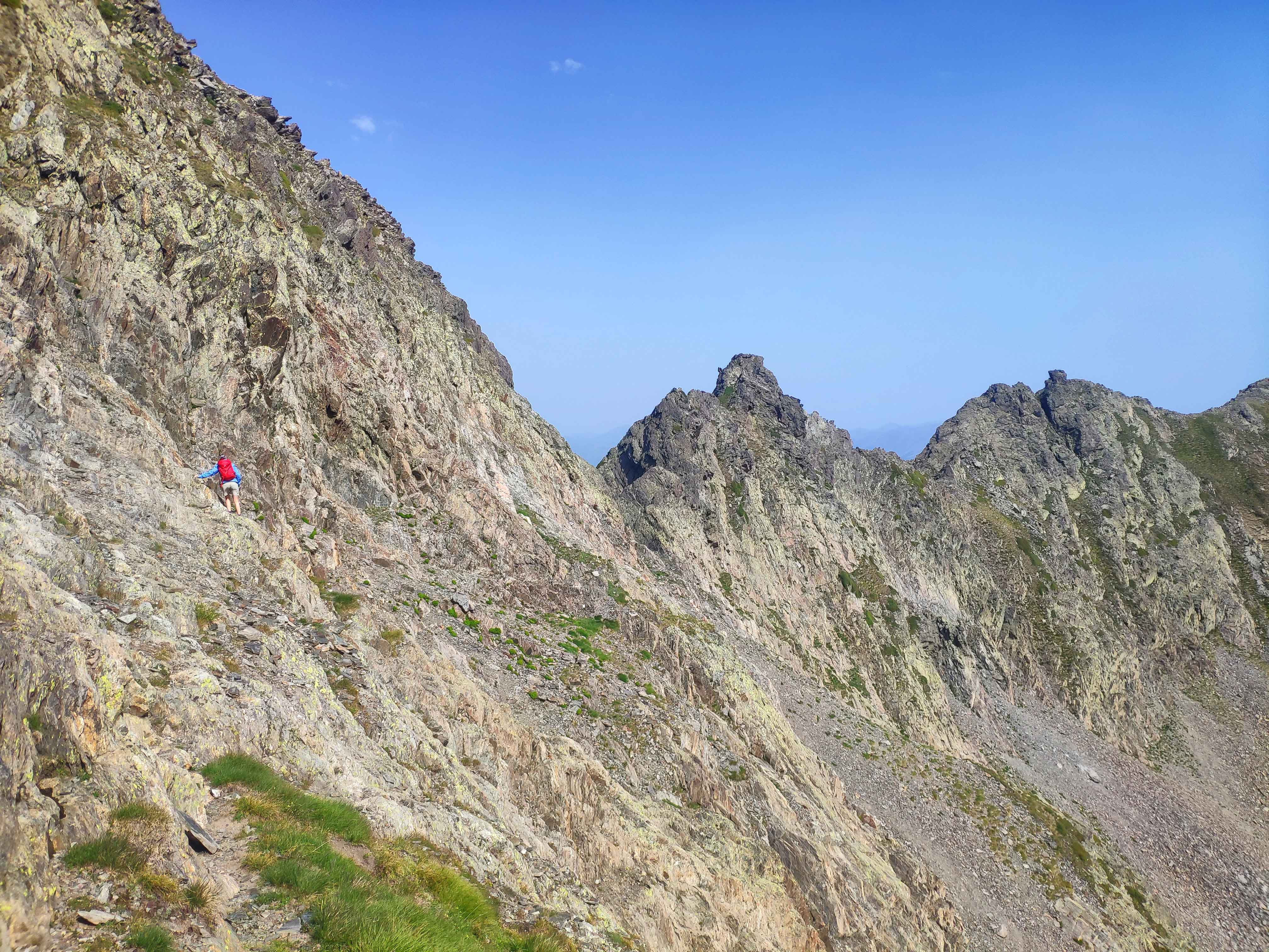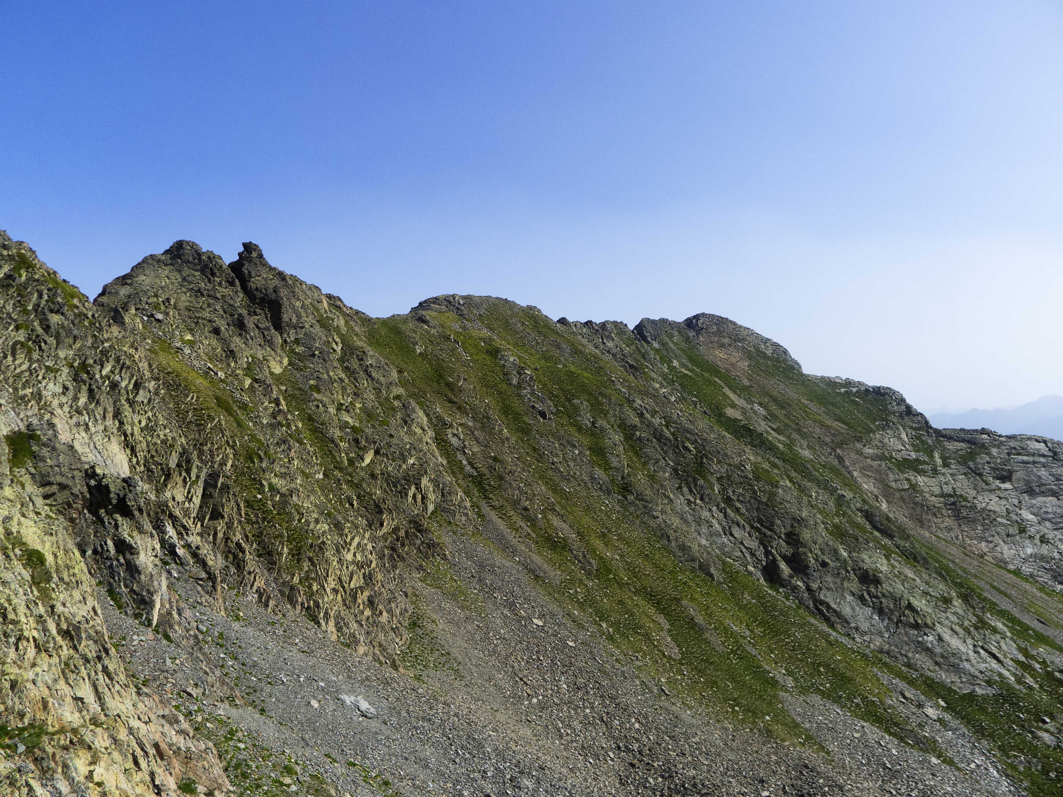 Llegamos por fin a la cresta, repleta de afilada roca metamórfica pero que no tiene dificultad alguna, más allá del notable patio que hay en ambos lados.
