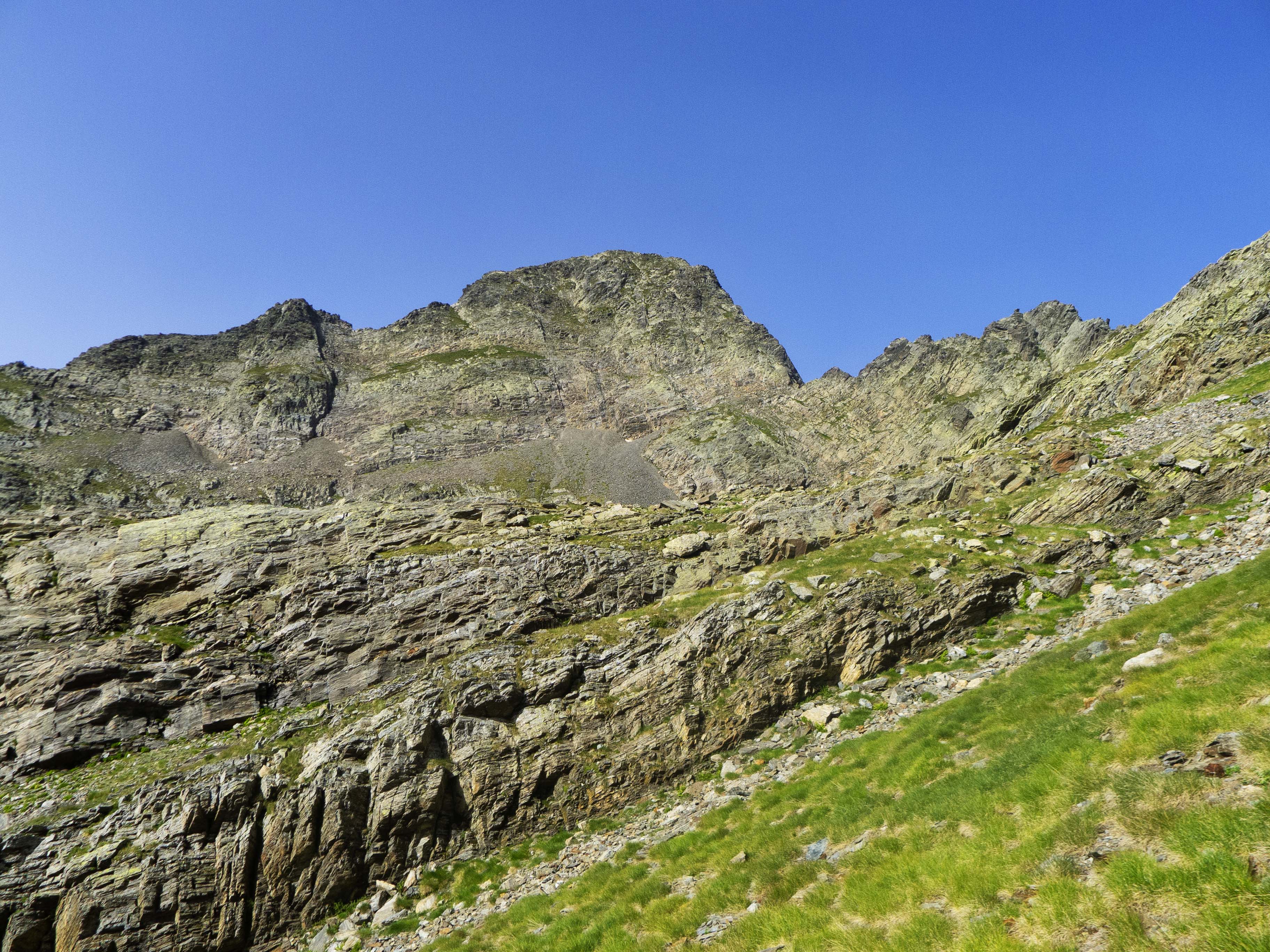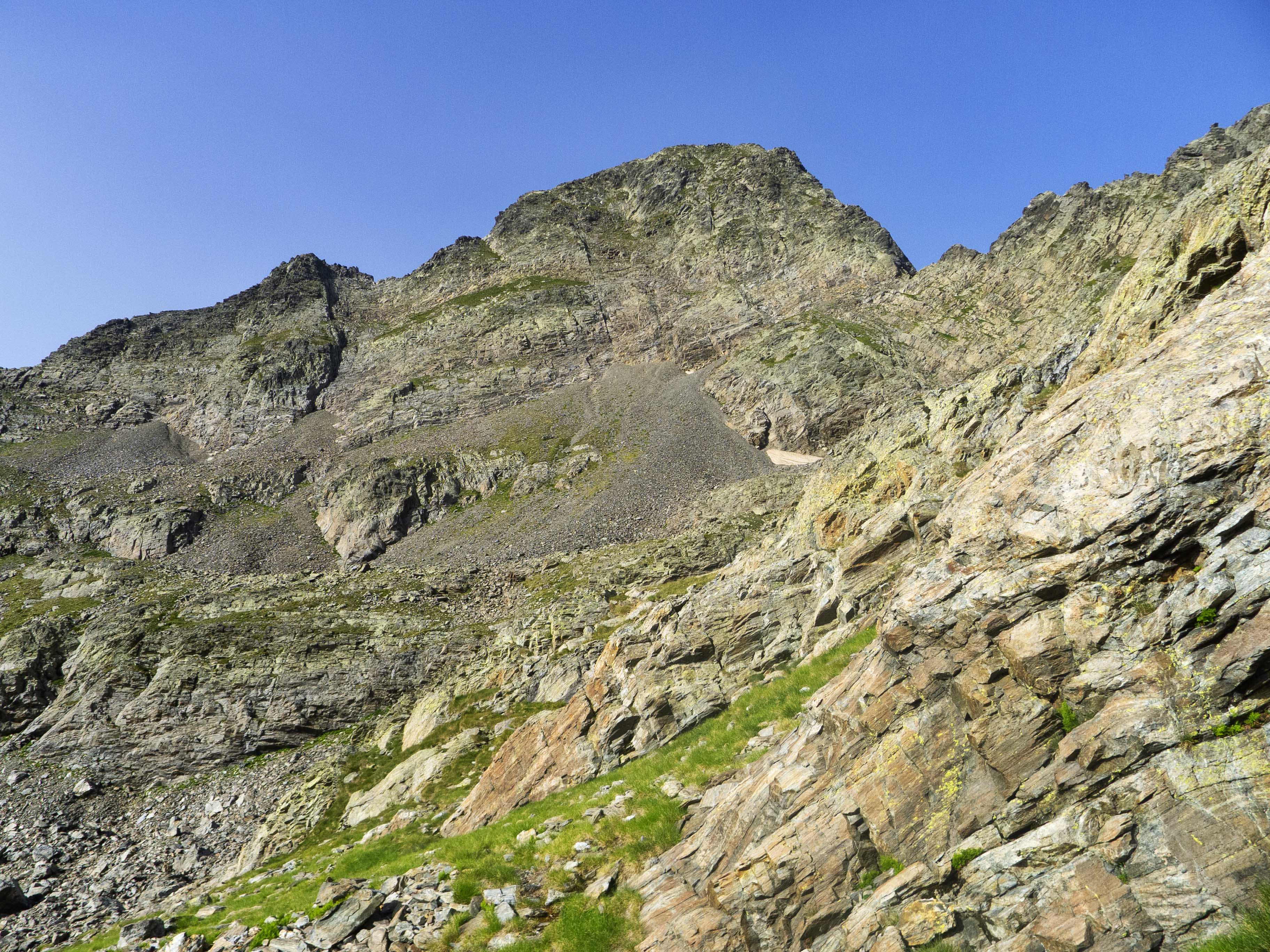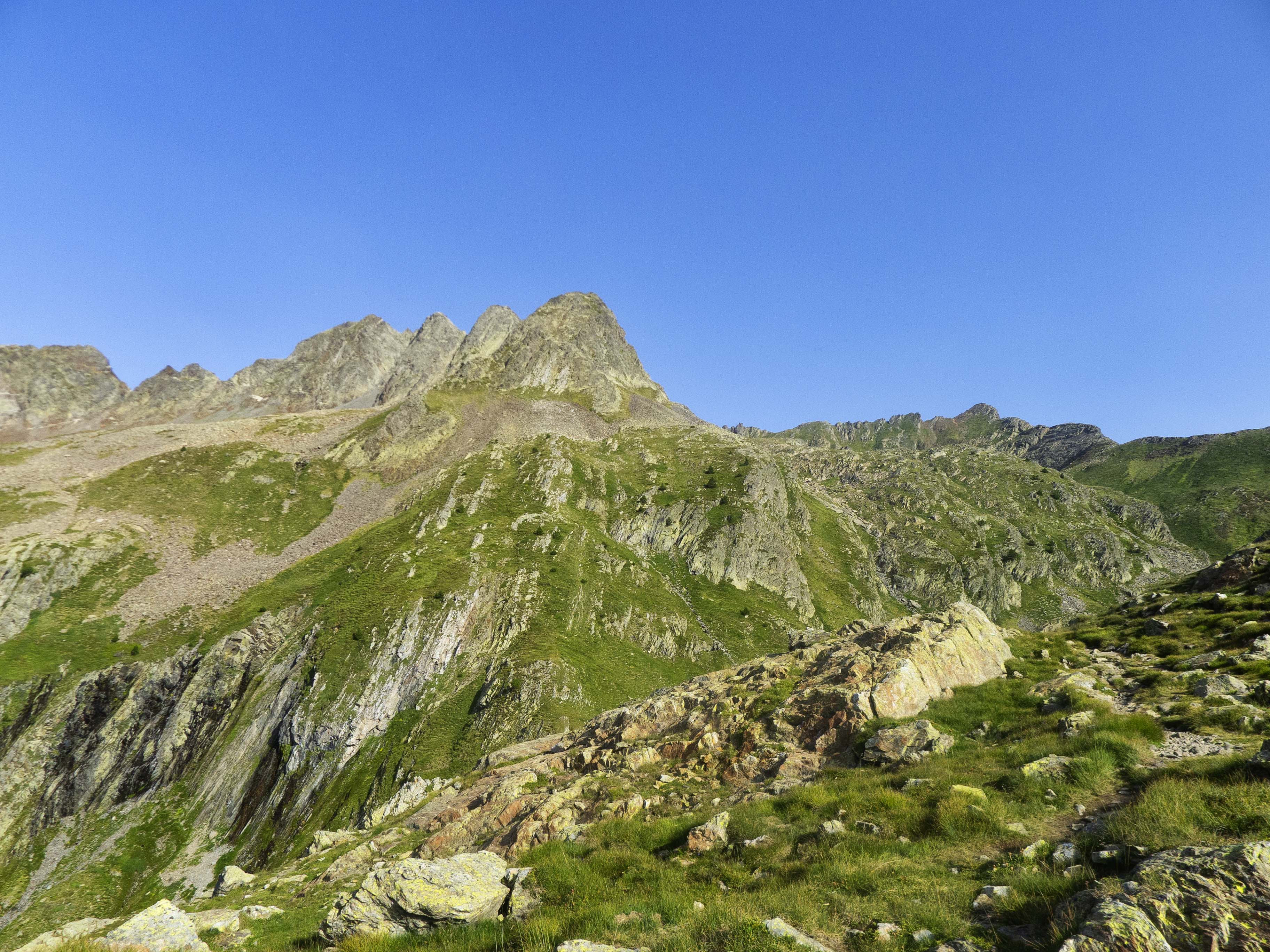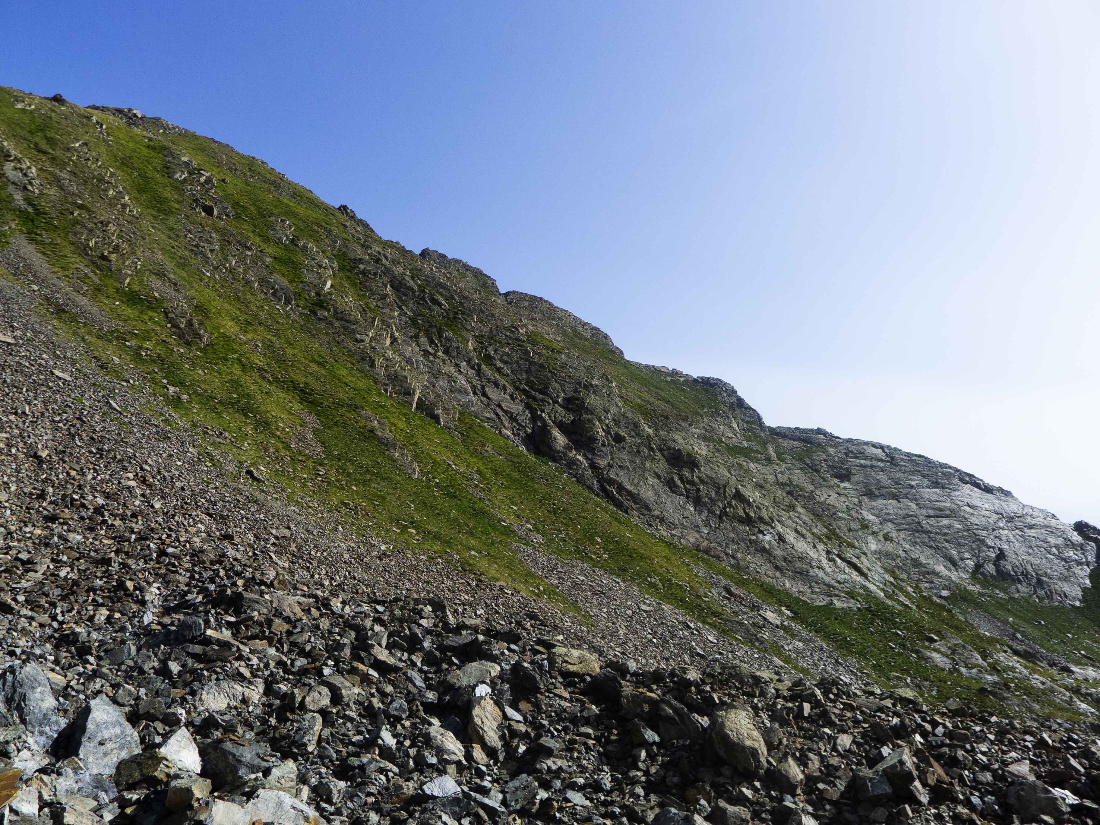 Este cóncavo tiene tramos con algo de hierba y otros de más rocosos. Varios tubos van esquivando espolones que caen de la cresta, que vemos arriba de todo y a donde debemos llegar. Sin embargo, no la atacaremos de frente, sino que la ganaremos yendo hacia la izquierda, donde su acceso es más sencillo. Desde la cresta, la cima está a pocos minutos.