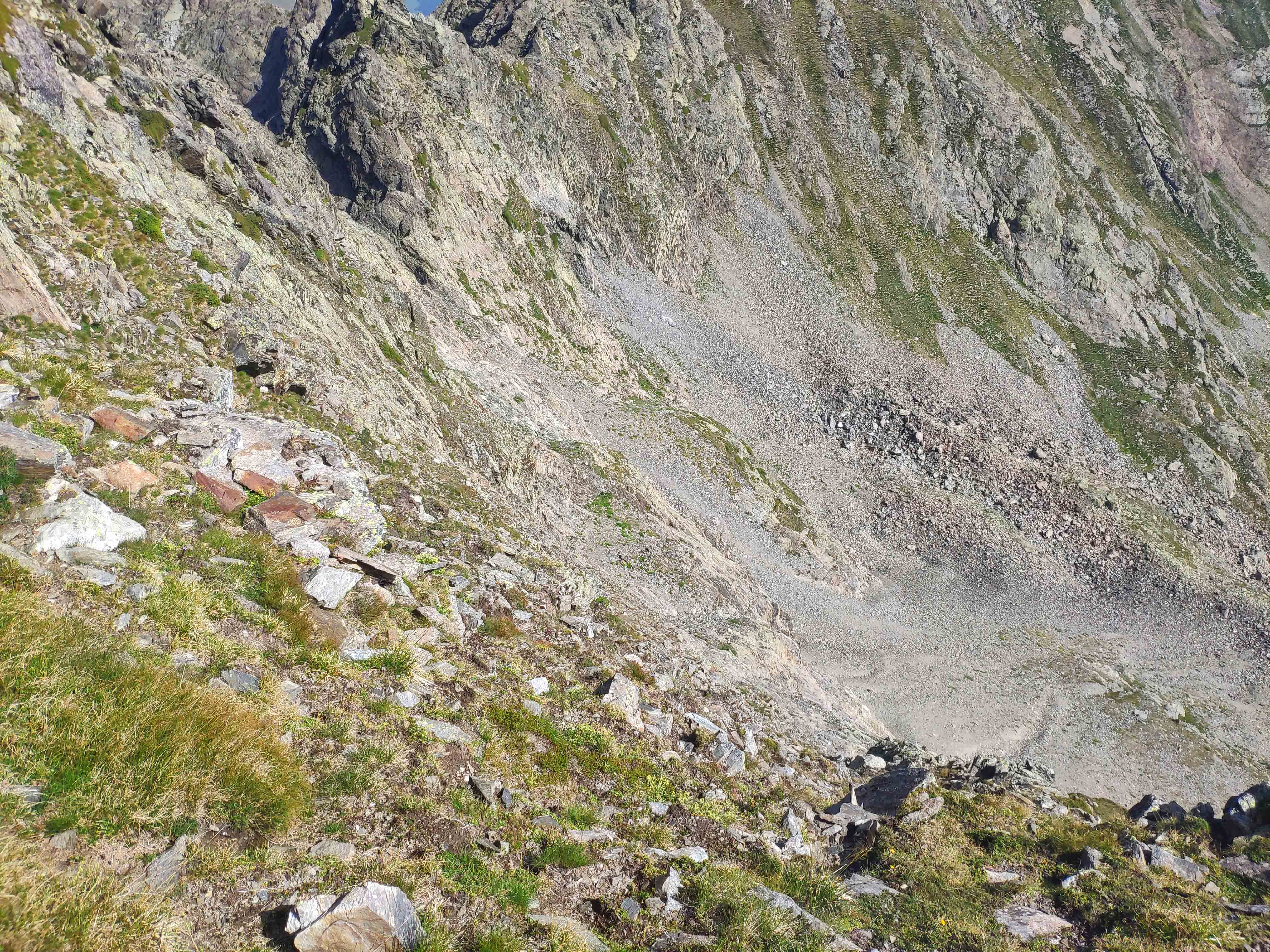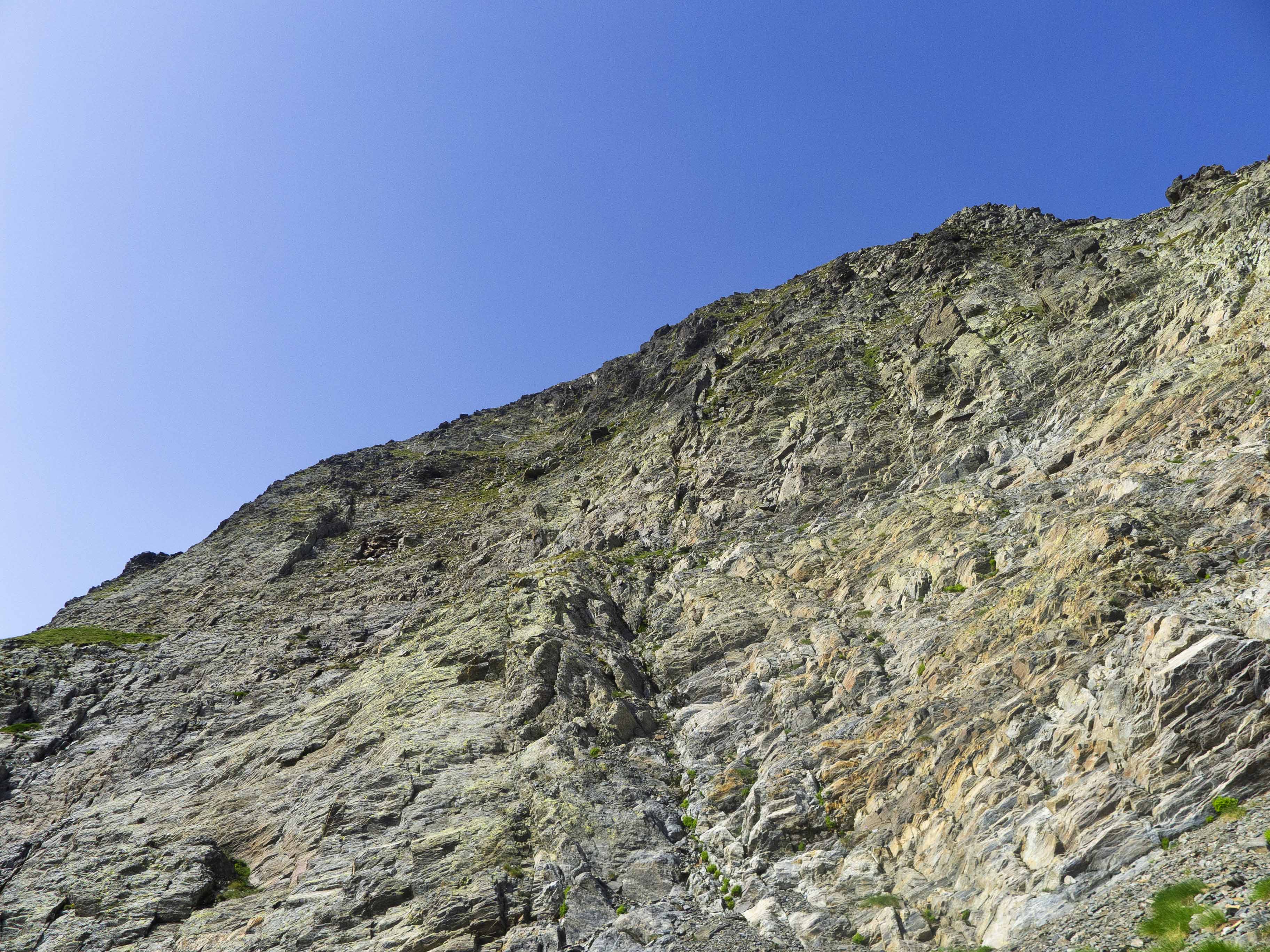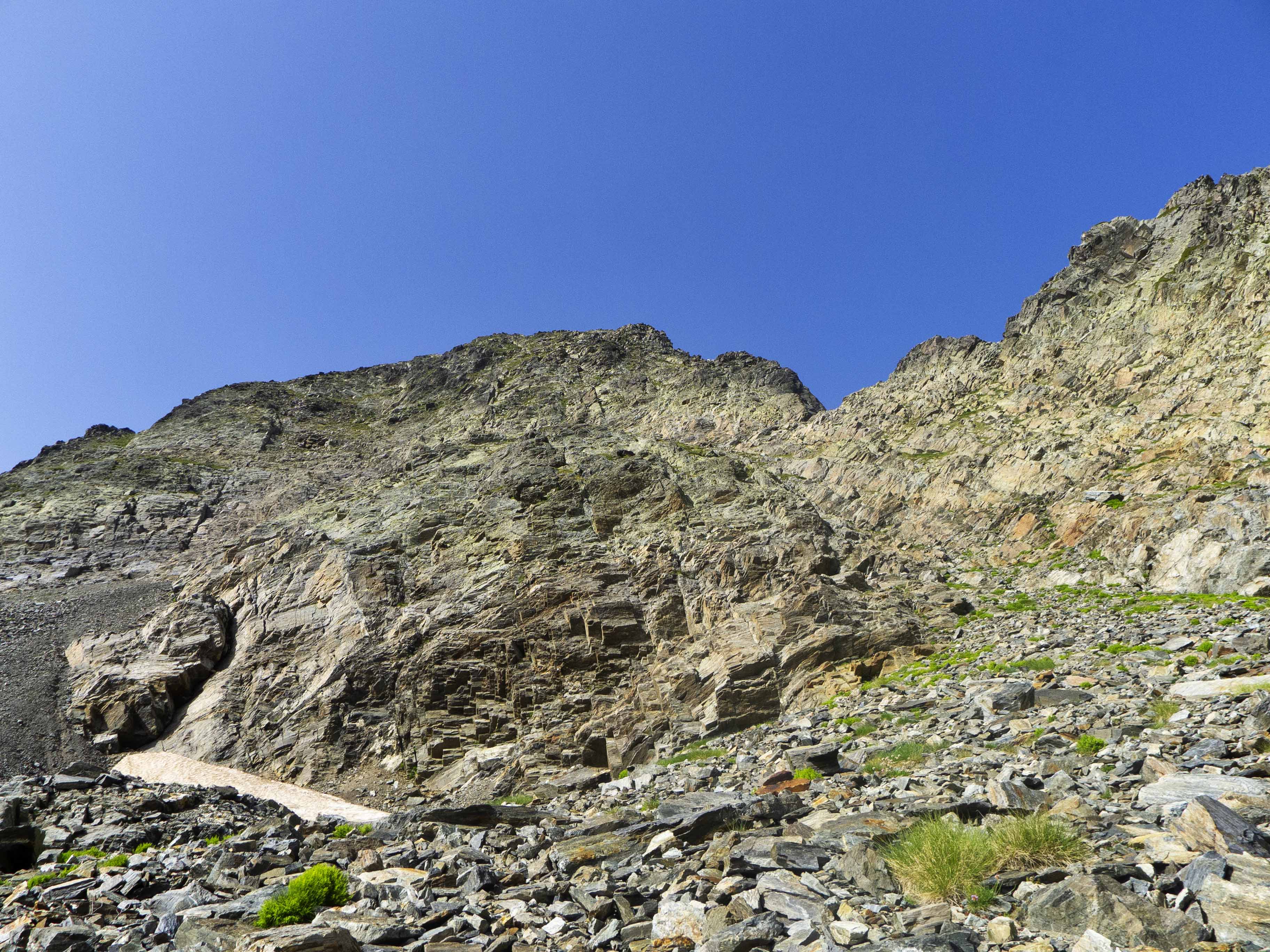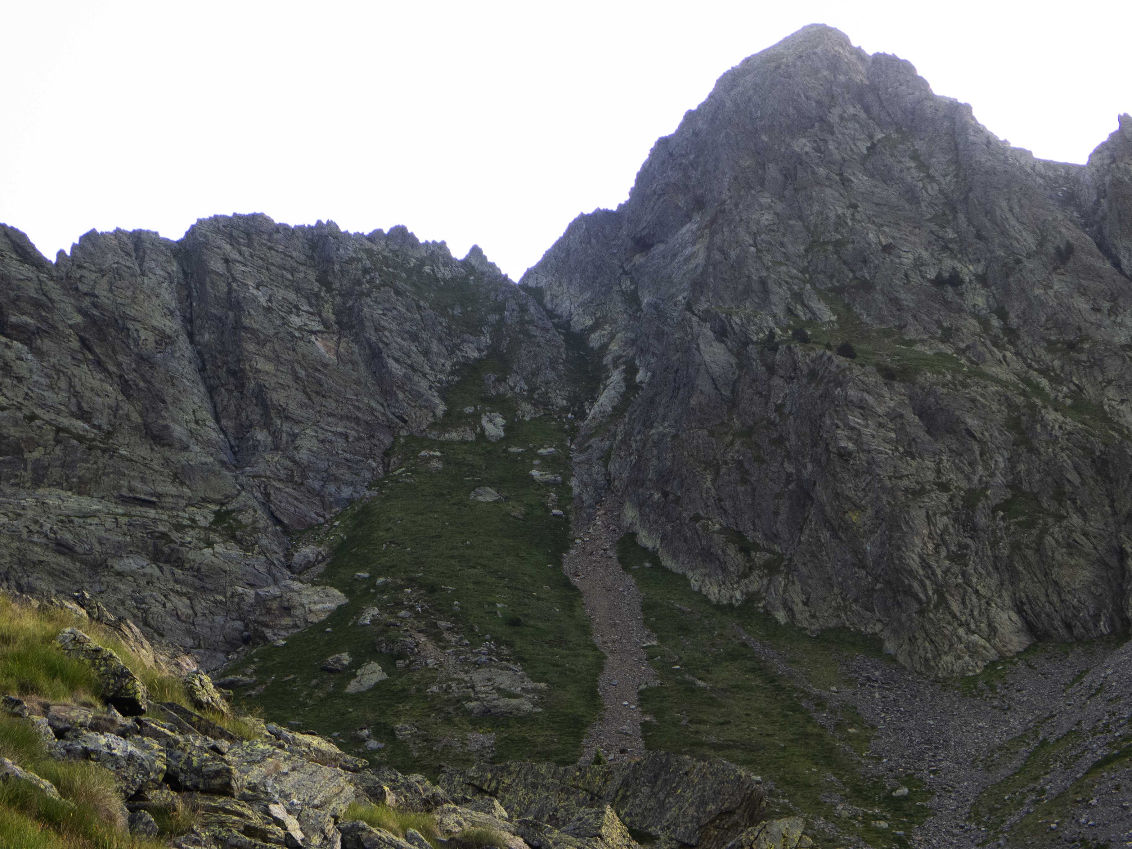 Este cóncavo tiene tramos con algo de hierba y otros de más rocosos. Varios tubos van esquivando espolones que caen de la cresta, que vemos arriba de todo y a donde debemos llegar. Sin embargo, no la atacaremos de frente, sino que la ganaremos yendo hacia la izquierda, donde su acceso es más sencillo. Desde la cresta, la cima está a pocos minutos.