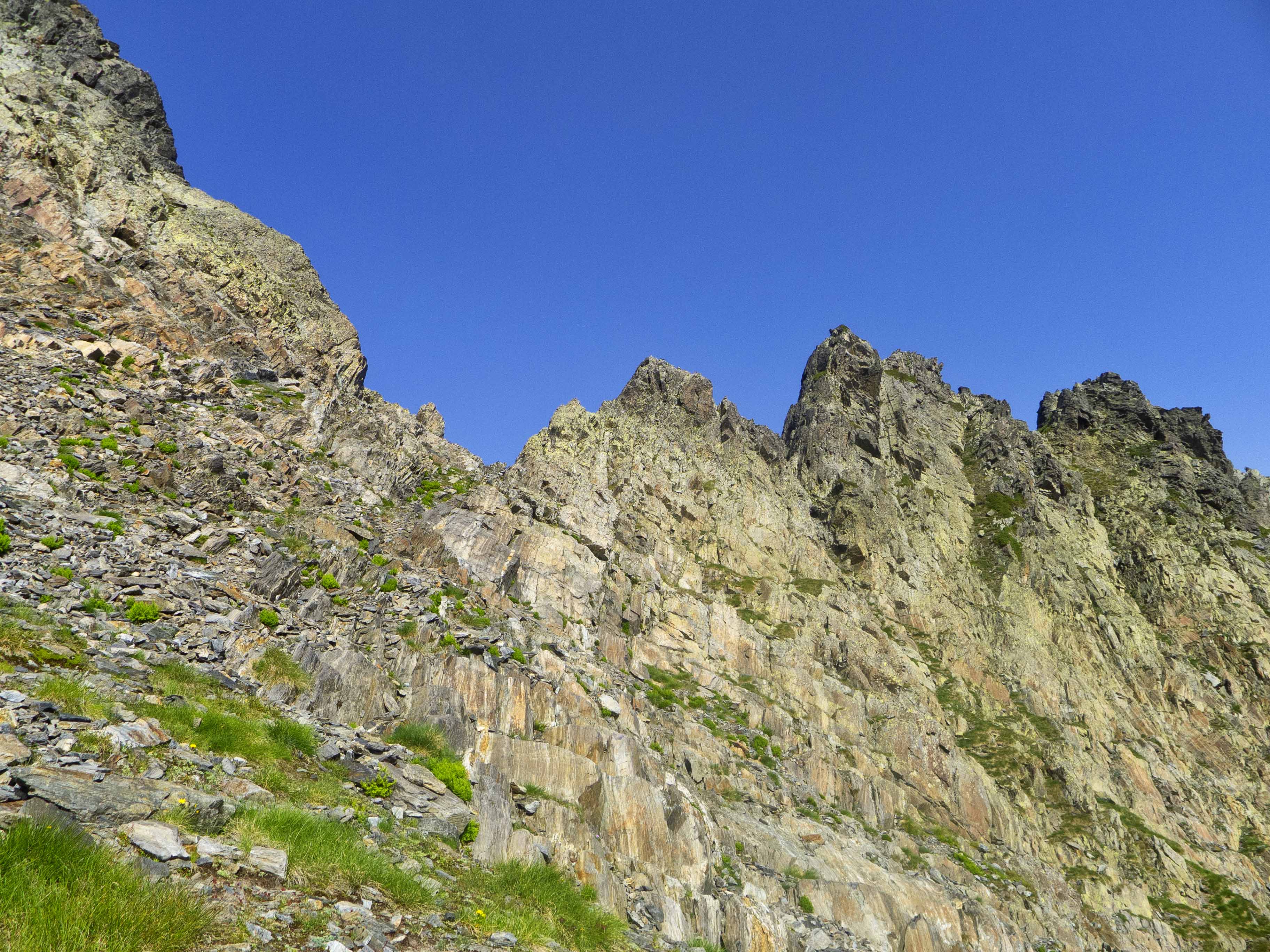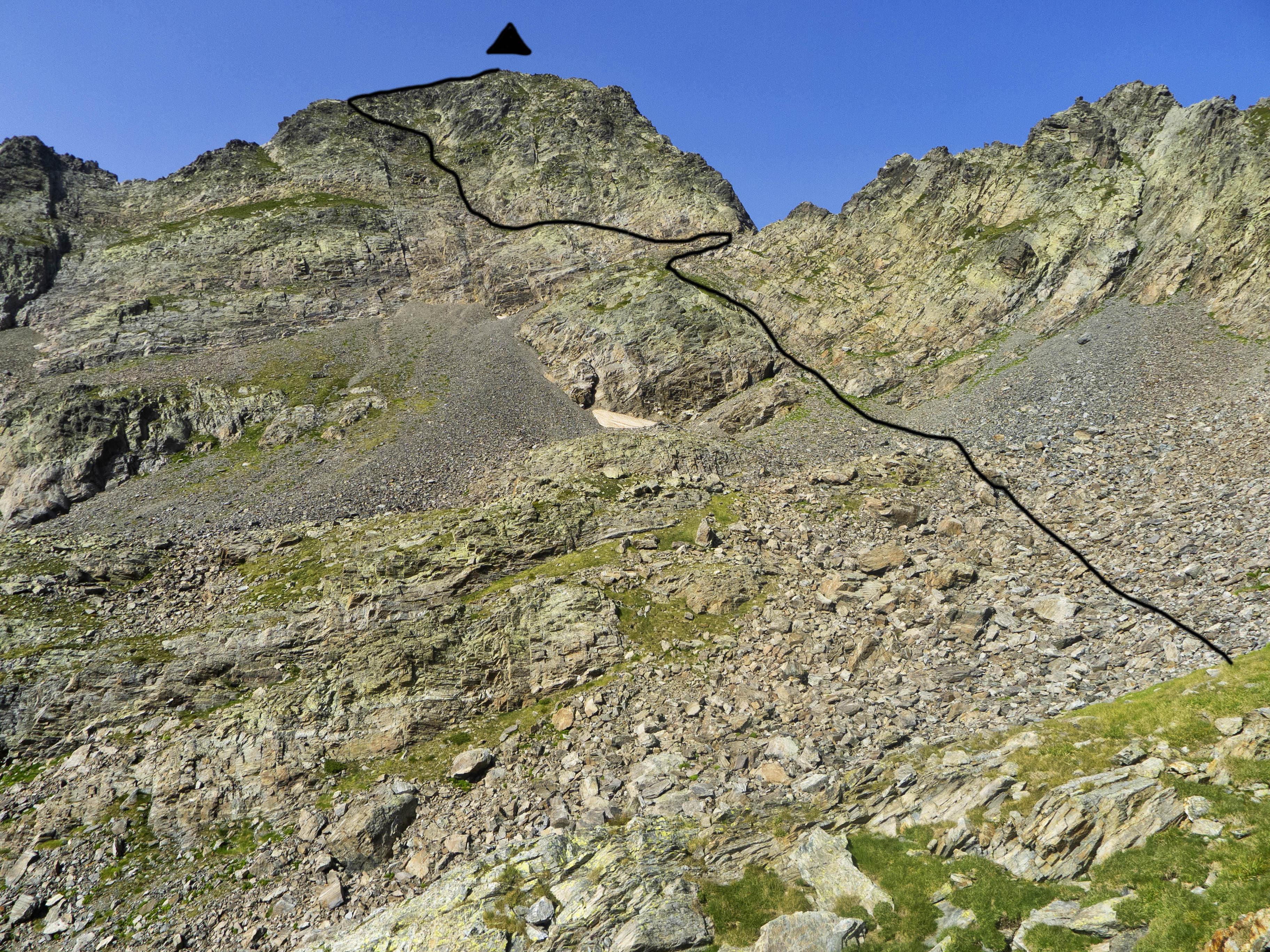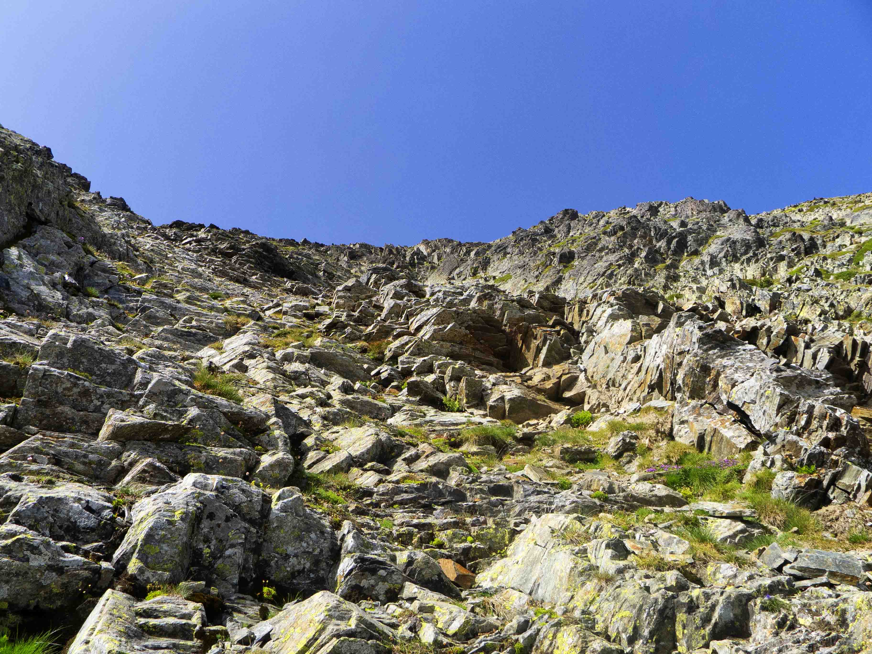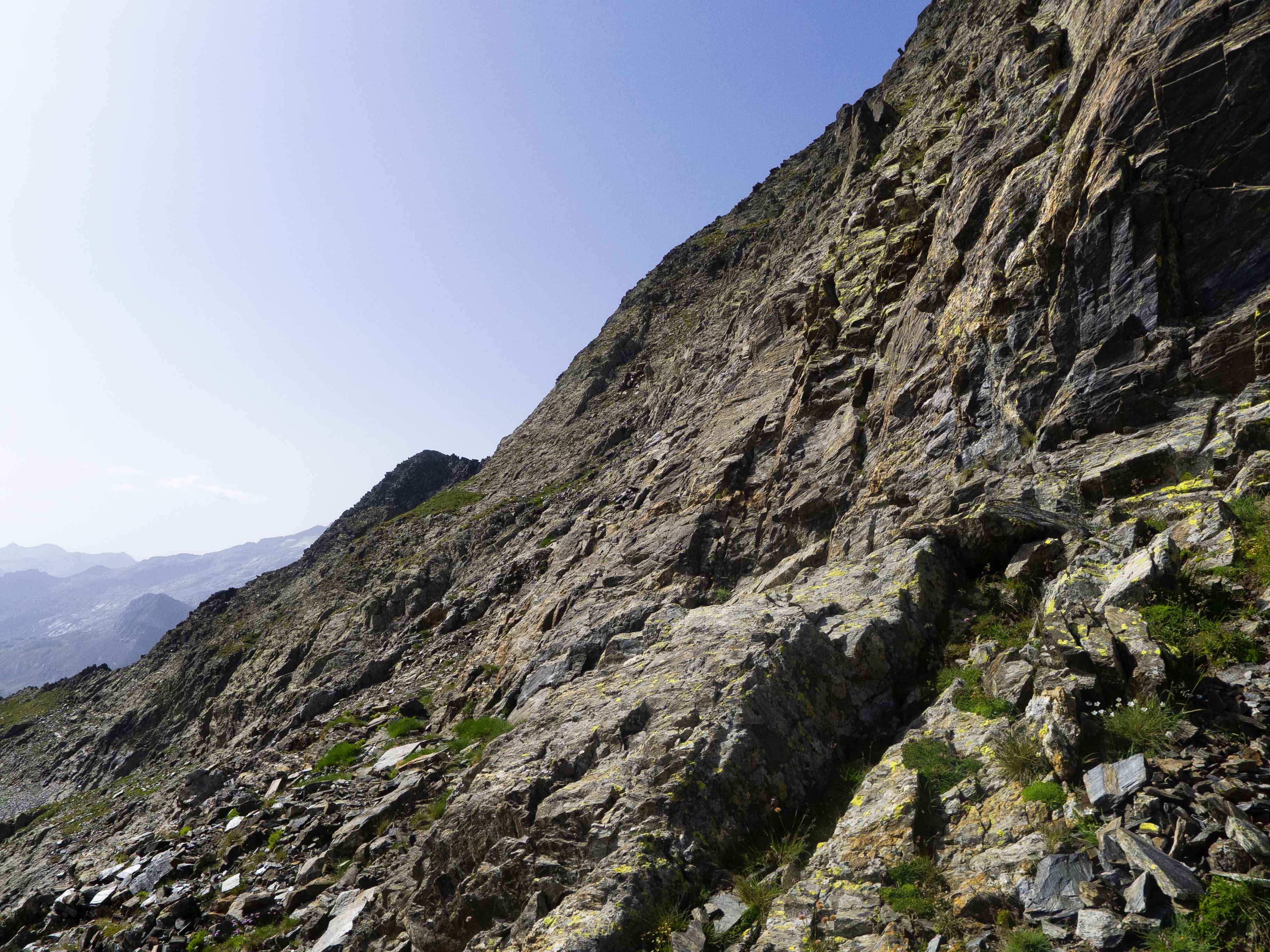 Este cóncavo tiene tramos con algo de hierba y otros de más rocosos. Varios tubos van esquivando espolones que caen de la cresta, que vemos arriba de todo y a donde debemos llegar. Sin embargo, no la atacaremos de frente, sino que la ganaremos yendo hacia la izquierda, donde su acceso es más sencillo. Desde la cresta, la cima está a pocos minutos.