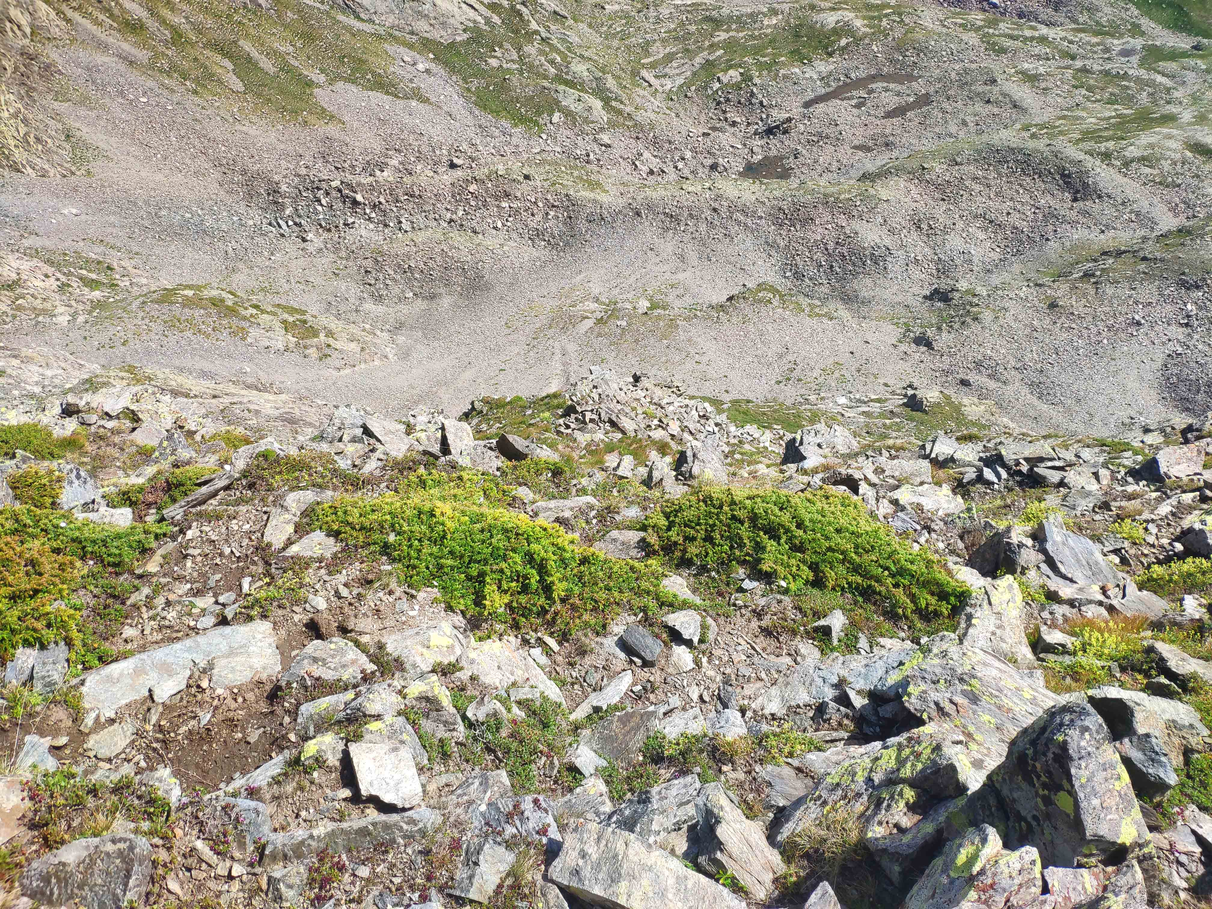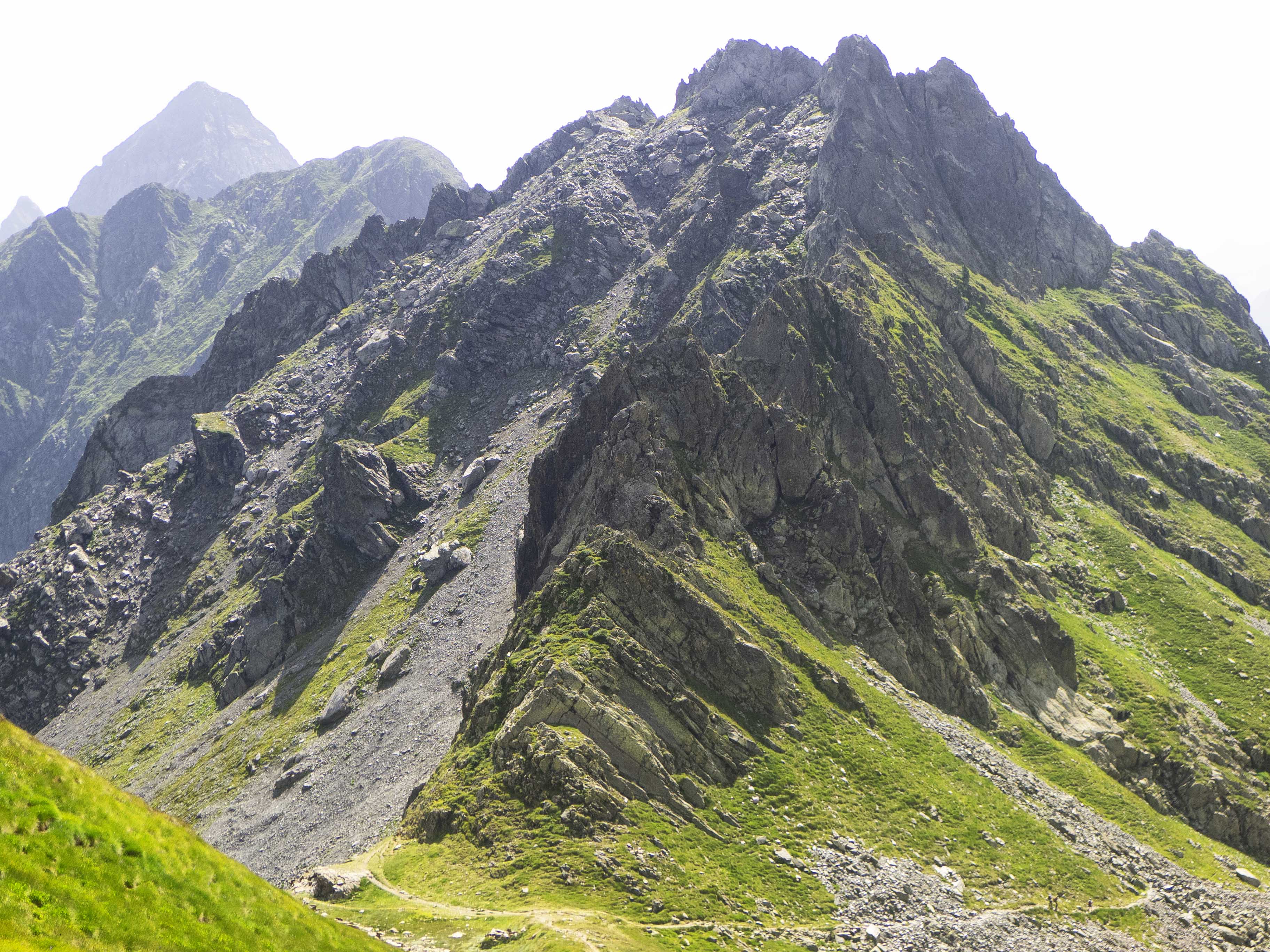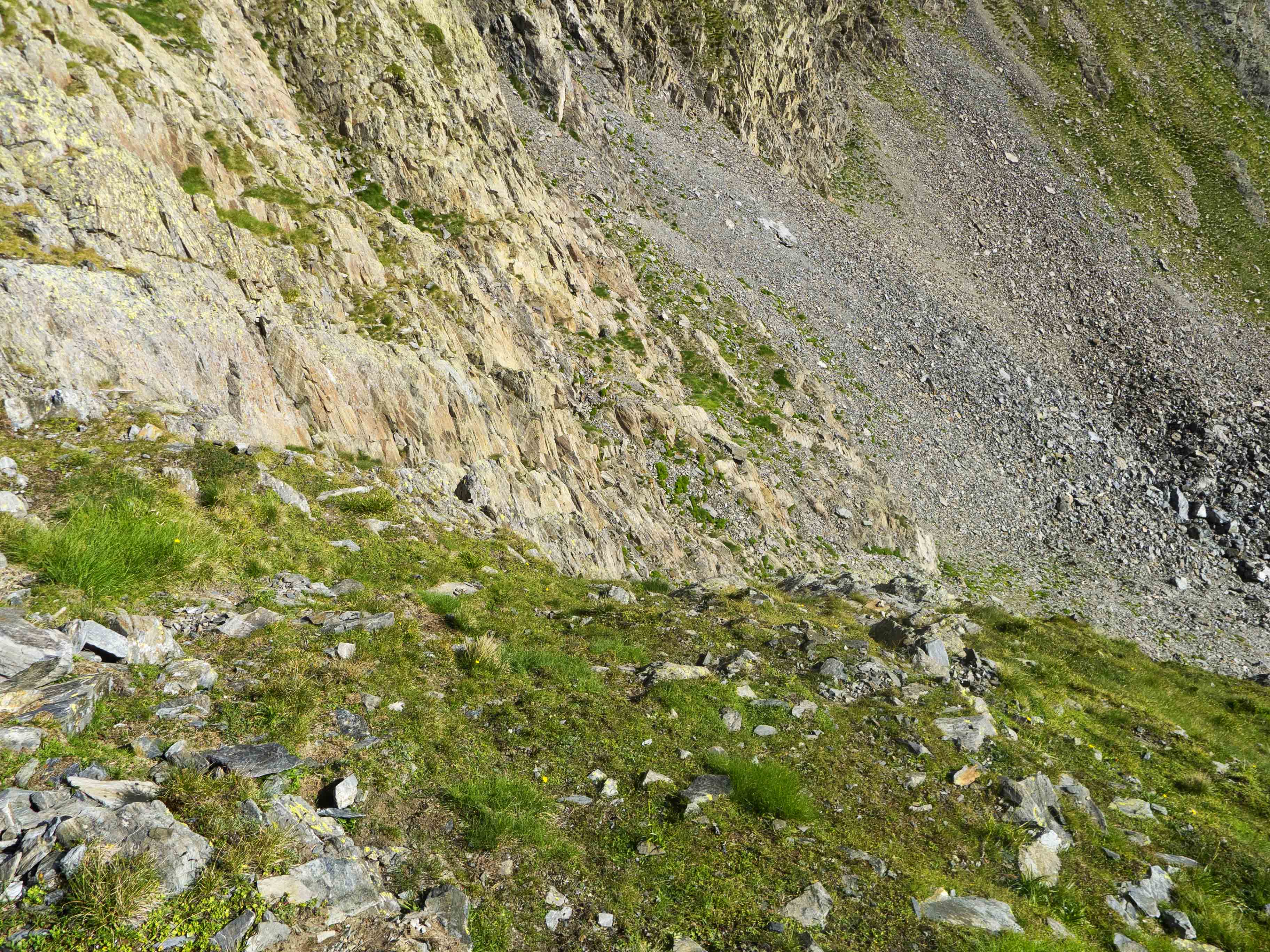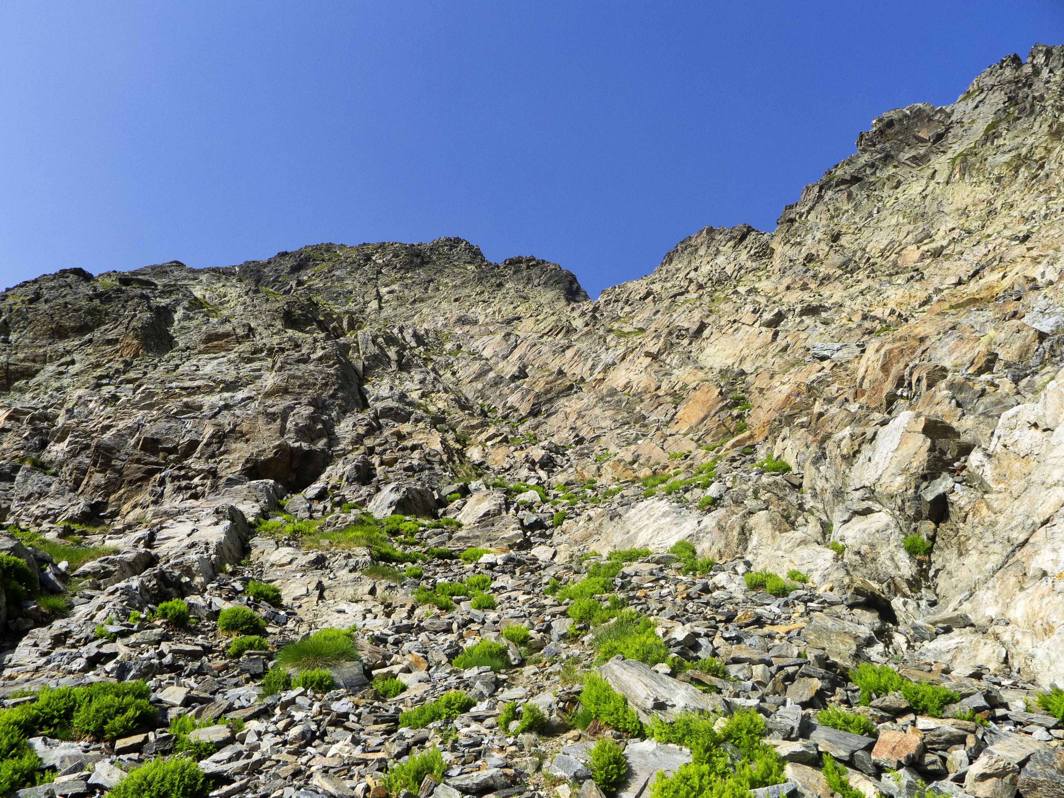 Este cóncavo tiene tramos con algo de hierba y otros de más rocosos. Varios tubos van esquivando espolones que caen de la cresta, que vemos arriba de todo y a donde debemos llegar. Sin embargo, no la atacaremos de frente, sino que la ganaremos yendo hacia la izquierda, donde su acceso es más sencillo. Desde la cresta, la cima está a pocos minutos.