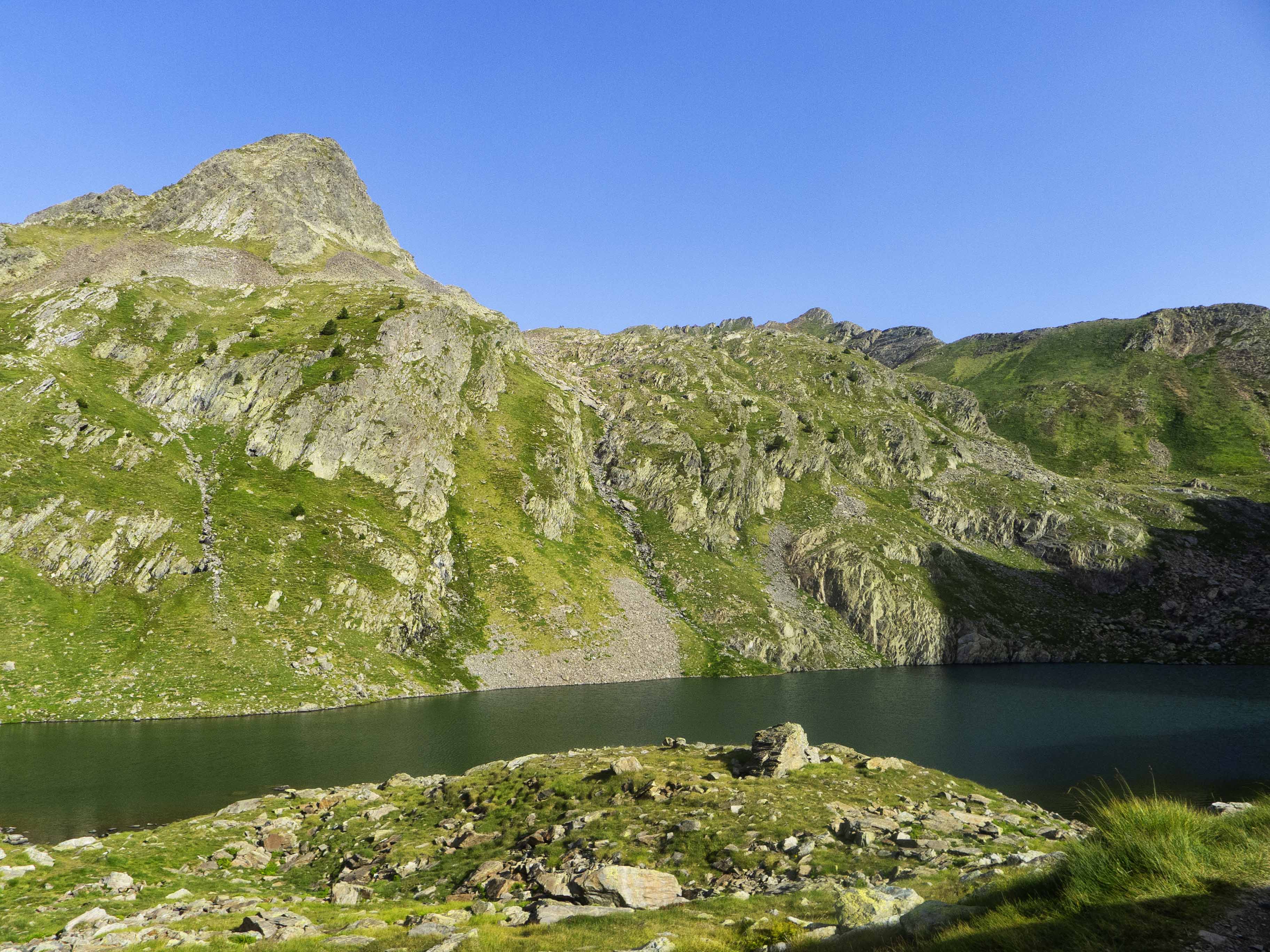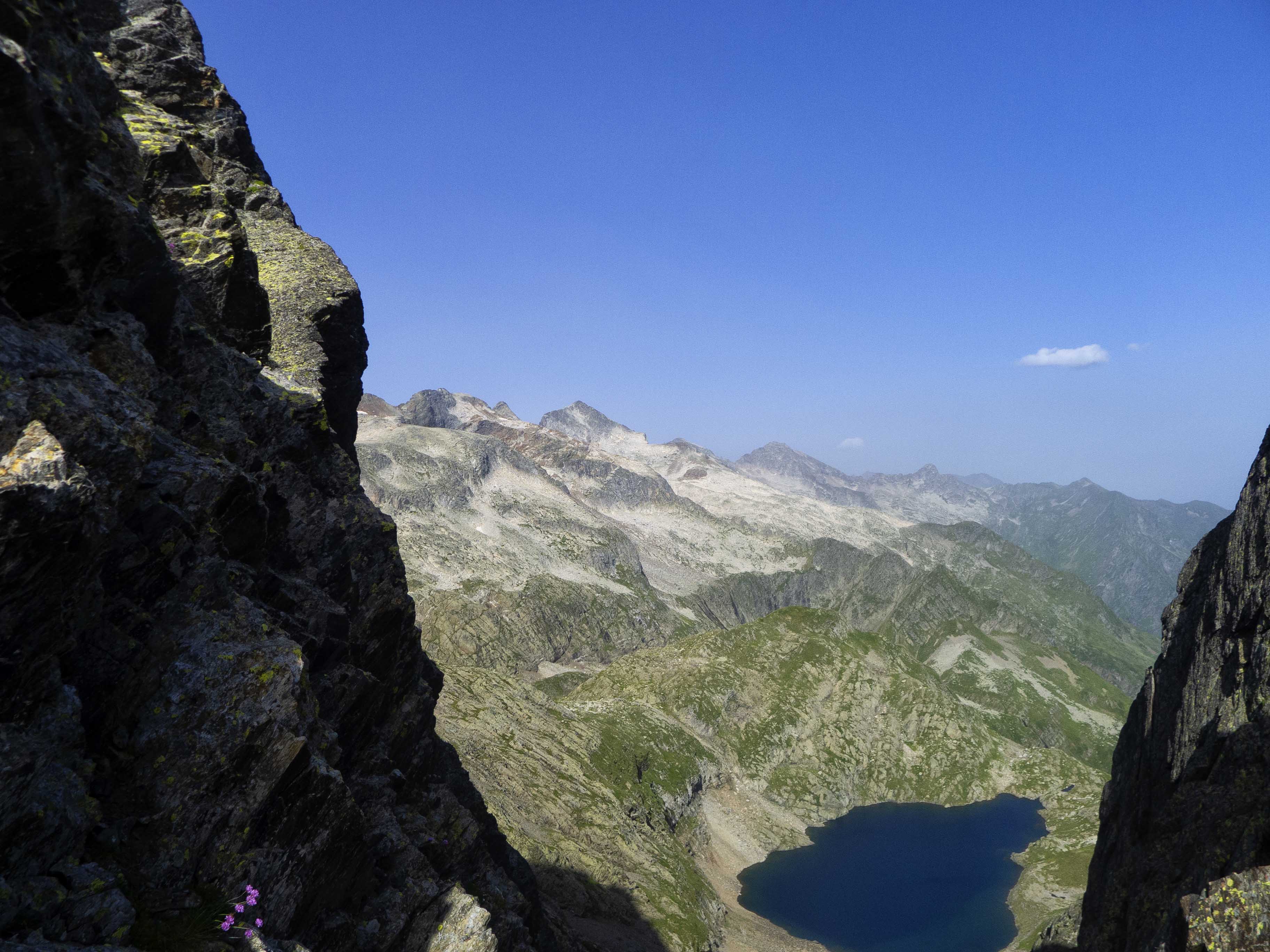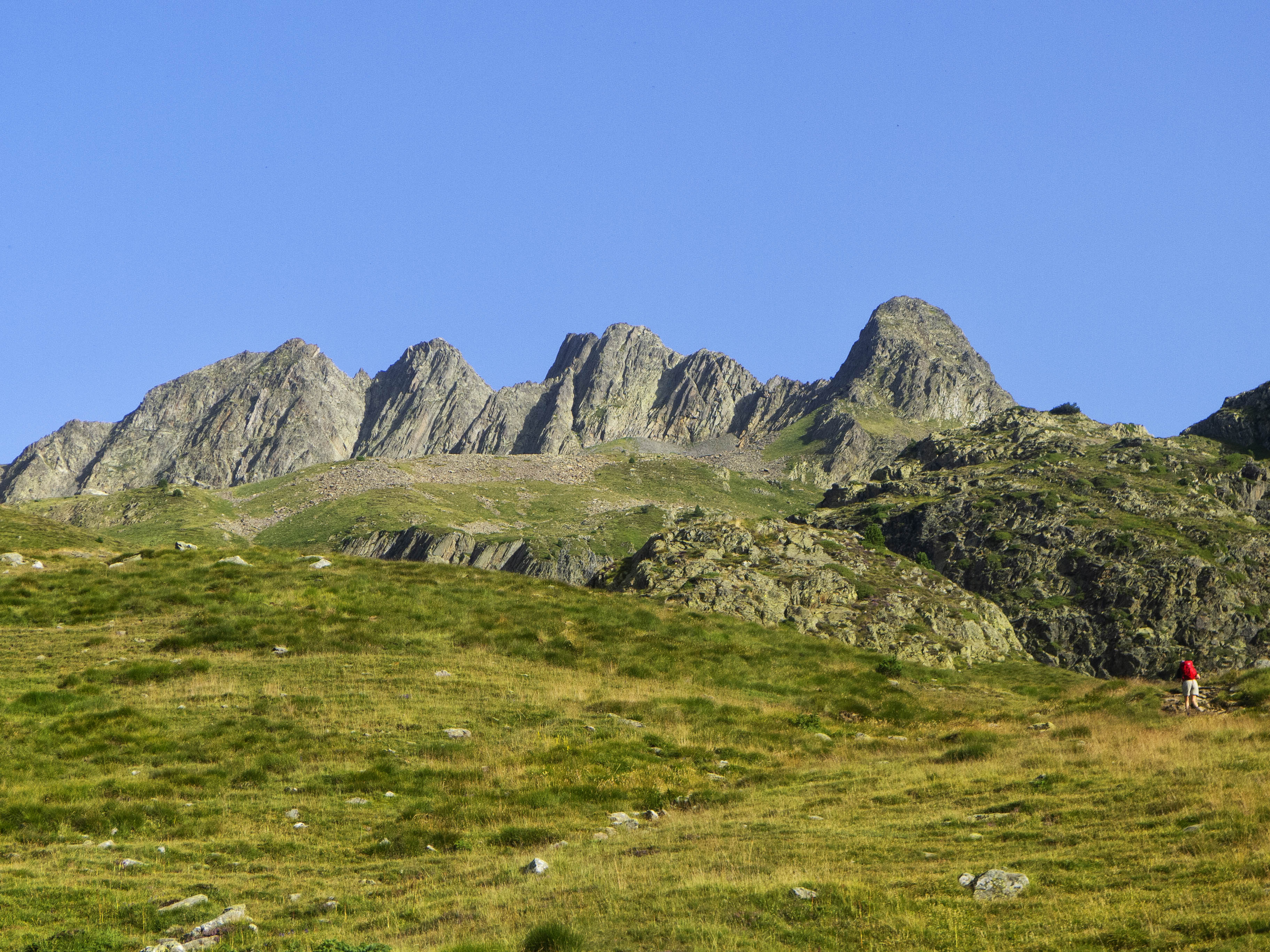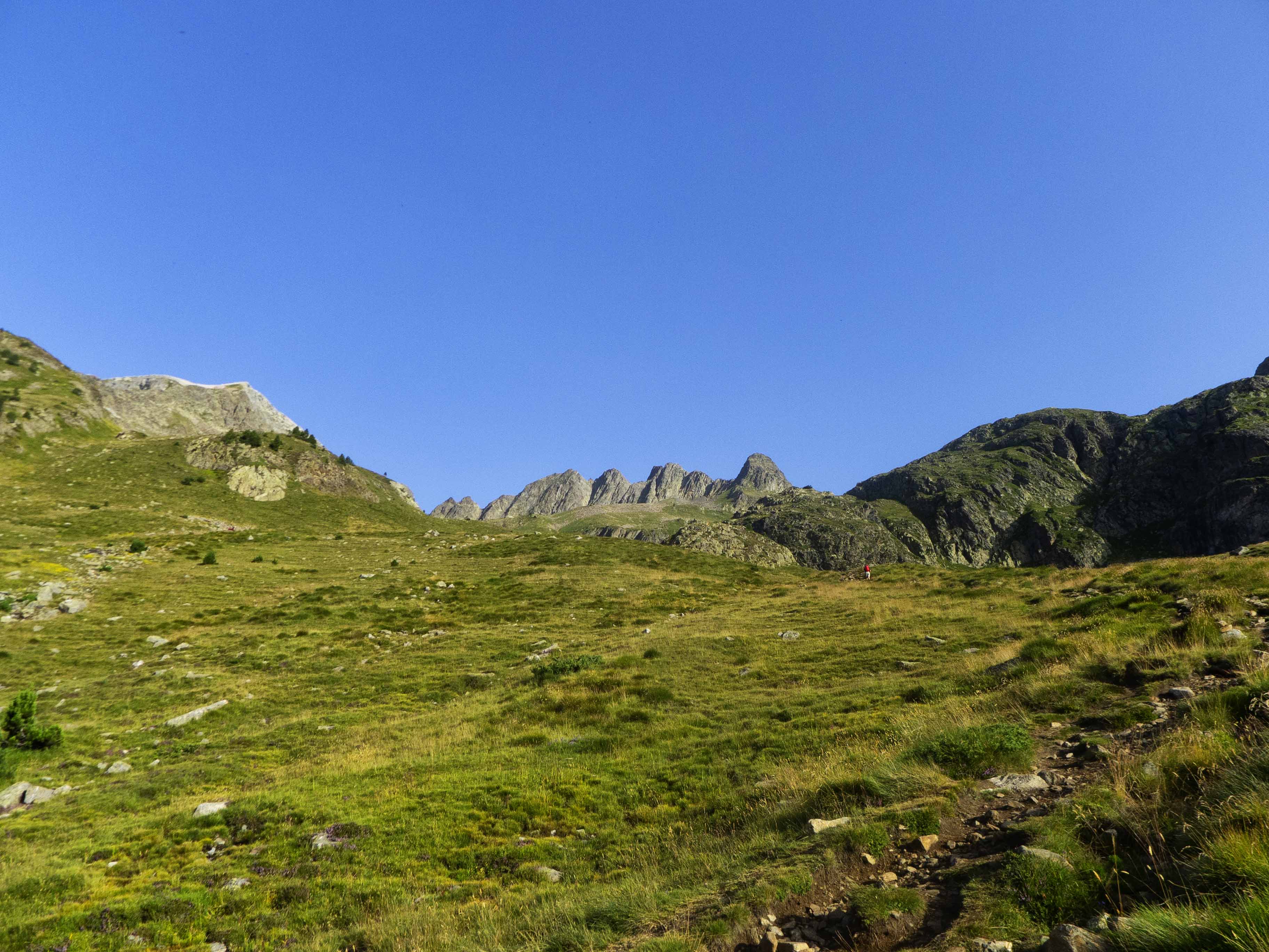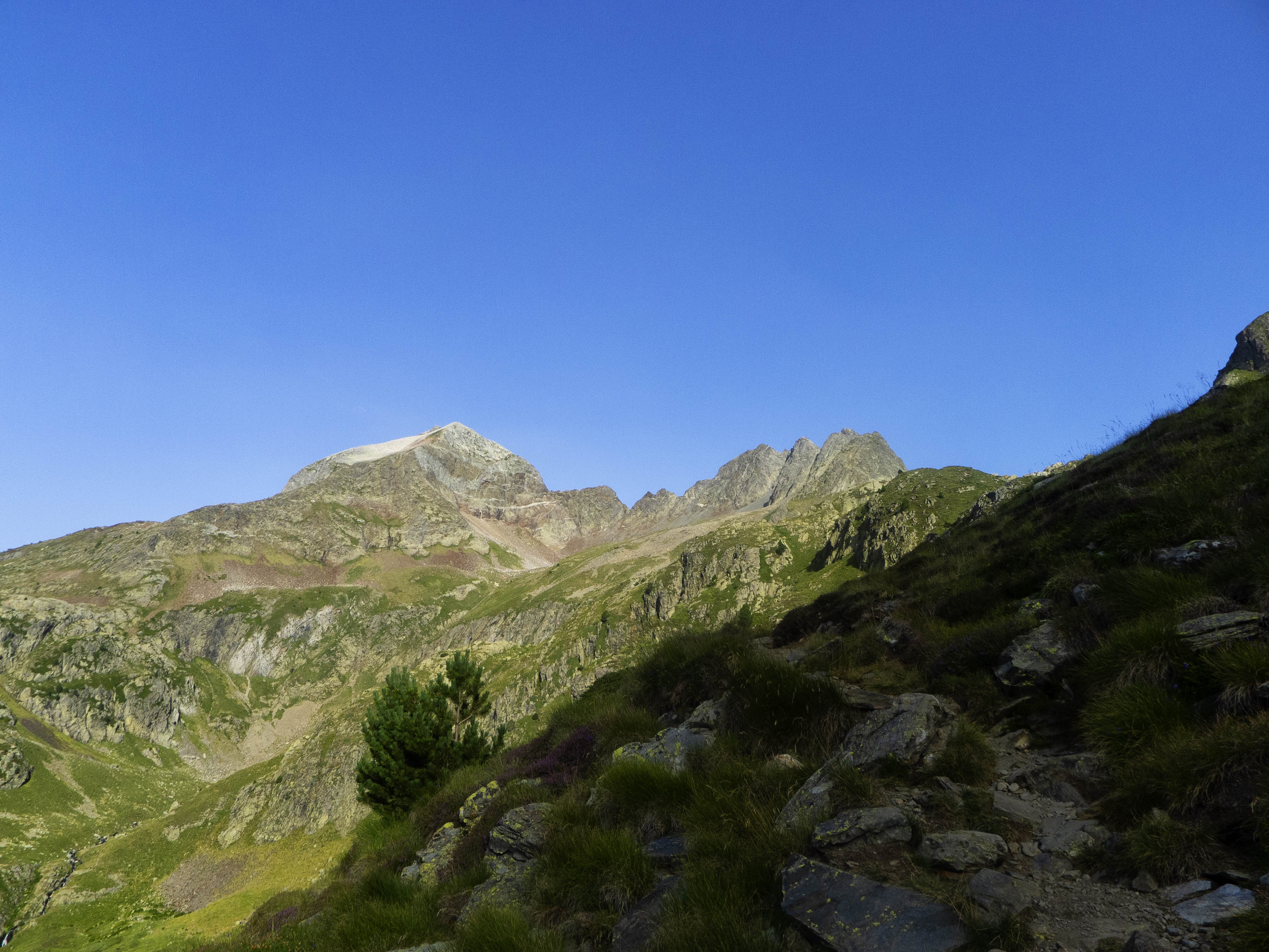 Y Gorgutes abajo, el Pic de la Montañeta queda empequeñecido ante las grandes montañas que aparecen en el horizonte: el piramidal Salvaguardia y el afiladísimo Pico de la Mina y sus agujas.