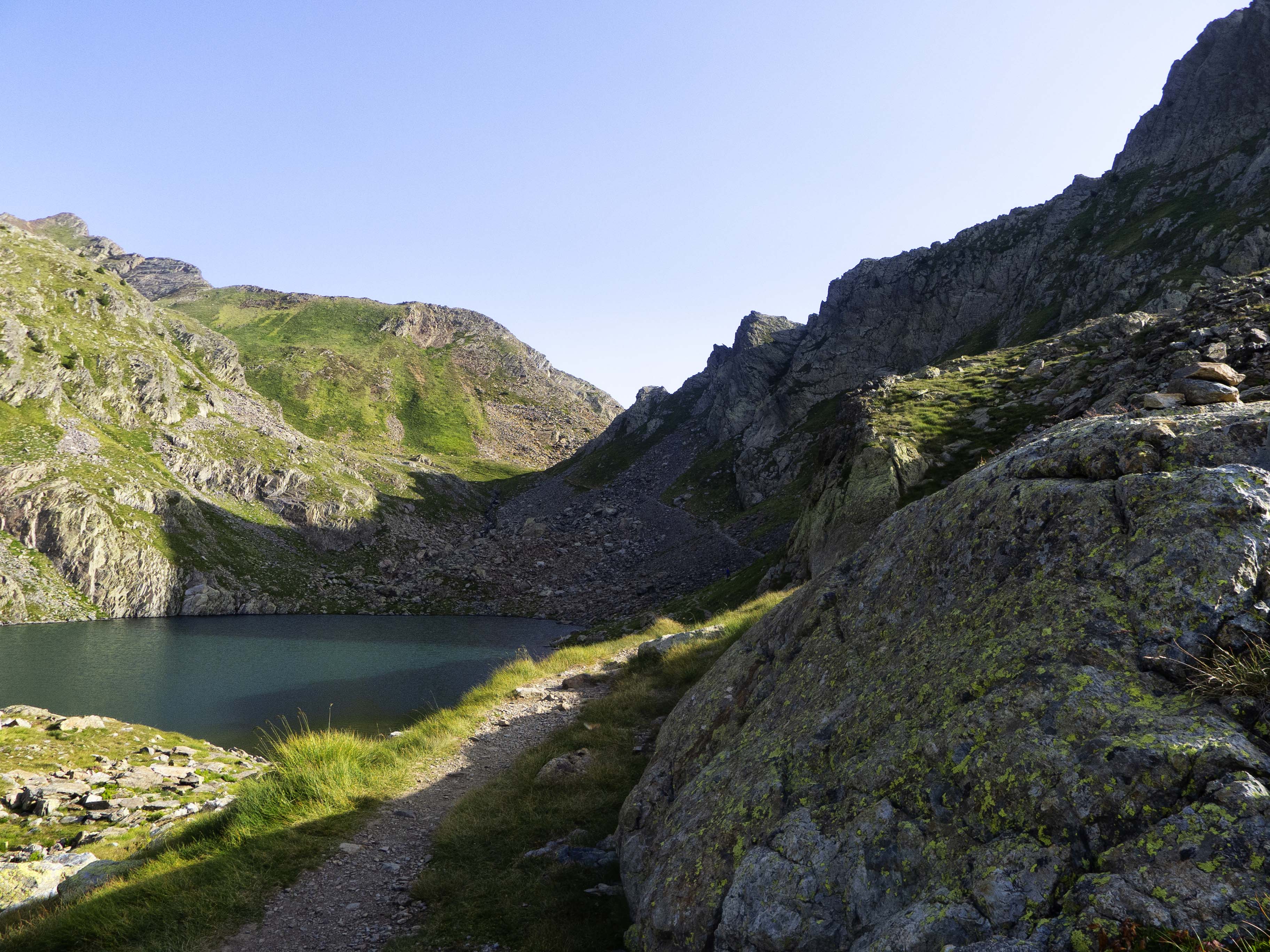 Cuando el sendero entra en el Valle de Gorgutes, el panorama se abre. El sendero se dirige hacia el norte para cruzar el Barranco de Gorgutes, que cae con fuerza con el agua del ibón, algo más alto.